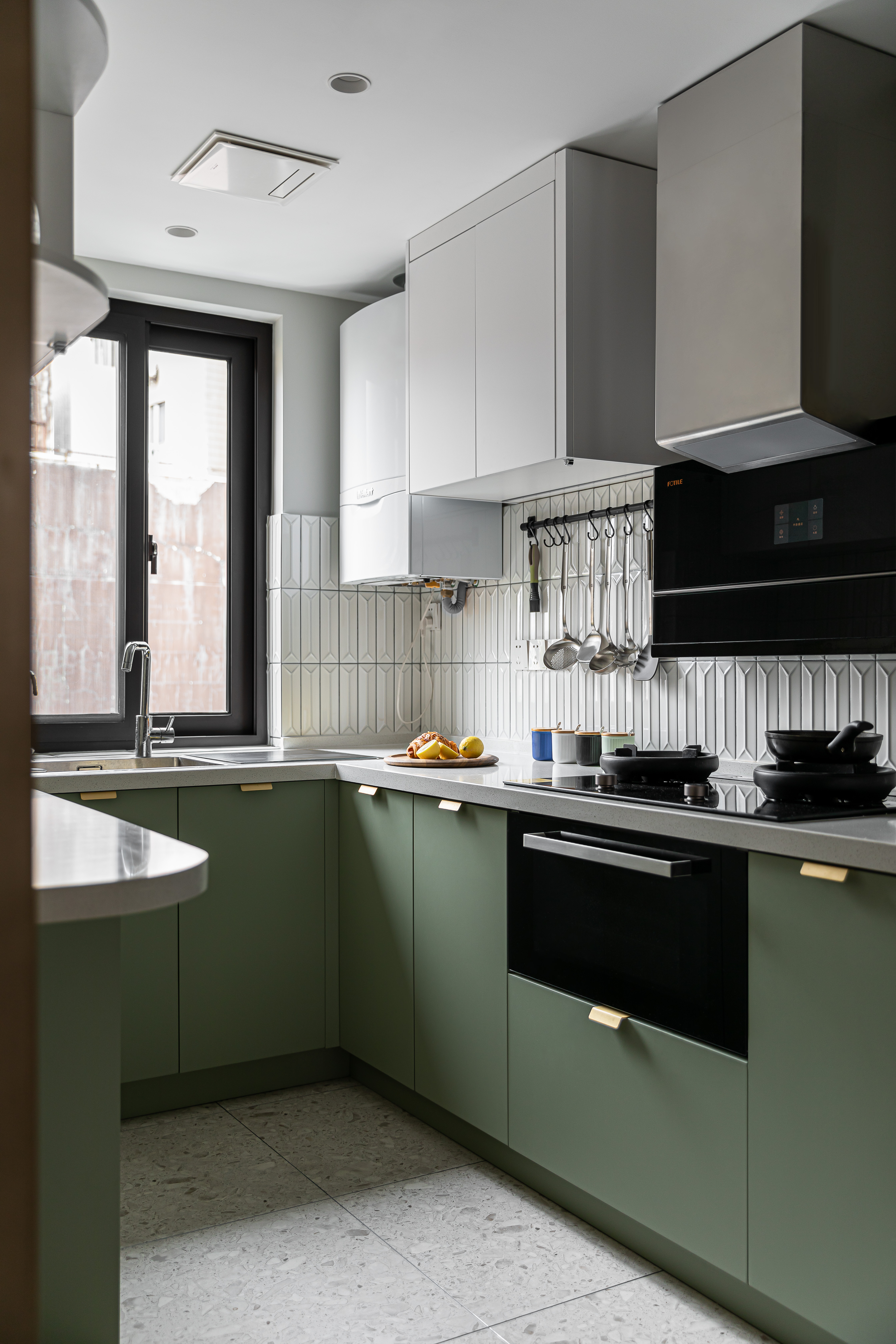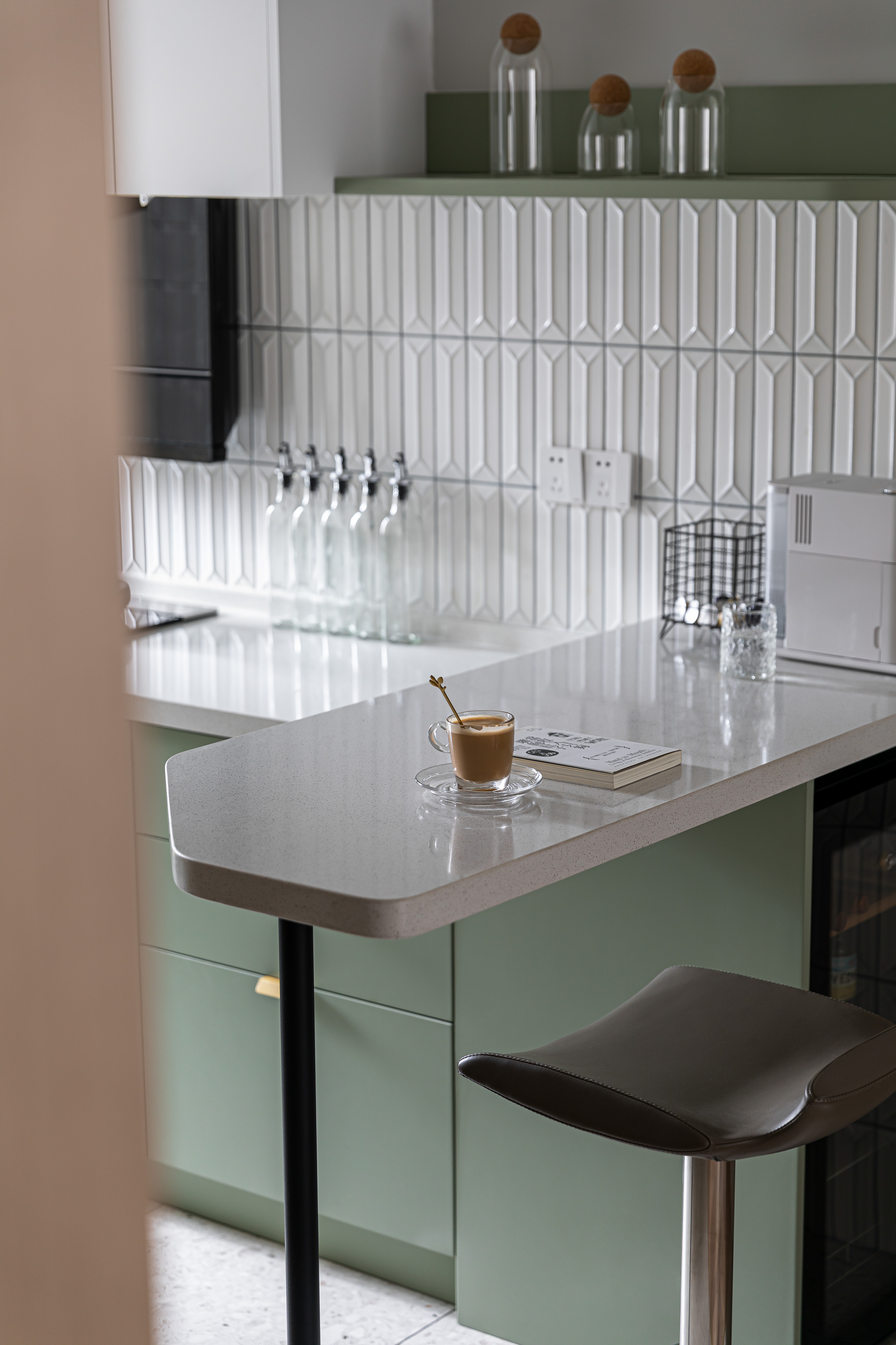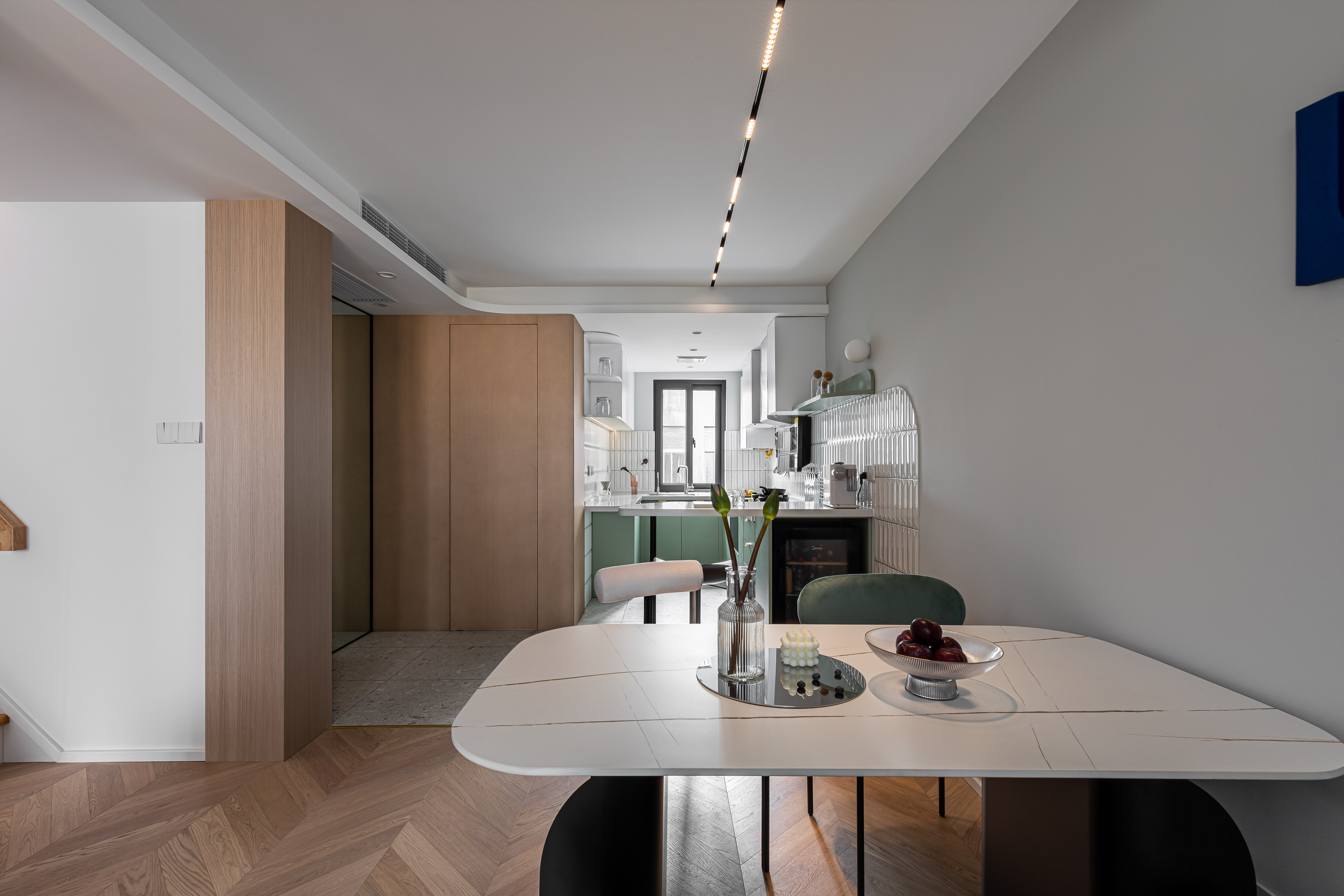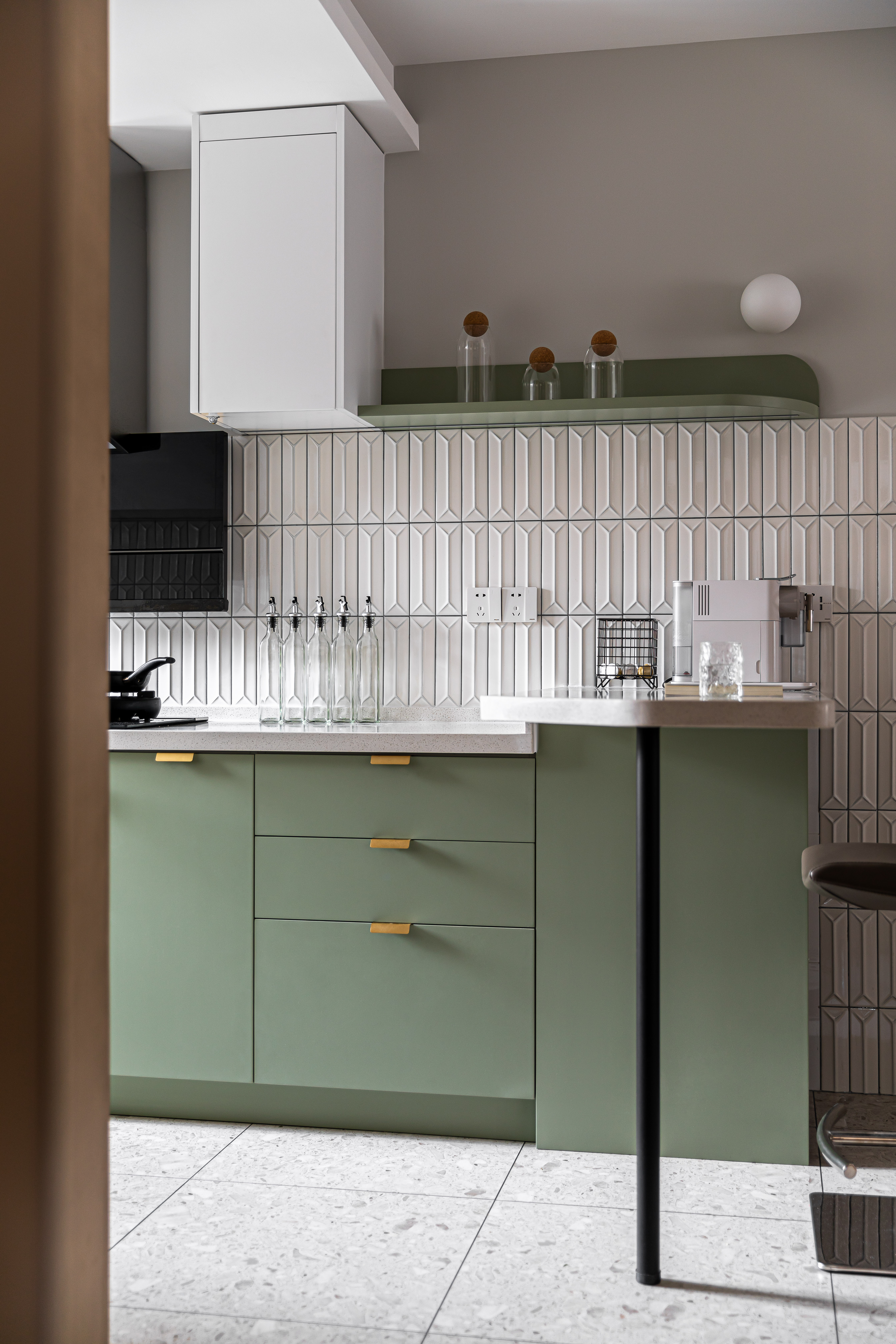 入户映入眼帘的是厨房吧台区,没有过度缓冲,干净的白色立体砖搭配着灰绿色橱柜,墙砖转角处做弧形弱化棱角;灰色的水磨石地砖与木质的地板碰撞张弛有度,呈现一种岁月静好的安稳和素朴.