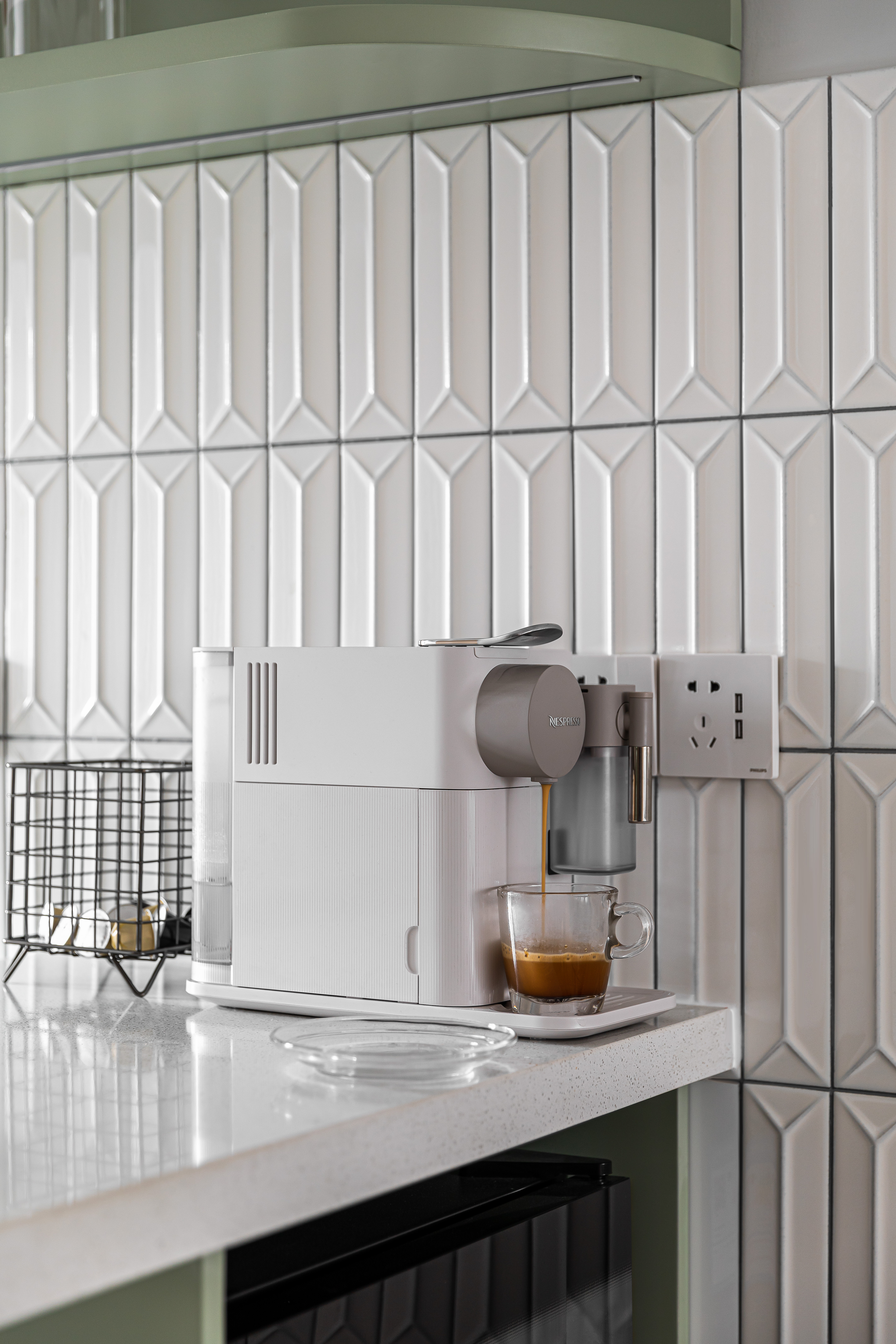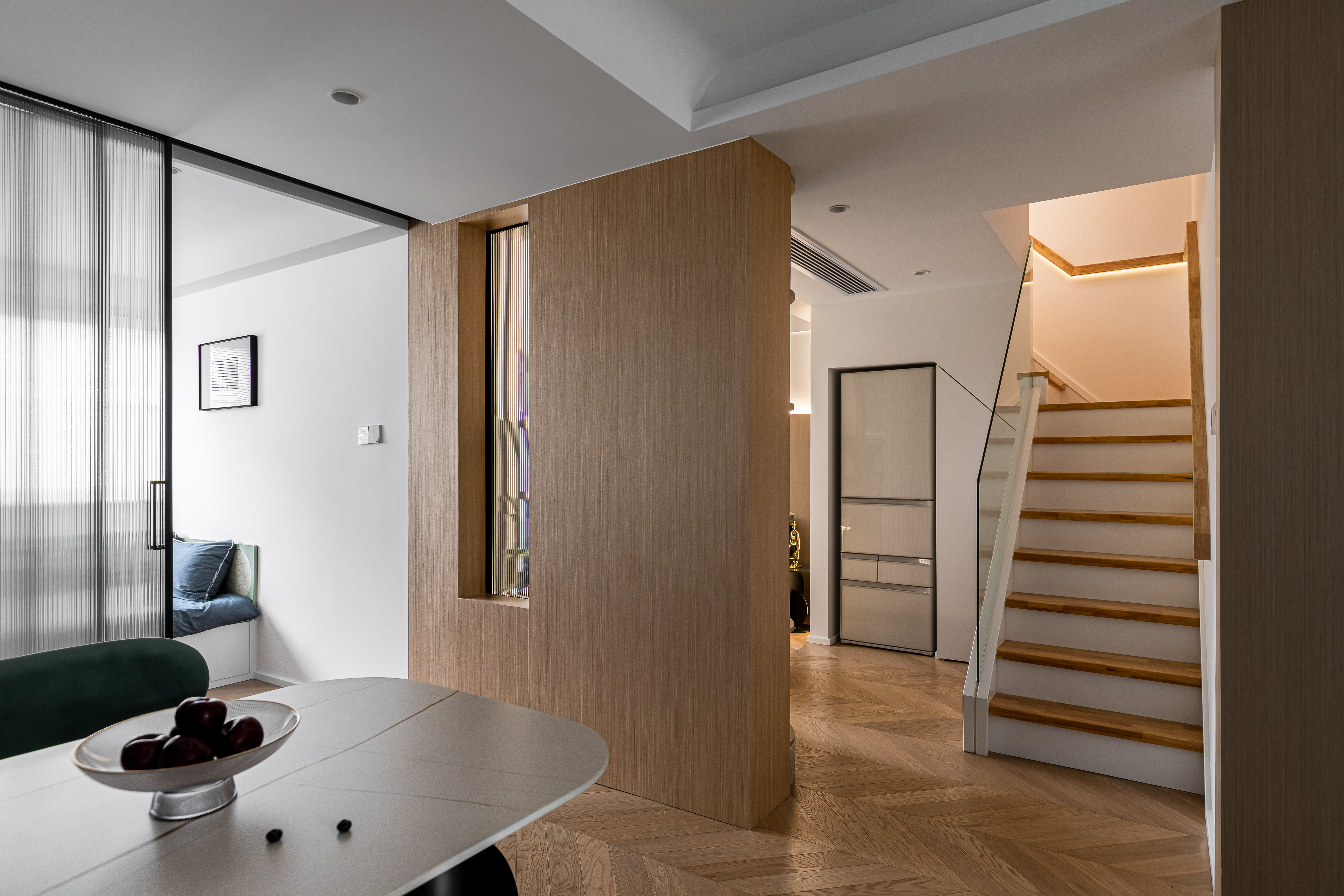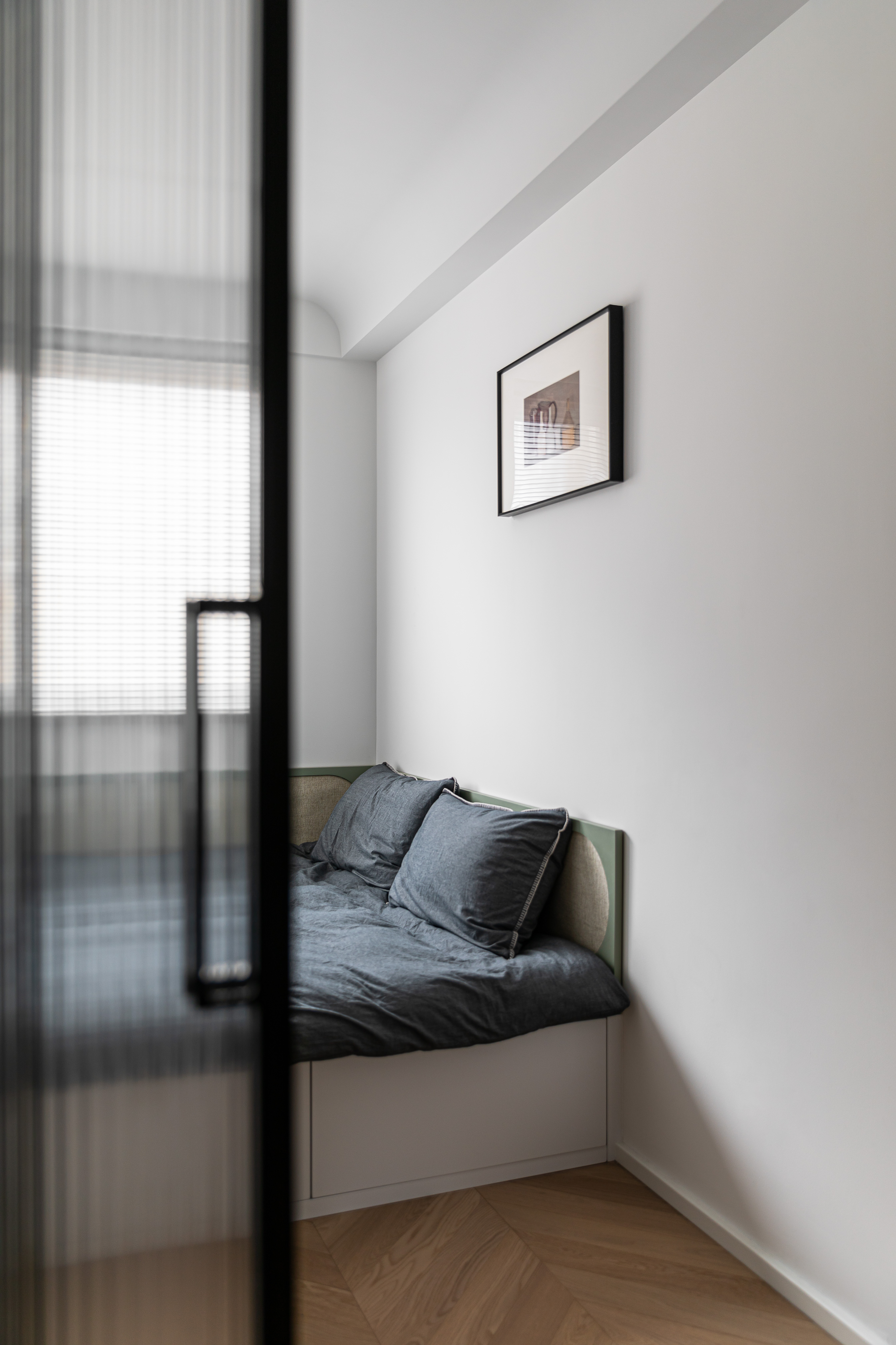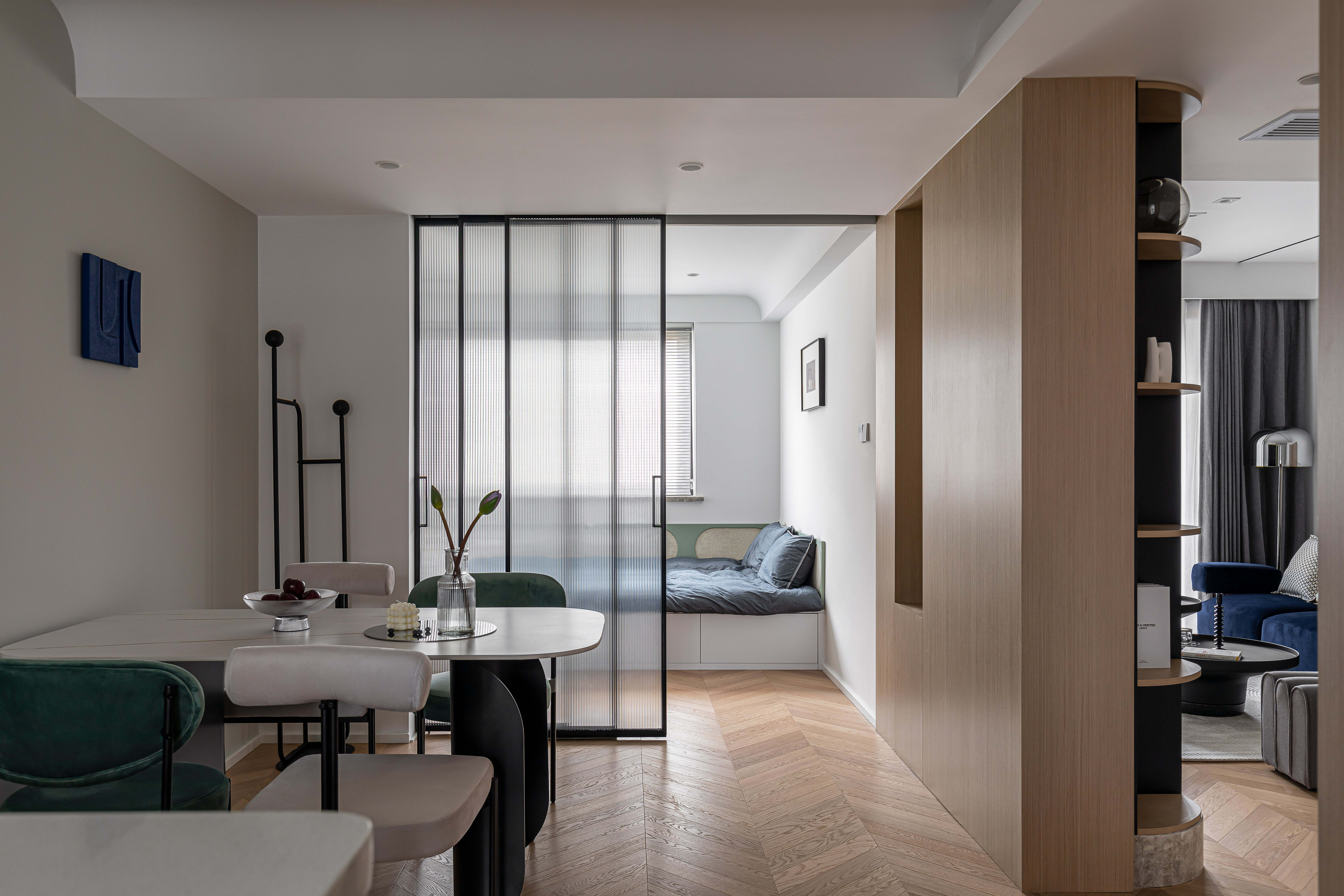 入户映入眼帘的是厨房吧台区,没有过度缓冲,干净的白色立体砖搭配着灰绿色橱柜,墙砖转角处做弧形弱化棱角;灰色的水磨石地砖与木质的地板碰撞张弛有度,呈现一种岁月静好的安稳和素朴.