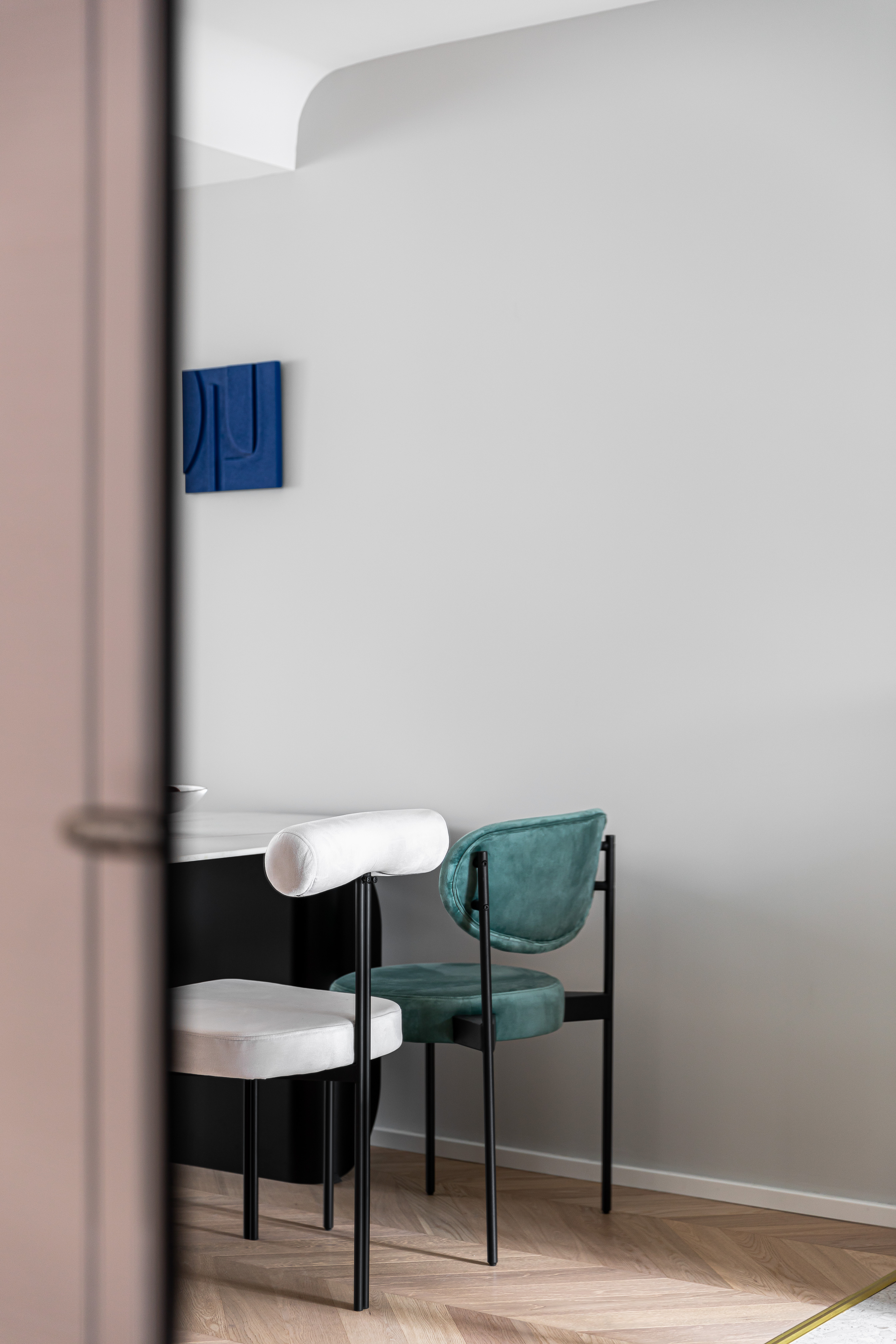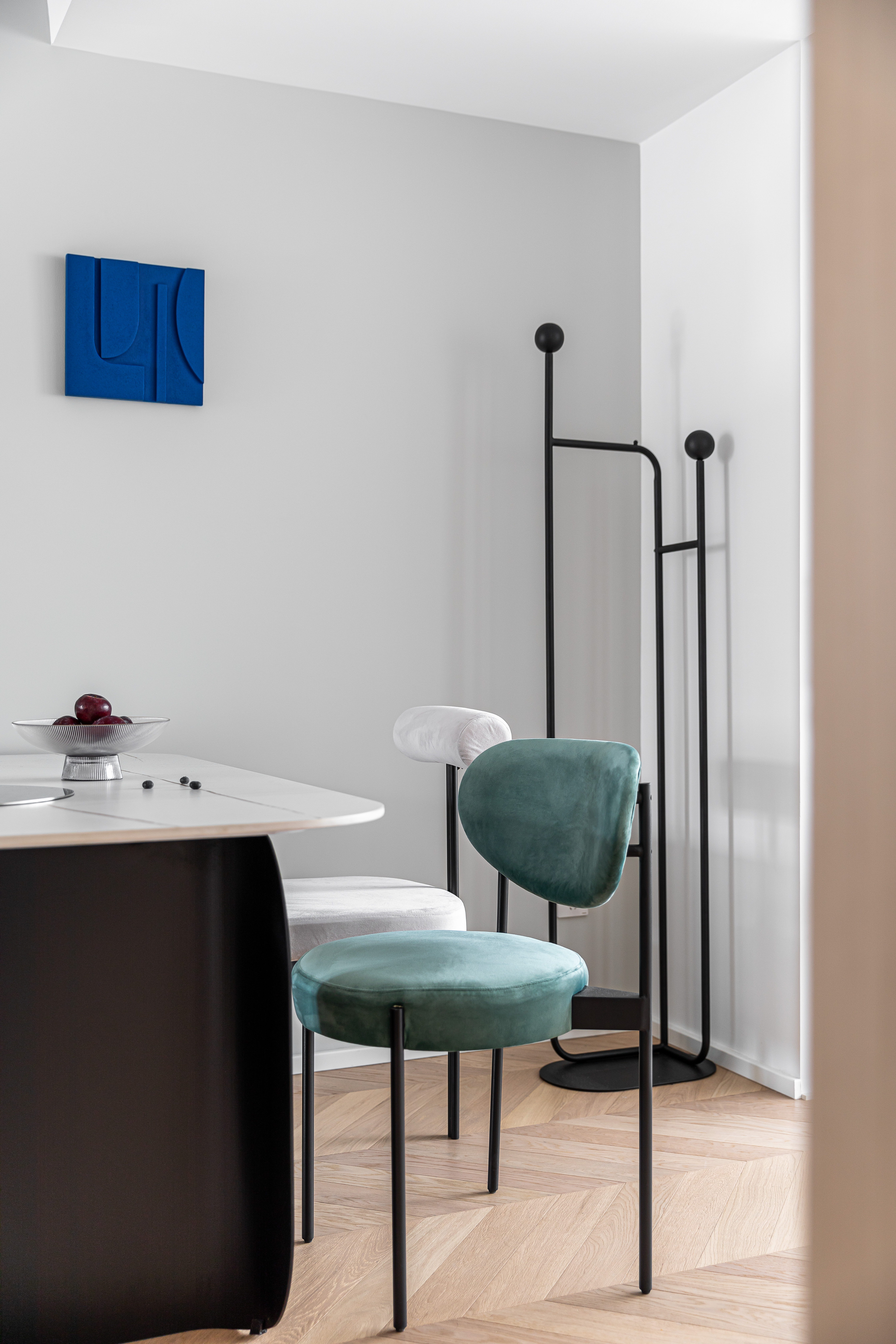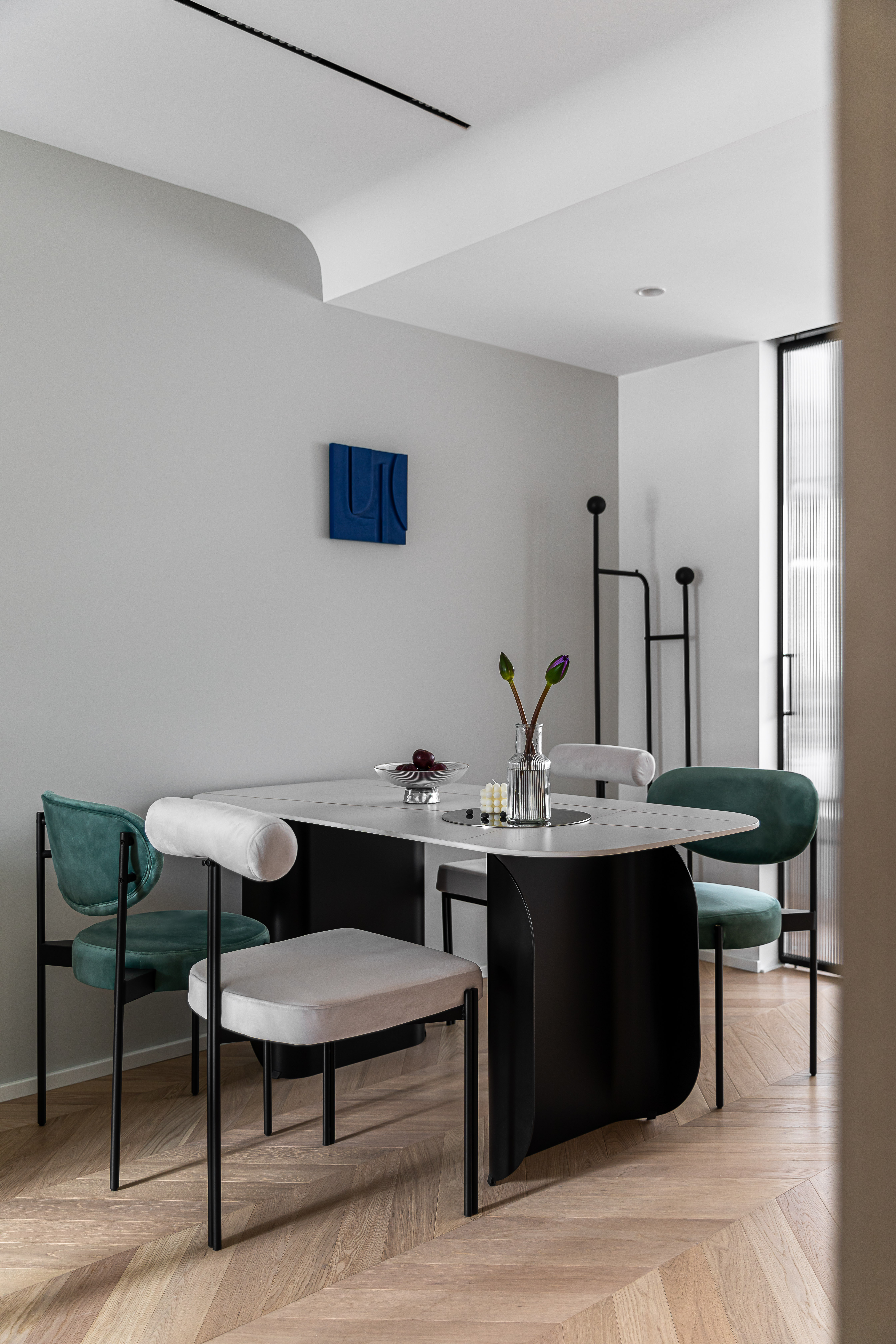 为了弱化建筑结构梁体,吊顶做了弧形处理,增加空间延展性;餐厅位于过度地带则没有过多的装饰,一副蓝色的立体画是点睛之笔,在满足基本就餐需求之余,更多的希望保证这个空间的互动和完整性.
