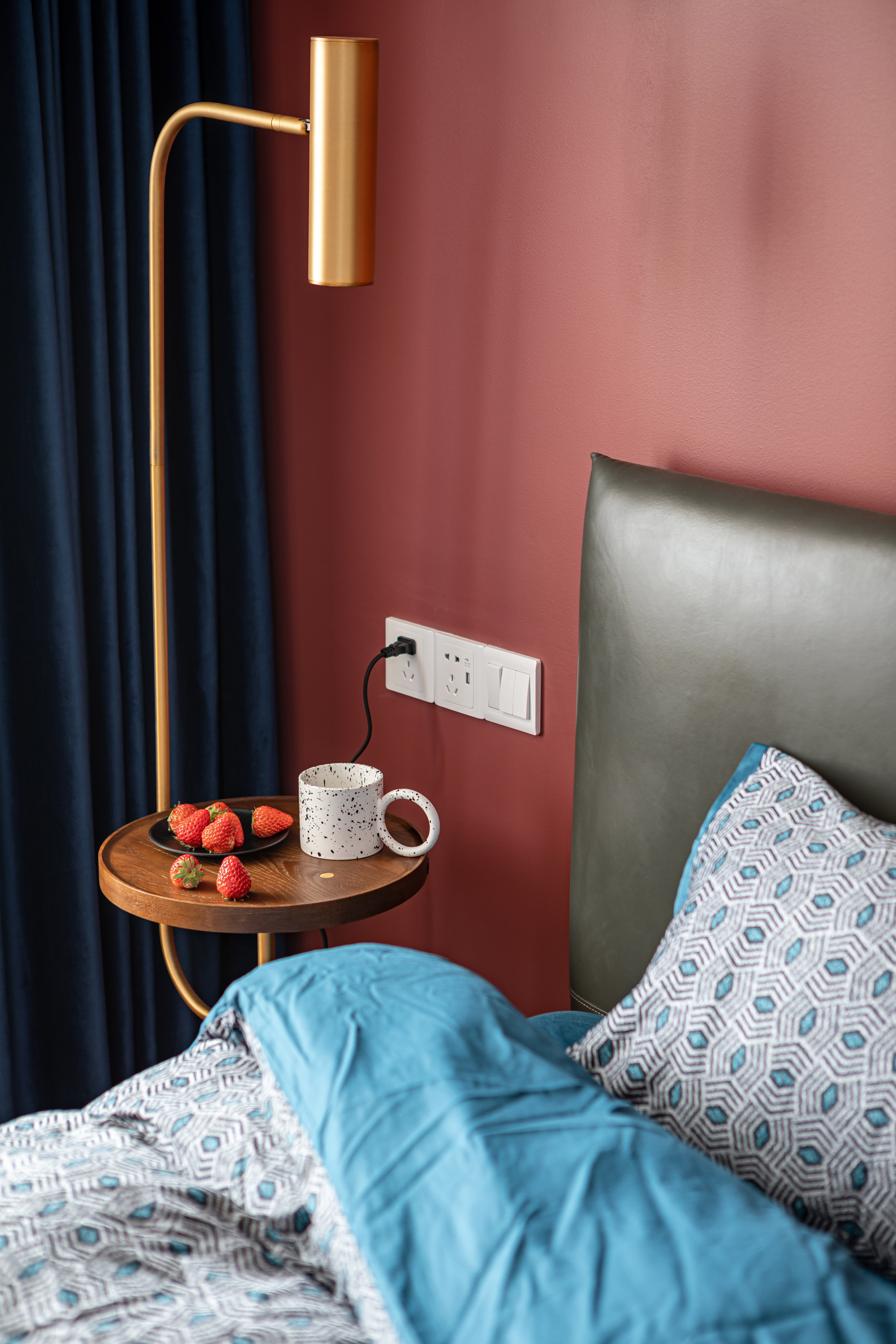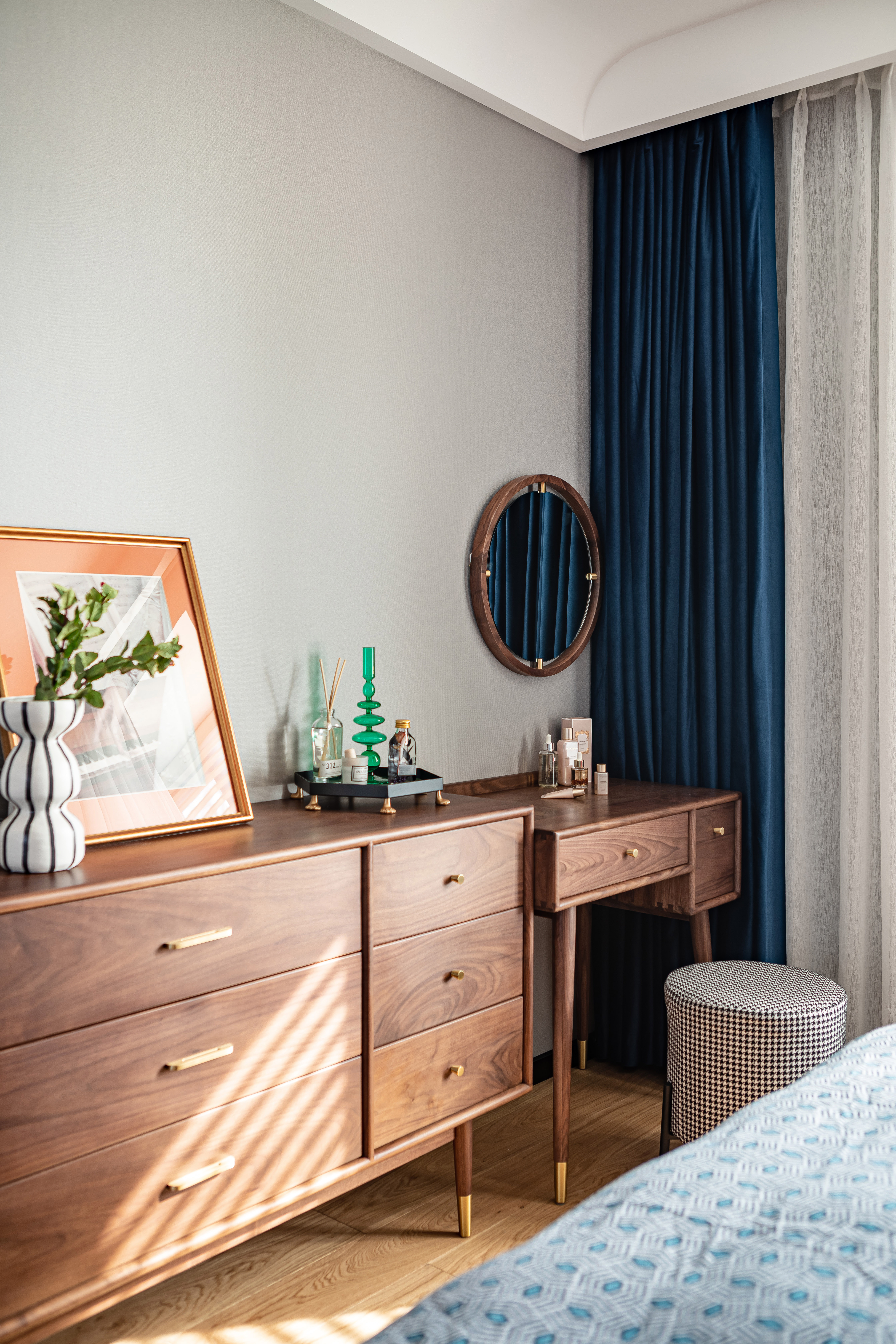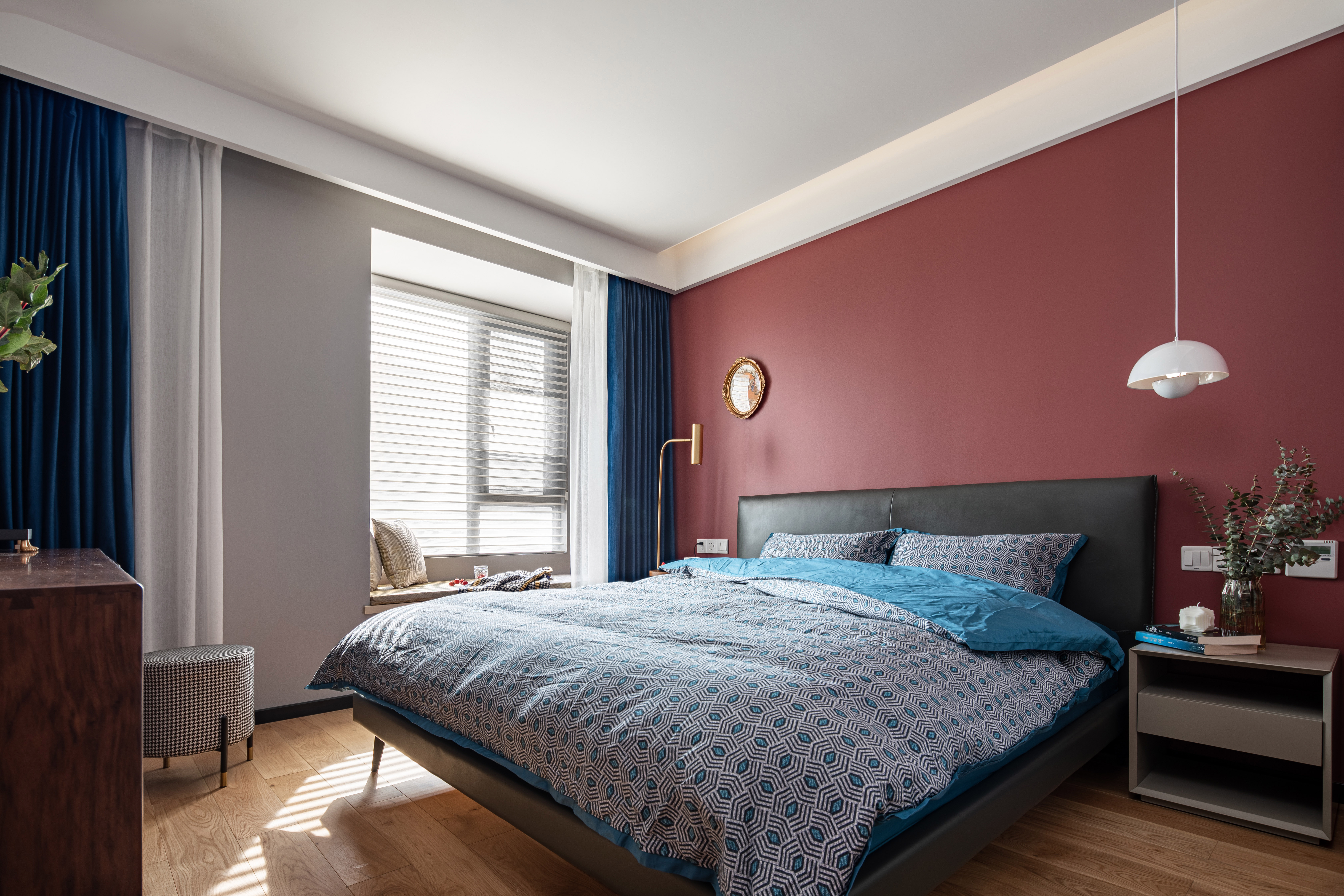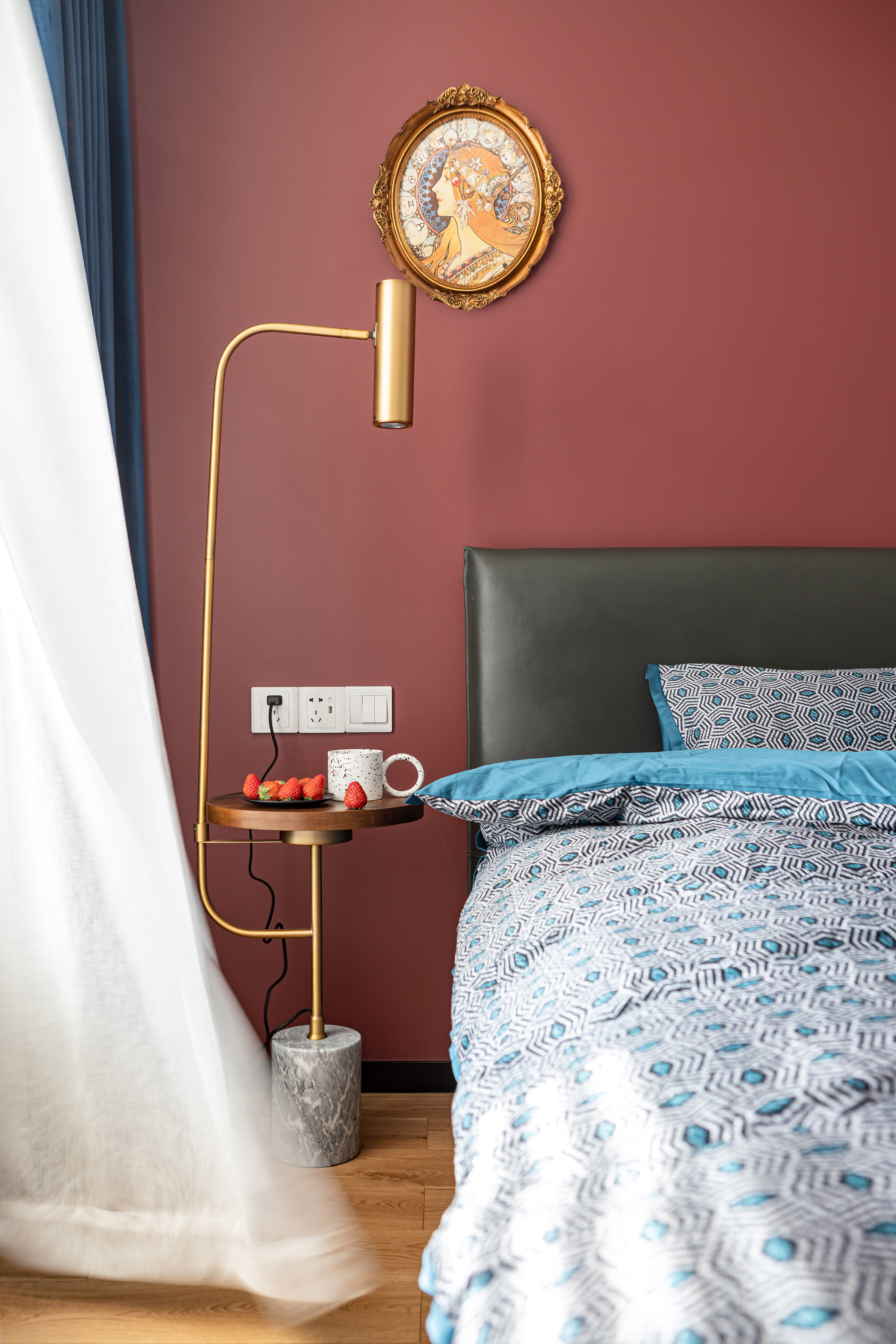 主卧以复古红为背景,搭配深蓝色窗帘和金色摆件,强调色彩与材质的多重对比,展现瑰丽精致