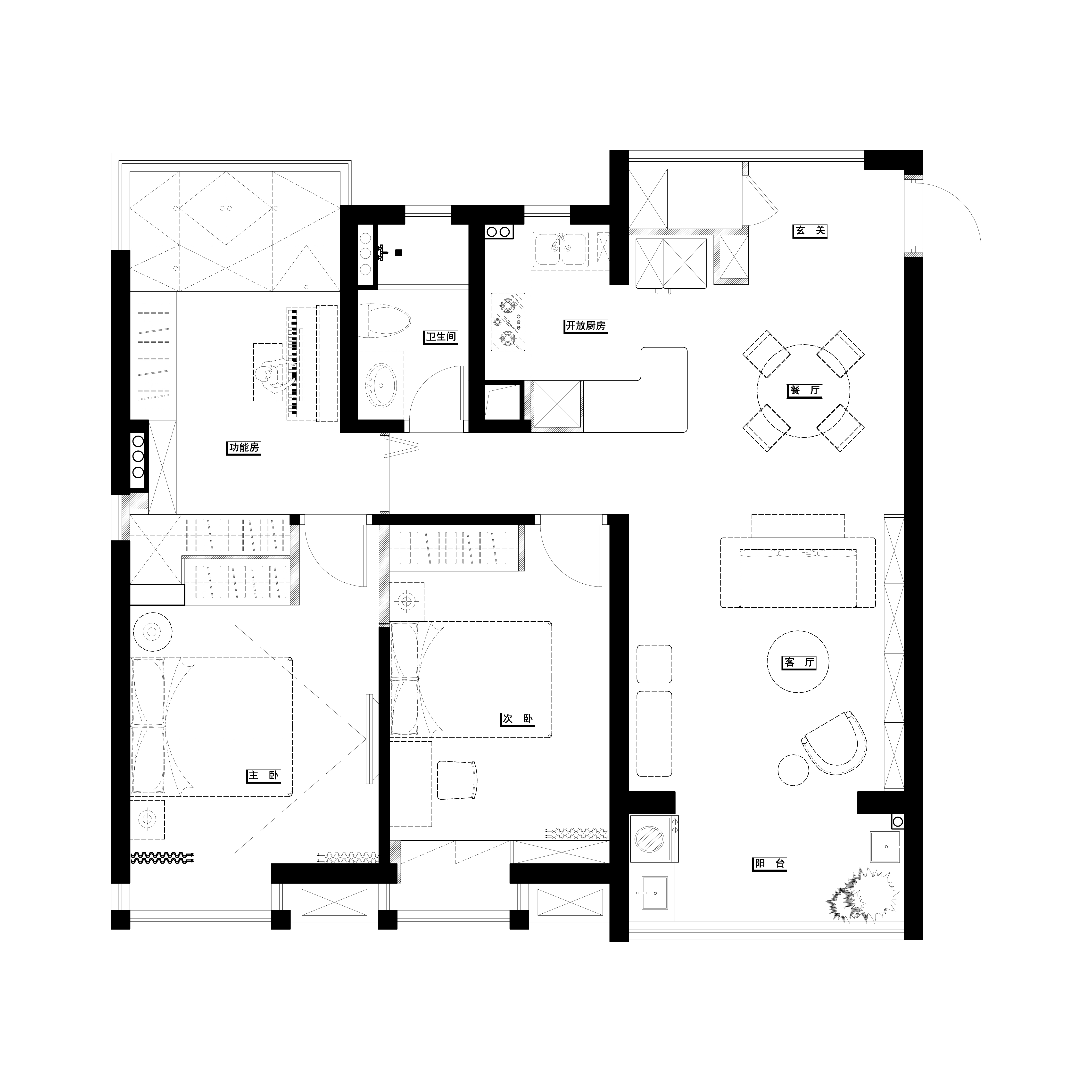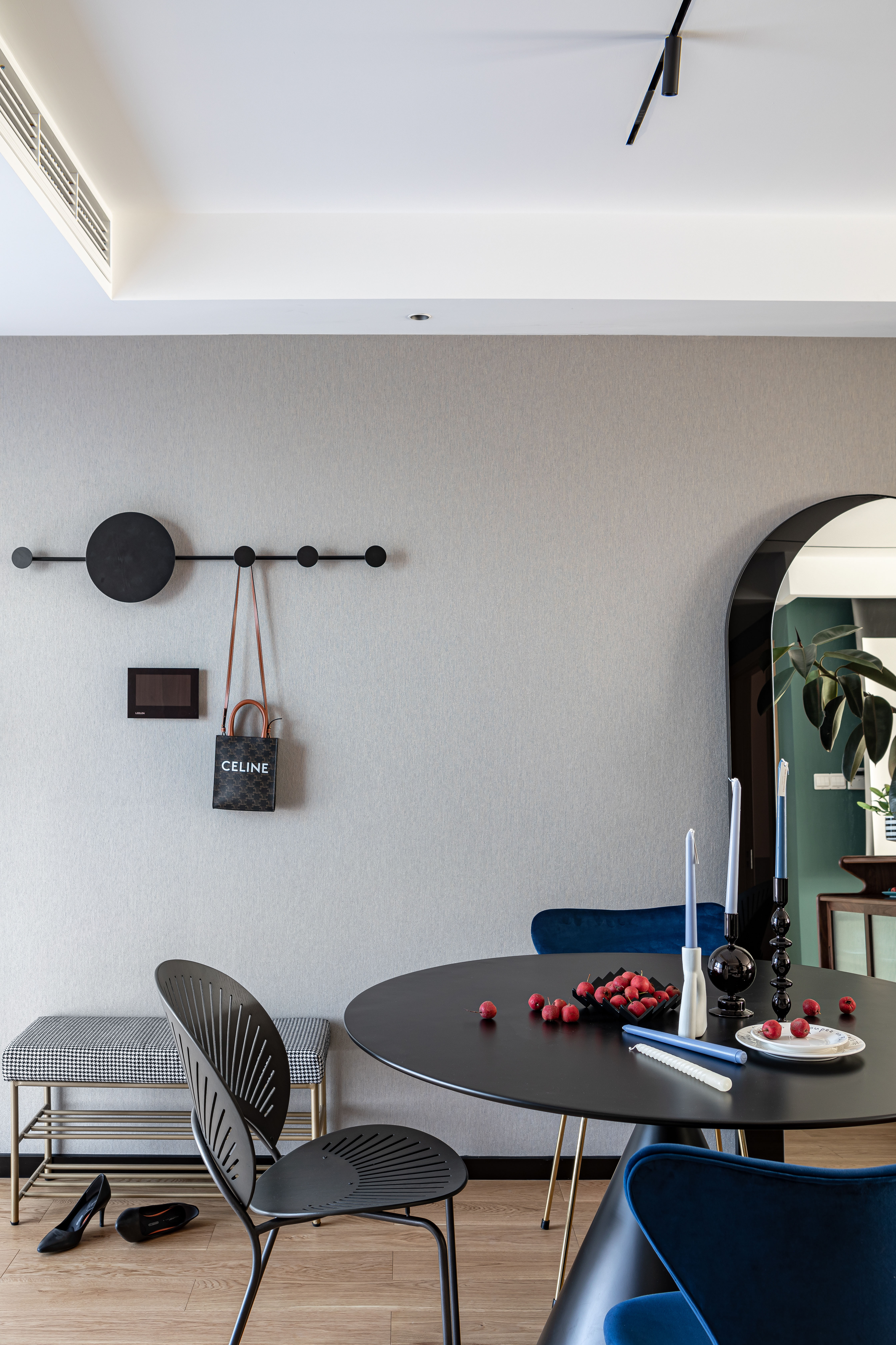空间布局:隐去多余墙体,重新排布整体格局,将客餐厅居于一条动线,塑造一个敞开式的公共活动区,为色彩和材质的创意组合提供更丰富的可能性。