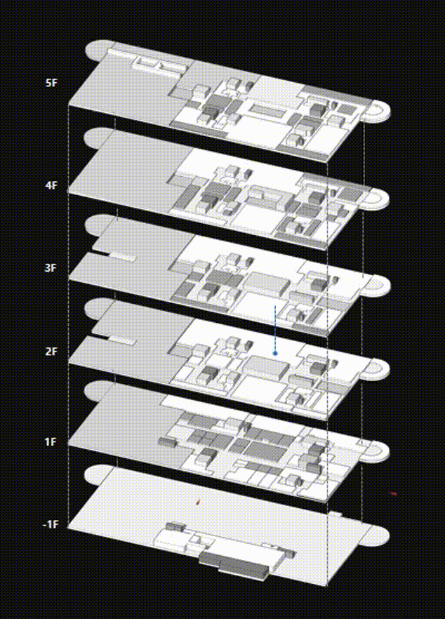 三层挑空的大中庭,是整栋大楼的核心所在,为复用功能区,在这个空间我们采用了轻量级的块状结构,布置具有灵活的分割性,可分可合,随意移动,有高效和明晰的人流交通动线。在特殊情况下可满足不同类型的场景化功能需求,灵活多变,提高中庭空间的使用率,丰富人与空间的互动性。