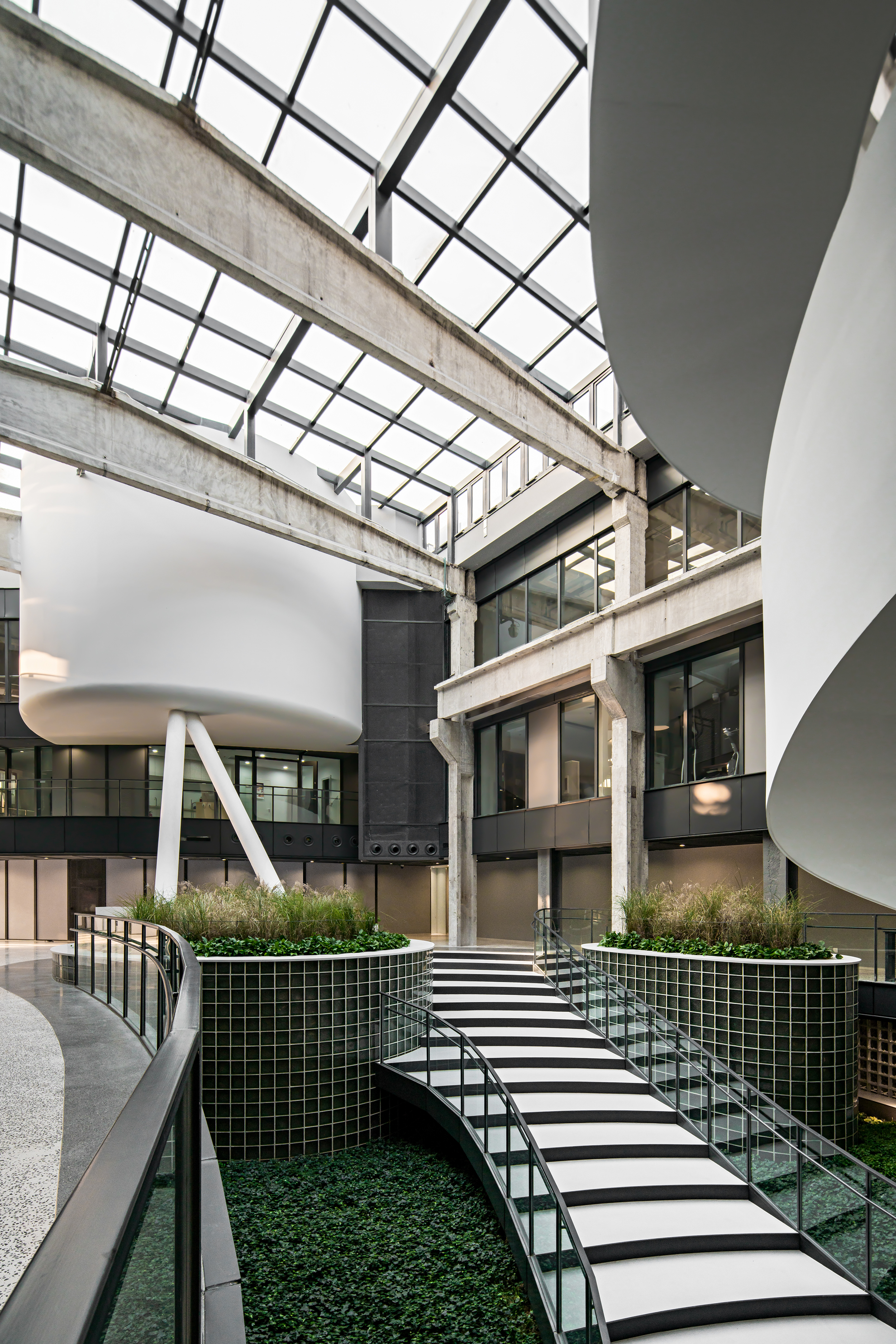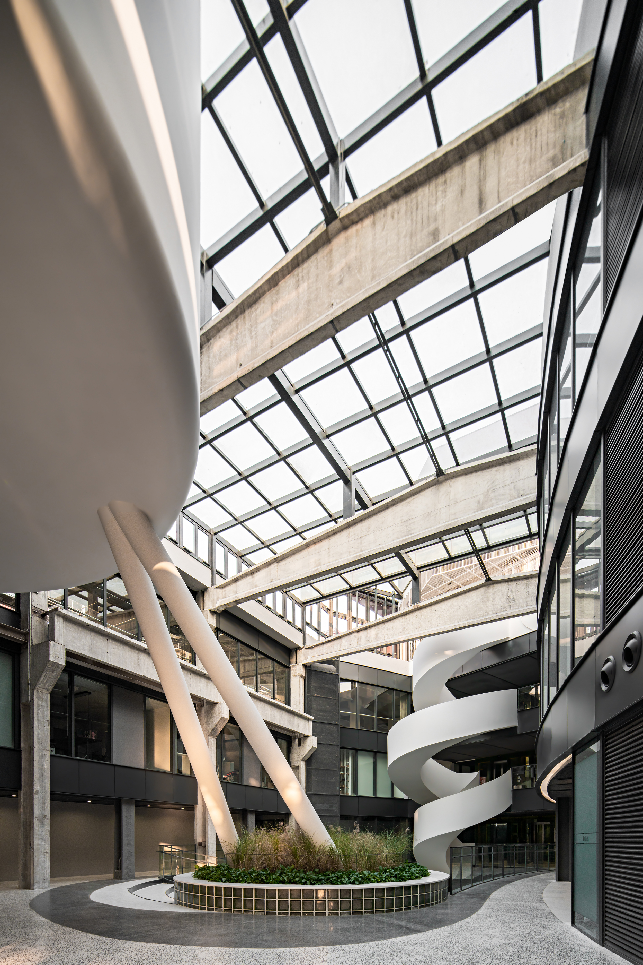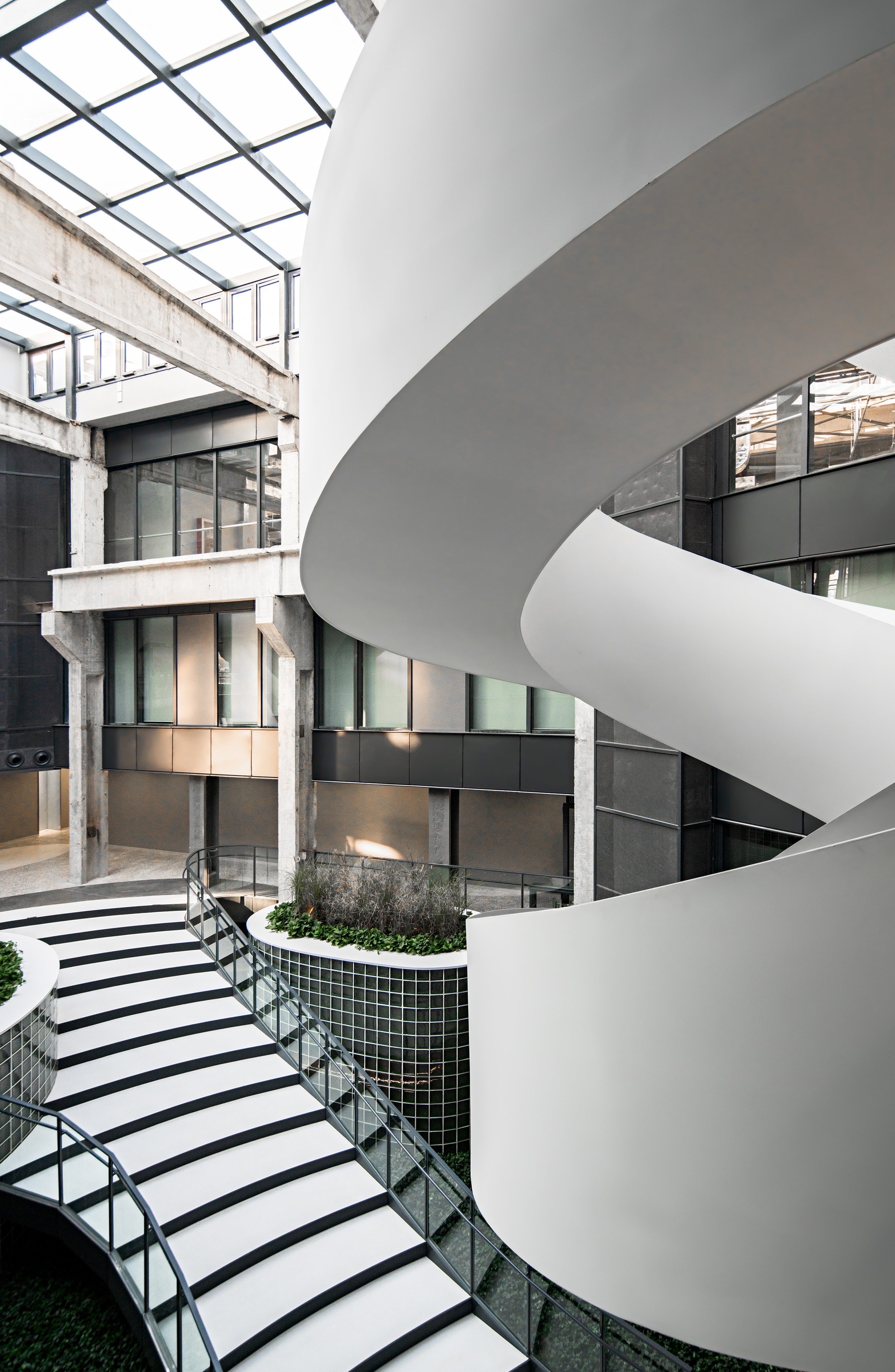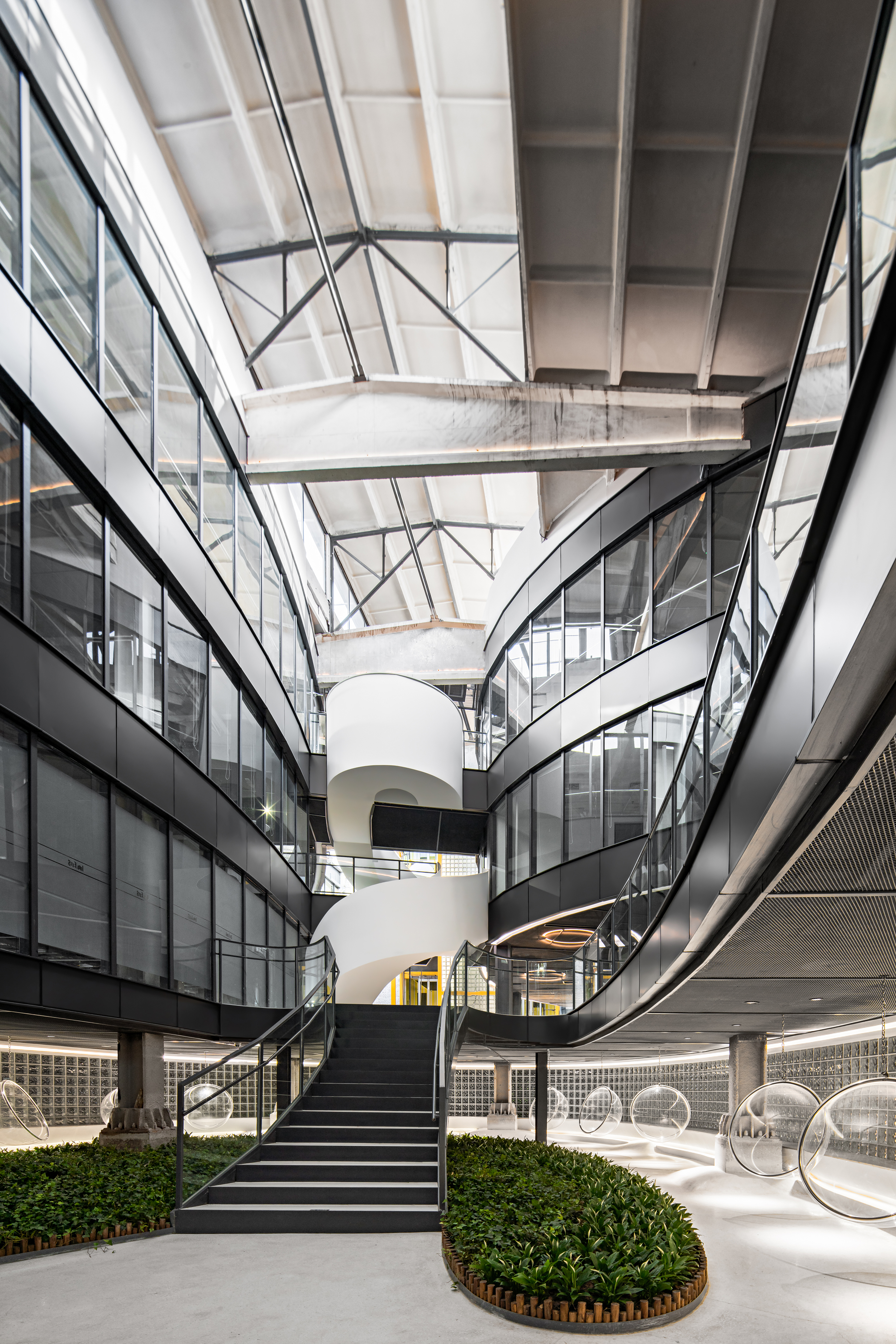 空间布局:从入口进入后,能看到大面积被扩建改造的采光天窗,光从此进入引导行进的方向。采光天窗一直延伸至与中庭连为一体,中庭花园沐浴在自然光线中。时间行至傍晚,灯光依旧温暖,天窗反衬出蔚蓝星空。中庭的后半部分保留了旧建筑的部分天窗,使新的空间使用者能够感受到原有厂房中独具特色的印迹。由于整个项目东西尺度较长,设计师在中庭间隔设计了两部不同形态的旋转楼梯分散组织人流动线,并起到活跃空间氛围的作用。旋转楼梯附近,两组开敞型的观光电梯与步行梯相呼应,同时采用明亮的色彩涂装结构钢架,形成中庭的视觉焦点,共同组成交通核心。艺术化的螺旋楼梯能与工业化的观光电梯相互对撞,令整个空间充满生机与活力,为上下的旅程增添一份趣味。为最大限度地满足泊车需求,设计师将原有地面下挖到柱子的基础,作为半地下车库使用。下沉的中庭花园向外延伸至车库,带来不一样的停车感受。