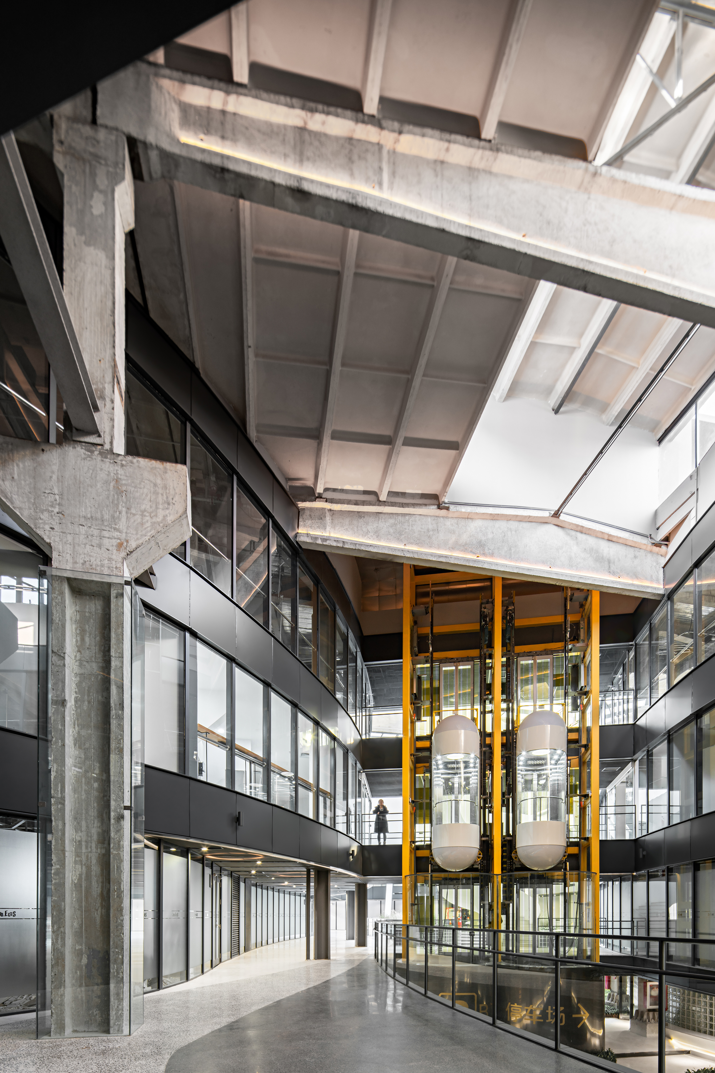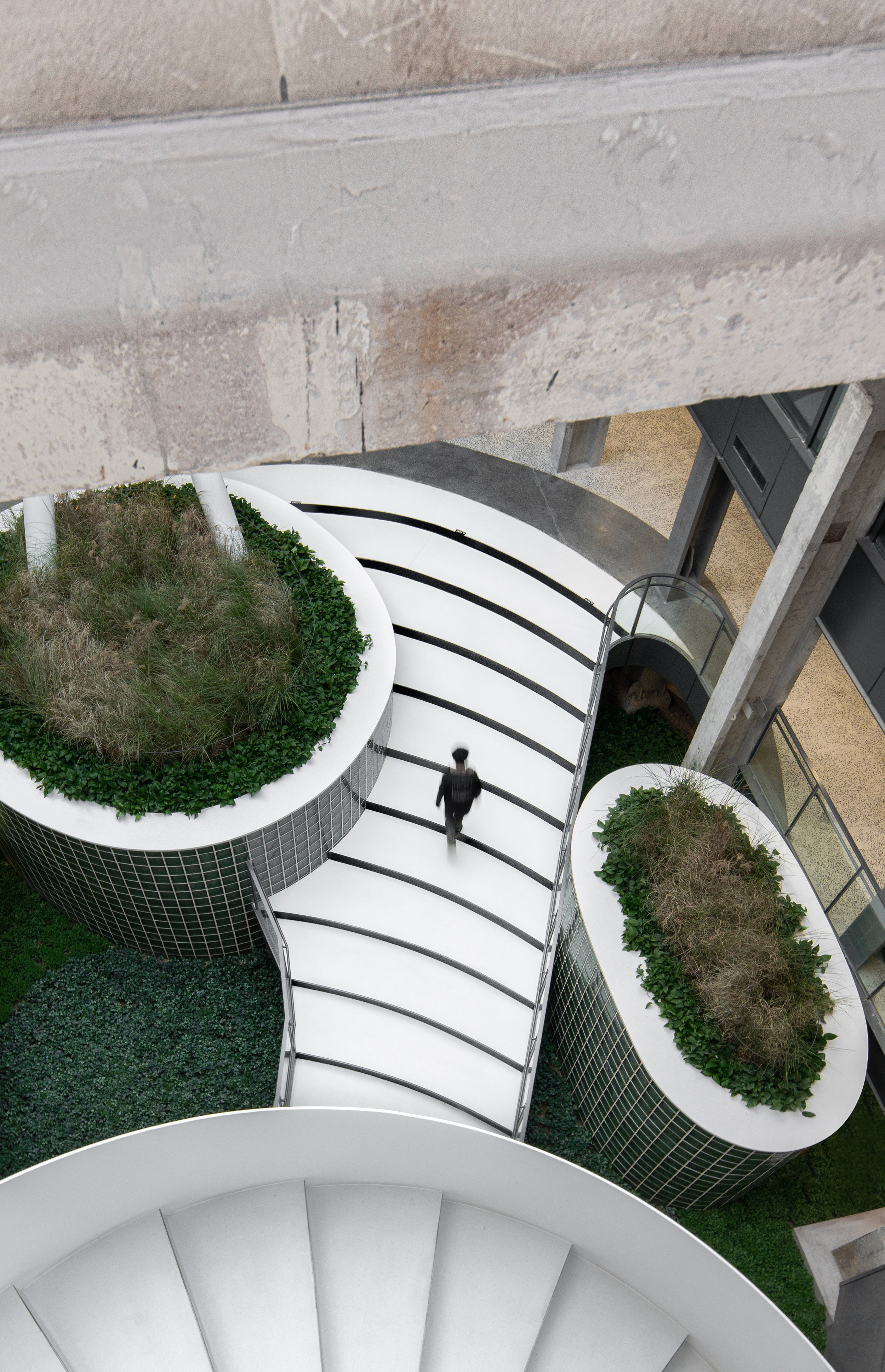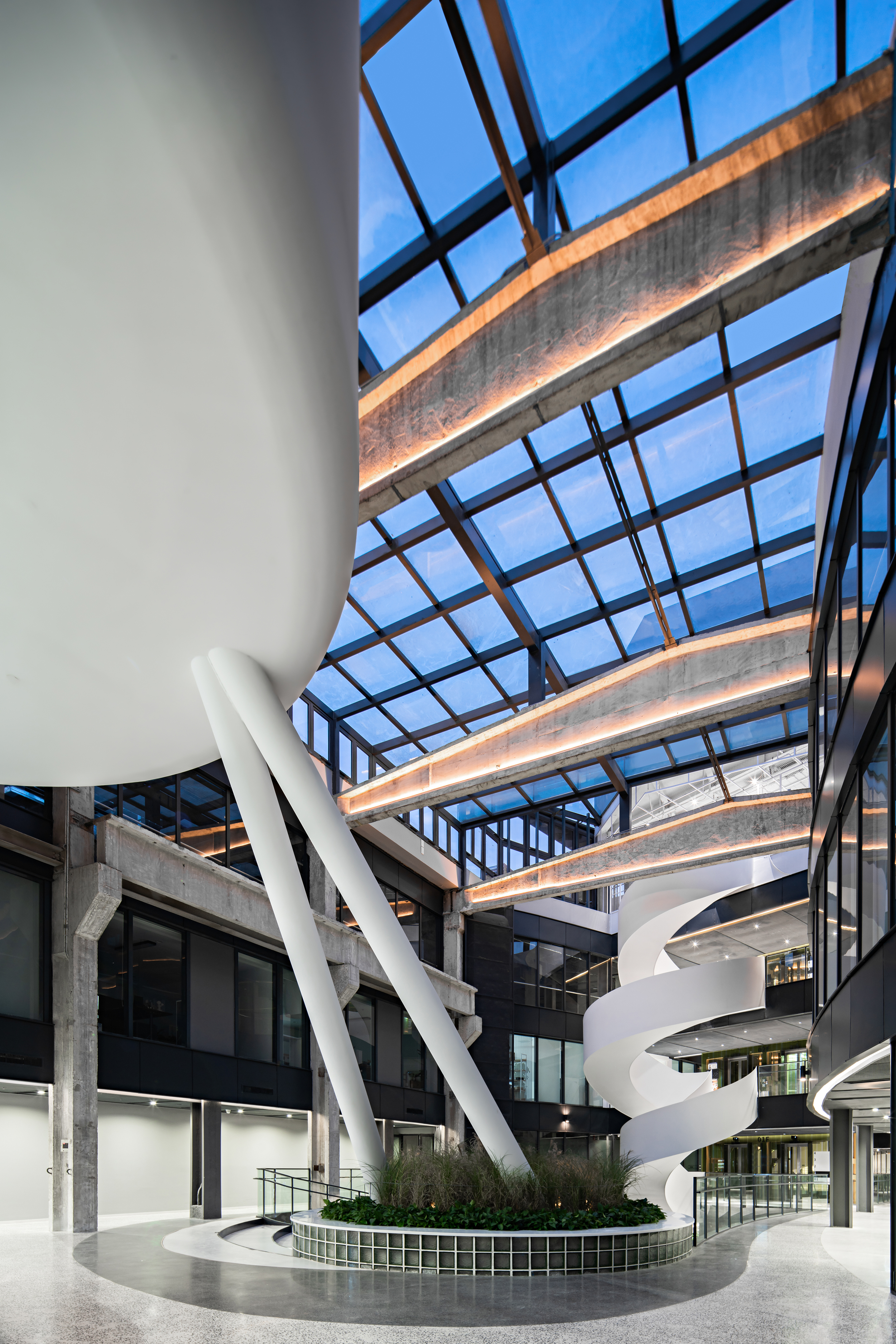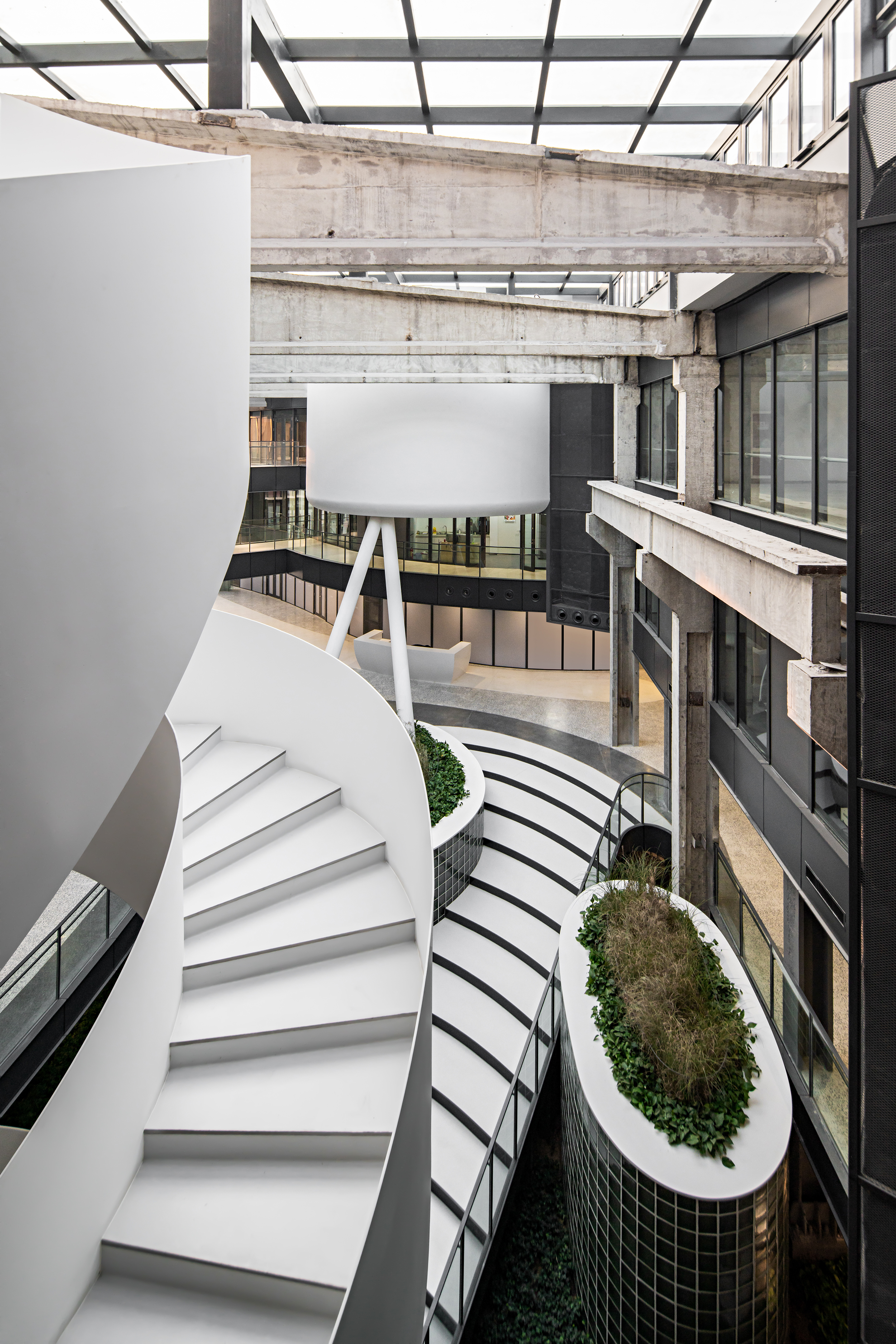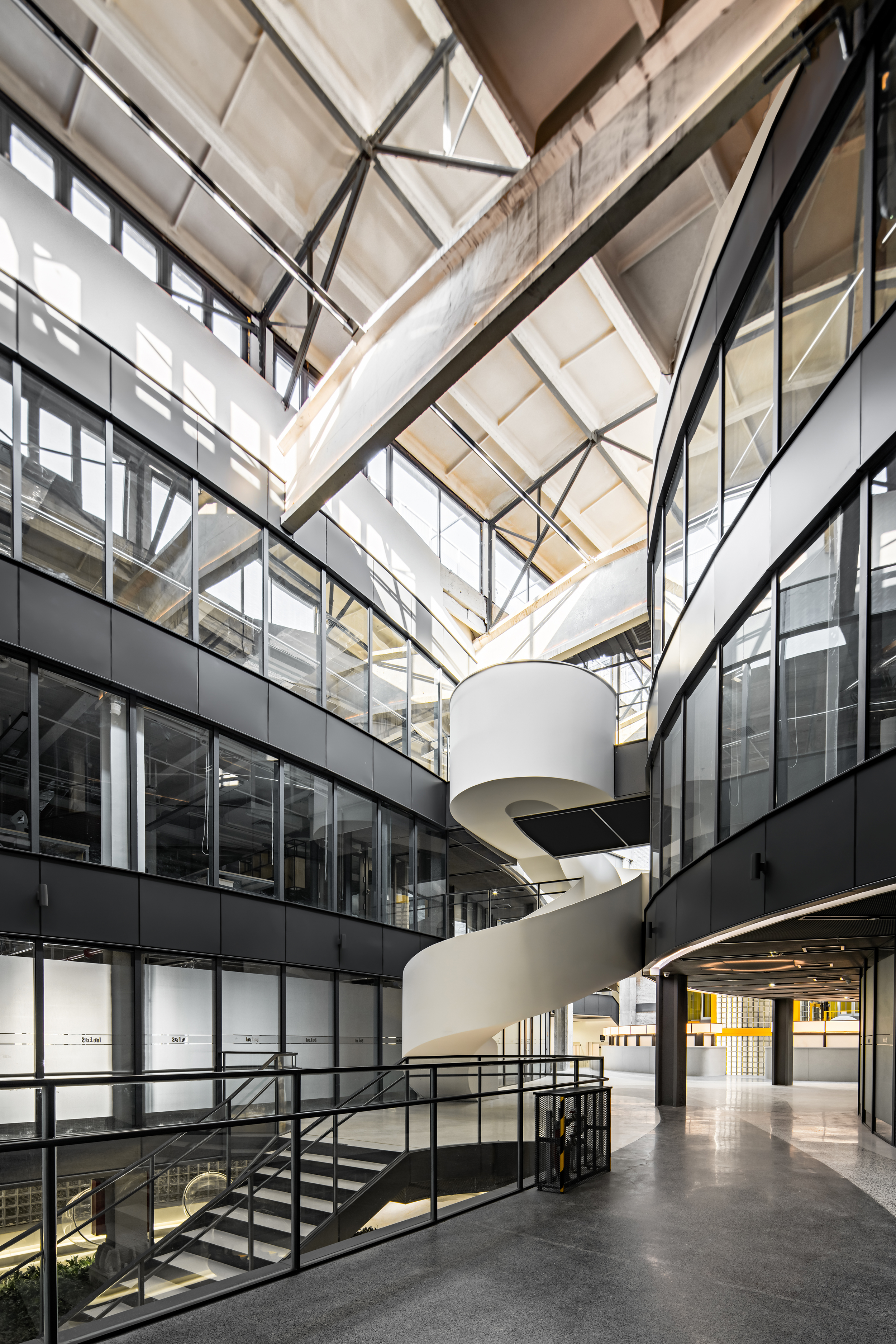 空间布局:从入口进入后,能看到大面积被扩建改造的采光天窗,光从此进入引导行进的方向。采光天窗一直延伸至与中庭连为一体,中庭花园沐浴在自然光线中。时间行至傍晚,灯光依旧温暖,天窗反衬出蔚蓝星空。中庭的后半部分保留了旧建筑的部分天窗,使新的空间使用者能够感受到原有厂房中独具特色的印迹。由于整个项目东西尺度较长,设计师在中庭间隔设计了两部不同形态的旋转楼梯分散组织人流动线,并起到活跃空间氛围的作用。旋转楼梯附近,两组开敞型的观光电梯与步行梯相呼应,同时采用明亮的色彩涂装结构钢架,形成中庭的视觉焦点,共同组成交通核心。艺术化的螺旋楼梯能与工业化的观光电梯相互对撞,令整个空间充满生机与活力,为上下的旅程增添一份趣味。为最大限度地满足泊车需求,设计师将原有地面下挖到柱子的基础,作为半地下车库使用。下沉的中庭花园向外延伸至车库,带来不一样的停车感受。