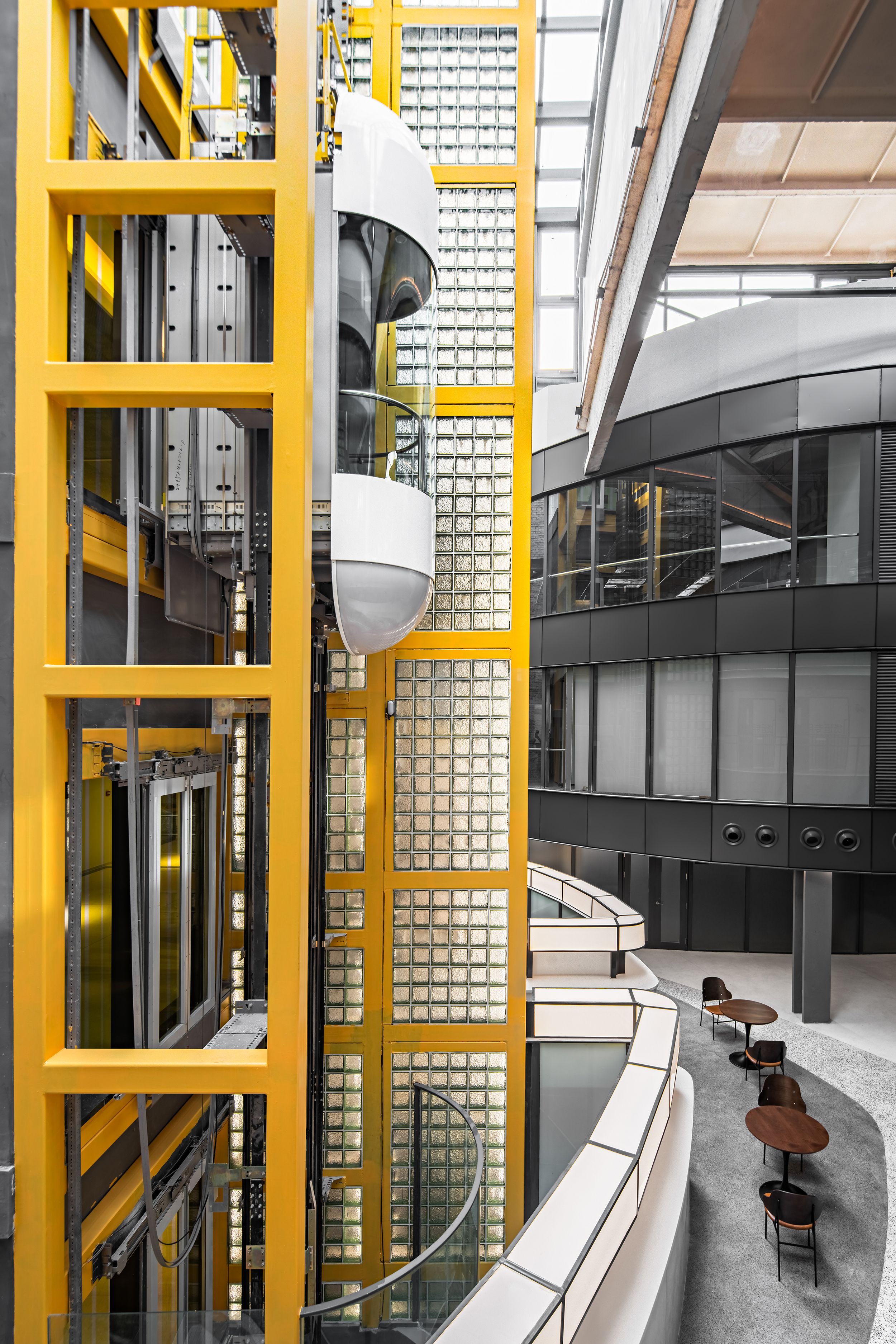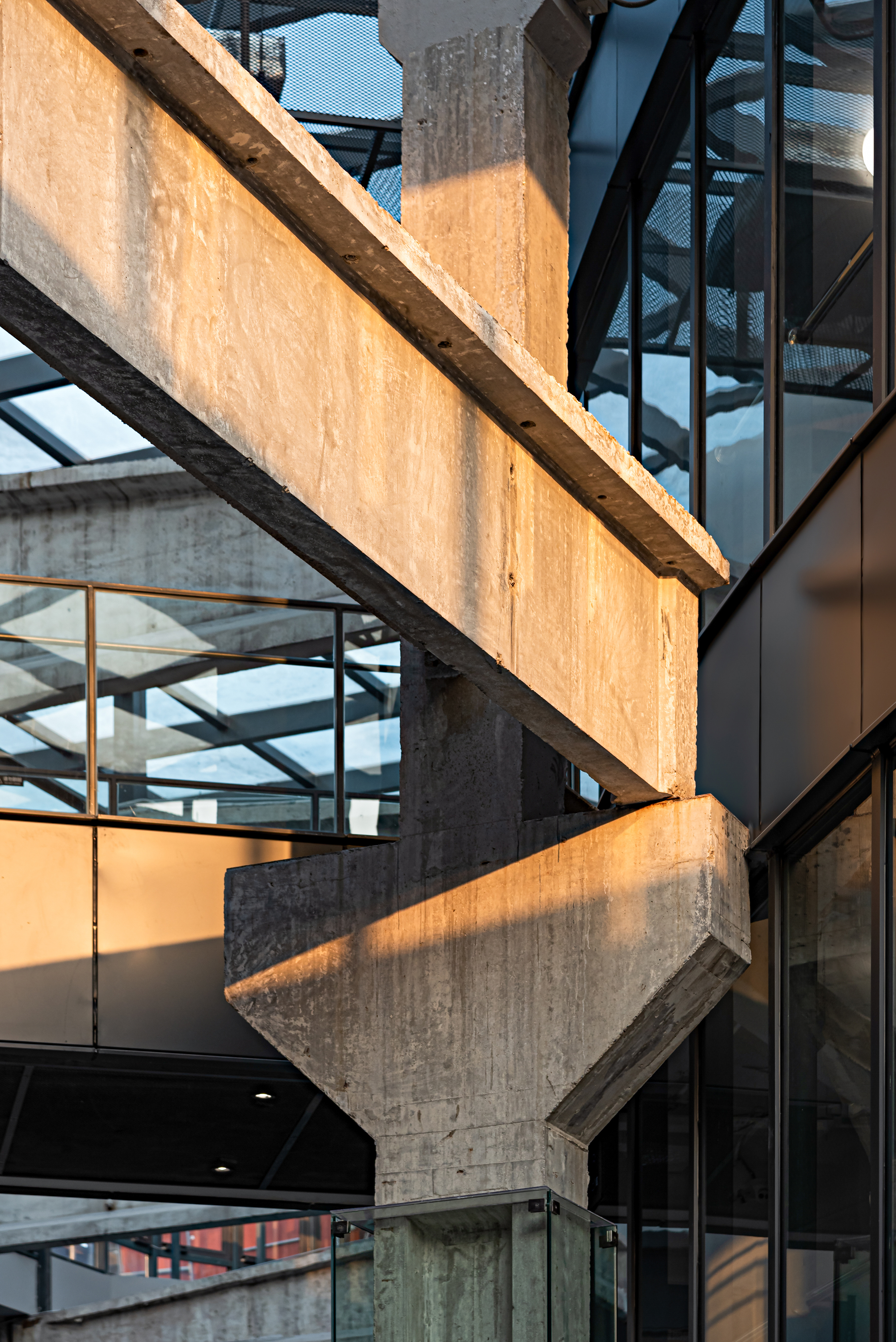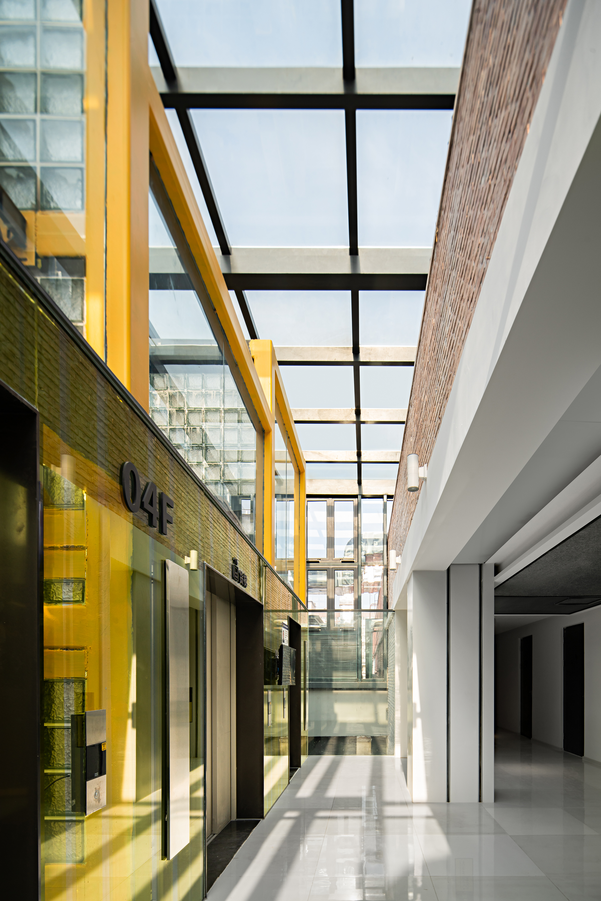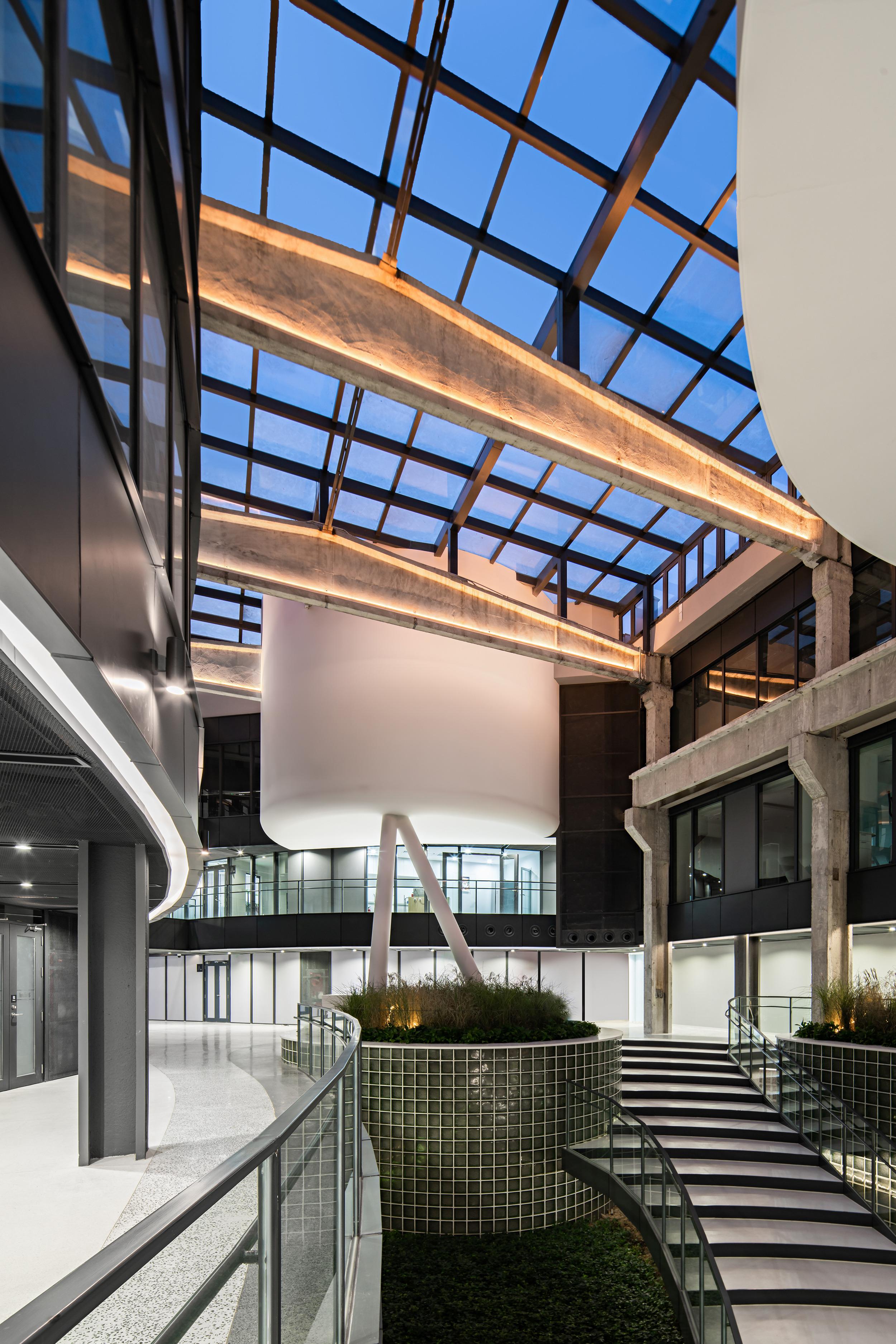 空间布局:从入口进入后,能看到大面积被扩建改造的采光天窗,光从此进入引导行进的方向。采光天窗一直延伸至与中庭连为一体,中庭花园沐浴在自然光线中。时间行至傍晚,灯光依旧温暖,天窗反衬出蔚蓝星空。中庭的后半部分保留了旧建筑的部分天窗,使新的空间使用者能够感受到原有厂房中独具特色的印迹。由于整个项目东西尺度较长,设计师在中庭间隔设计了两部不同形态的旋转楼梯分散组织人流动线,并起到活跃空间氛围的作用。旋转楼梯附近,两组开敞型的观光电梯与步行梯相呼应,同时采用明亮的色彩涂装结构钢架,形成中庭的视觉焦点,共同组成交通核心。艺术化的螺旋楼梯能与工业化的观光电梯相互对撞,令整个空间充满生机与活力,为上下的旅程增添一份趣味。为最大限度地满足泊车需求,设计师将原有地面下挖到柱子的基础,作为半地下车库使用。下沉的中庭花园向外延伸至车库,带来不一样的停车感受。