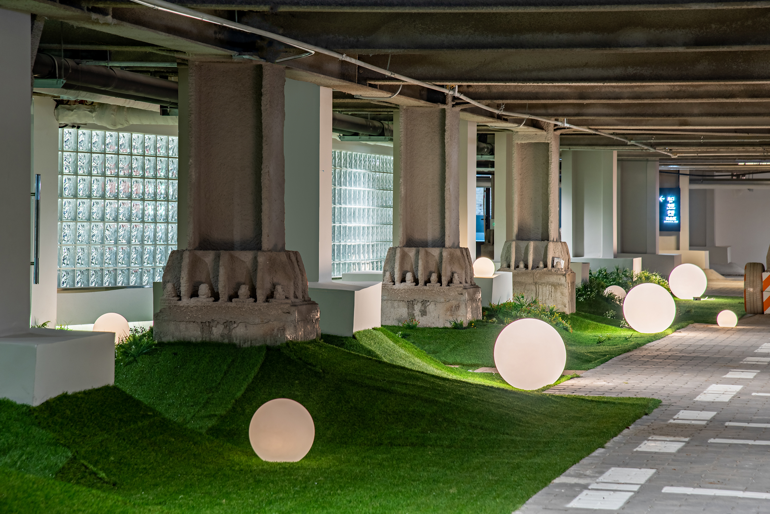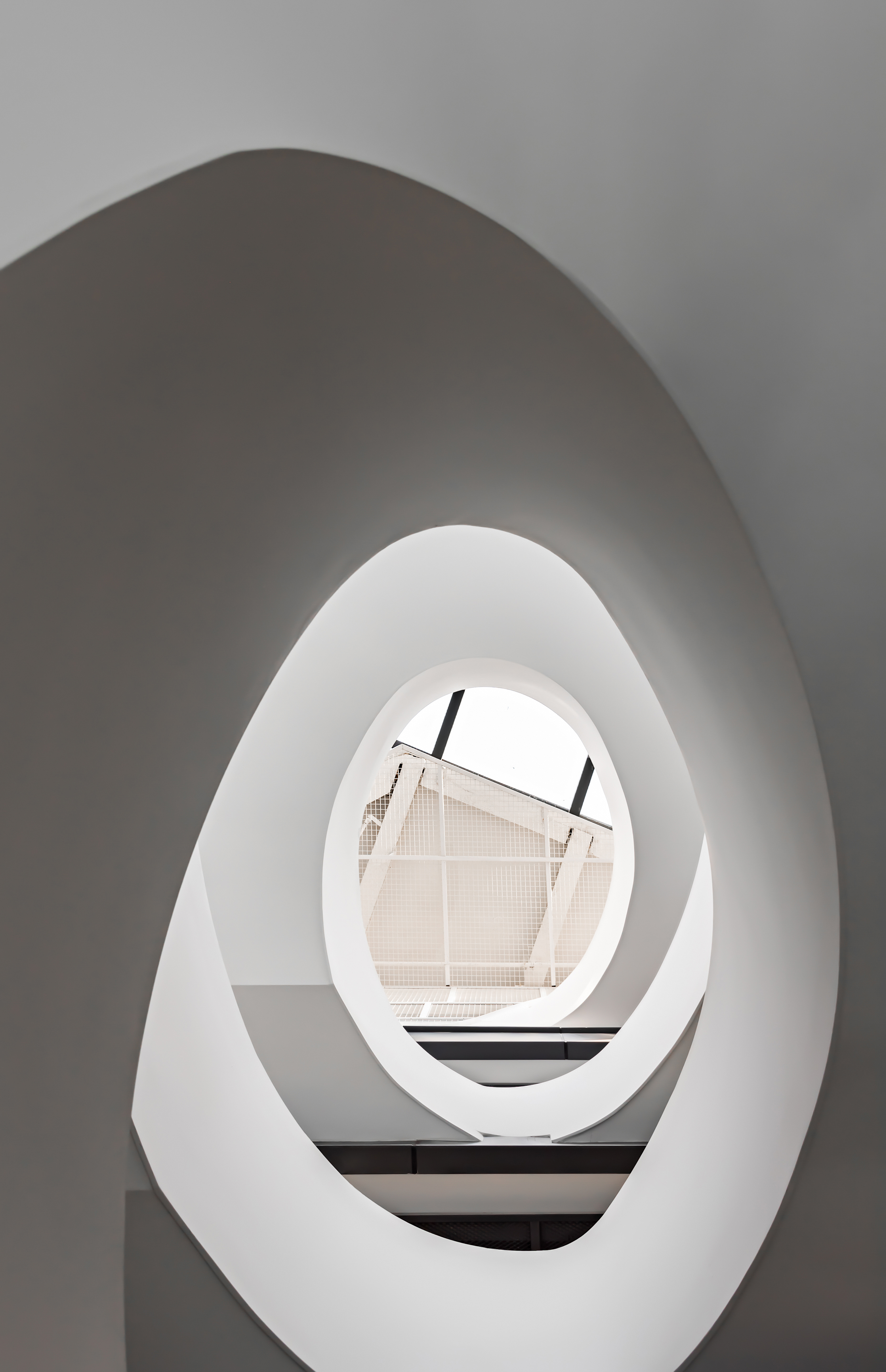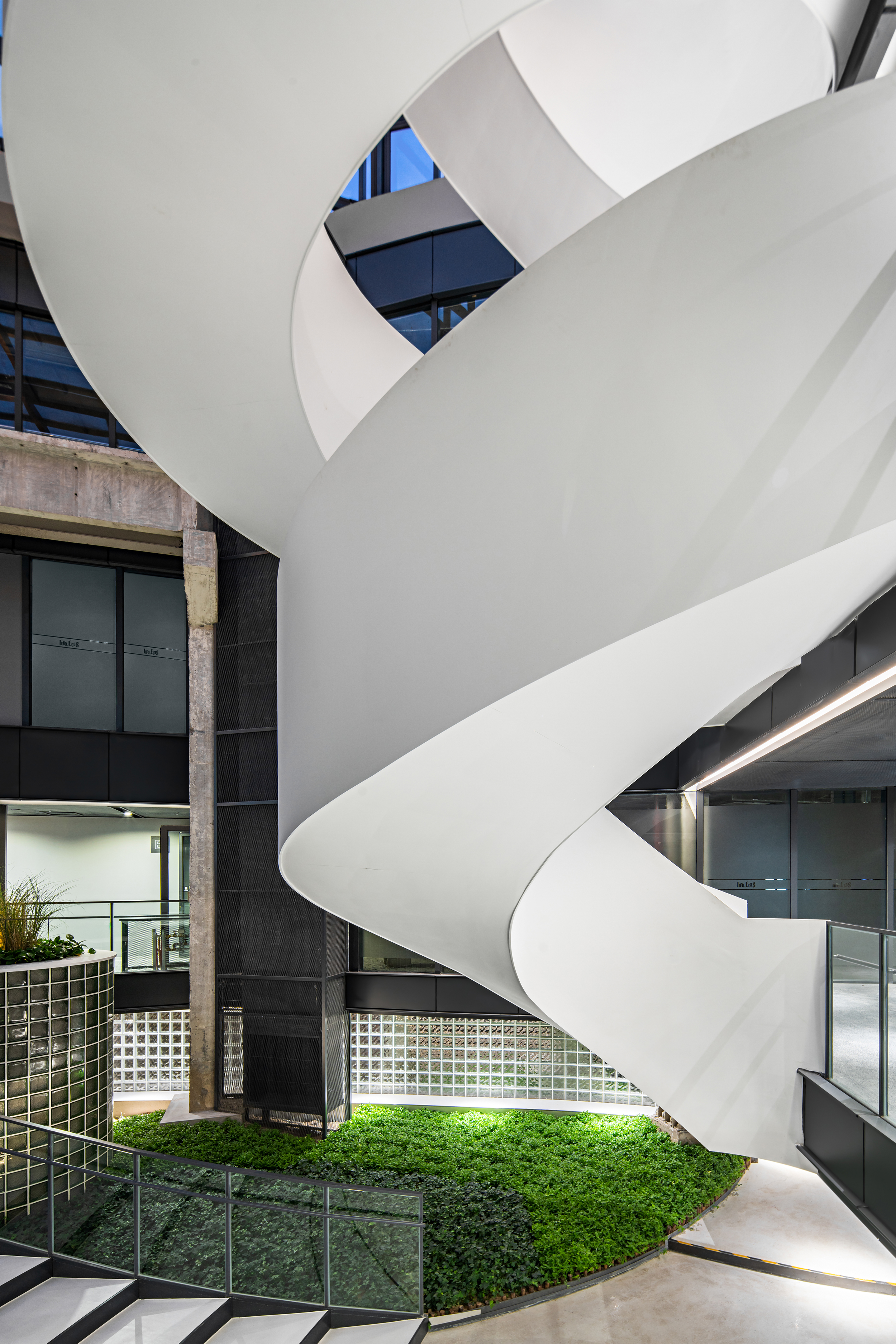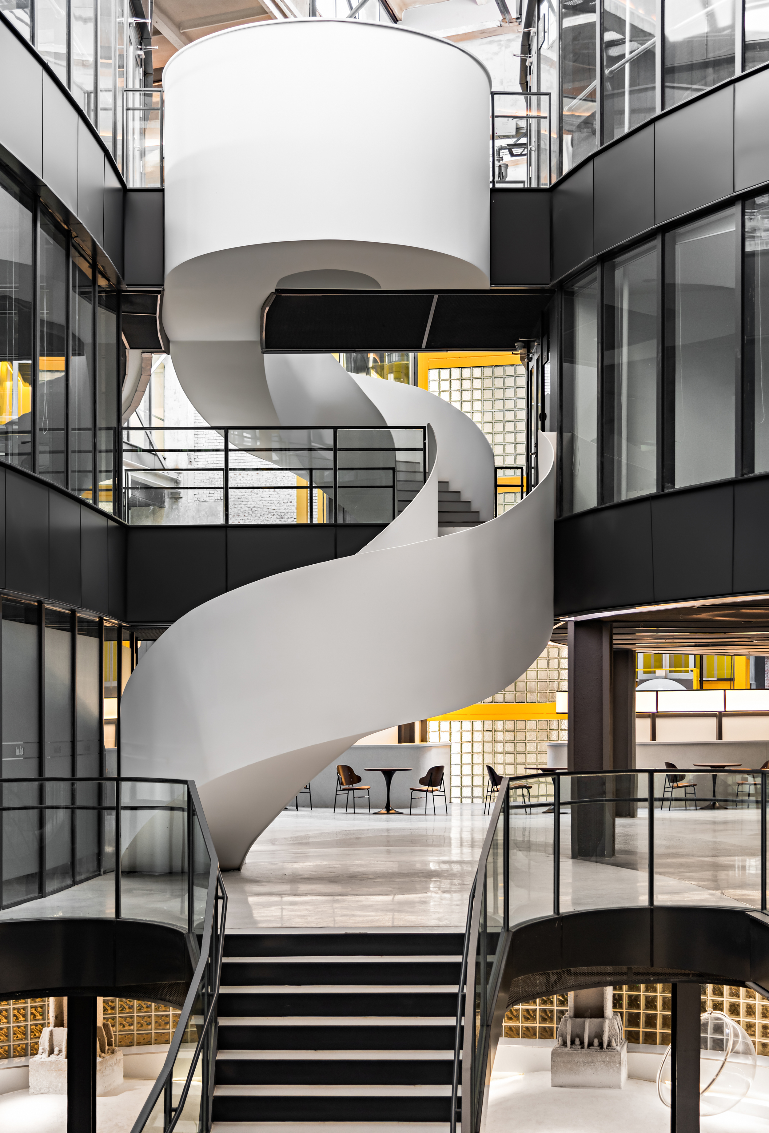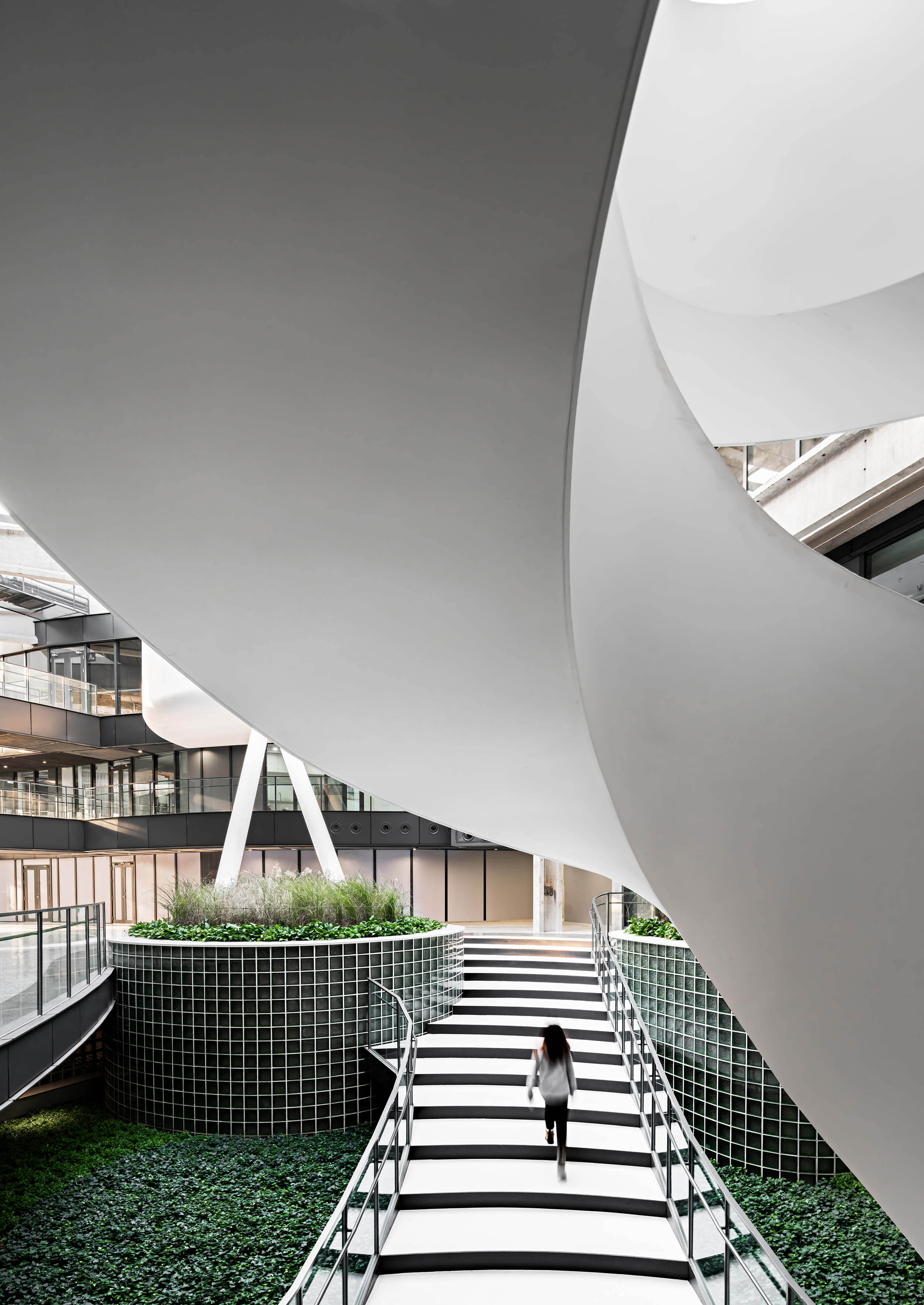 空间布局:从入口进入后,能看到大面积被扩建改造的采光天窗,光从此进入引导行进的方向。采光天窗一直延伸至与中庭连为一体,中庭花园沐浴在自然光线中。时间行至傍晚,灯光依旧温暖,天窗反衬出蔚蓝星空。中庭的后半部分保留了旧建筑的部分天窗,使新的空间使用者能够感受到原有厂房中独具特色的印迹。由于整个项目东西尺度较长,设计师在中庭间隔设计了两部不同形态的旋转楼梯分散组织人流动线,并起到活跃空间氛围的作用。旋转楼梯附近,两组开敞型的观光电梯与步行梯相呼应,同时采用明亮的色彩涂装结构钢架,形成中庭的视觉焦点,共同组成交通核心。艺术化的螺旋楼梯能与工业化的观光电梯相互对撞,令整个空间充满生机与活力,为上下的旅程增添一份趣味。为最大限度地满足泊车需求,设计师将原有地面下挖到柱子的基础,作为半地下车库使用。下沉的中庭花园向外延伸至车库,带来不一样的停车感受。