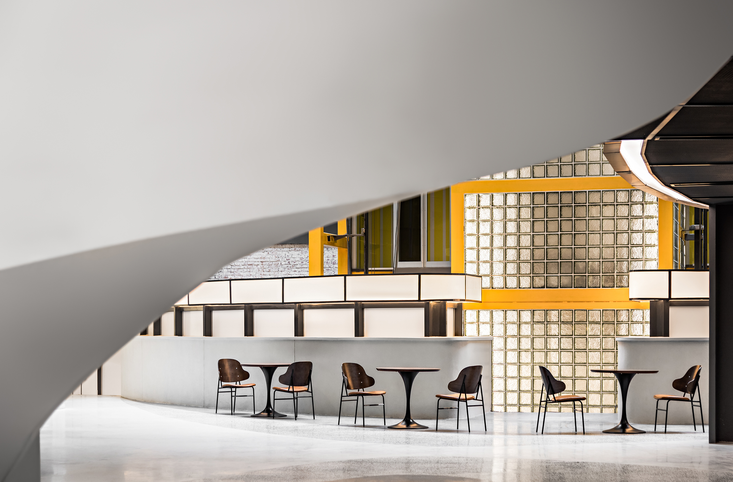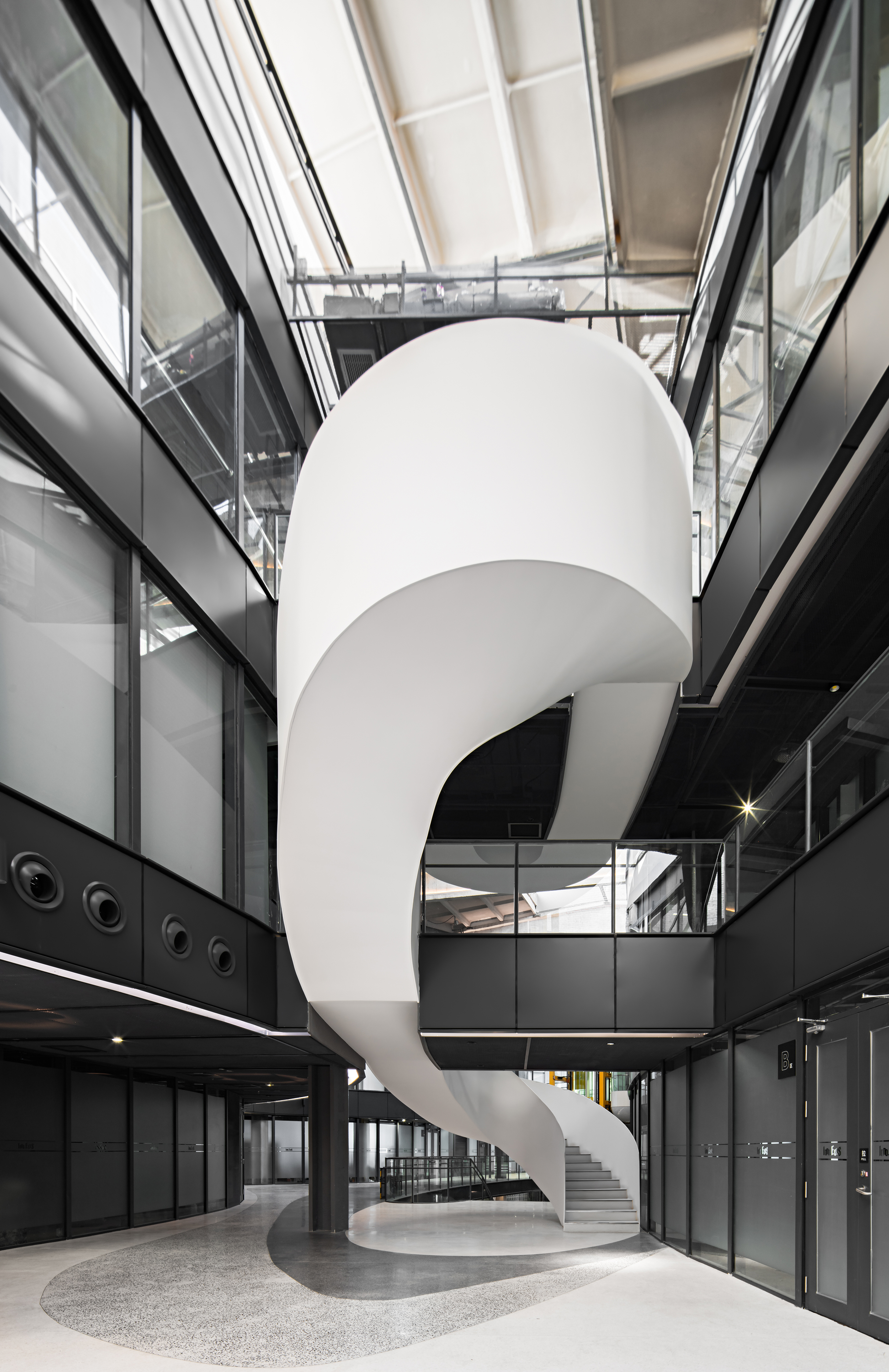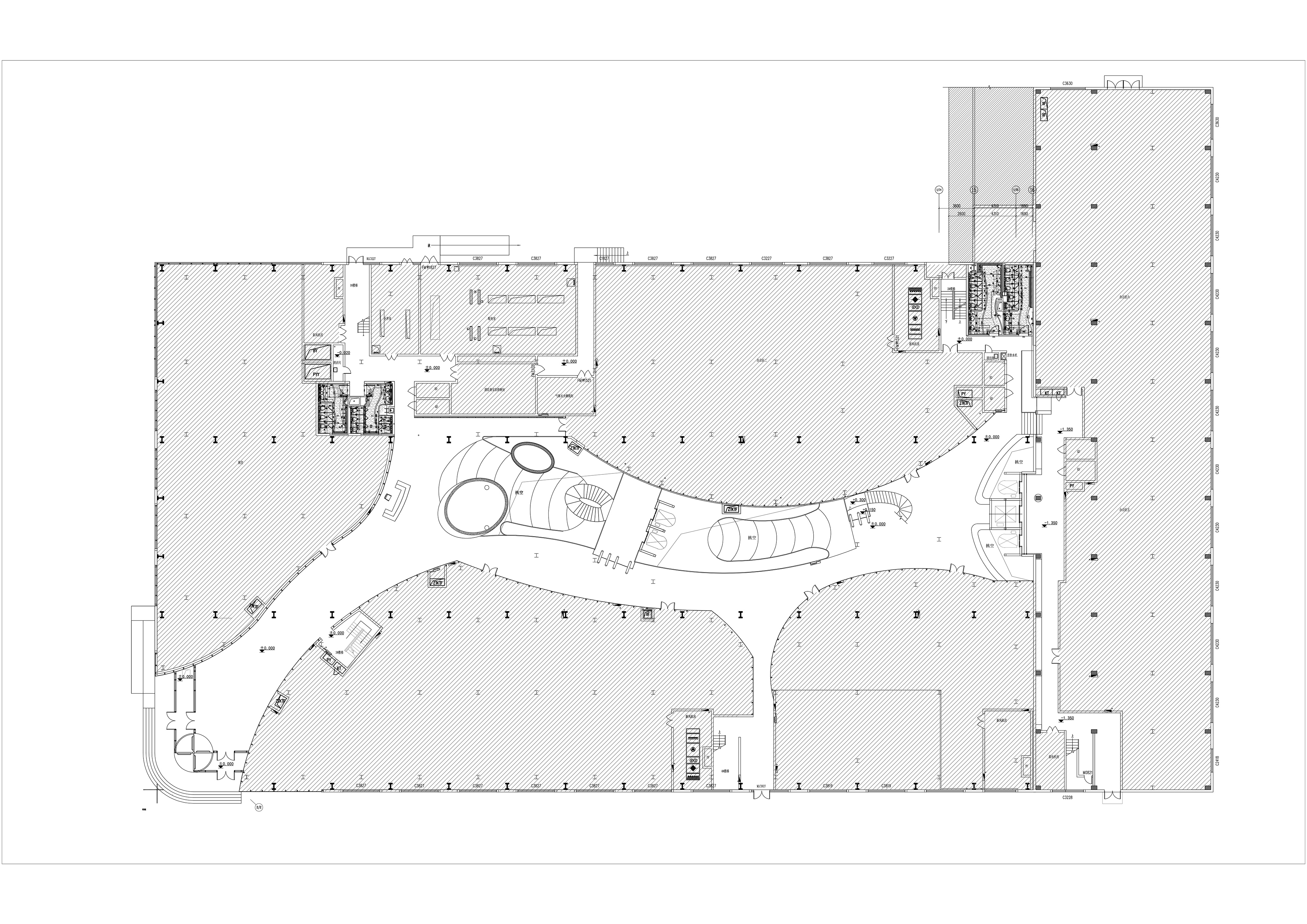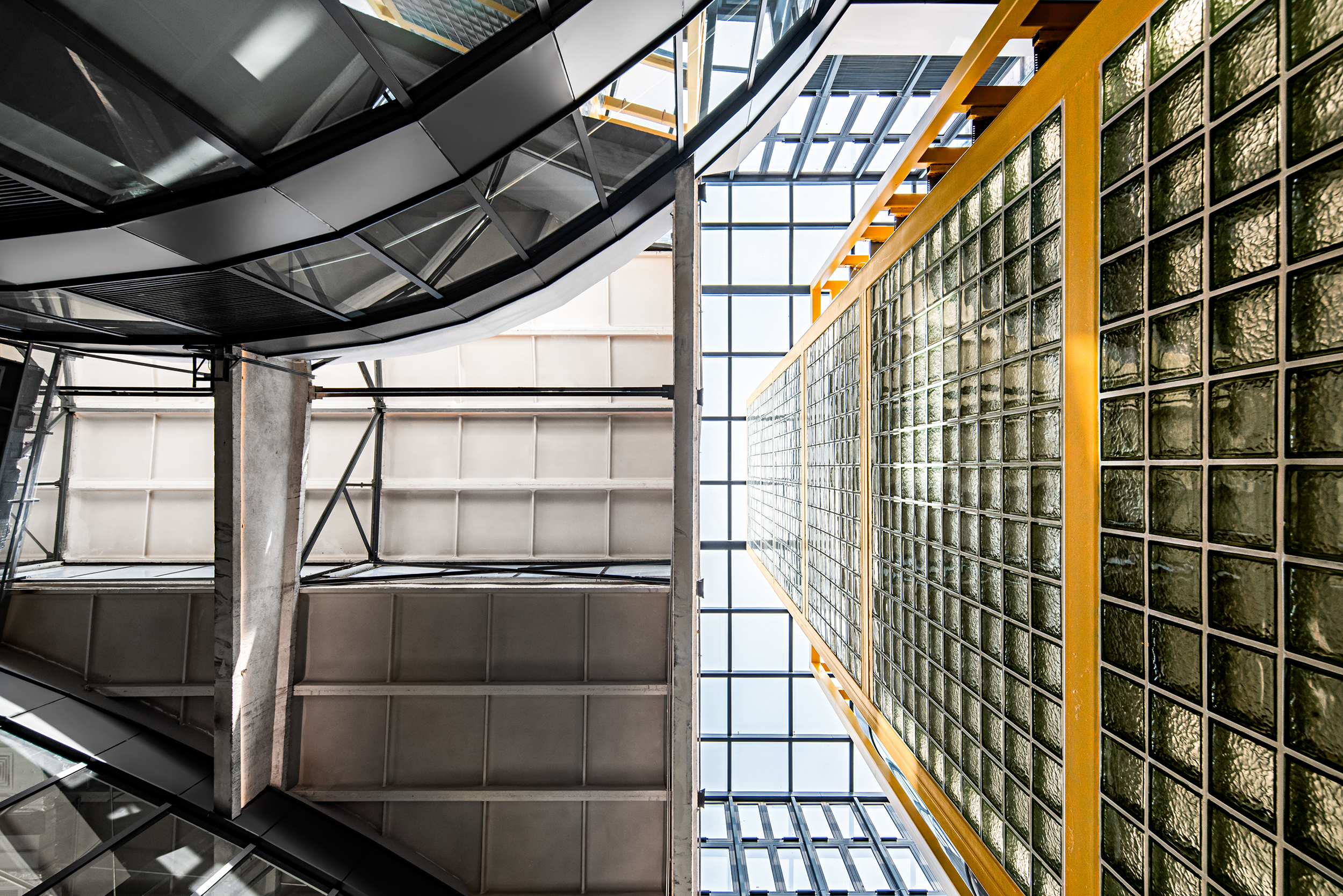 空间布局:从入口进入后,能看到大面积被扩建改造的采光天窗,光从此进入引导行进的方向。采光天窗一直延伸至与中庭连为一体,中庭花园沐浴在自然光线中。时间行至傍晚,灯光依旧温暖,天窗反衬出蔚蓝星空。中庭的后半部分保留了旧建筑的部分天窗,使新的空间使用者能够感受到原有厂房中独具特色的印迹。由于整个项目东西尺度较长,设计师在中庭间隔设计了两部不同形态的旋转楼梯分散组织人流动线,并起到活跃空间氛围的作用。旋转楼梯附近,两组开敞型的观光电梯与步行梯相呼应,同时采用明亮的色彩涂装结构钢架,形成中庭的视觉焦点,共同组成交通核心。艺术化的螺旋楼梯能与工业化的观光电梯相互对撞,令整个空间充满生机与活力,为上下的旅程增添一份趣味。为最大限度地满足泊车需求,设计师将原有地面下挖到柱子的基础,作为半地下车库使用。下沉的中庭花园向外延伸至车库,带来不一样的停车感受。