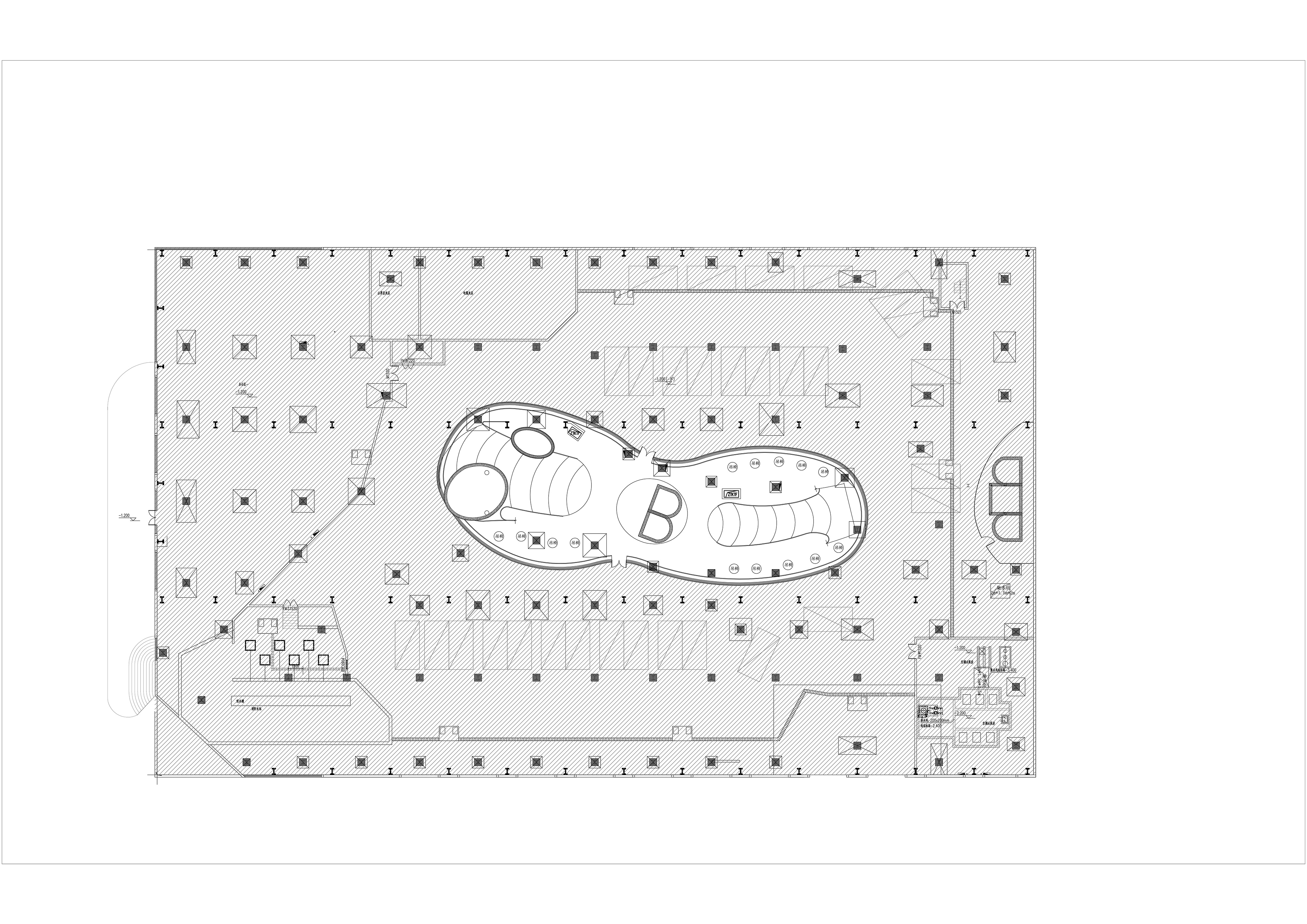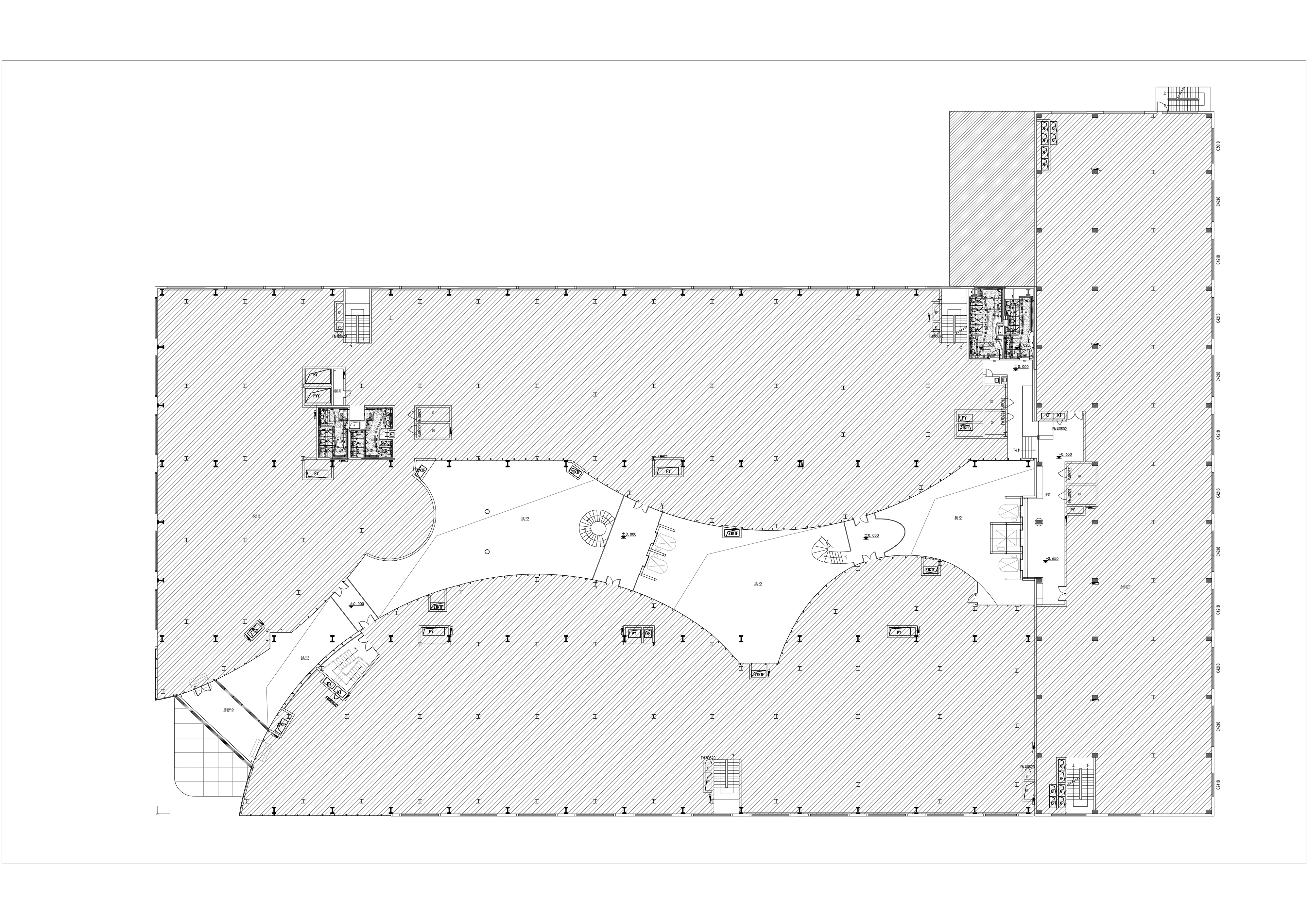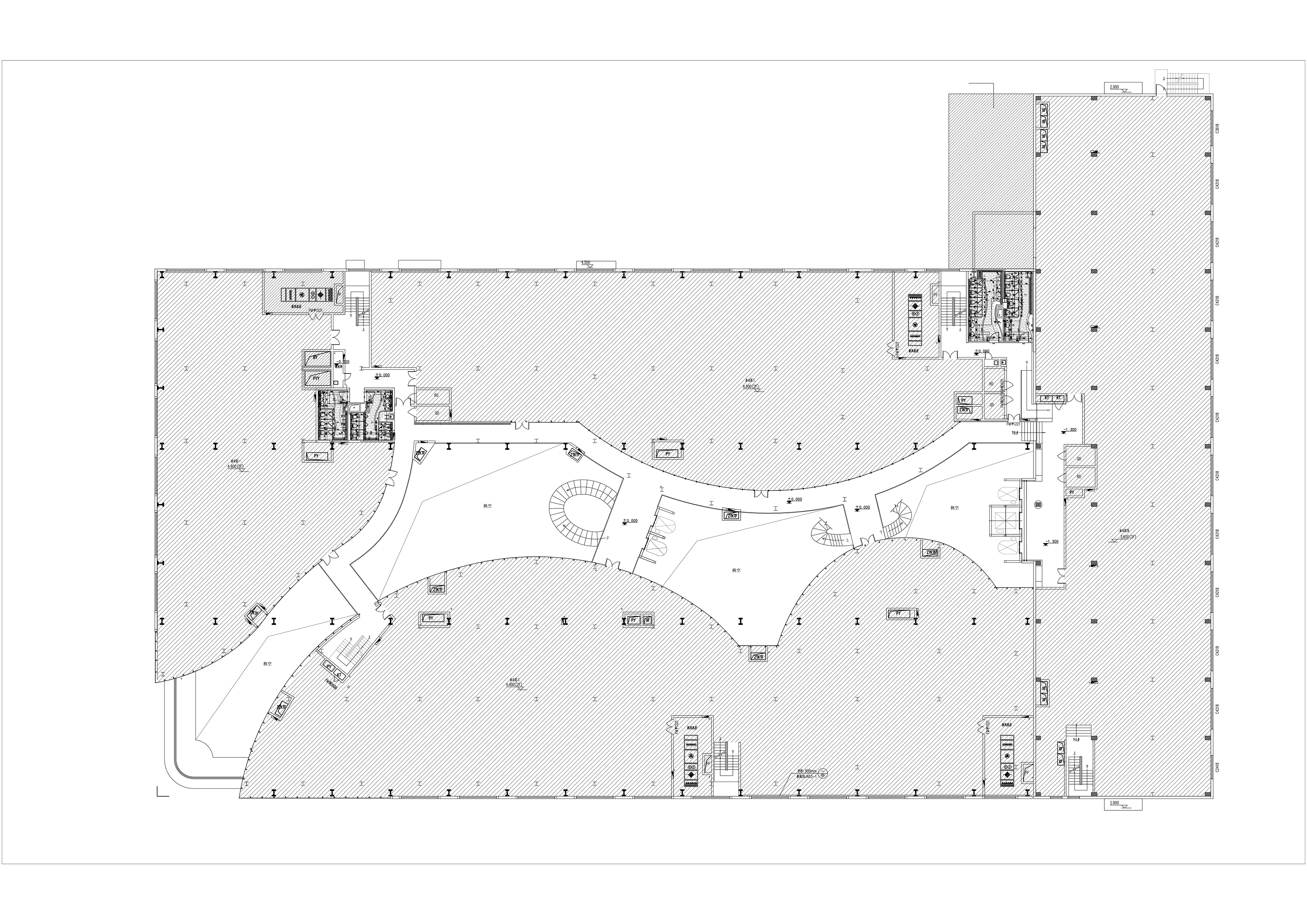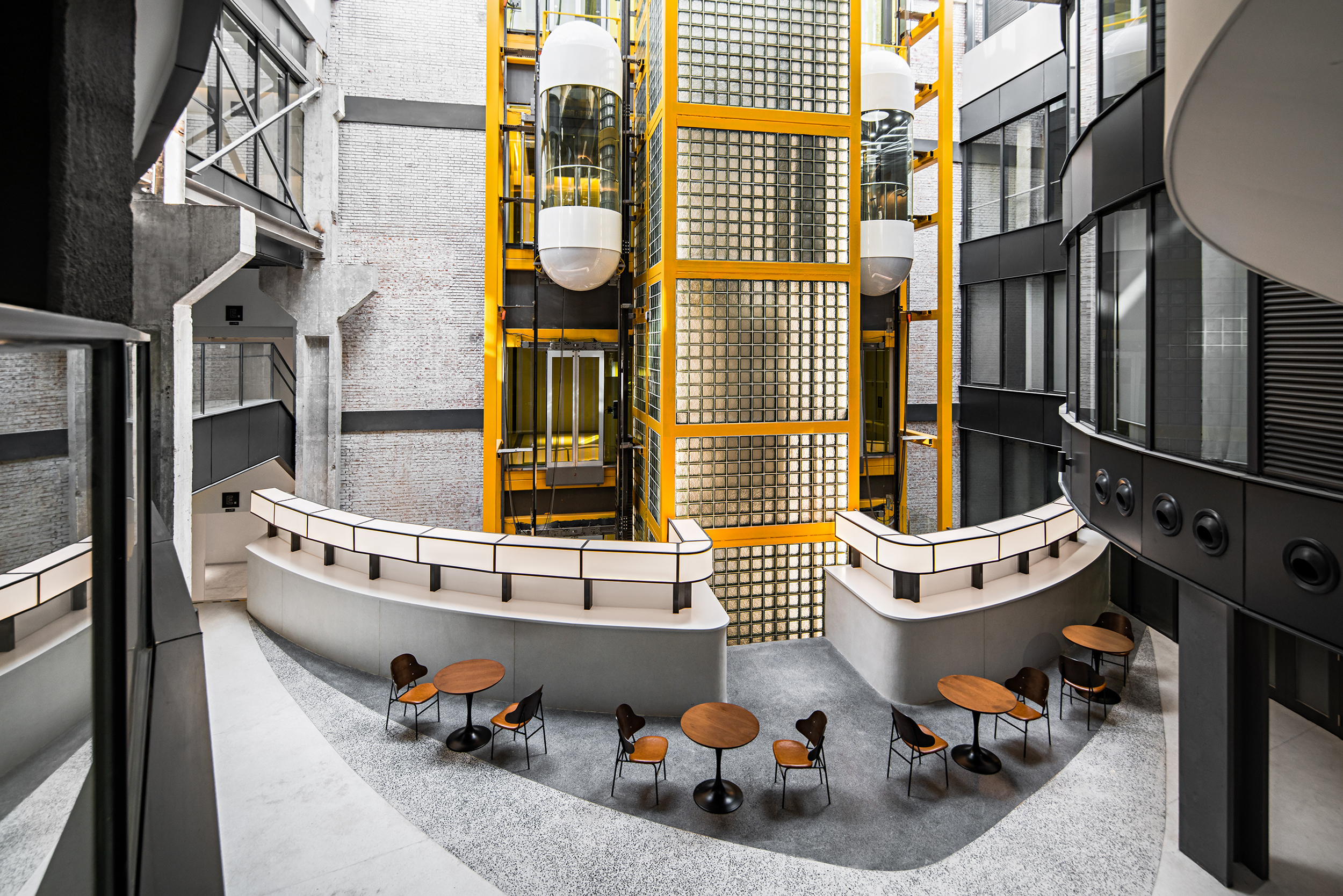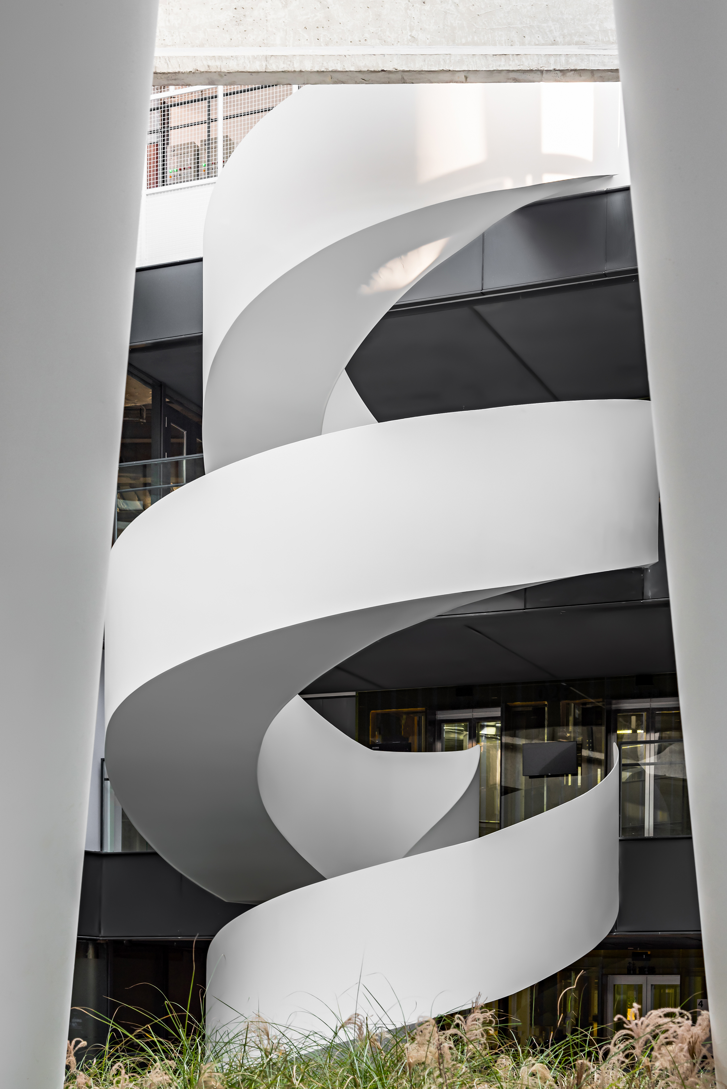 空间布局:从入口进入后,能看到大面积被扩建改造的采光天窗,光从此进入引导行进的方向。采光天窗一直延伸至与中庭连为一体,中庭花园沐浴在自然光线中。时间行至傍晚,灯光依旧温暖,天窗反衬出蔚蓝星空。中庭的后半部分保留了旧建筑的部分天窗,使新的空间使用者能够感受到原有厂房中独具特色的印迹。由于整个项目东西尺度较长,设计师在中庭间隔设计了两部不同形态的旋转楼梯分散组织人流动线,并起到活跃空间氛围的作用。旋转楼梯附近,两组开敞型的观光电梯与步行梯相呼应,同时采用明亮的色彩涂装结构钢架,形成中庭的视觉焦点,共同组成交通核心。艺术化的螺旋楼梯能与工业化的观光电梯相互对撞,令整个空间充满生机与活力,为上下的旅程增添一份趣味。为最大限度地满足泊车需求,设计师将原有地面下挖到柱子的基础,作为半地下车库使用。下沉的中庭花园向外延伸至车库,带来不一样的停车感受。
