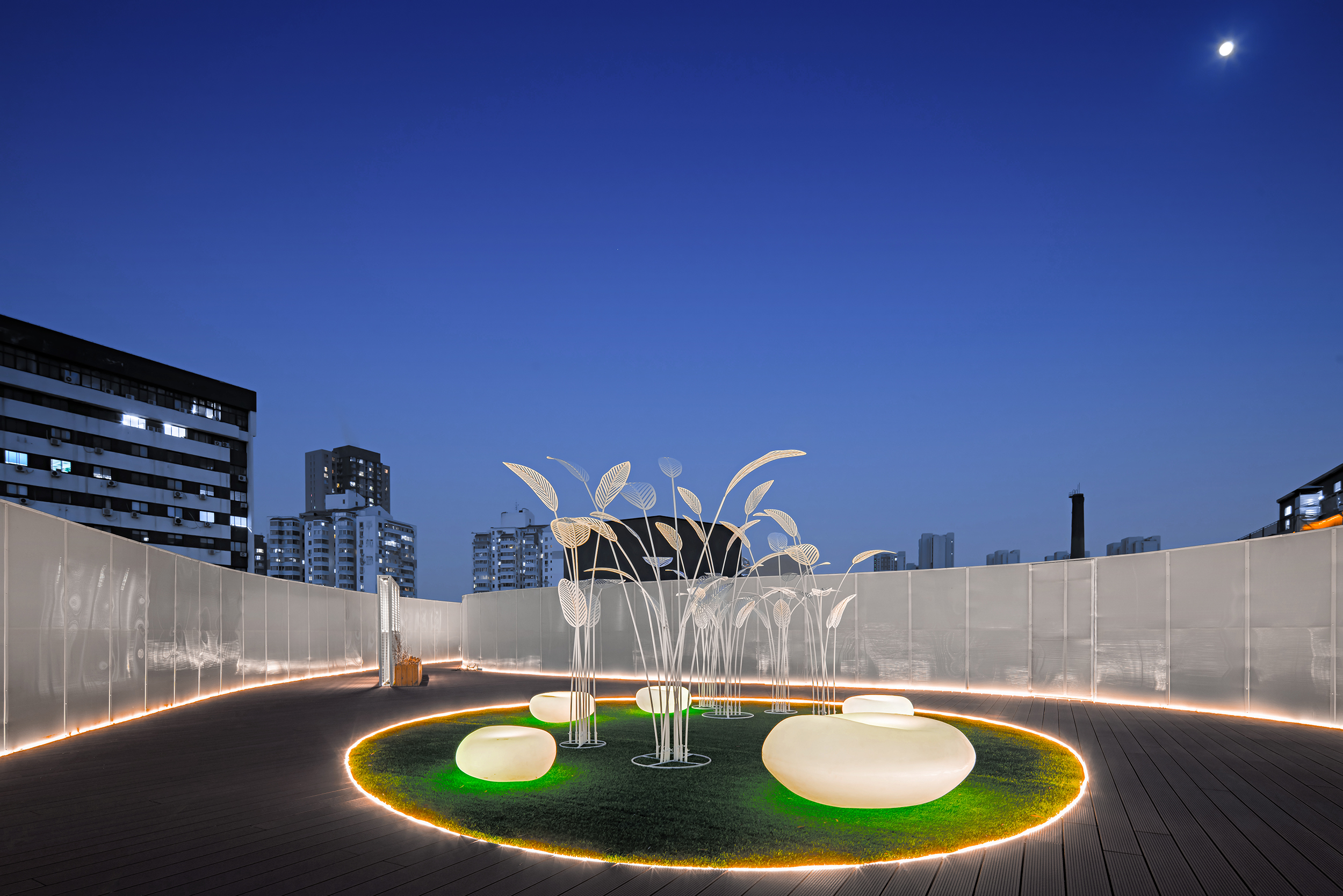 设计选材:为了最大化提高使用率,屋顶几乎承担了整个建筑的所有机电设备。于设计师见缝插针地在原有建筑的斜屋面上设计了休闲与聚会两个风格功能迥异的屋顶花园。花园中心设计太阳能自发光座椅及叶片、羽毛形态的艺术装置,夜晚漫步时,互联网人的思绪也可以随时飞舞起来。我们不仅希望使用者的窗外有一片花园和星空,也希望周边的建筑和使用者感受到这片花园和星空。