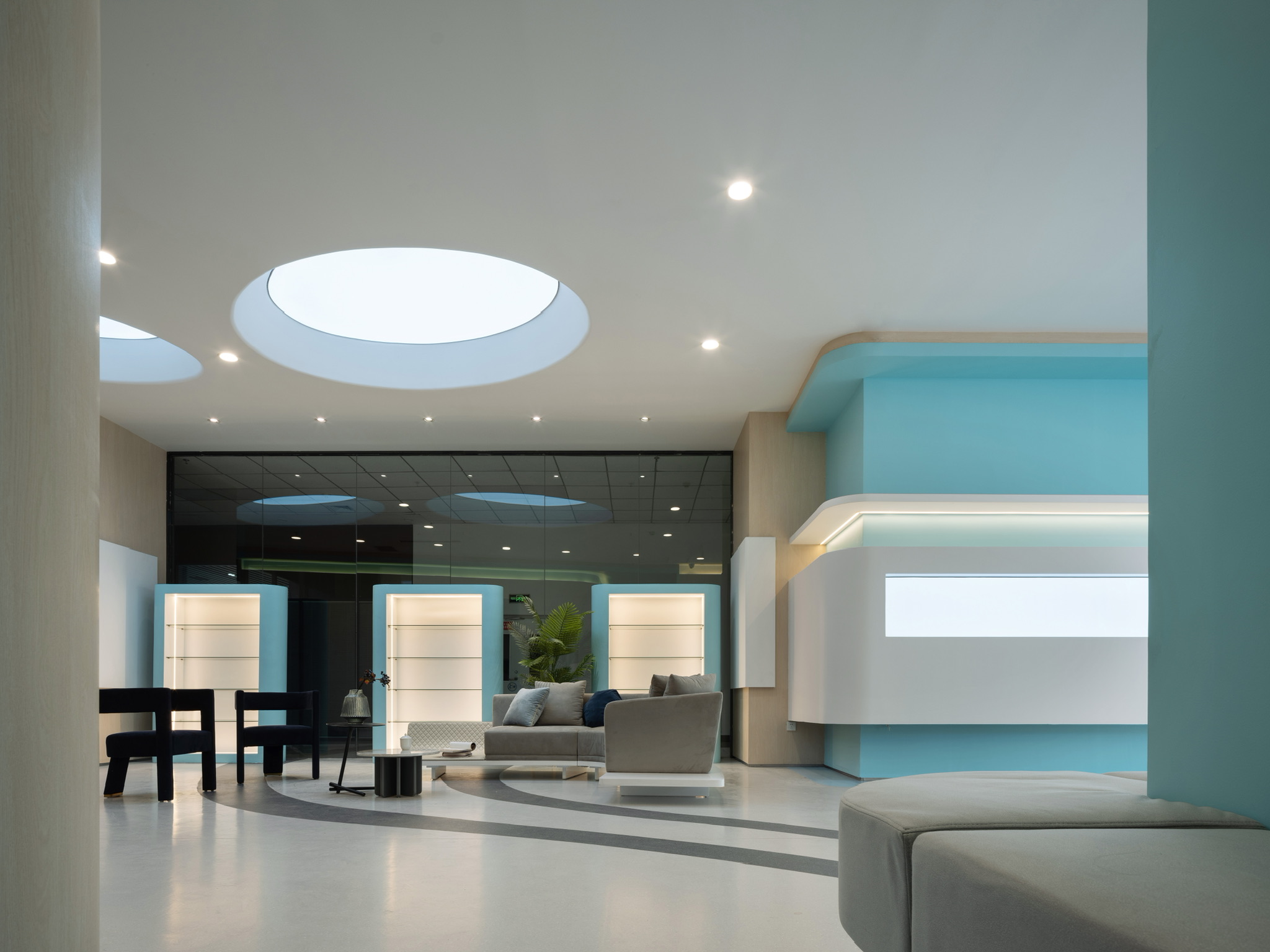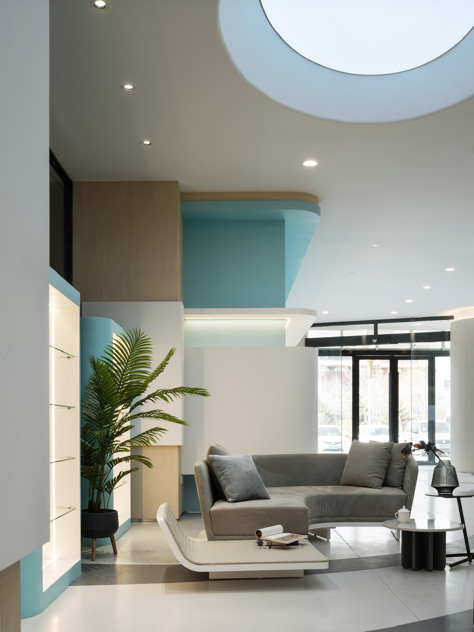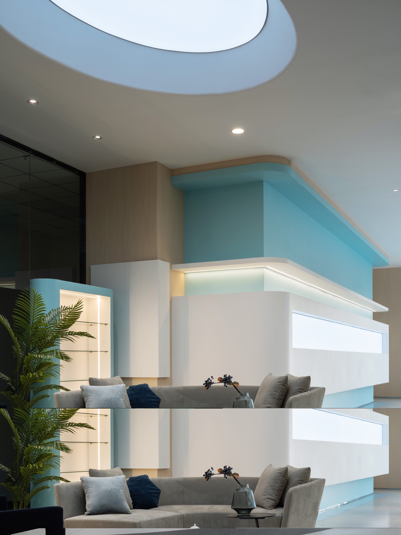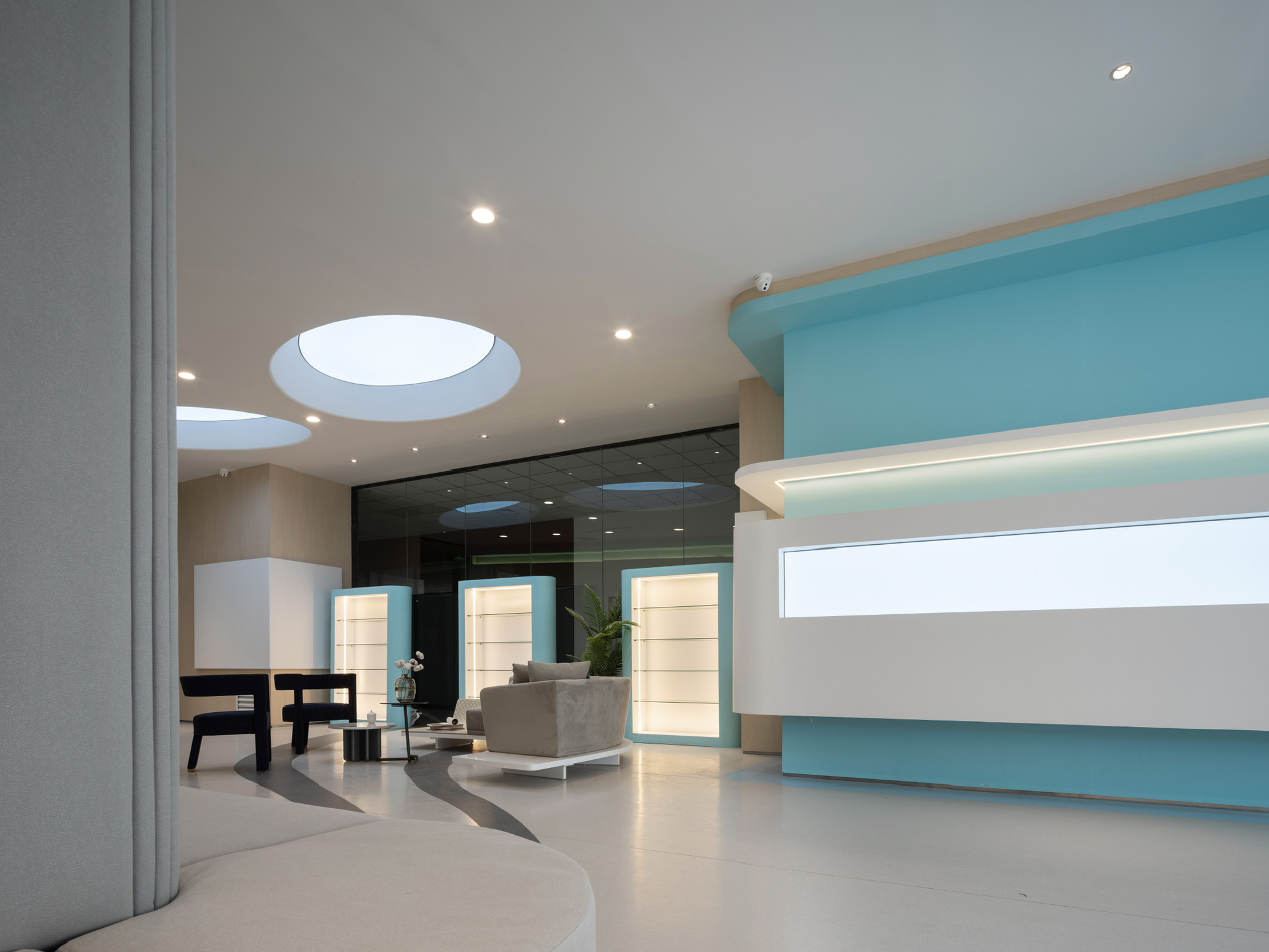 项目定位:此店为乐普医疗银川网络医院的旗舰店,走入电动门,入眼便是明亮柔和的蓝与白。象征着科技与白月光为主色调,让体验者即刻被曲线的温柔私密般的环抱。