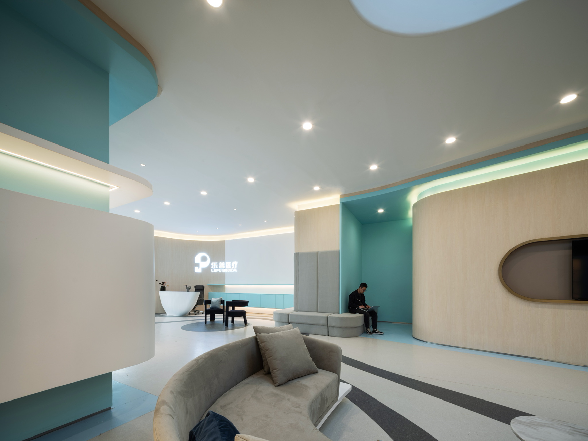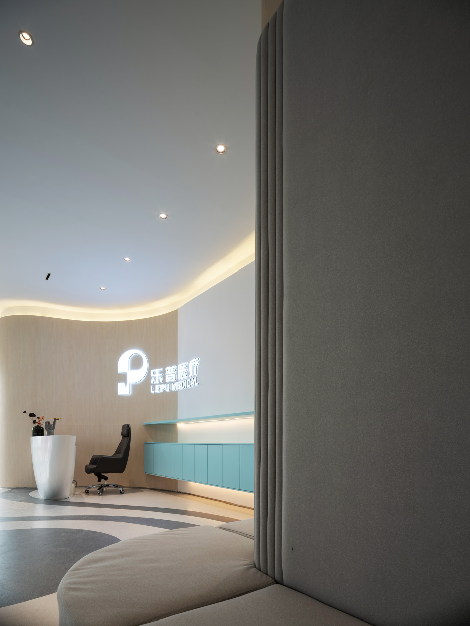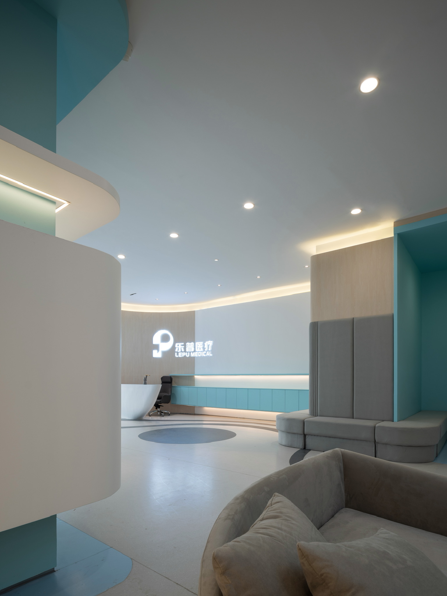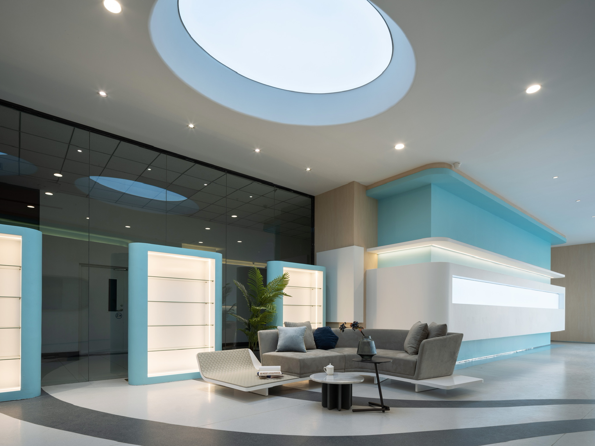 项目定位:此店为乐普医疗银川网络医院的旗舰店,走入电动门,入眼便是明亮柔和的蓝与白。象征着科技与白月光为主色调,让体验者即刻被曲线的温柔私密般的环抱。