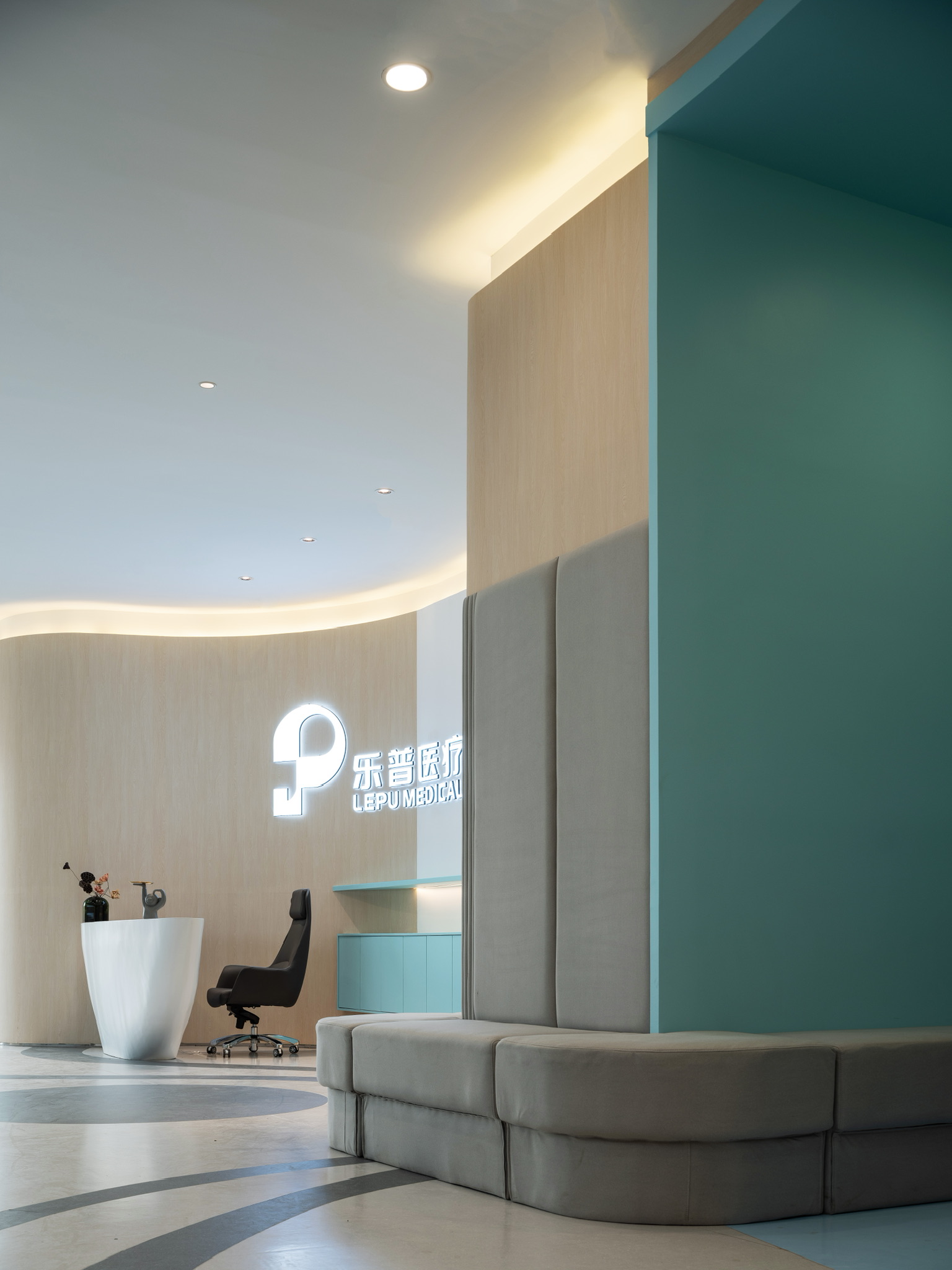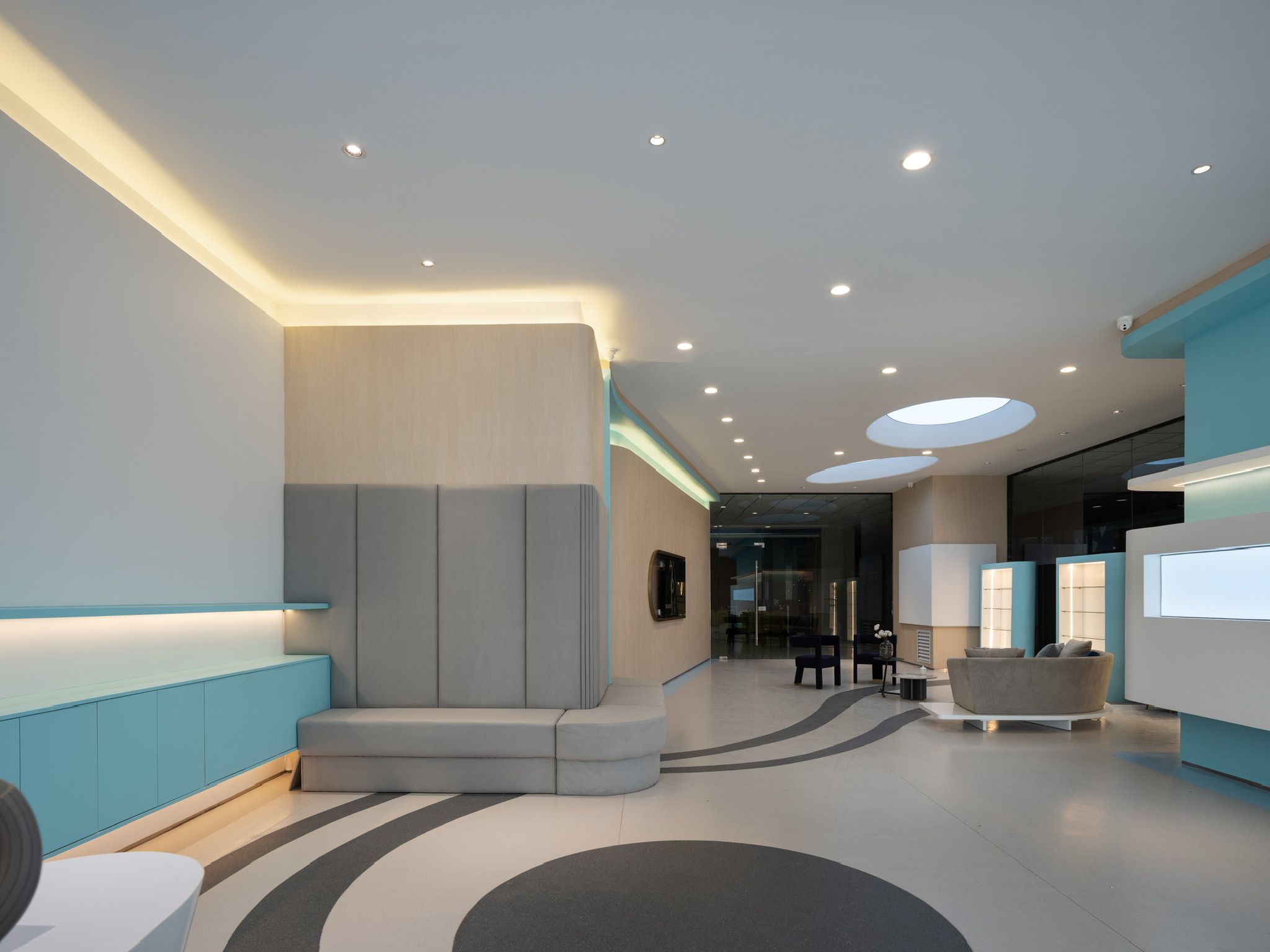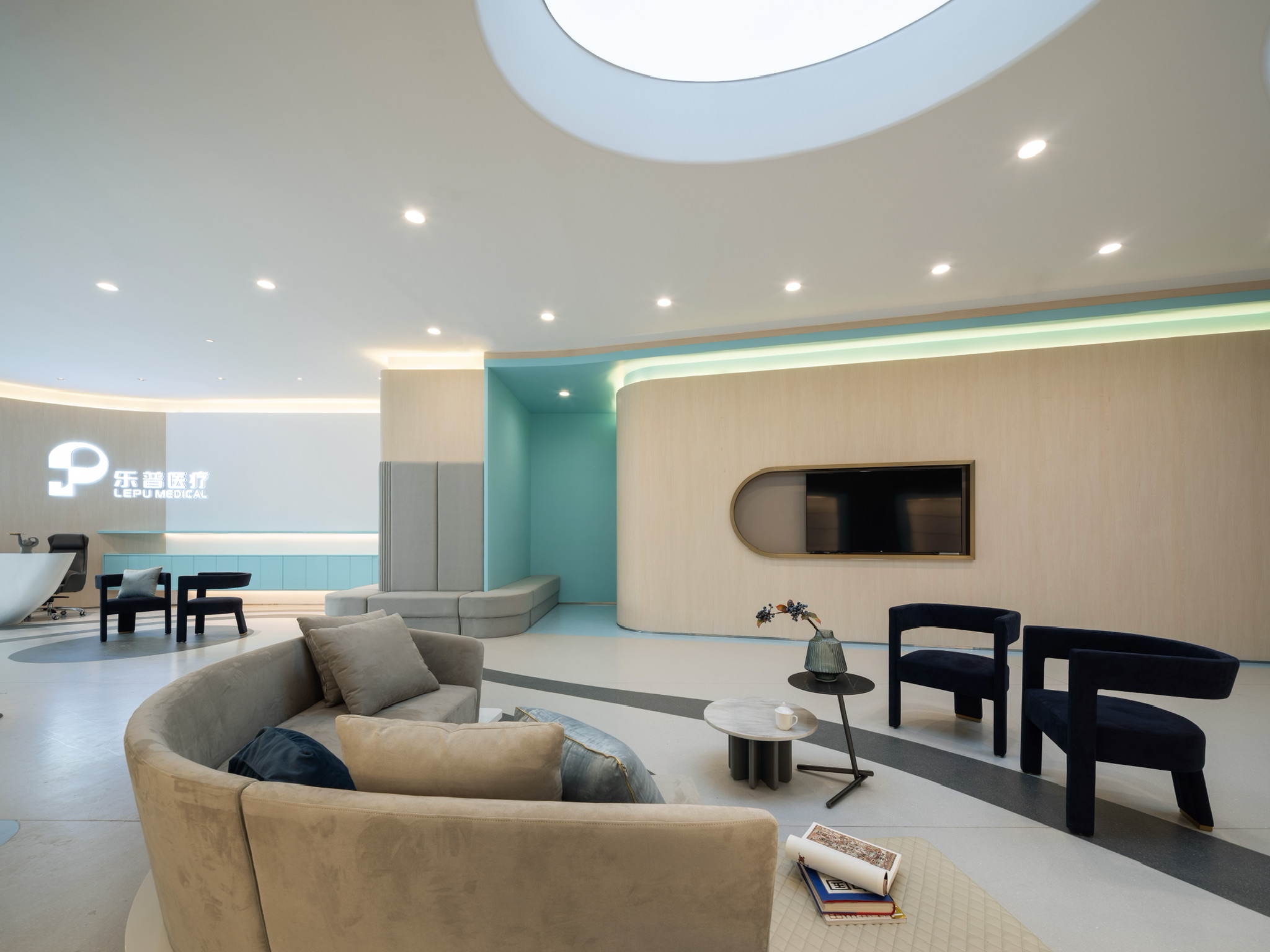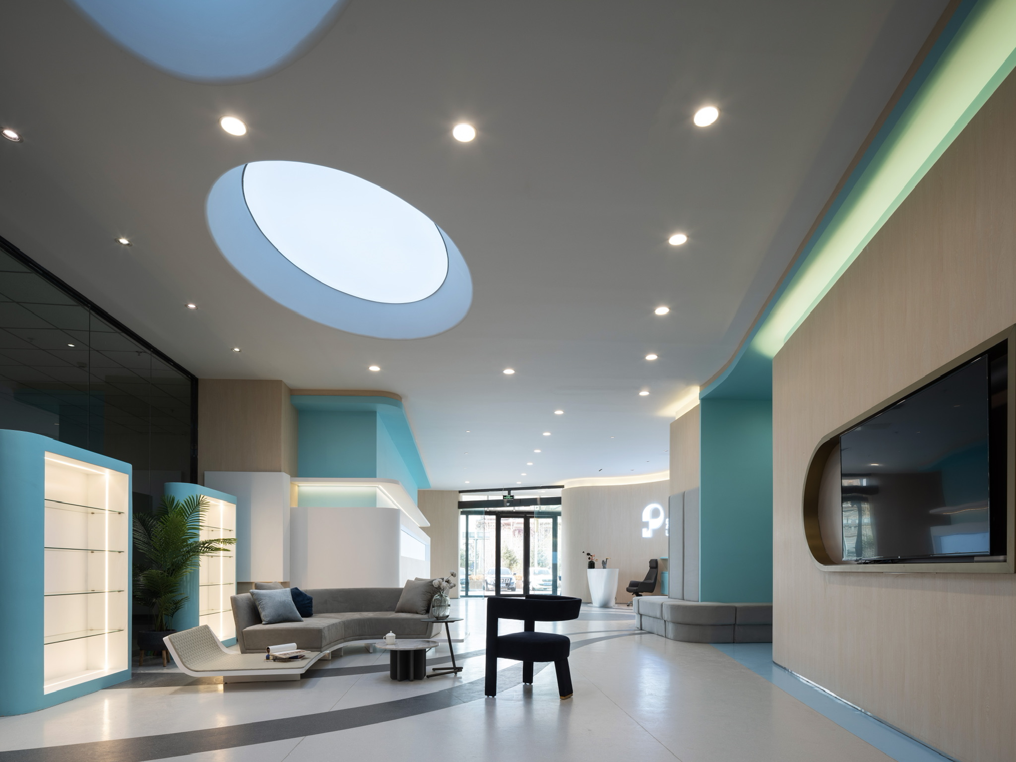 项目定位:此店为乐普医疗银川网络医院的旗舰店,走入电动门,入眼便是明亮柔和的蓝与白。象征着科技与白月光为主色调,让体验者即刻被曲线的温柔私密般的环抱。