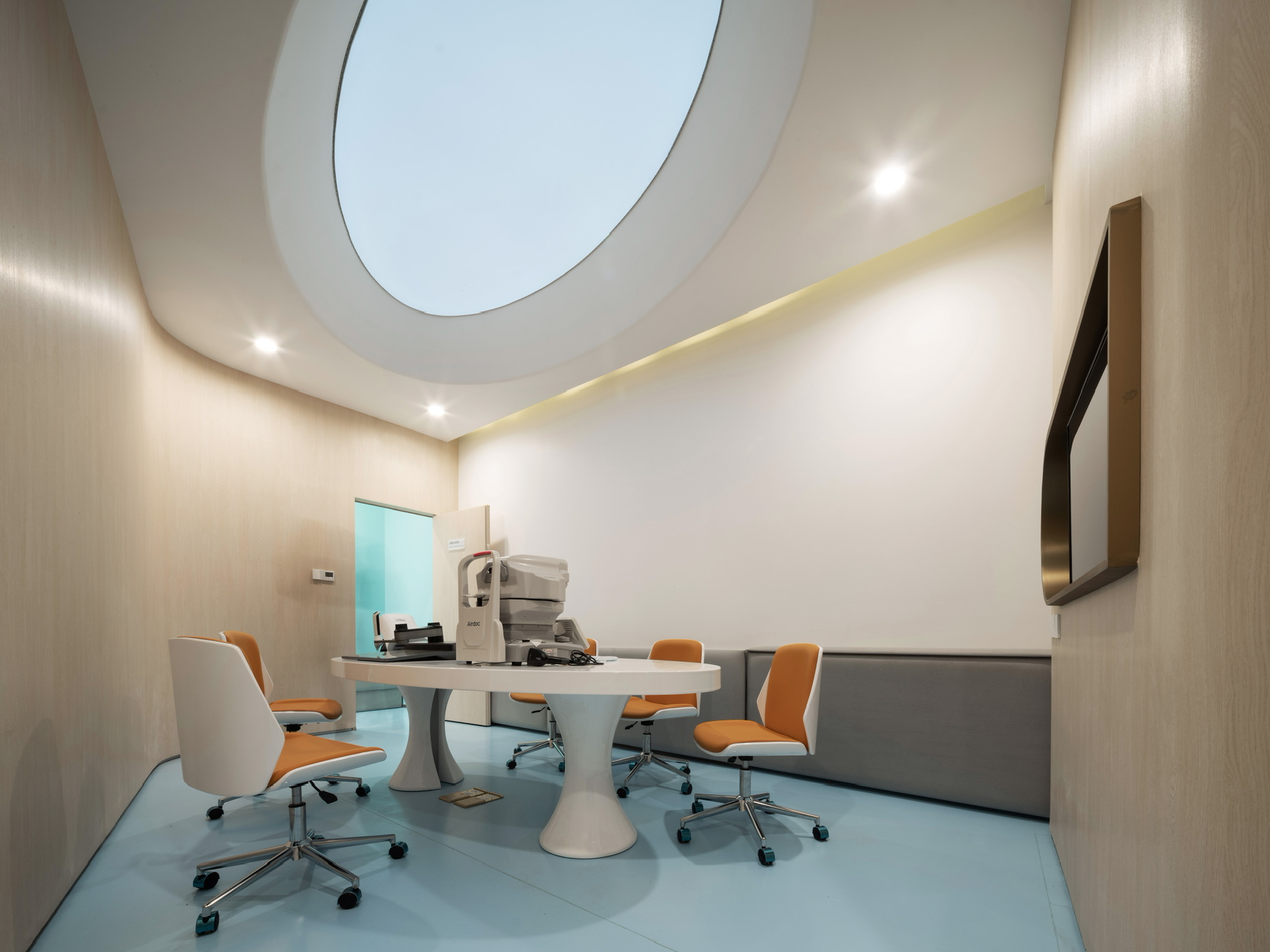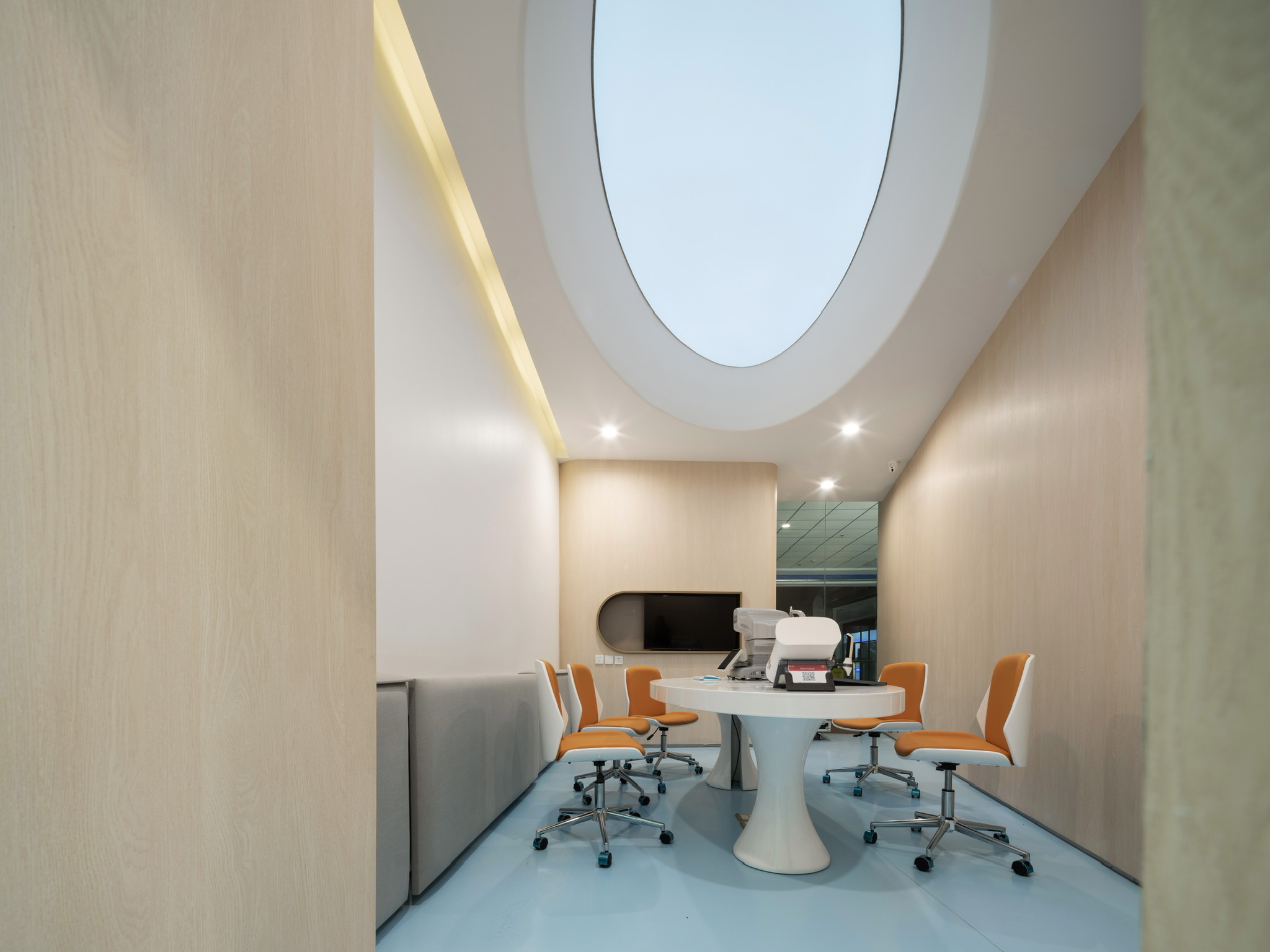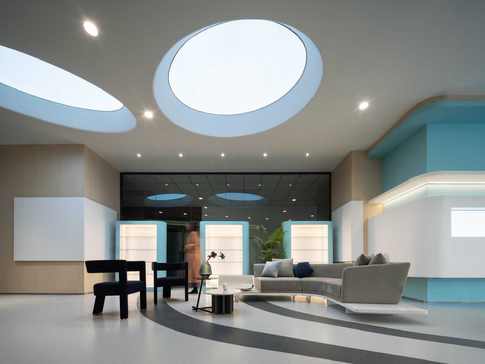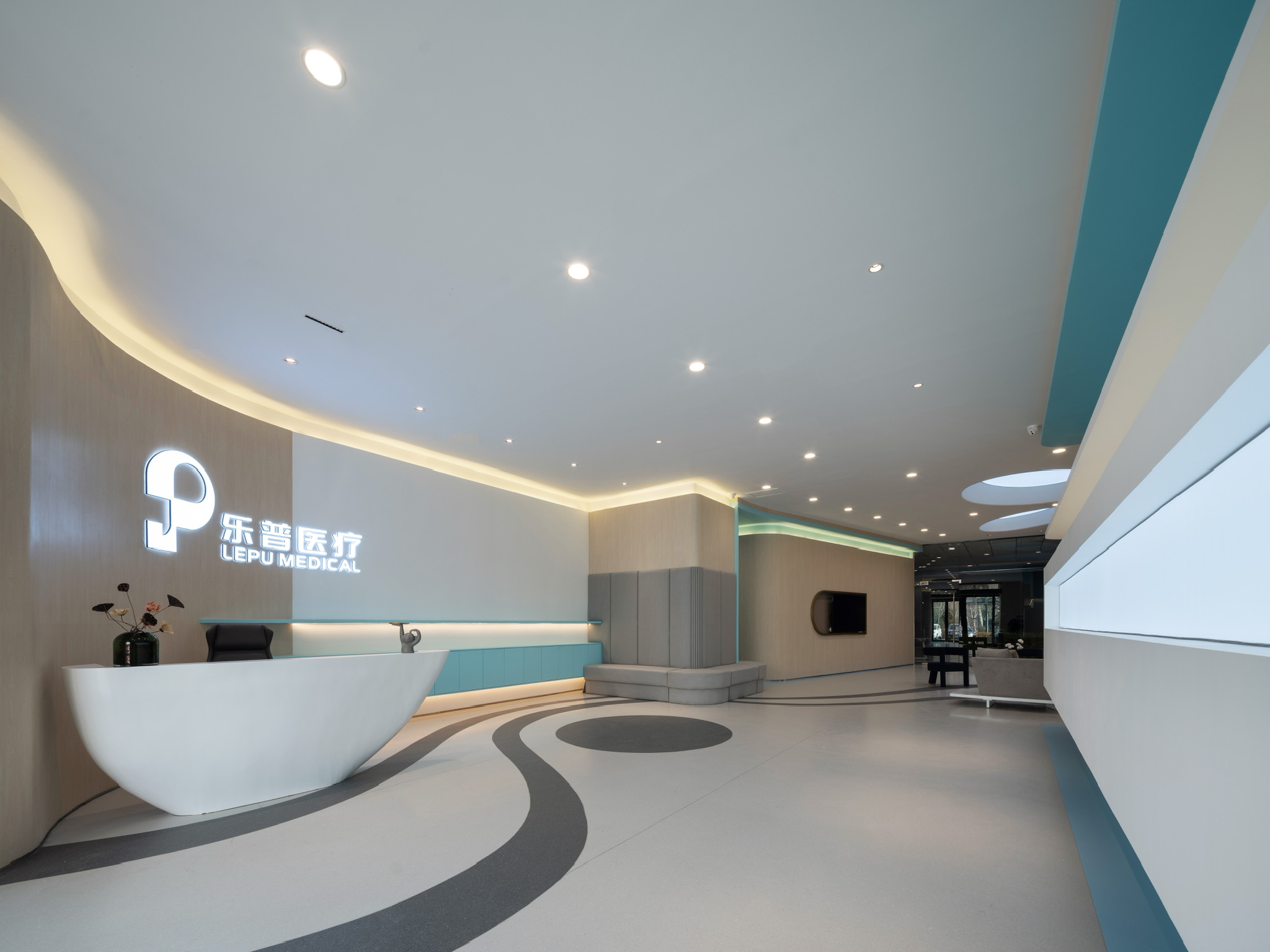 项目定位:此店为乐普医疗银川网络医院的旗舰店,走入电动门,入眼便是明亮柔和的蓝与白。象征着科技与白月光为主色调,让体验者即刻被曲线的温柔私密般的环抱。