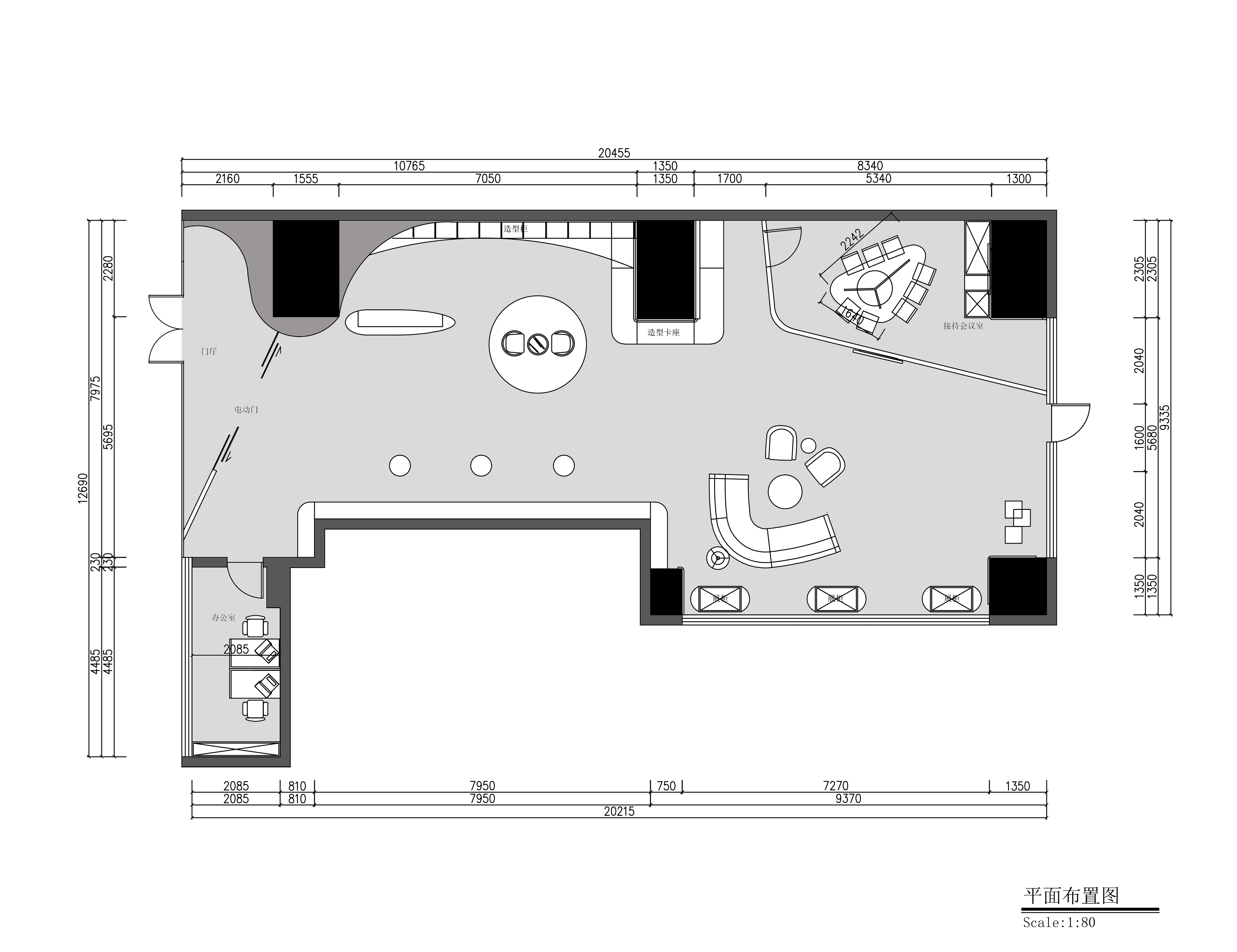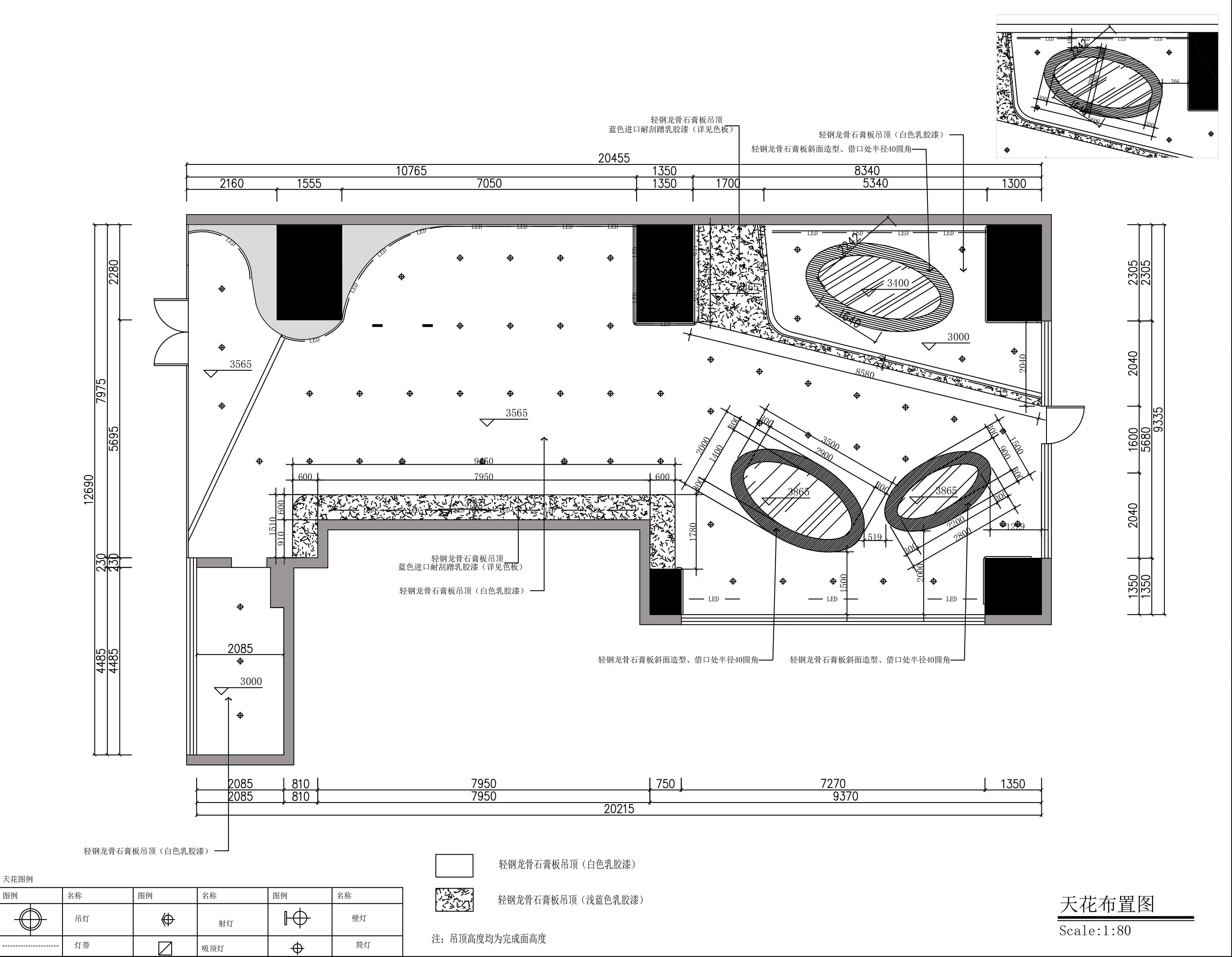 天花布置图,顶面多用软膜天花,造型宛如湖泊。光线柔和。