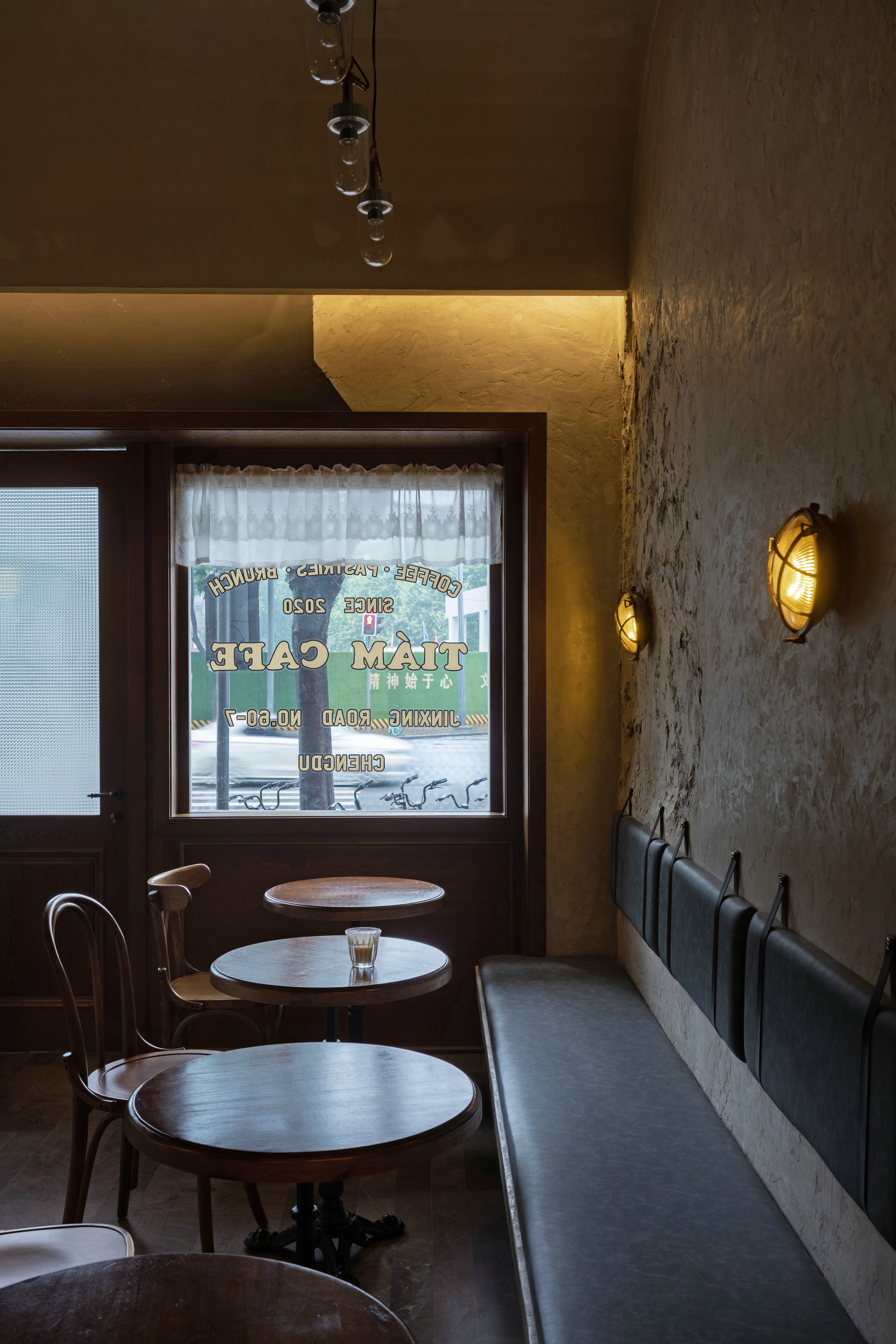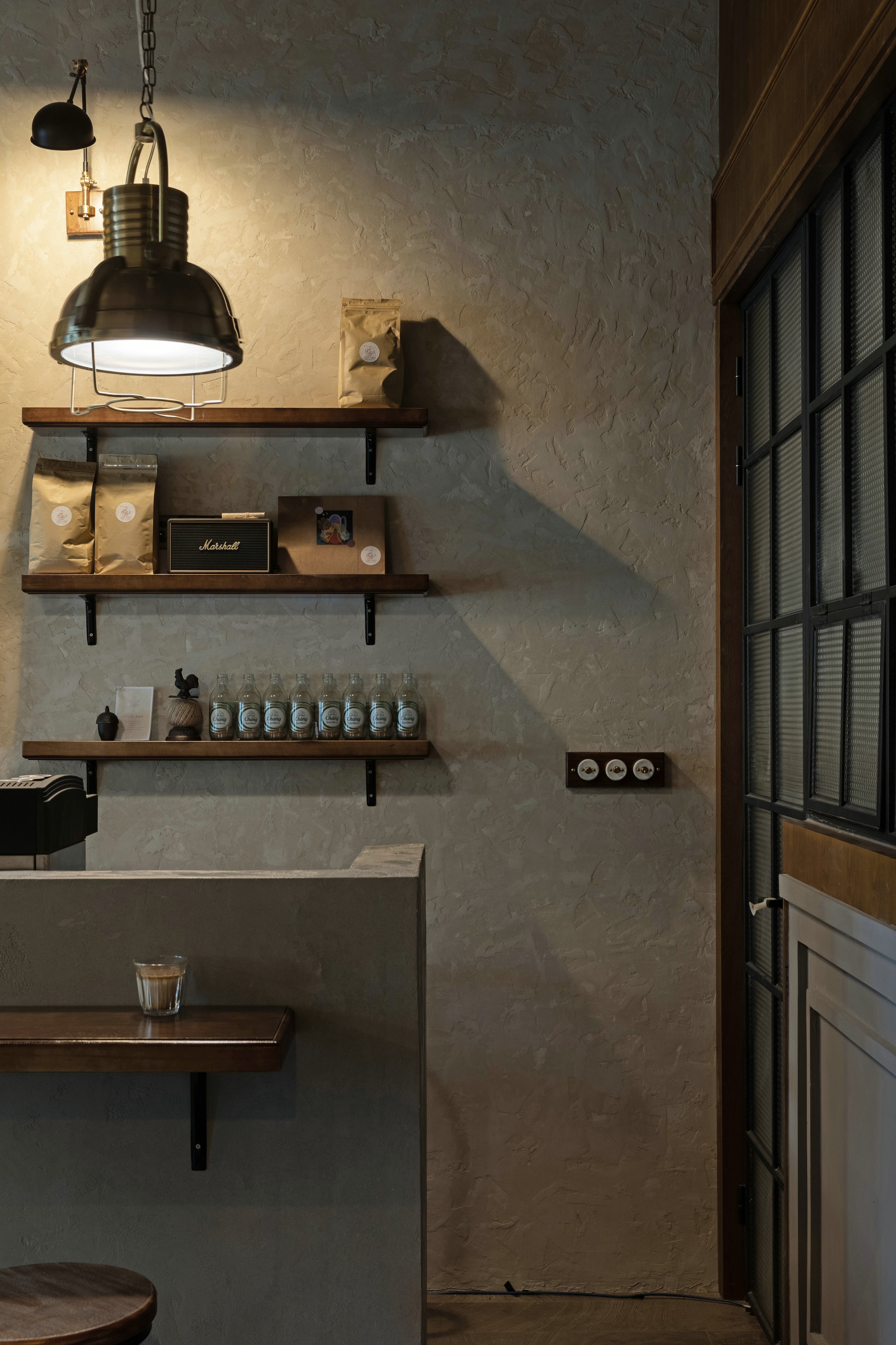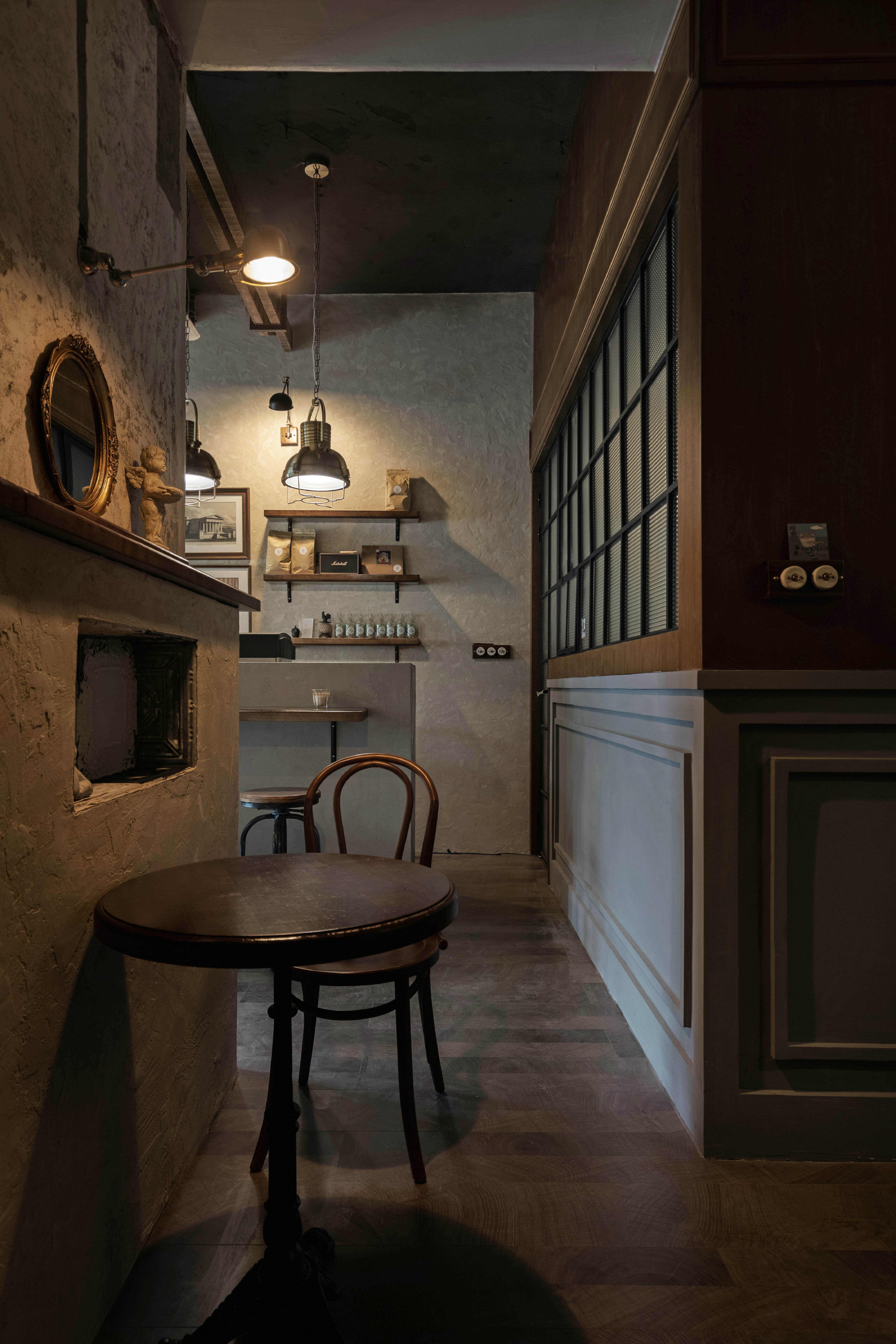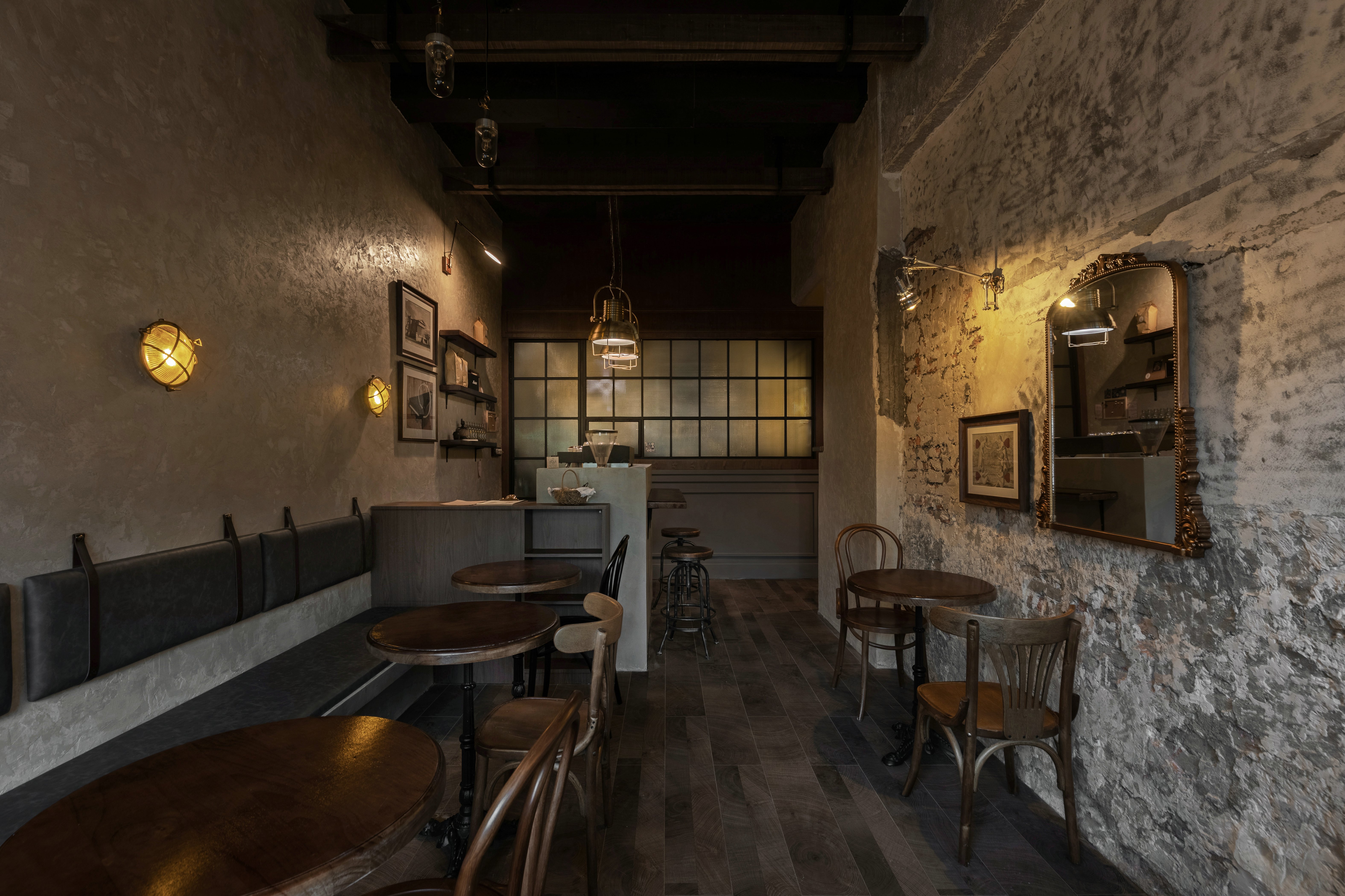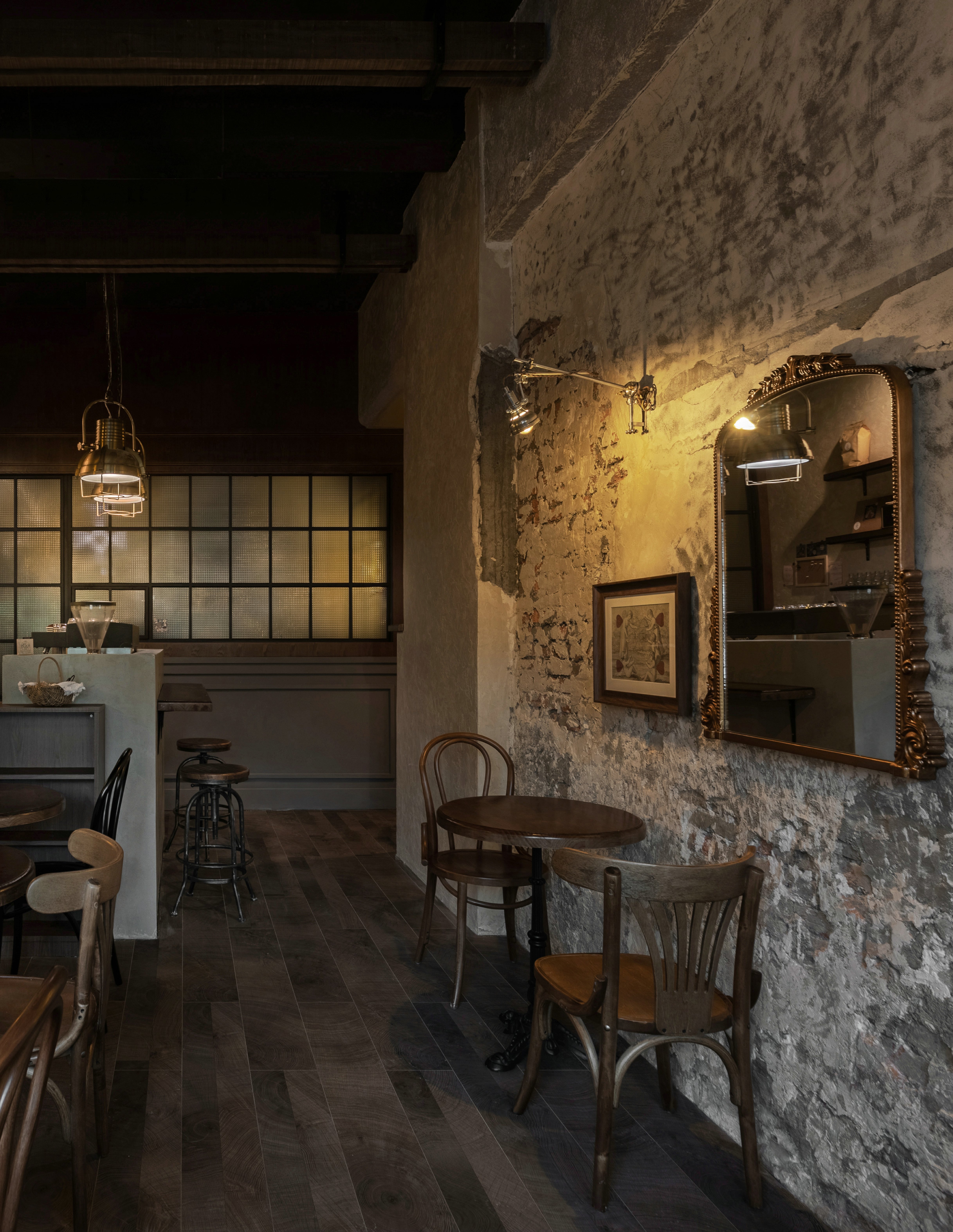 设计说明: Design Specification 本案以“古朴”、“现材”、“情绪”作为设计核心重点,设计做旧,小众, 古朴: 设计运用大面积的艺术漆做旧墙面,极力的将自然古朴的意味做到极致。 现材:将原墙面,以看似随意而艺术的方式凿毛墙面的处理,原店铺剩下的老木头拆除时已破损,就地取材,将就原来的质感保留下来,以至于空间随性、包容的空间感受。 情 绪: 整体设计采用大面积的中性咖啡及咖啡气泡的颜色、以及深色漆面运用,让进入空间的人静下来,沉浸进去,做旧铜灯照射的灯光,微微给人微醺的感受,铁艺艺术玻璃透过灯光,给人梦幻的想象场景。空间中仿佛罩了一层滤镜,从而营造情绪化空间氛围。