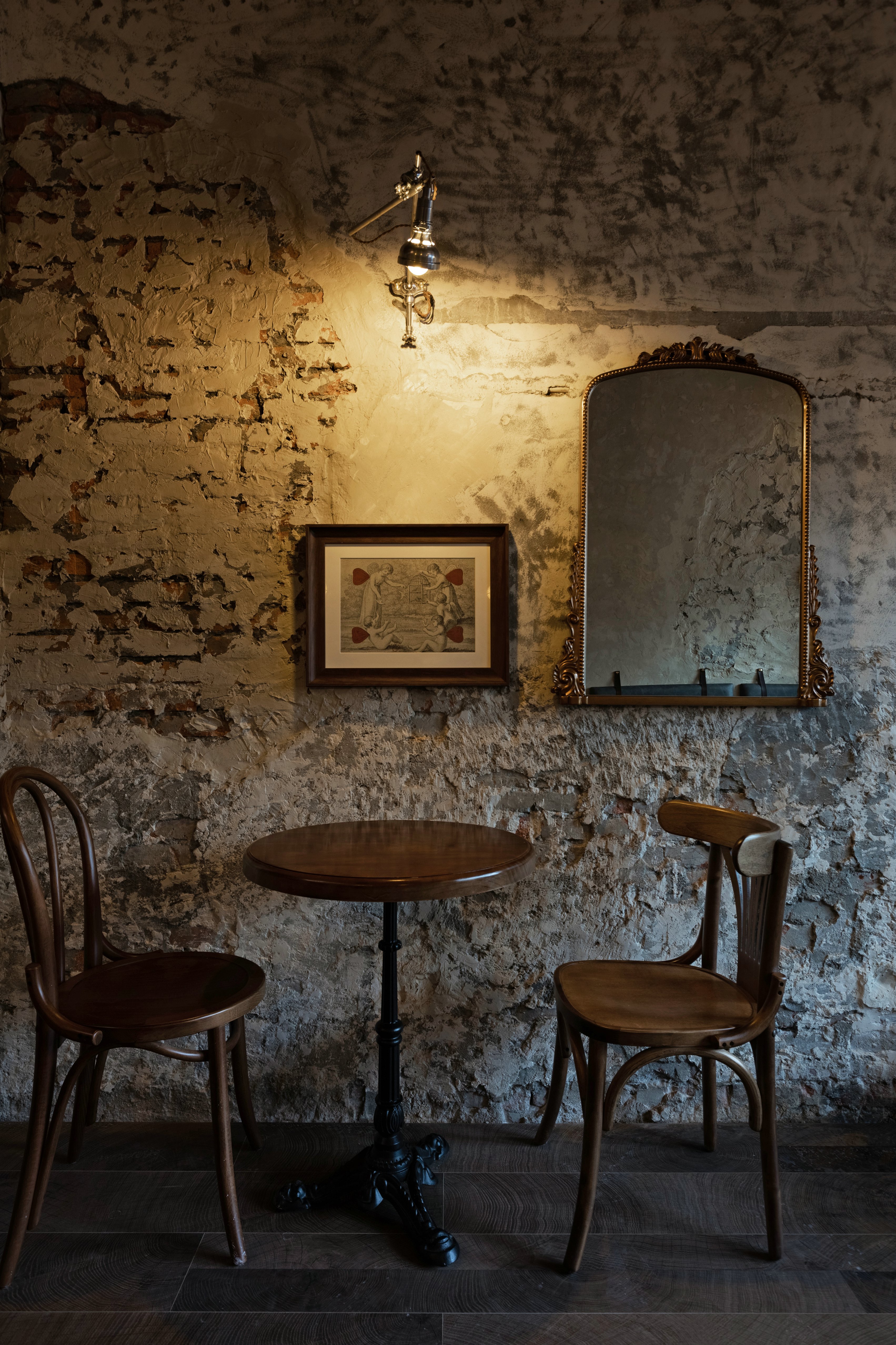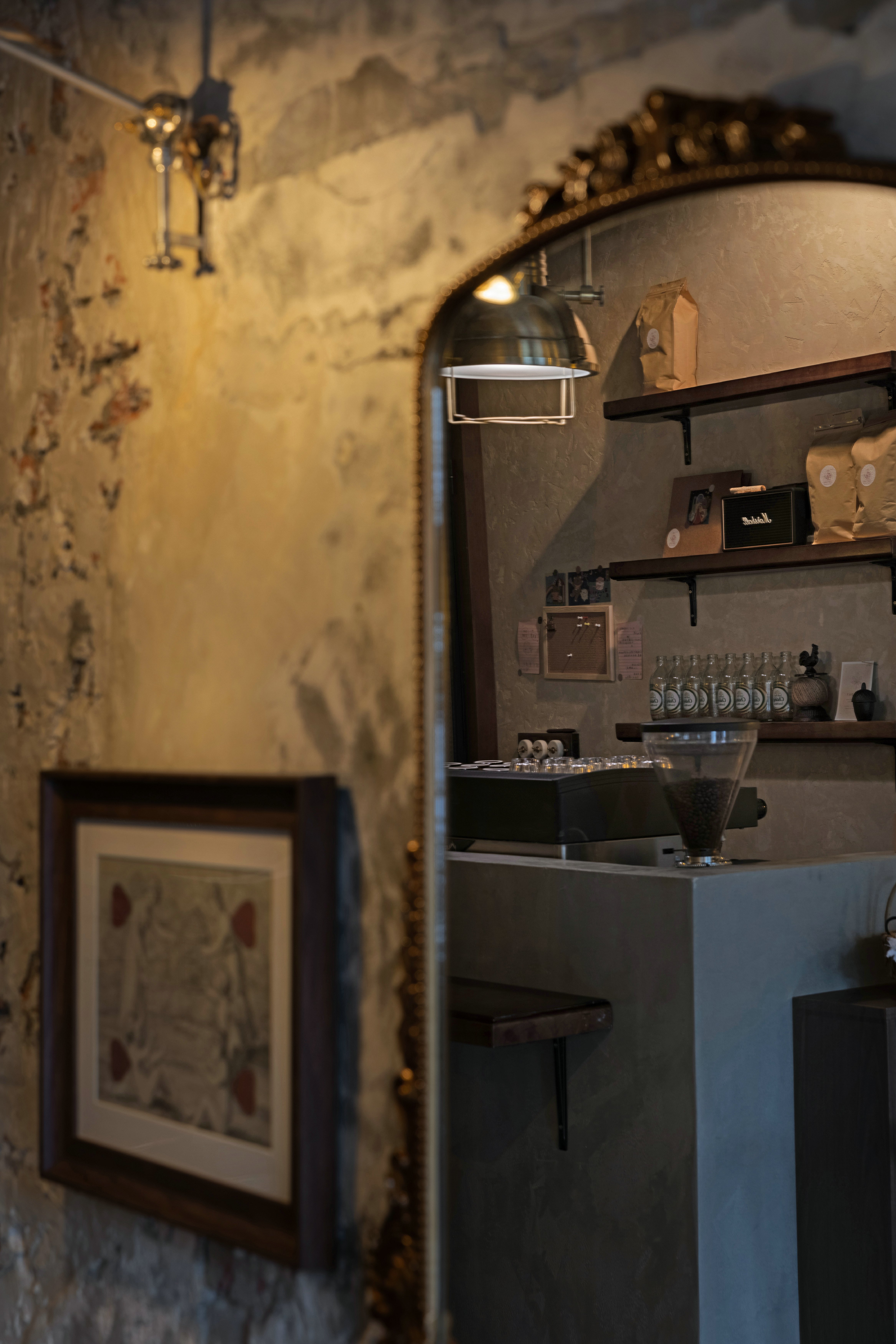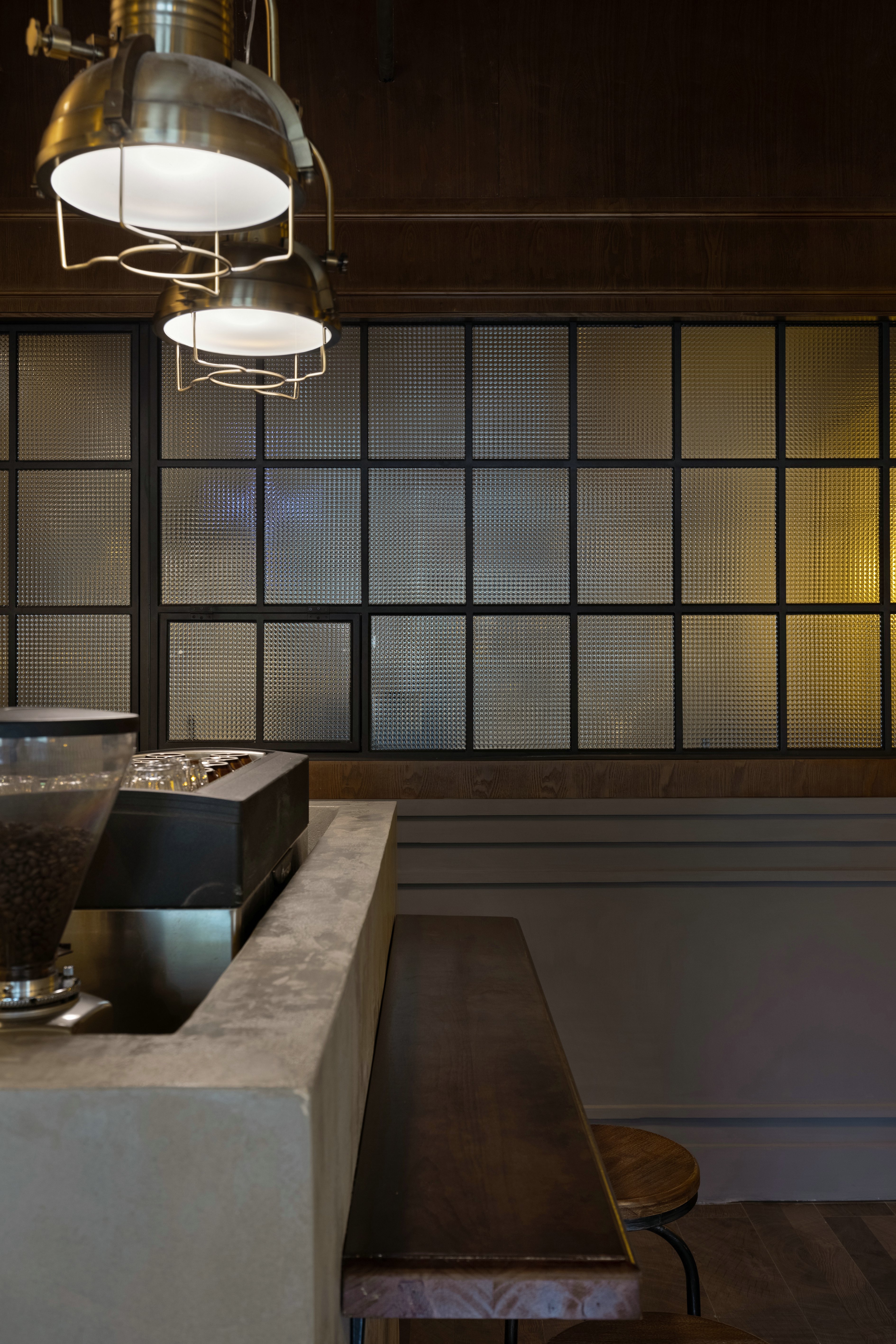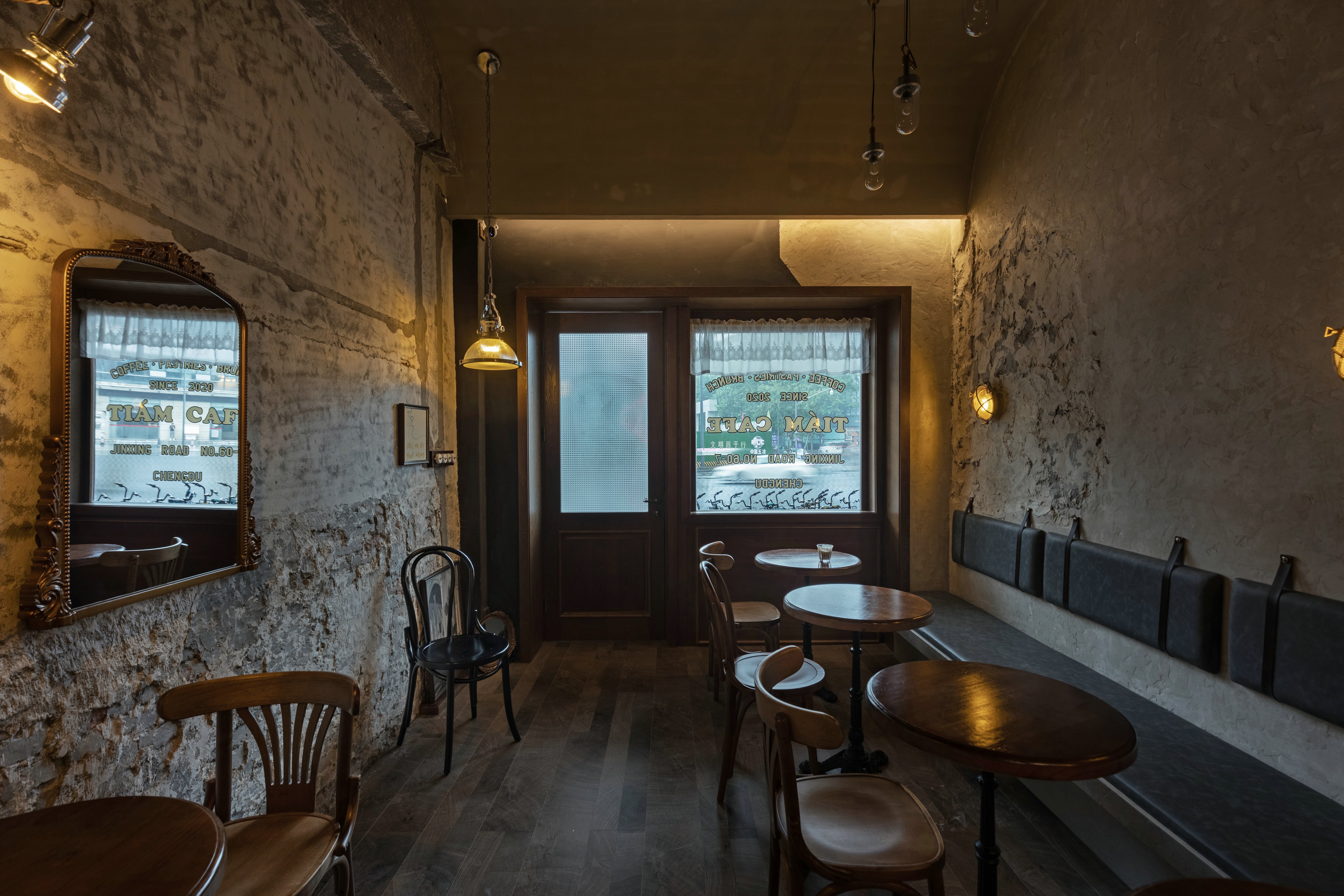 设计说明: Design Specification 本案以“古朴”、“现材”、“情绪”作为设计核心重点,设计做旧,小众, 古朴: 设计运用大面积的艺术漆做旧墙面,极力的将自然古朴的意味做到极致。 现材:将原墙面,以看似随意而艺术的方式凿毛墙面的处理,原店铺剩下的老木头拆除时已破损,就地取材,将就原来的质感保留下来,以至于空间随性、包容的空间感受。 情 绪: 整体设计采用大面积的中性咖啡及咖啡气泡的颜色、以及深色漆面运用,让进入空间的人静下来,沉浸进去,做旧铜灯照射的灯光,微微给人微醺的感受,铁艺艺术玻璃透过灯光,给人梦幻的想象场景。空间中仿佛罩了一层滤镜,从而营造情绪化空间氛围。