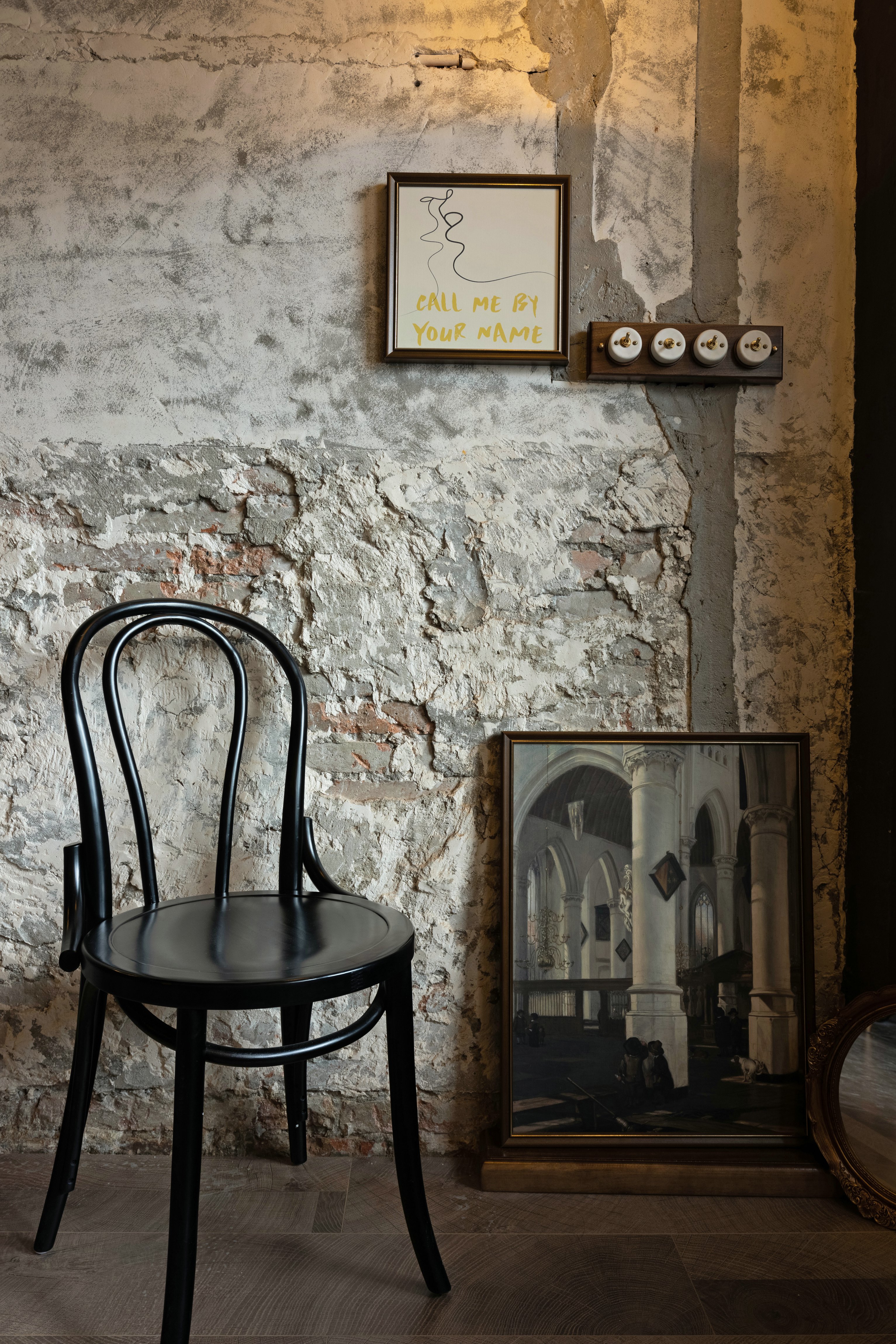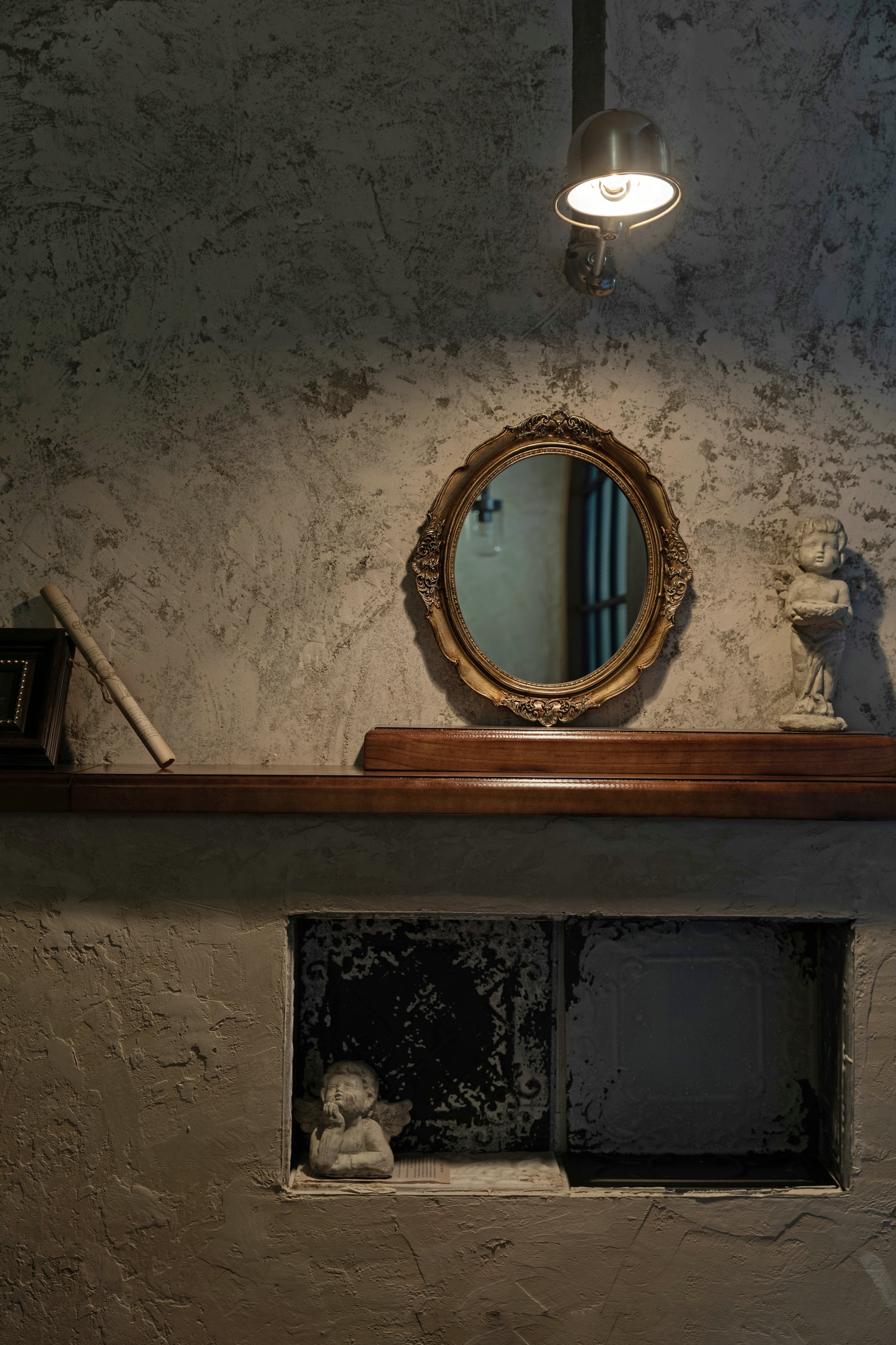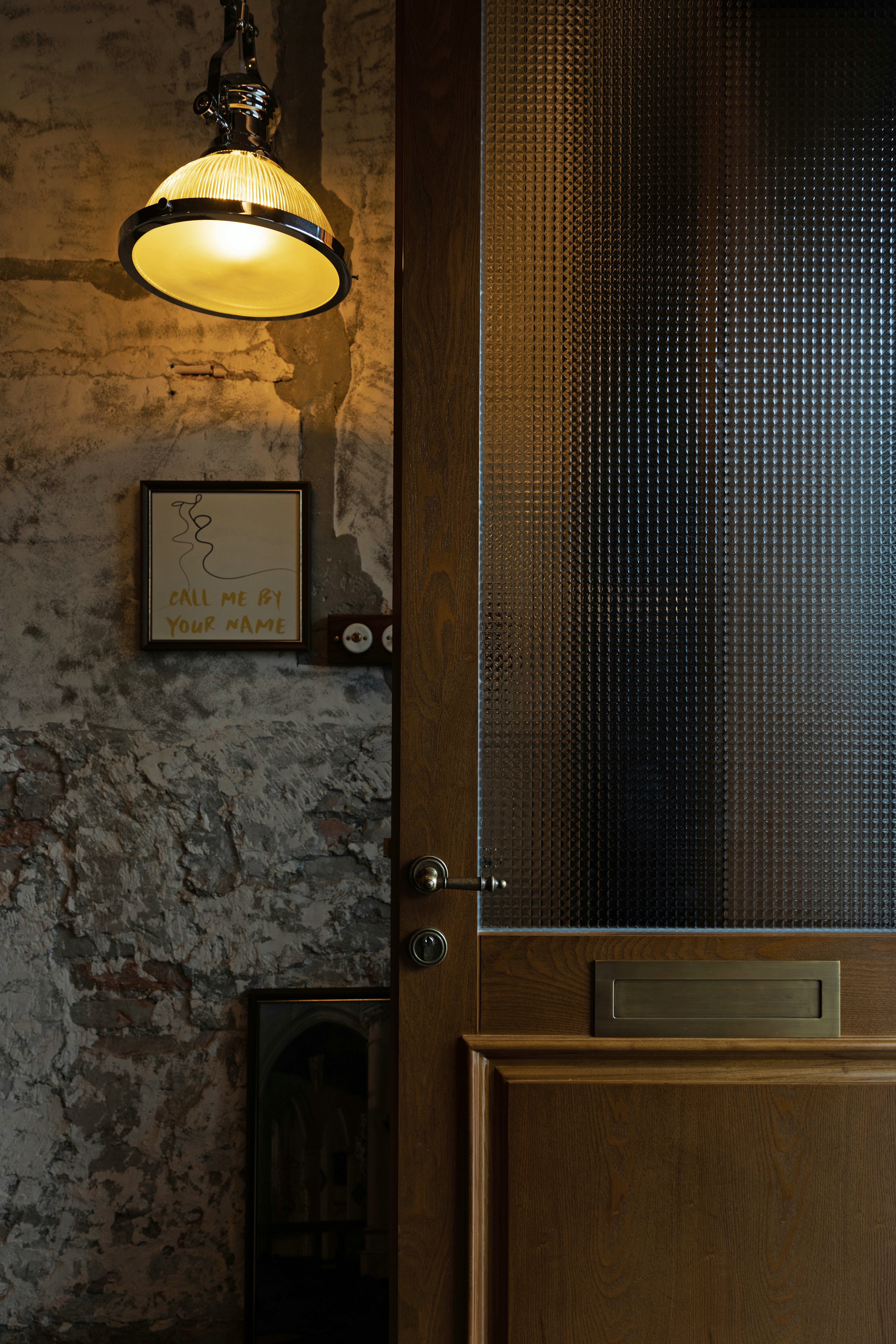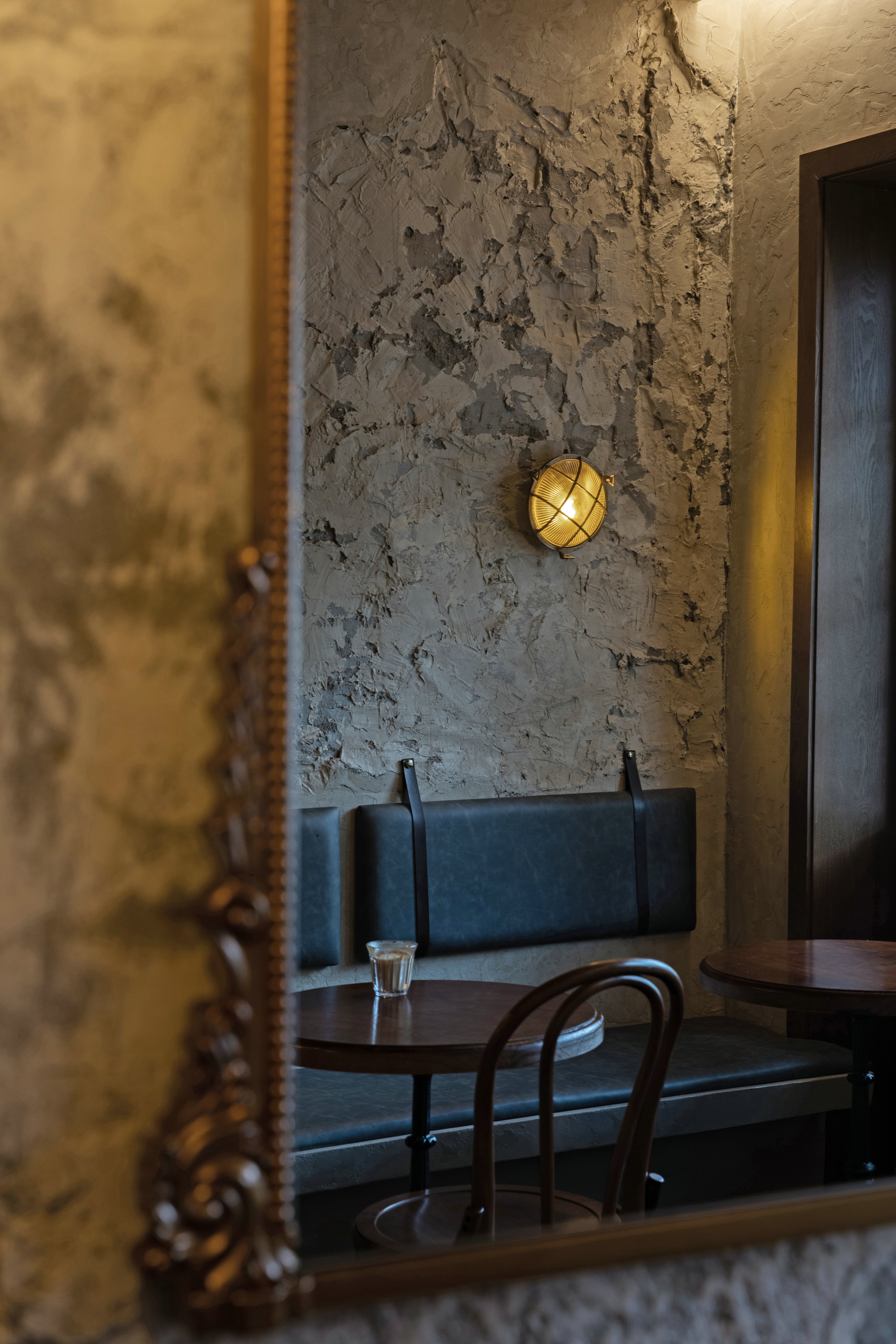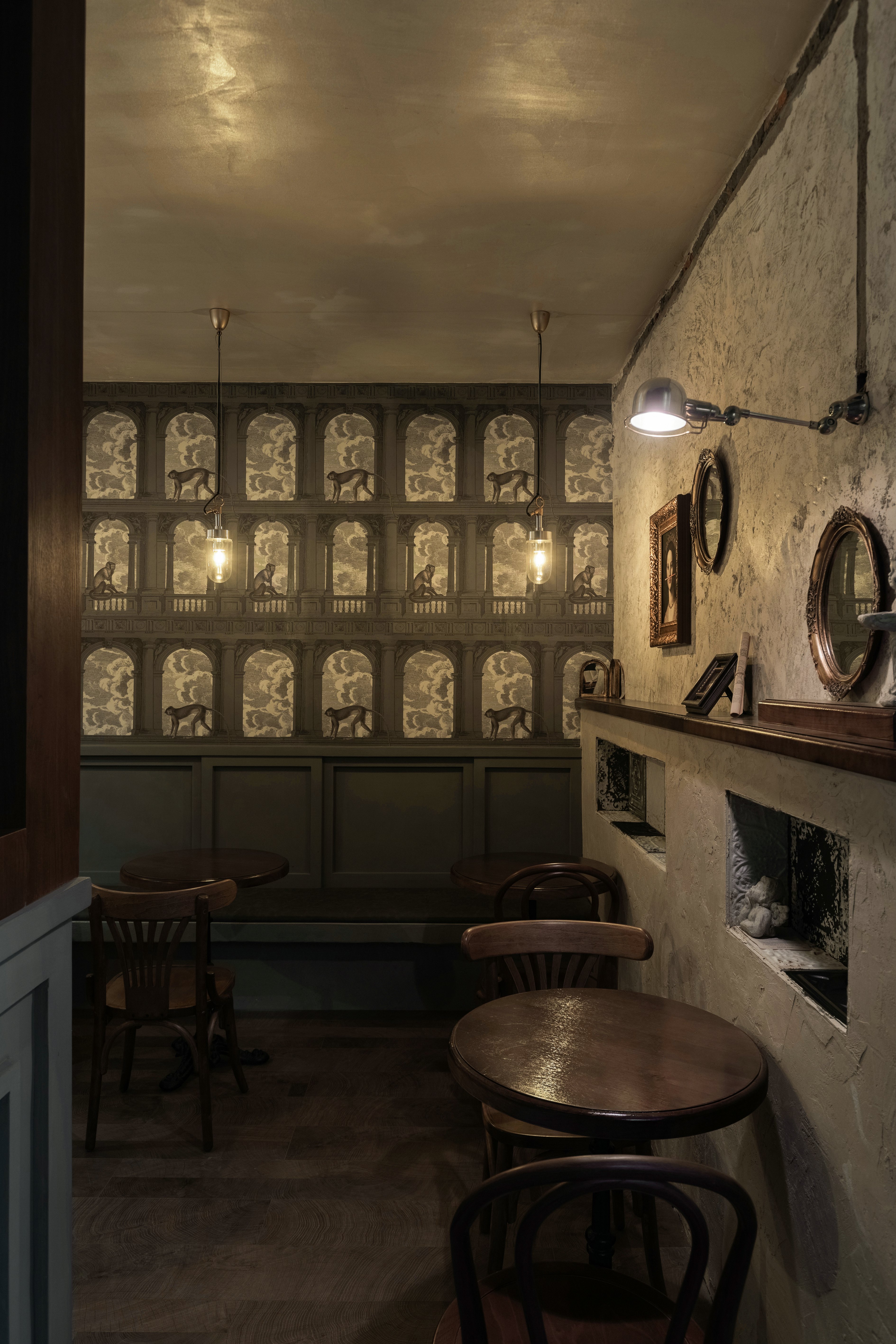 设计说明: Design Specification 本案以“古朴”、“现材”、“情绪”作为设计核心重点,设计做旧,小众, 古朴: 设计运用大面积的艺术漆做旧墙面,极力的将自然古朴的意味做到极致。 现材:将原墙面,以看似随意而艺术的方式凿毛墙面的处理,原店铺剩下的老木头拆除时已破损,就地取材,将就原来的质感保留下来,以至于空间随性、包容的空间感受。 情 绪: 整体设计采用大面积的中性咖啡及咖啡气泡的颜色、以及深色漆面运用,让进入空间的人静下来,沉浸进去,做旧铜灯照射的灯光,微微给人微醺的感受,铁艺艺术玻璃透过灯光,给人梦幻的想象场景。空间中仿佛罩了一层滤镜,从而营造情绪化空间氛围。