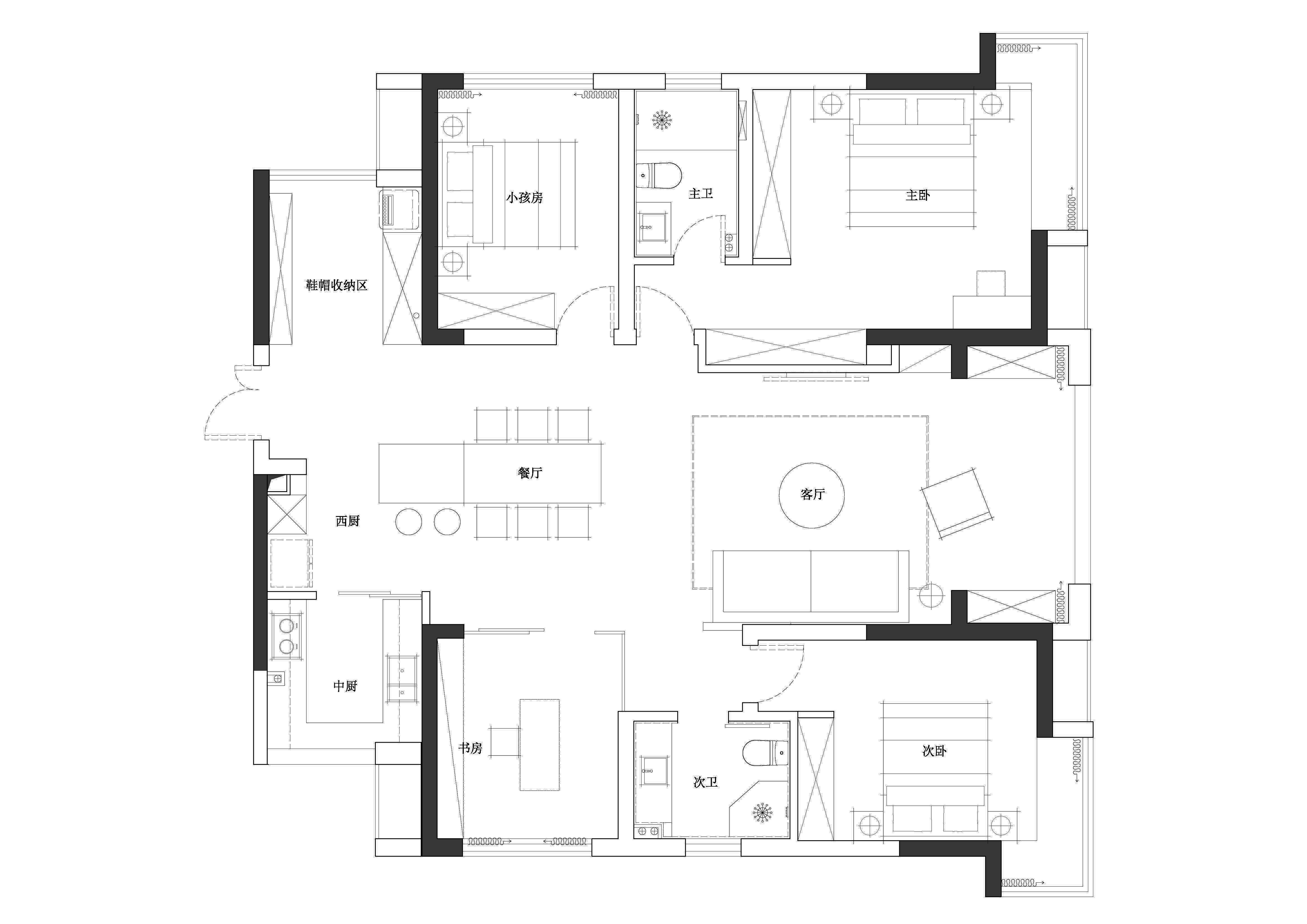 空间意境:强调少即是多,将公共空间门厅、餐厅、西厨、书房、客厅 进行重组,设计做减法,美化使用功能。
