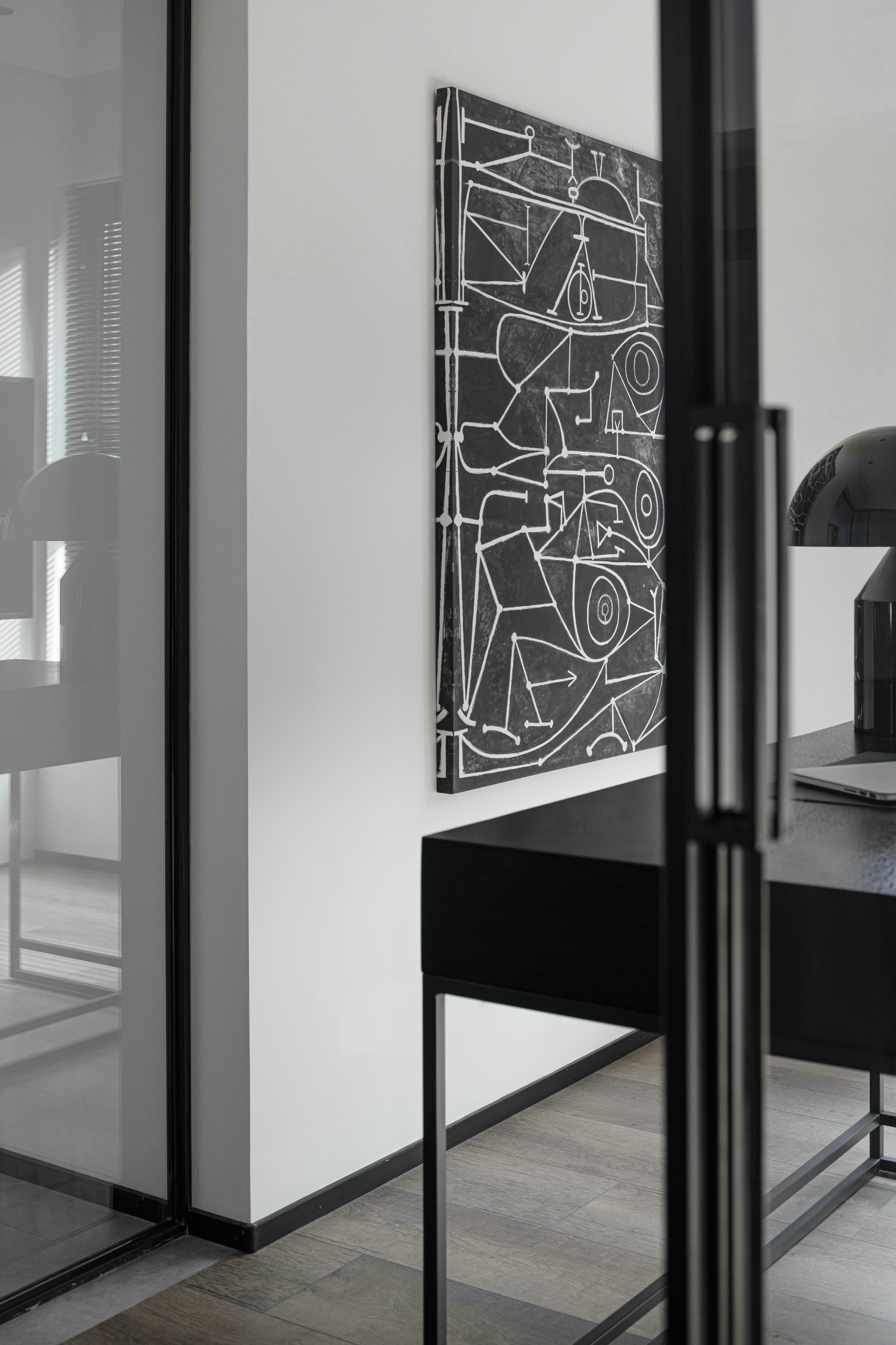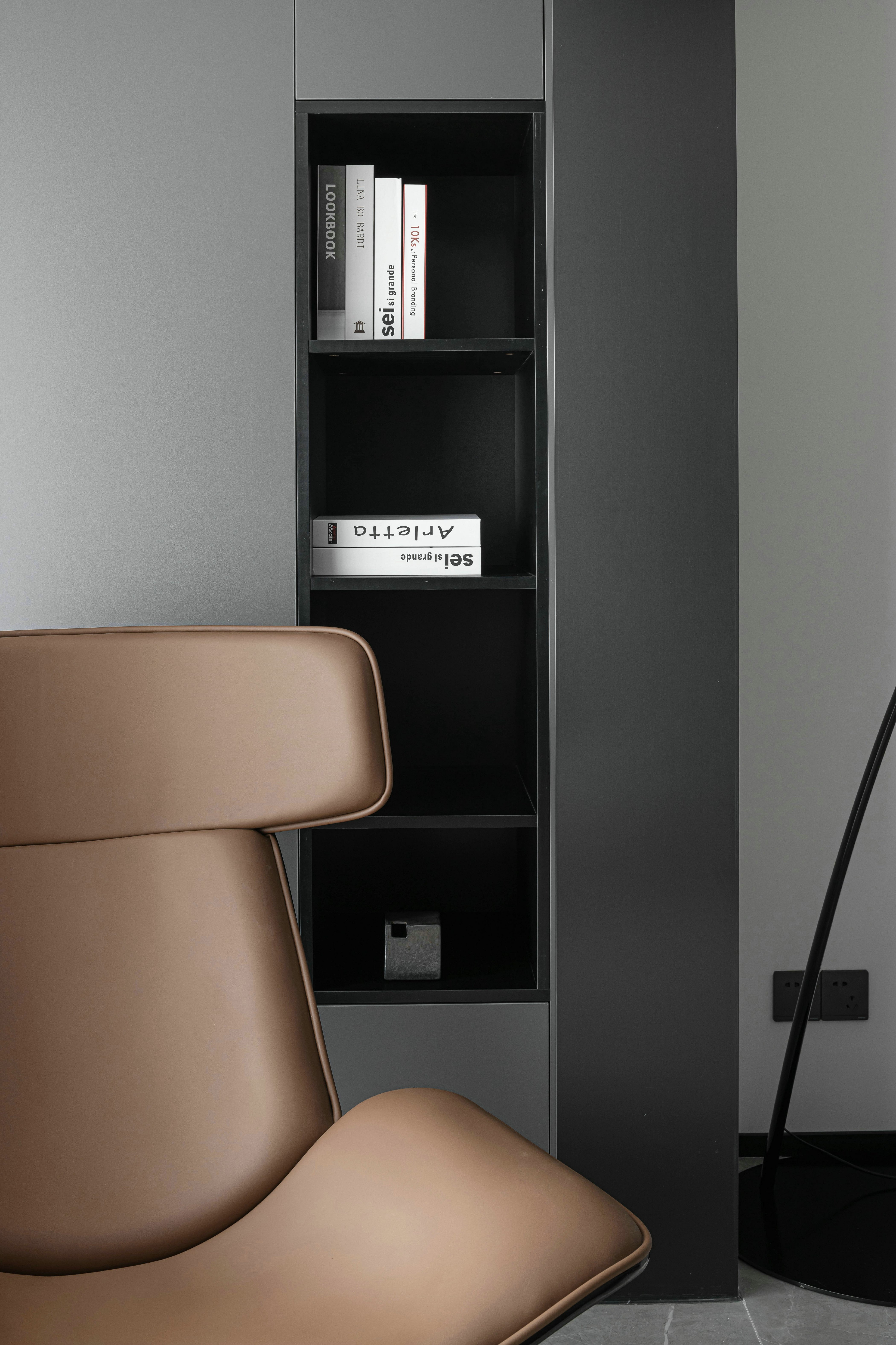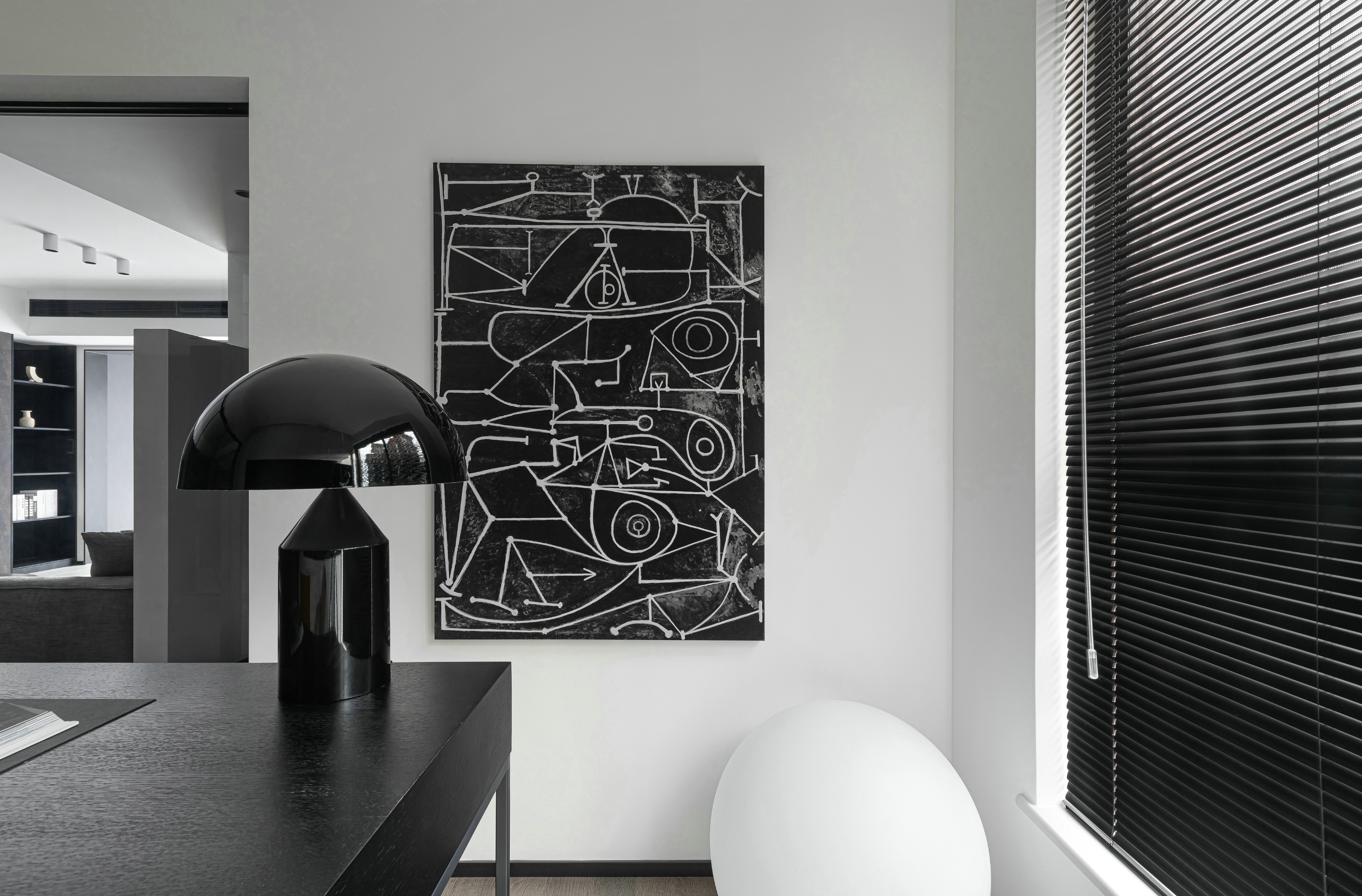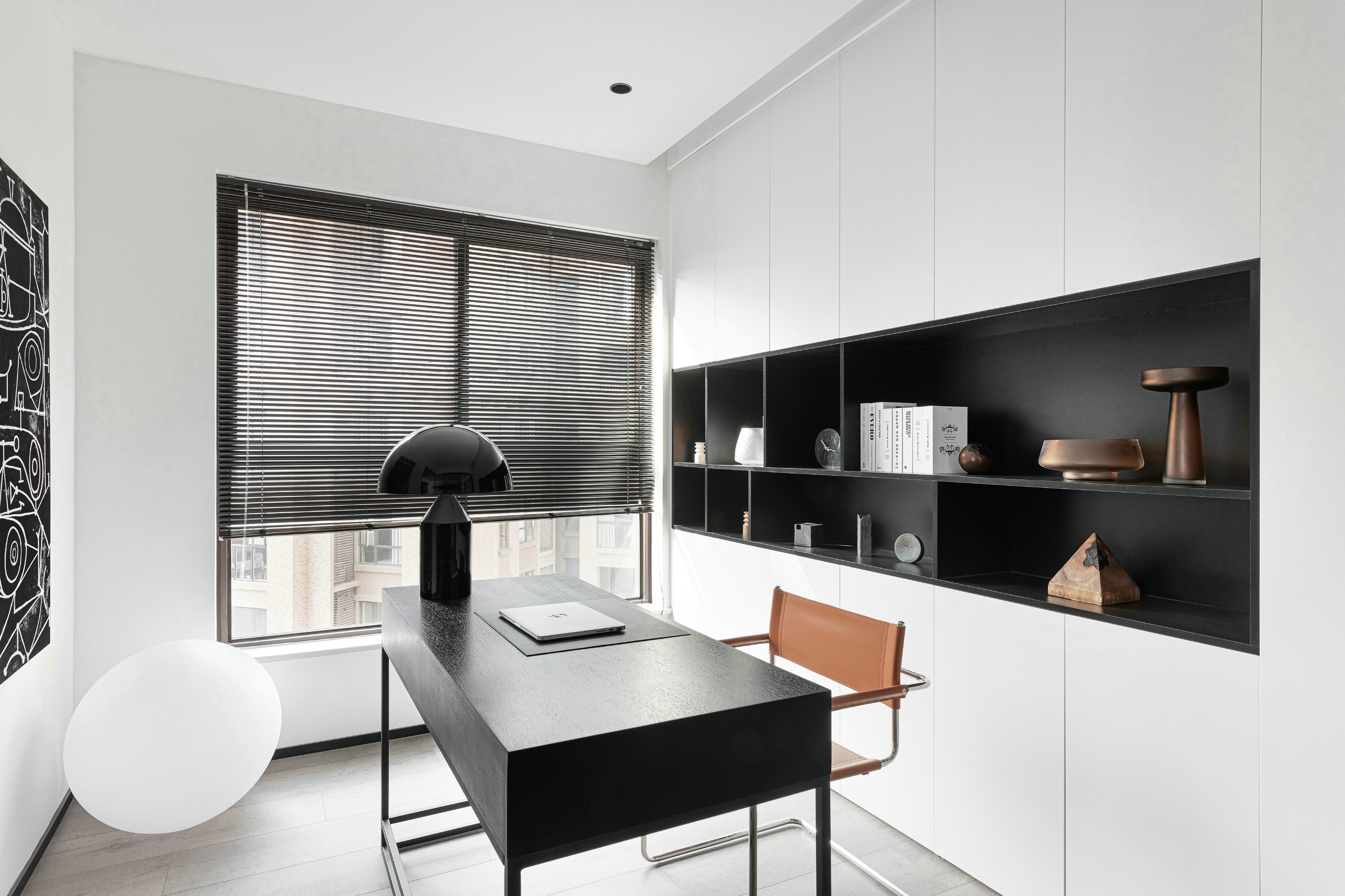 抽象几何挂画,点亮了整个书房;给人以无限遐想,思考的维度也无限延伸。玻璃移门围合书房空间,实现了视觉最大化;采光极好让人心境明朗。一整面的收纳+局部展示柜,美化实用功能,保证了空间的整洁完整;半开放的层板设计更是增加了空间与空间的通透与艺术性。 The abstract geometric hanging paintings live the entire study room; it gives people infinite reverie, and the dimension of thinking extends infinitely. The glass sliding door encloses the study space to maximize the vision; the lighting is excellent and the mood is clear. A whole surface of storage + partial display cabinets, beautify the practical functions, and ensure the neatness and integrity of the space; the semi-open layer design increases the transparency and artistry of the space and the space.