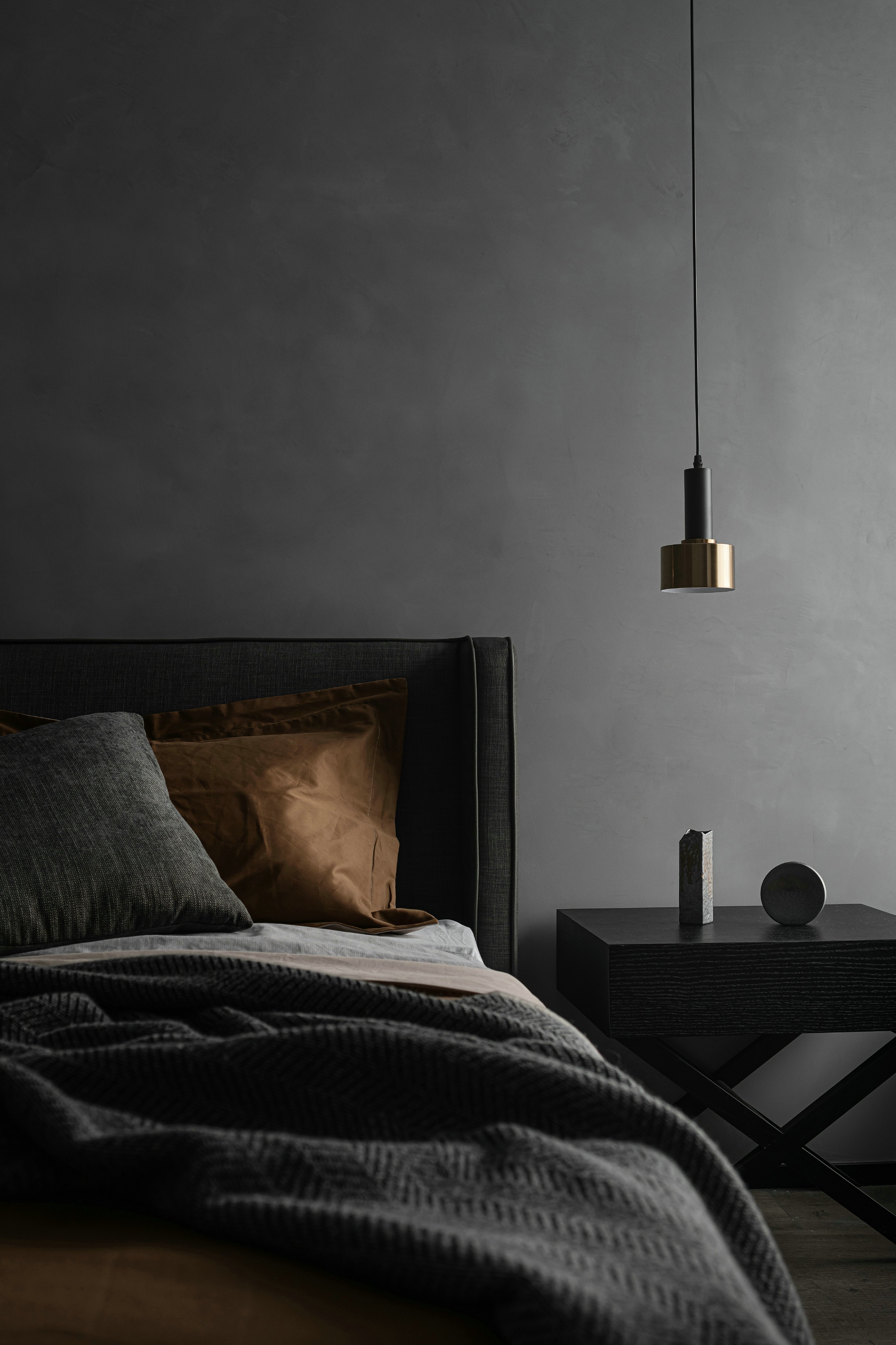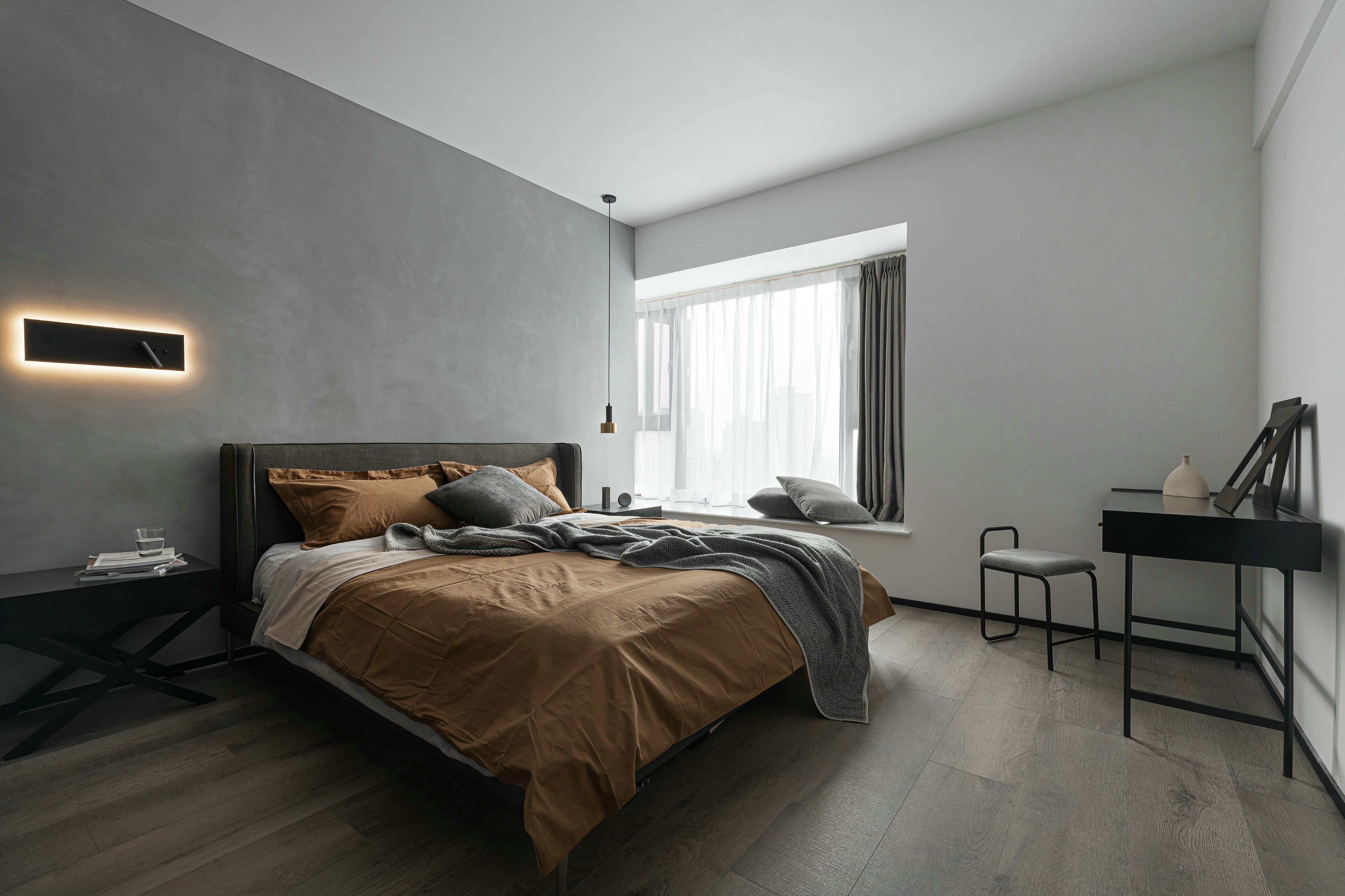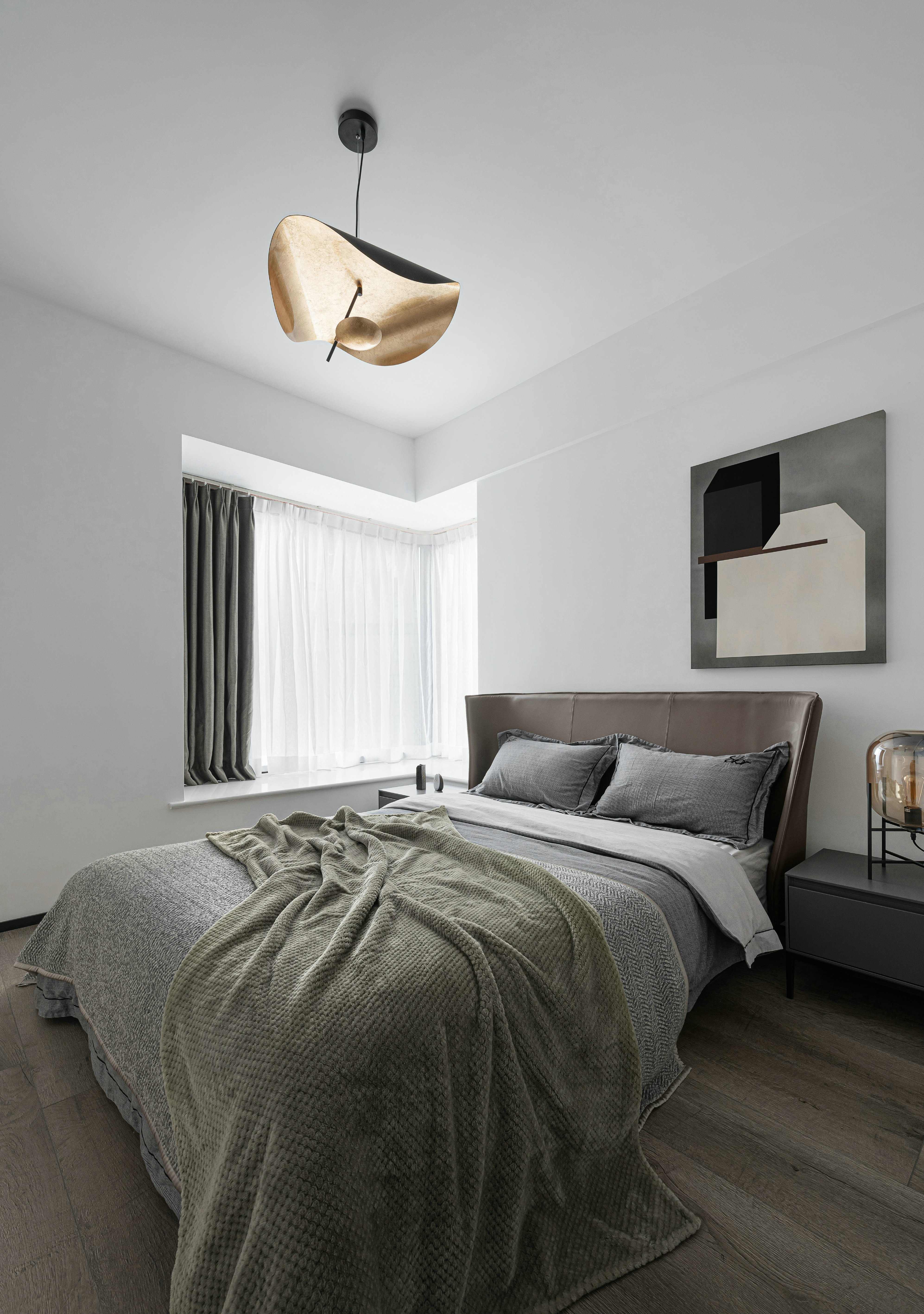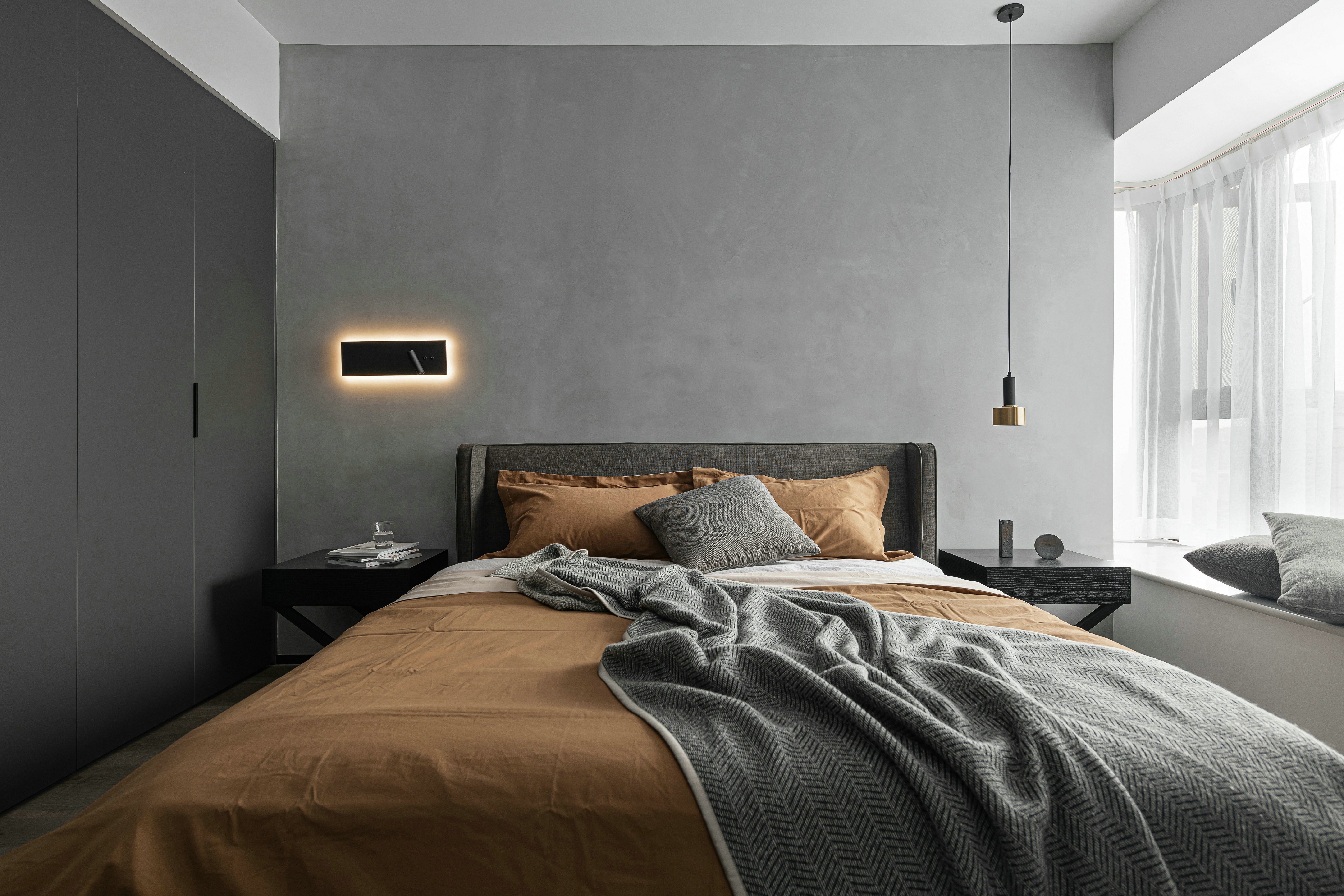 深色系的布艺加上深色的床头柜,在水泥漆墙面背景衬托下,让卧室具有静谧感,古铜色小吊灯与斑驳感十足的金属摆件的搭配更是让床头更有乐趣,富有精致感。推开主卧门的一刹那,整颗心都放了下来;简约舒适感袭来,不免爱上这简约温暖不凌乱的窝,水泥漆、哑光衣柜、亚麻布样的床头,不同层次的灰度颜色和自身肌理的呈现,加上色彩浓烈的床品,延续了客厅的设计构架,避免了空间的色彩单一,同时也为主卧增加一丝暖意,床头的壁灯及小型吊灯让空间多一份情调。 The dark fabric and the dark bedside table set off the cement paint wall background to give the bedroom a sense of tranquility. The combination of the small bronze chandelier and the mottled metal ornaments makes the bedside more fun and exquisite. feel. The moment I opened the door of the master bedroom, my whole heart was relieved; the simple and comfortable feeling hits, I can’t help but fall in love with this simple and warm and not messy nestCement paint, matte wardrobe, linen-like headboard, different levels of The presentation of gray-scale colors and its own texture, coupled with the richly colored bedding, continues the design framework of the living room, avoids the single color of the space, and also adds a touch of warmth to the master bedroom. The wall lamp and small chandeliers at the bedside make the space One more sentiment.