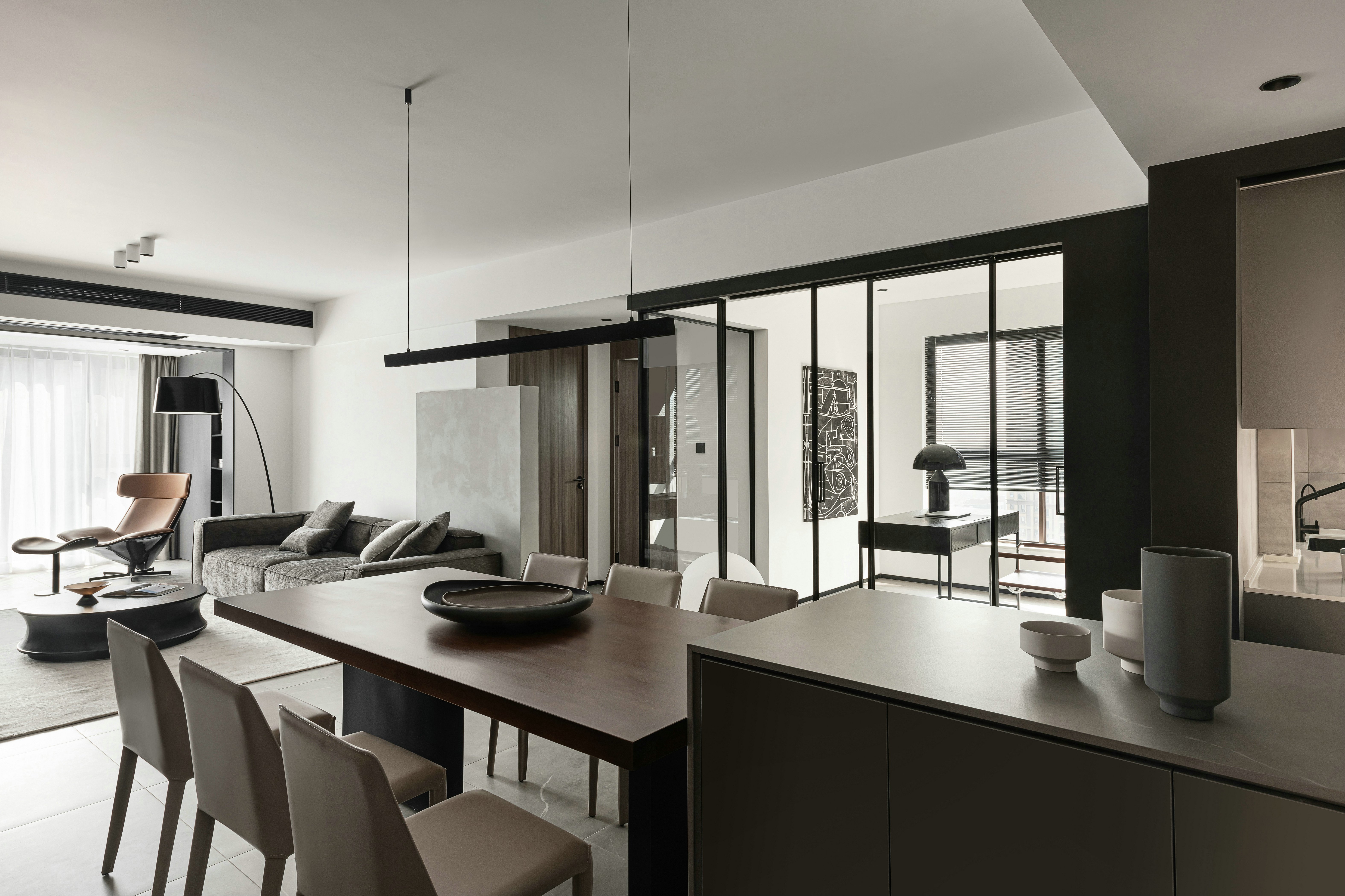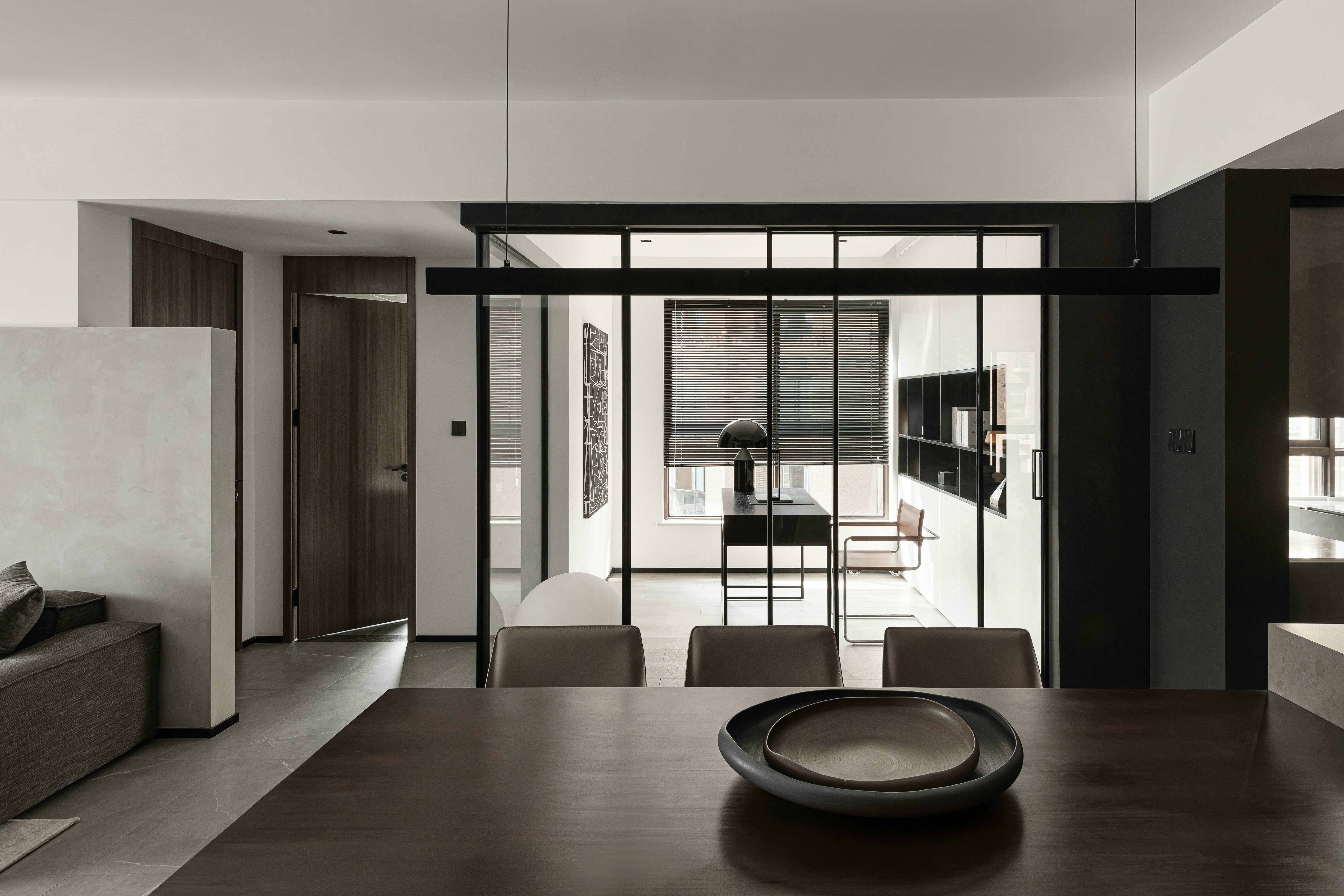 更多开放空间的打造,让餐厅与客厅实现了联动的可能。透明玻璃门的选择,又带动餐厅、客厅同书房的互动;无论家人们在哪个区域活动,一抬眼,总能寻到那个他(她)。整个空间重新的功能重组后,餐厅与厨房、与客厅、与书房尽收眼里,空间场景得到了丰富,让家有更多可能...... The creation of more open spaces makes it possible for the dining room and the living room to be linked. The choice of transparent glass doors also drives the interaction between the dining room, living room and the study; no matter where the family is active, they can always find him (her) when they look up. After the reorganization of the entire space, the dining room and kitchen, the living room, and the study can be seen. The space scene has been enriched, making the home more possible...