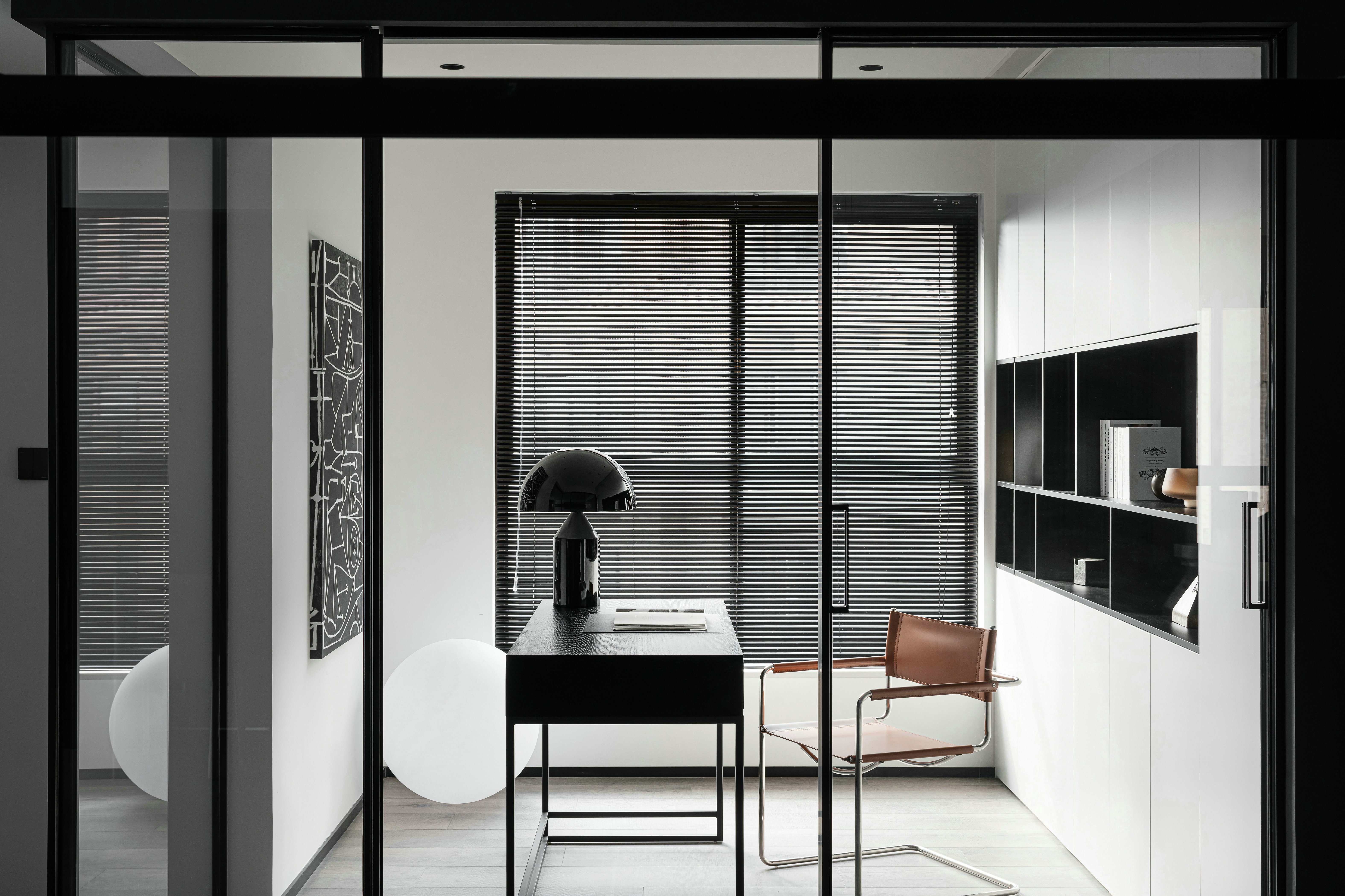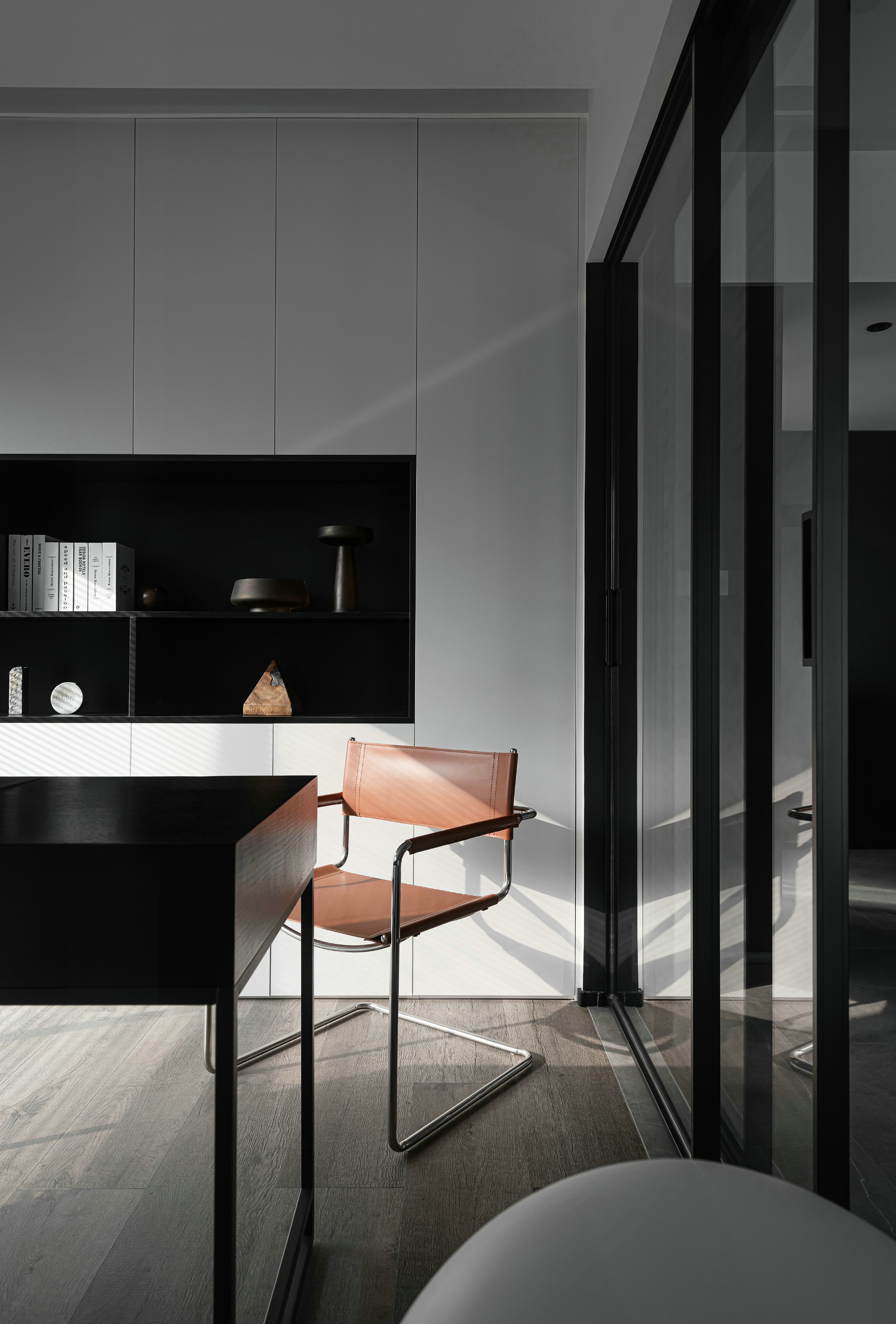 推开橙色的座椅,伸个懒腰来缓解疲乏;屋外的阳光斜射在脸庞,温暖又恬静。百叶帘的隐约开合、抽象艺术挂画的存在、圆形灯球的交汇相应,给书房空间注入别样的氛围。抬头一看,客厅餐厅的家人们各自忙活,不亦乐乎,内心充盈而满足。几何体充满着整个书房,像极了我们每个不同的几何人生。 Pushing aside the orange seat, stretched out to relieve fatigue; the sun outside the house obliquely shot on his face, warm and quiet. The faint opening and closing of the venetian blinds, the existence of abstract art hanging paintings, and the intersection of the circular light bulbs, inject a different atmosphere into the study space. Looking up, the family members in the living room and dining room are busy and happily, and their hearts are full and contented. Geometry fills the entire study room, which resembles each of our different geometric lives.
