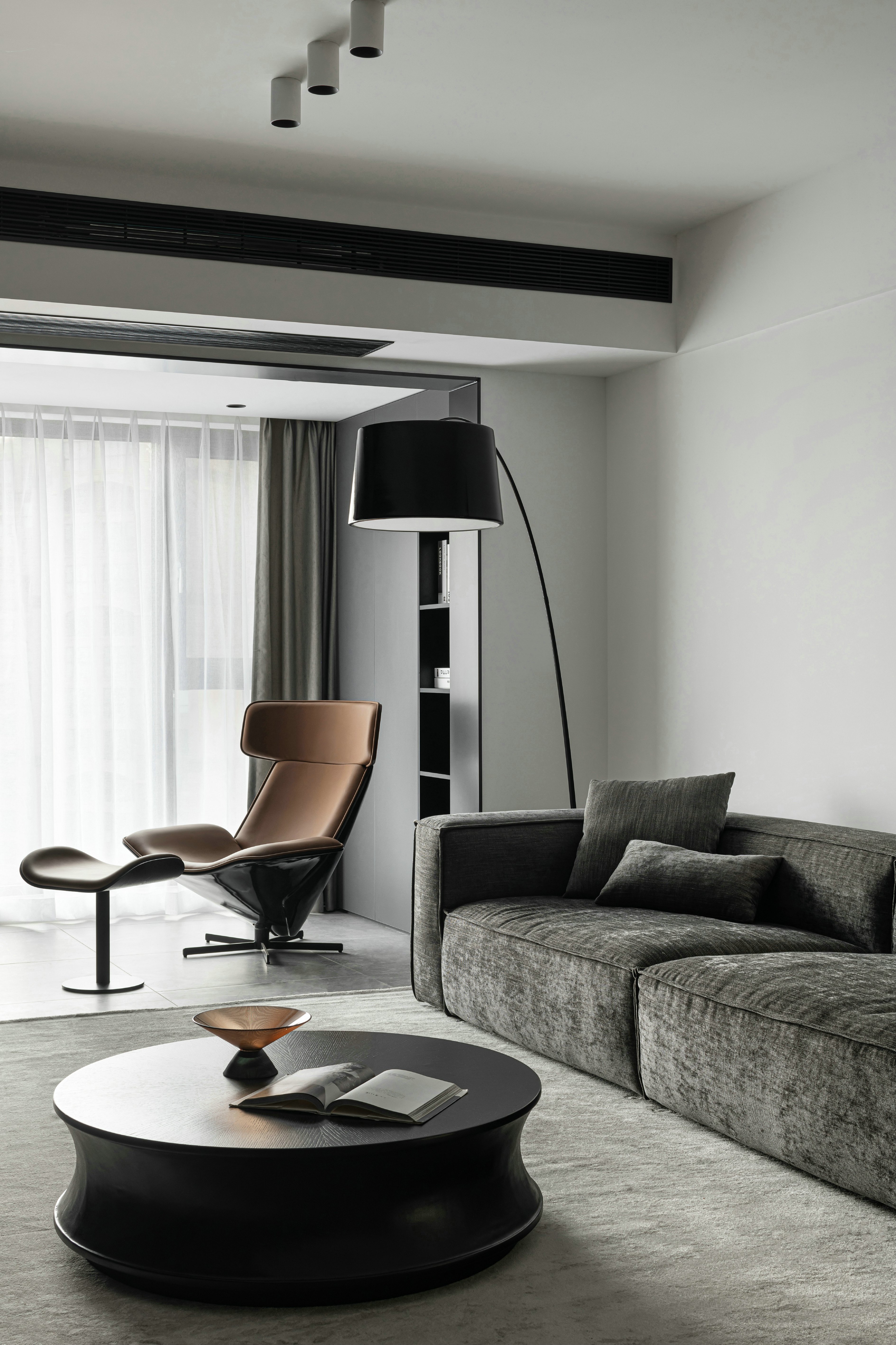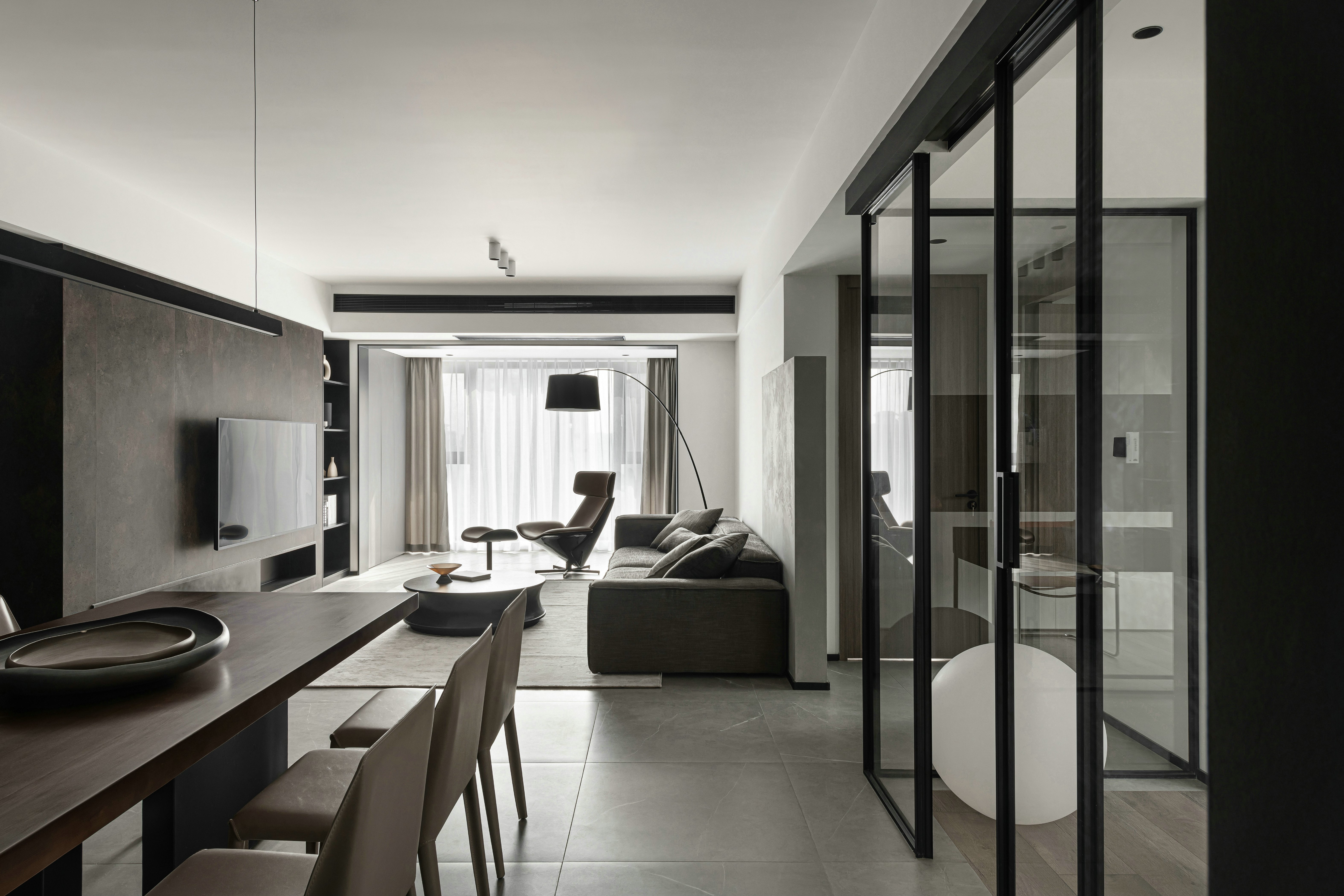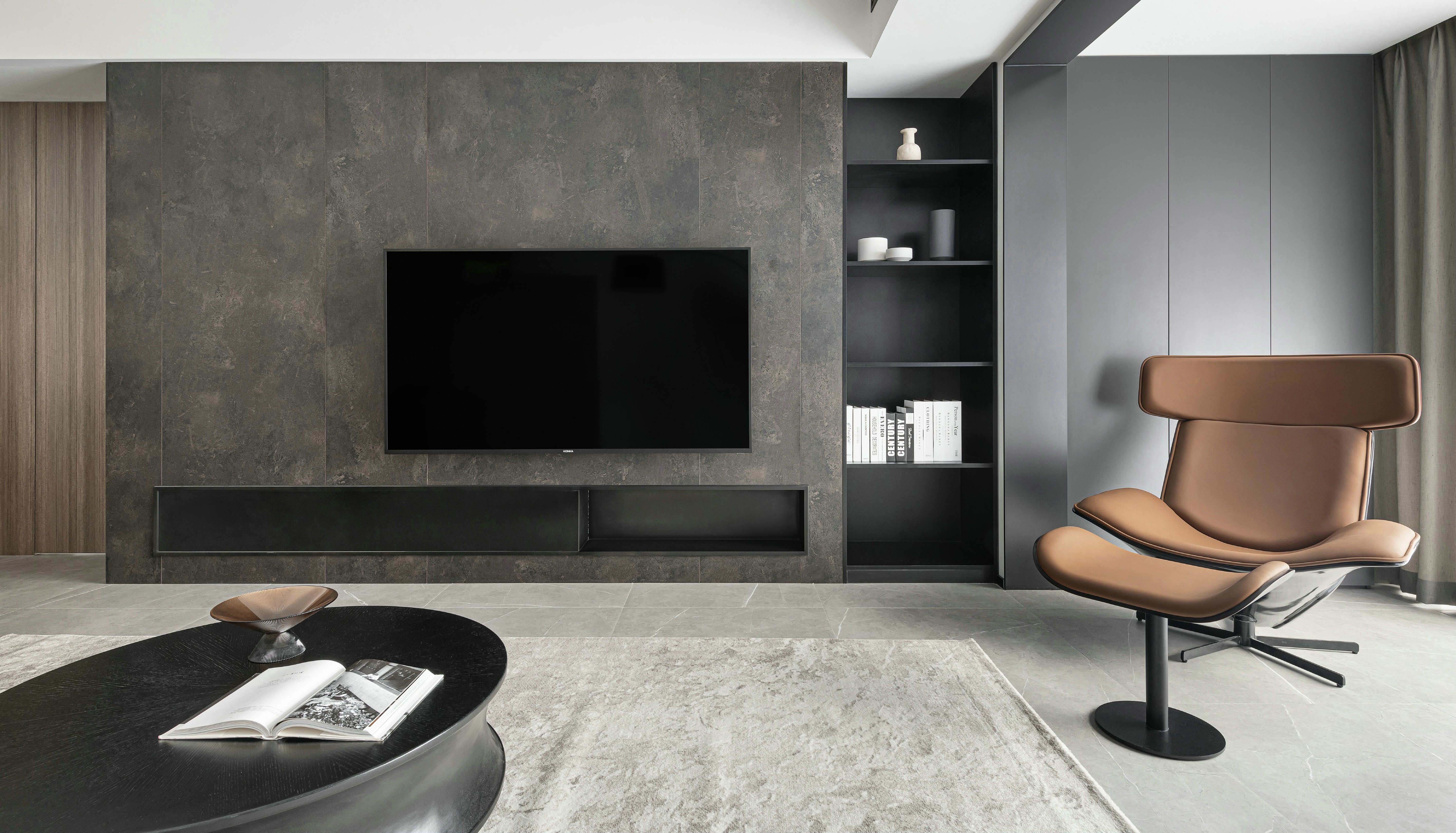 客厅区域用单色材质对比,以及黑白灰色系整体搭配,来进行空间氛围的营造;既独立又统一。 木材、水泥漆、石纹墙板和地砖自然肌理的结合,碰撞出不同视觉感受;不同层次的几何造型体块解构、重组、装置般的处理,创造了不一样的空间立面形态。 The living room area uses monochromatic material contrast and the overall collocation of black, white and gray to create a space atmosphere; it is independent and unified. The natural texture of wood, cement paint, stone-grained wall panels and floor tiles collide with different visual feelings; different levels of geometric modeling blocks are deconstructed, reorganized, and treated like installations, creating different spatial facade shapes.