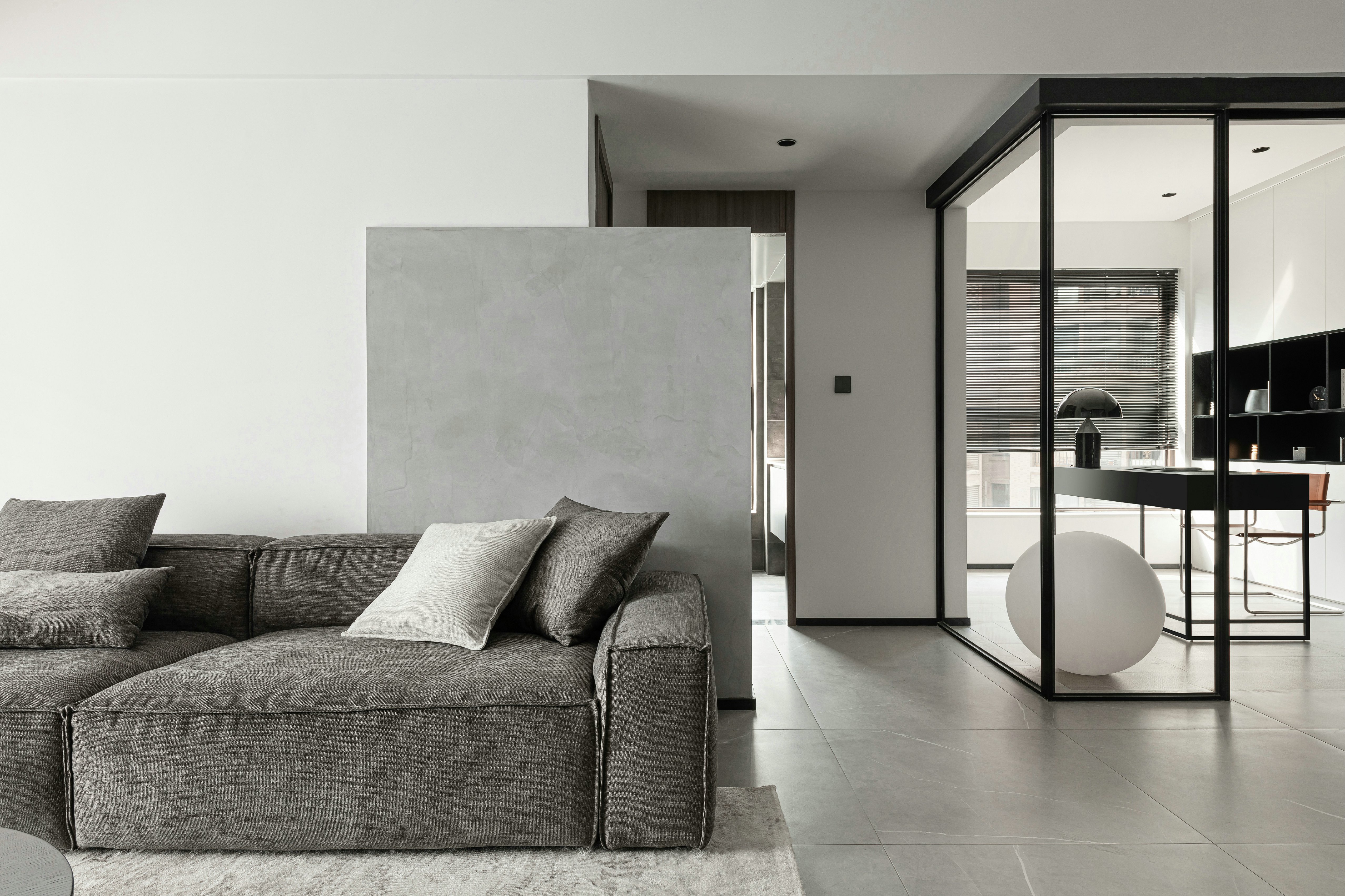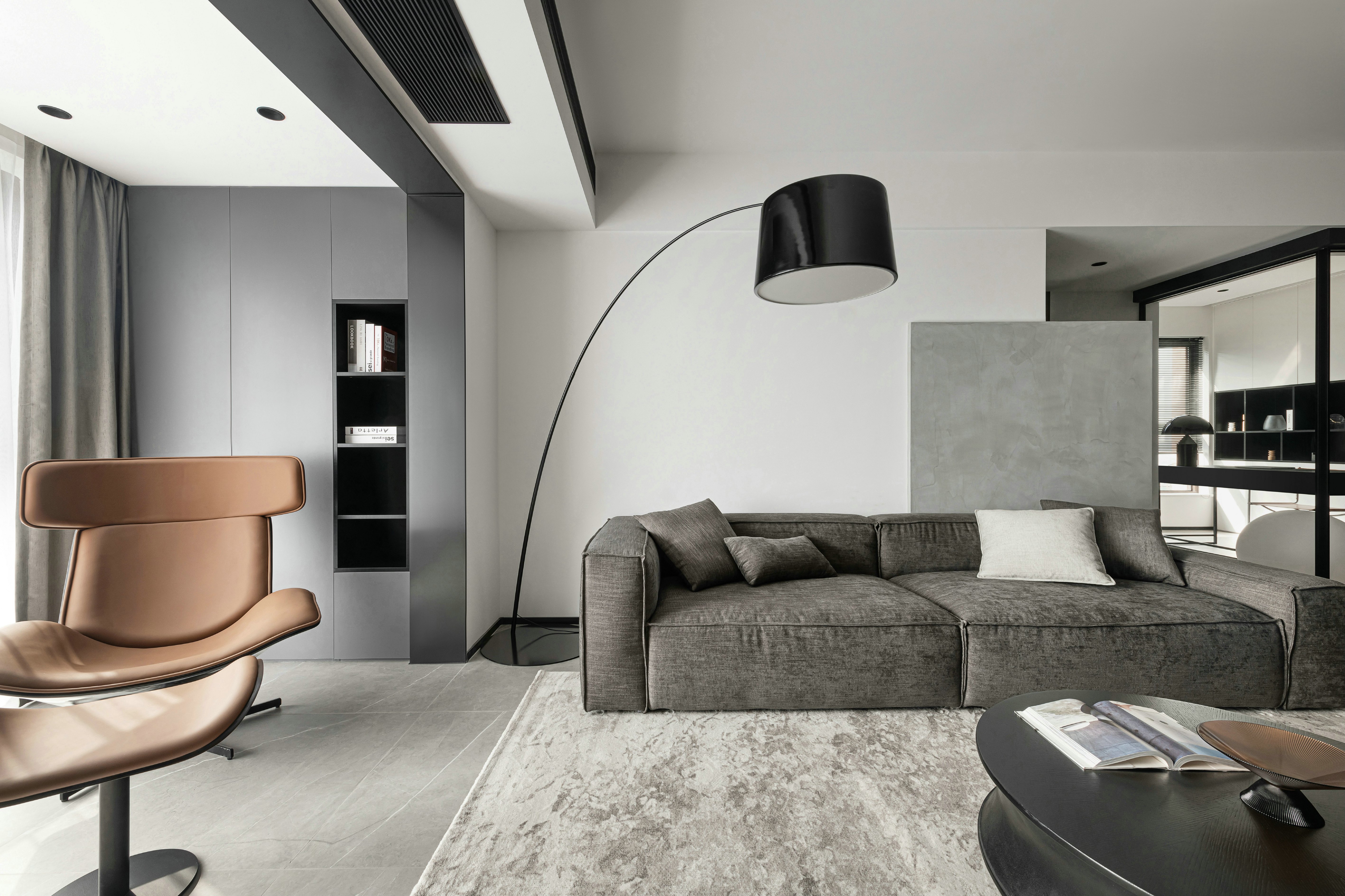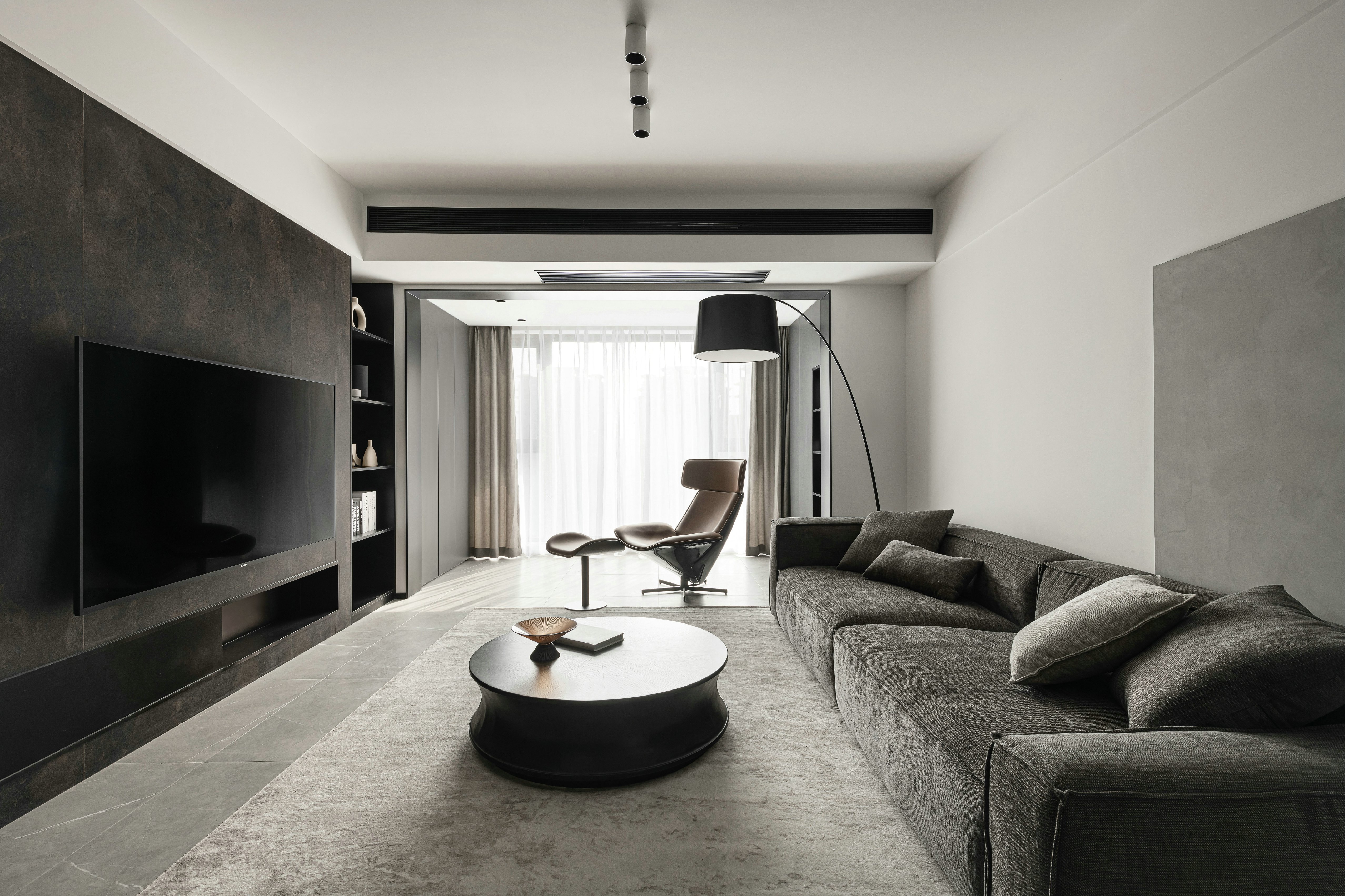 客厅区域用单色材质对比,以及黑白灰色系整体搭配,来进行空间氛围的营造;既独立又统一。 木材、水泥漆、石纹墙板和地砖自然肌理的结合,碰撞出不同视觉感受;不同层次的几何造型体块解构、重组、装置般的处理,创造了不一样的空间立面形态。 The living room area uses monochromatic material contrast and the overall collocation of black, white and gray to create a space atmosphere; it is independent and unified. The natural texture of wood, cement paint, stone-grained wall panels and floor tiles collide with different visual feelings; different levels of geometric modeling blocks are deconstructed, reorganized, and treated like installations, creating different spatial facade shapes.