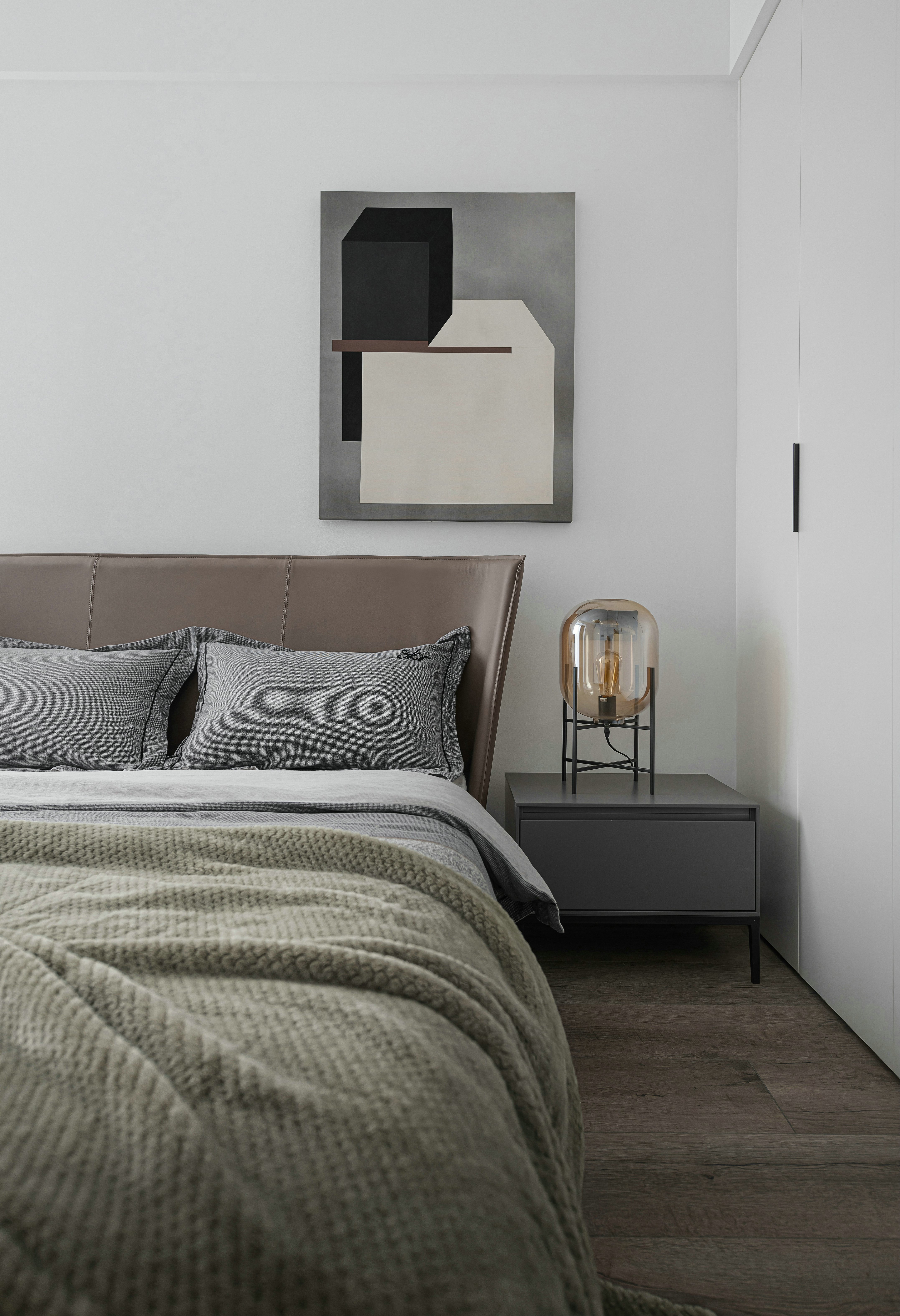 抽象色块挂画、琥珀台灯搭配浅咖皮质床头;高级感的视觉来袭,给人以静谧与沉着。皮质床和床品布艺搭配、琥珀玻璃和铁艺灯具的穿插组合,给纯净的次卧空间以精致。 Abstract color block paintings, amber lamp and light coffee leather headboard; high-level vision strikes, giving people tranquility and composure. The interspersed combination of leather bed and bedding fabrics and amber glass iron lamps give the pure second bedroom a refined space.