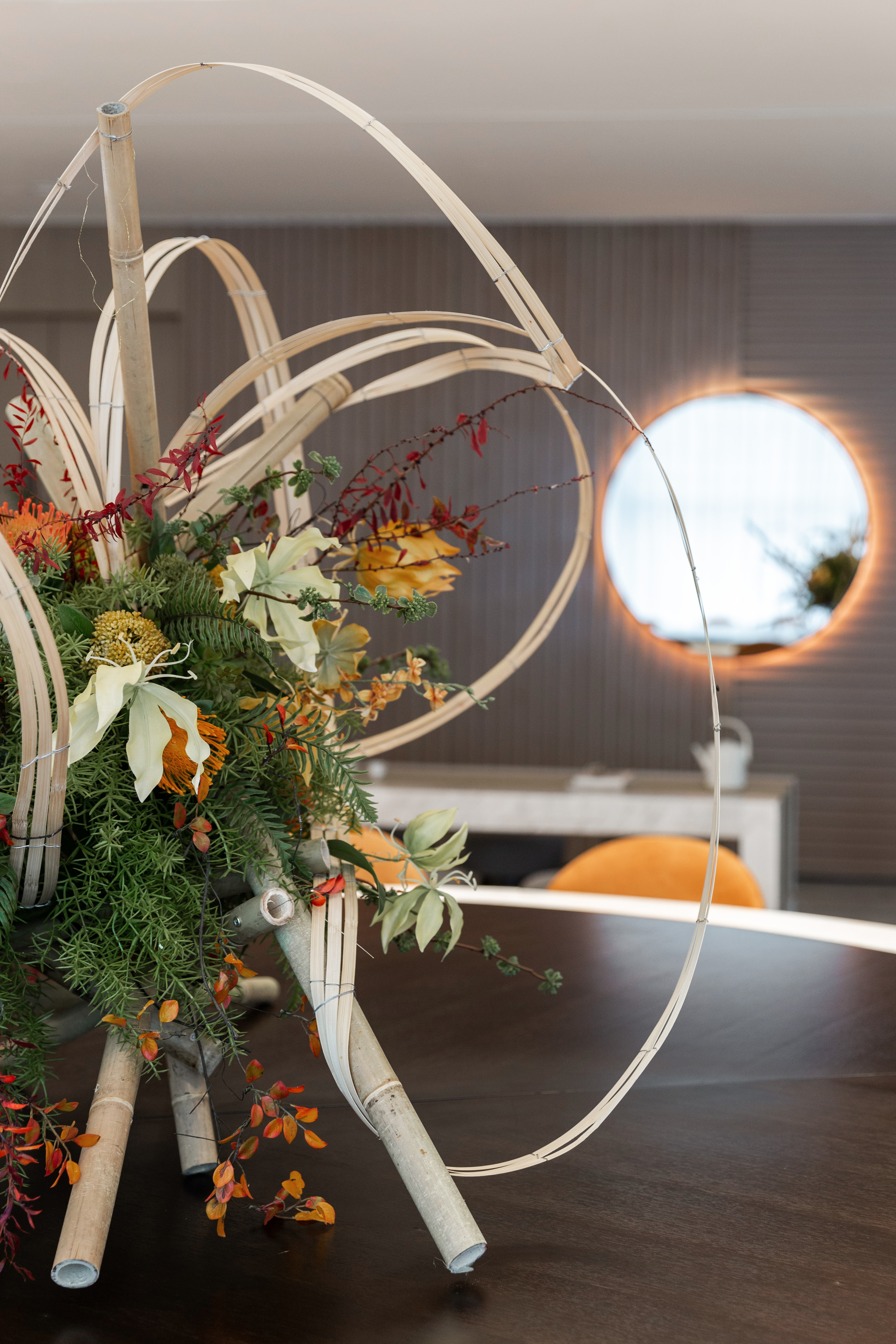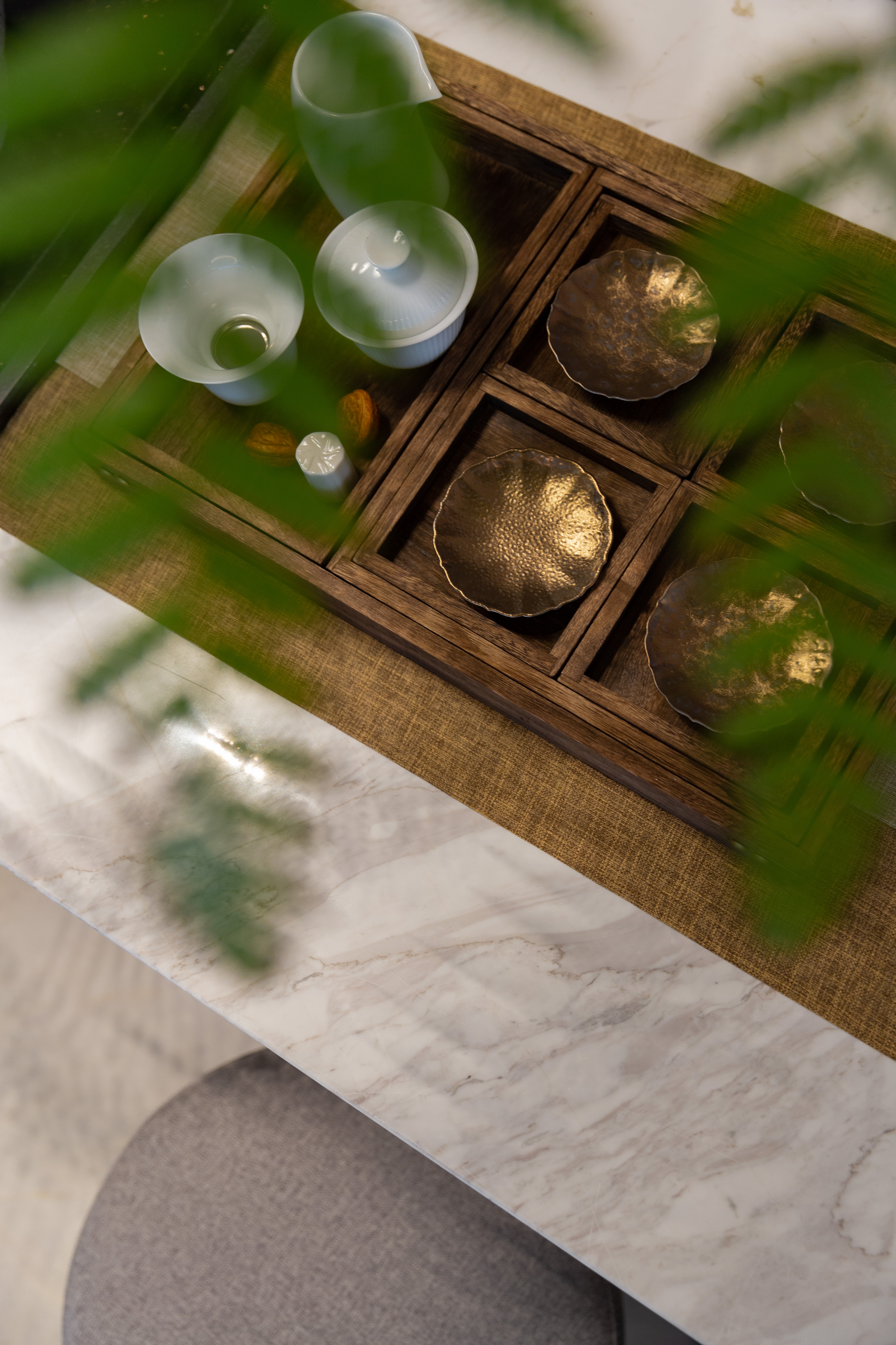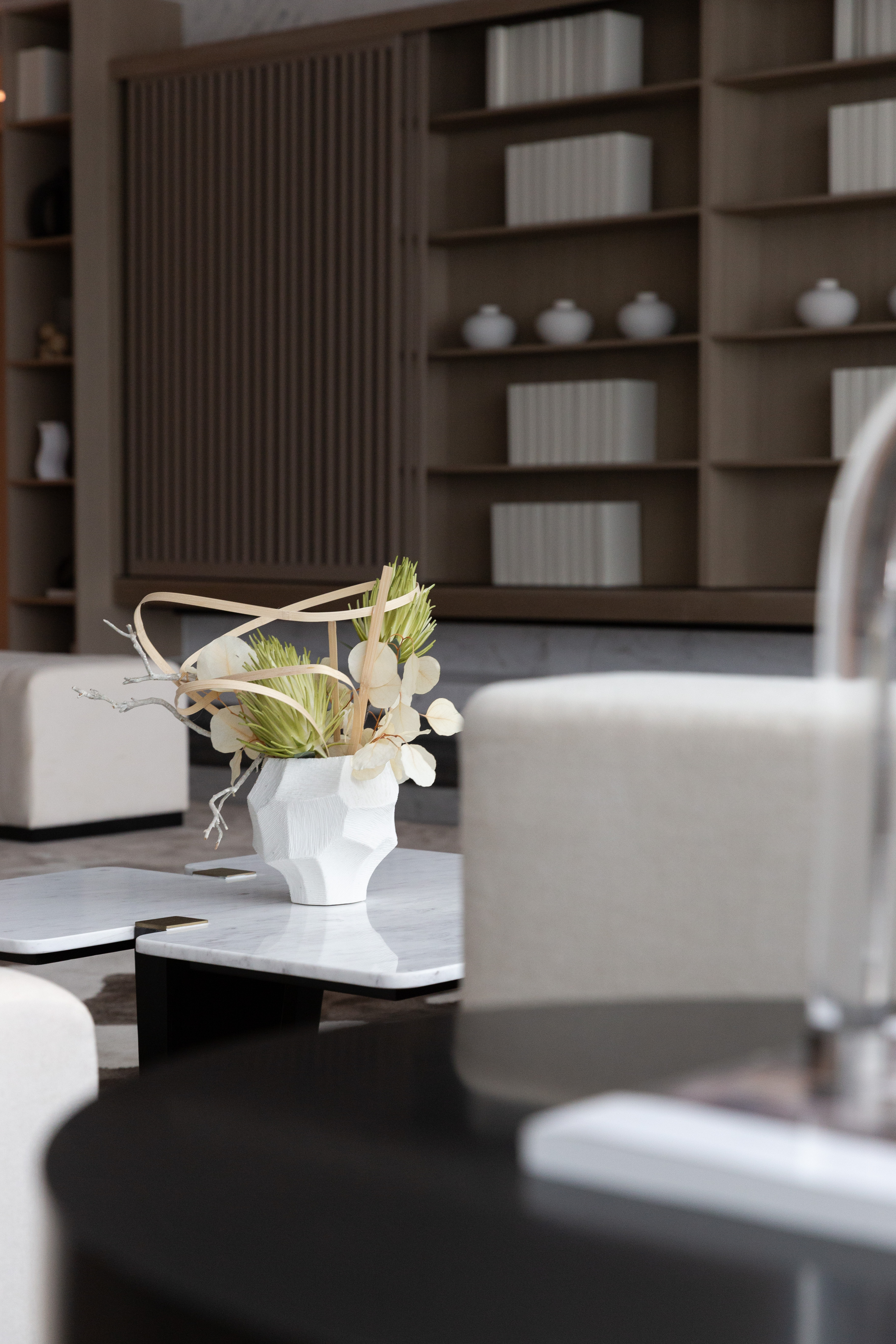 竹,一直以来就是中国历代文人雅士的最爱,大诗人苏轼曾赋诗称「可使食无肉,不可居无竹。无肉令人瘦,无竹令人俗。人瘦尚可肥,士俗不可医。」而竹编质感的花艺摆件,正是给空间增添了这一丝高雅追求的意味。不同的陈设肌理交织丰富了空间的层次,每一件家具的阵列排布,也成为区域中的视觉焦点。