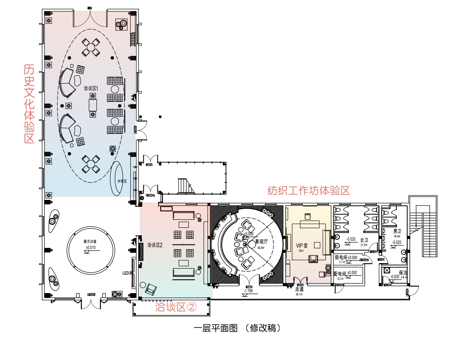 设计师利用藏品通柜将空间连贯起来,让空间更加轻盈通透。入口从洽谈区到沙盘次递进,划分两段式布局,功能相对独立又有连接。