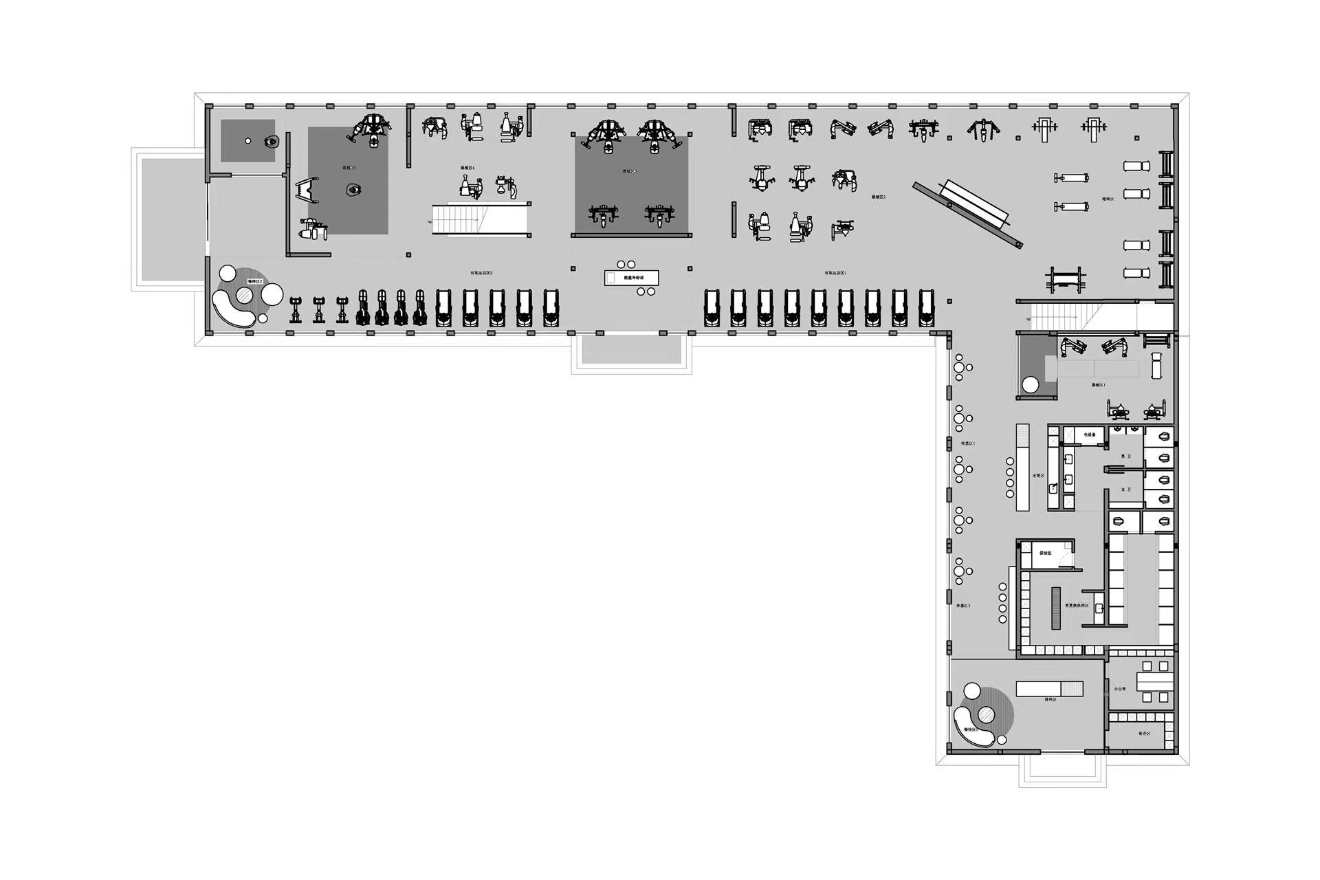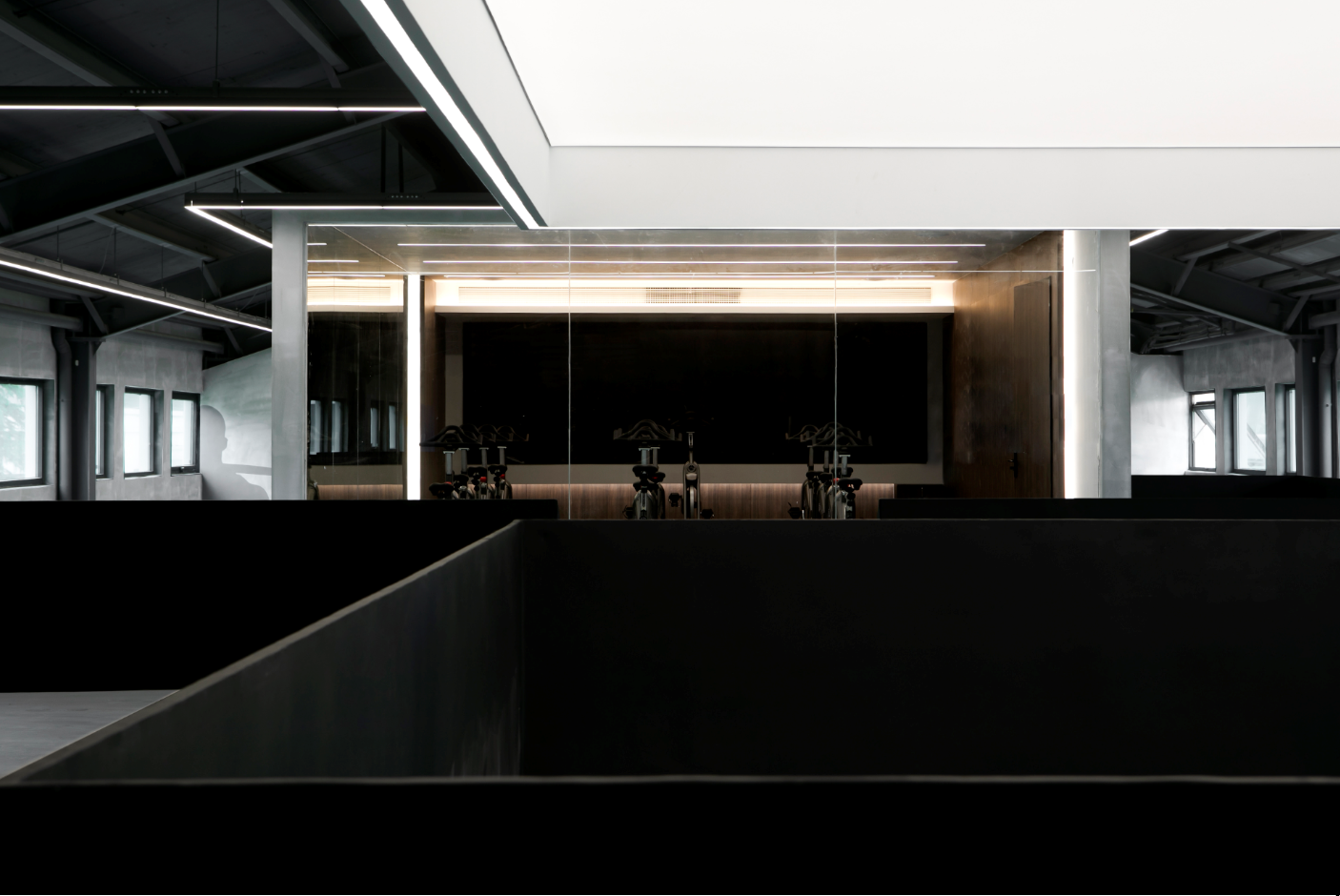 穿过接待中心是此片区(无氧区)的水吧中心及卫生间系统(洗手间保洁间及洗浴更换空间)。穿过走道是力量训练区域,楼梯上到二楼便是独立健身空间,舞操房,乒乓球室,单车室。