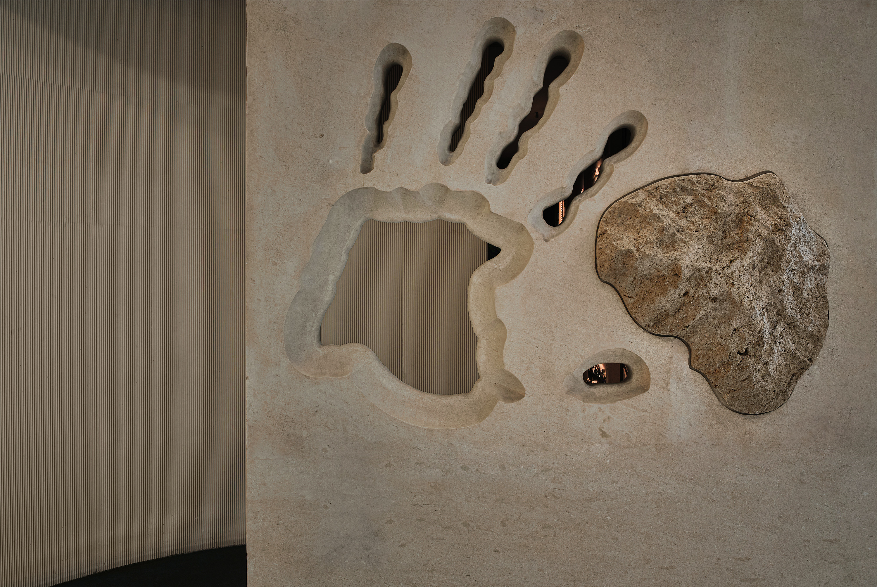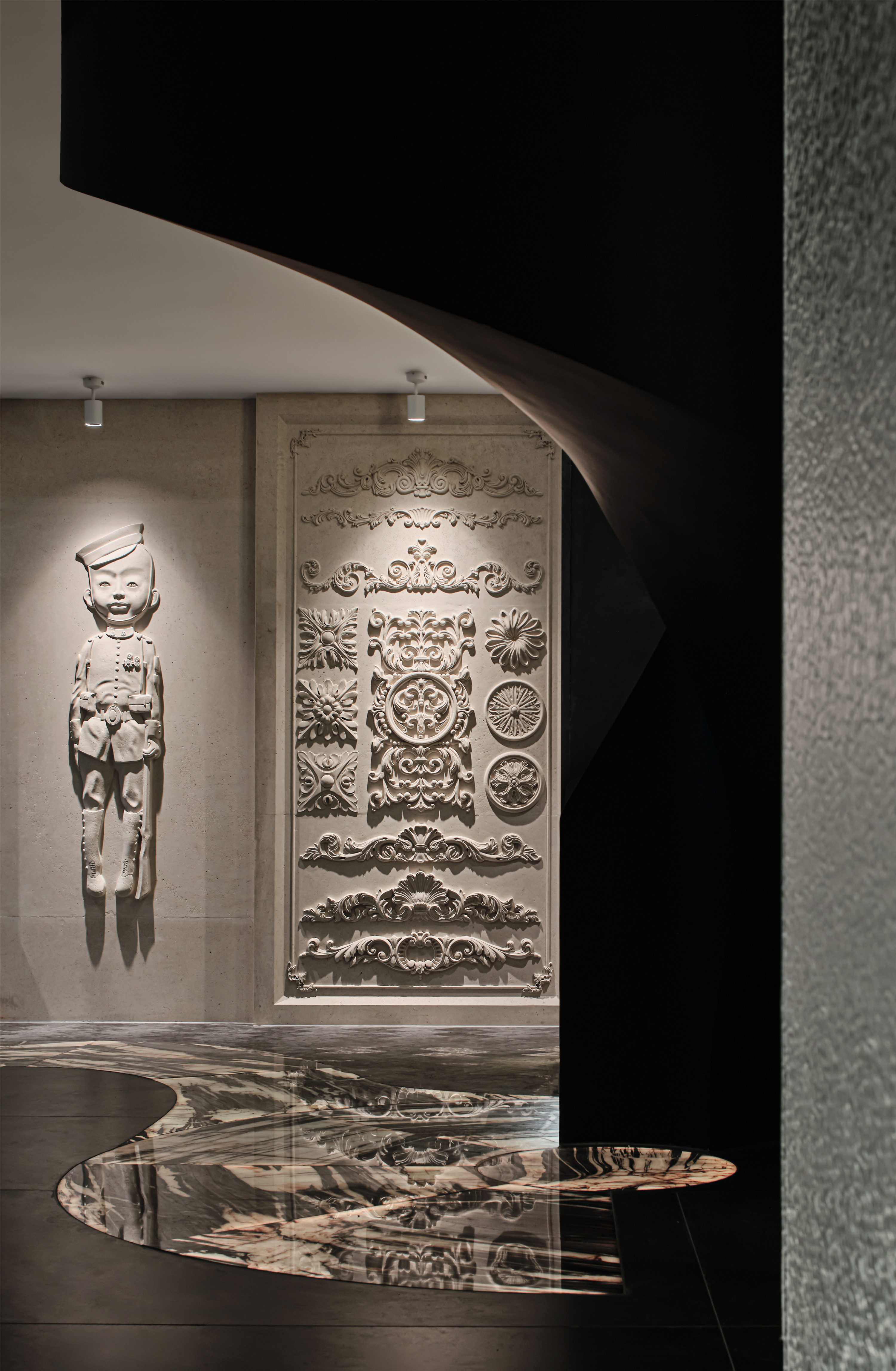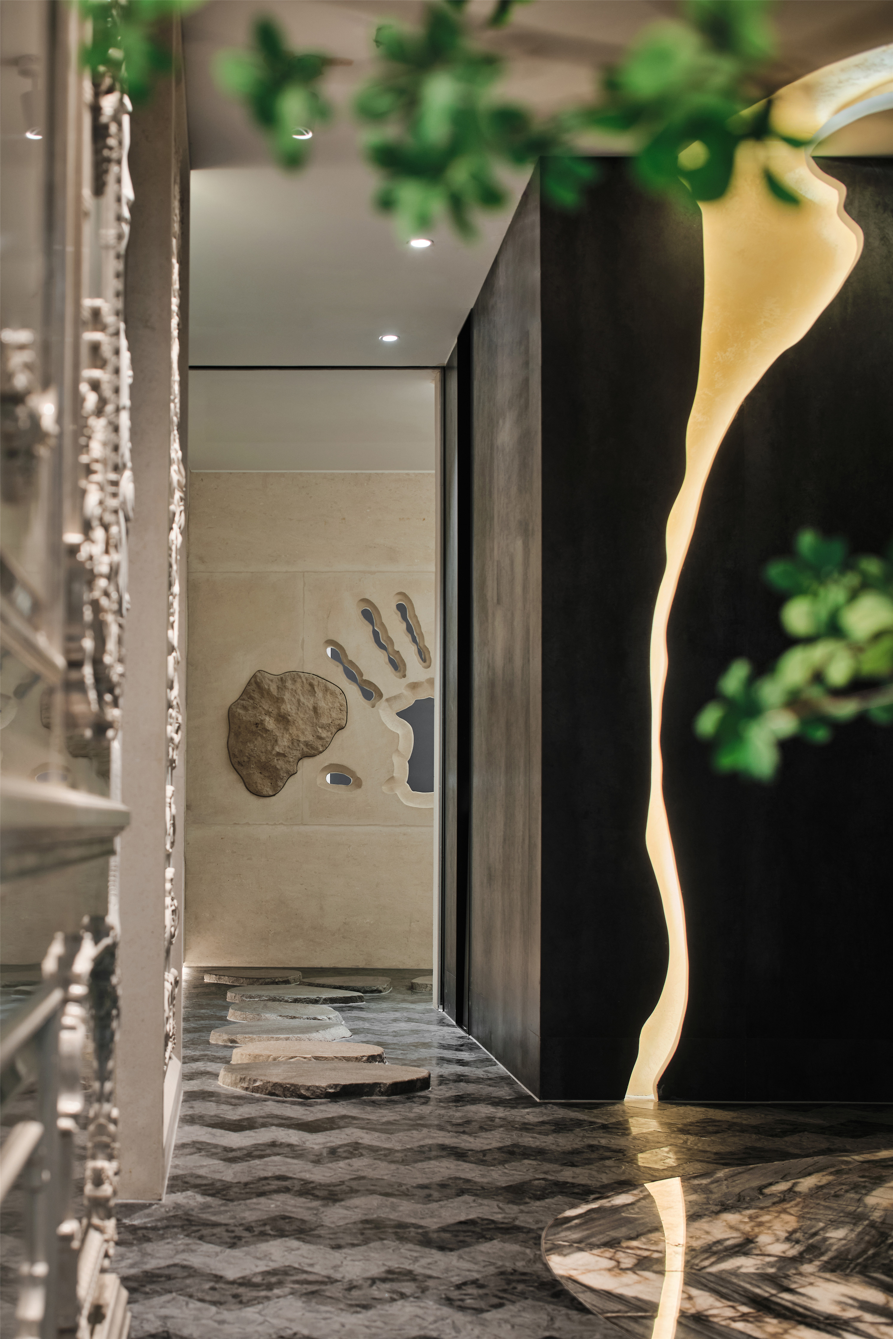 空间布局:入口为莱姆石的产品及工艺的展呈区域,踩着一踏踏汀步穿过狭窄的通道,看着满墙的莱姆石雕刻,穿过过道,眼前突然开阔,主展厅区域映入眼帘。