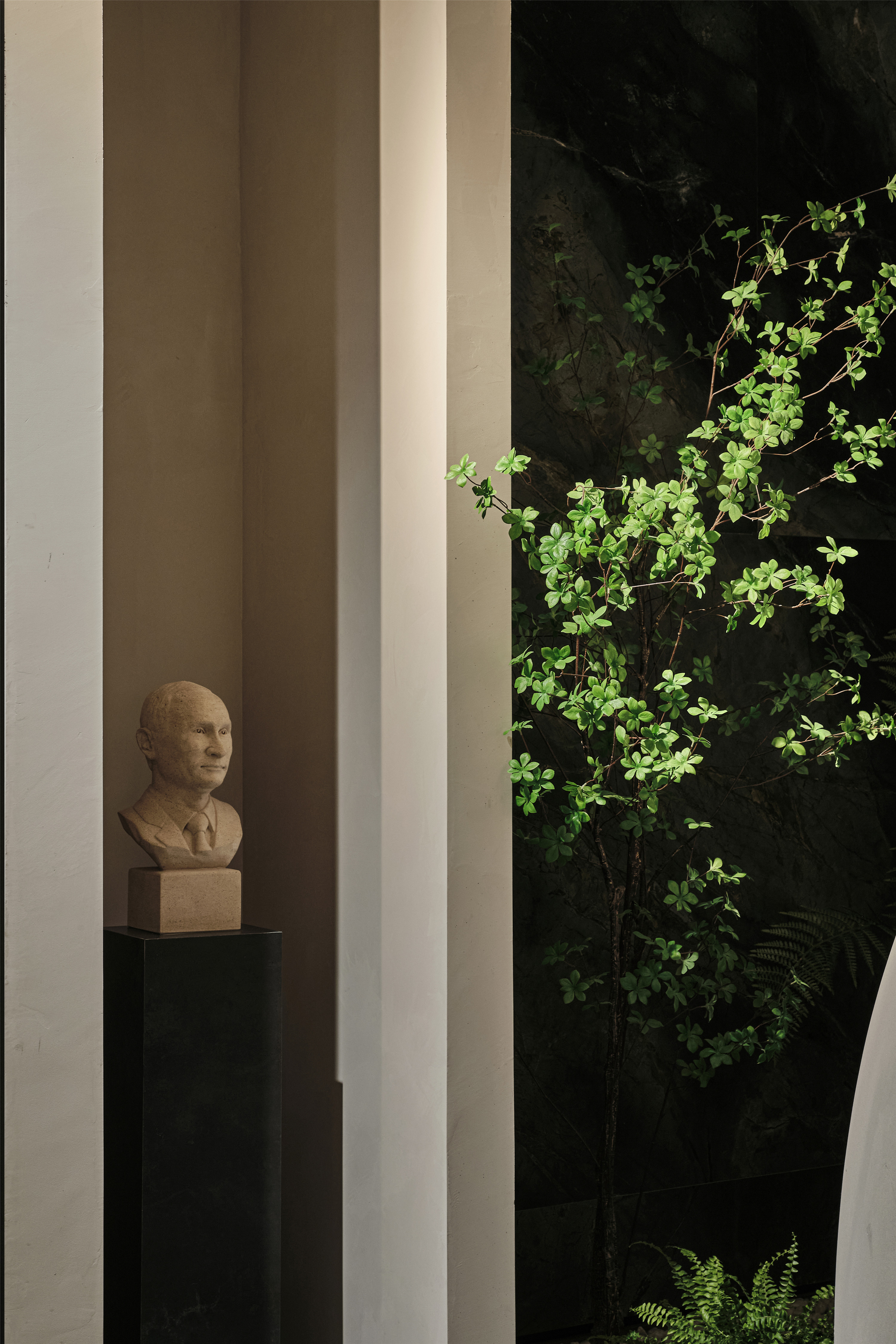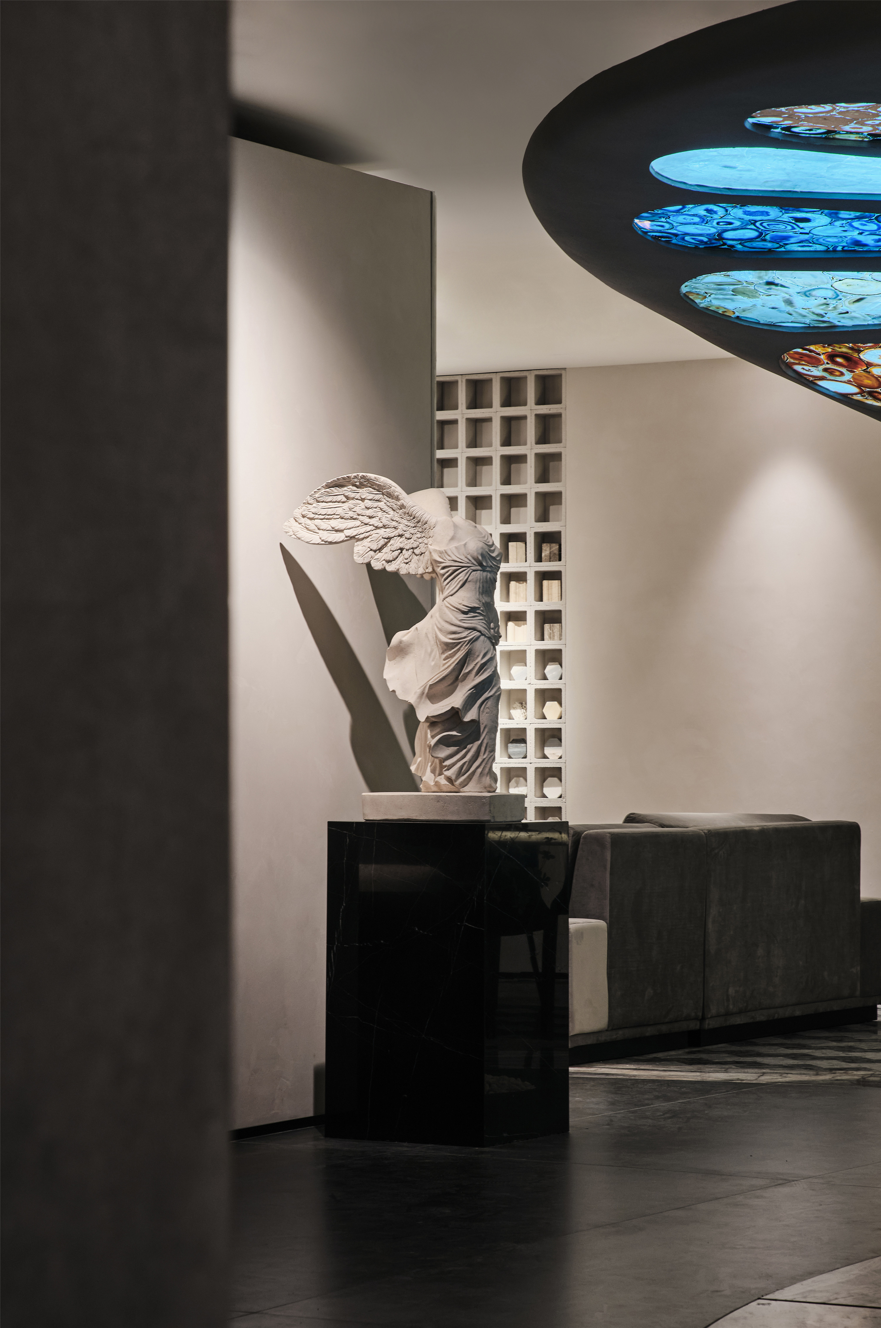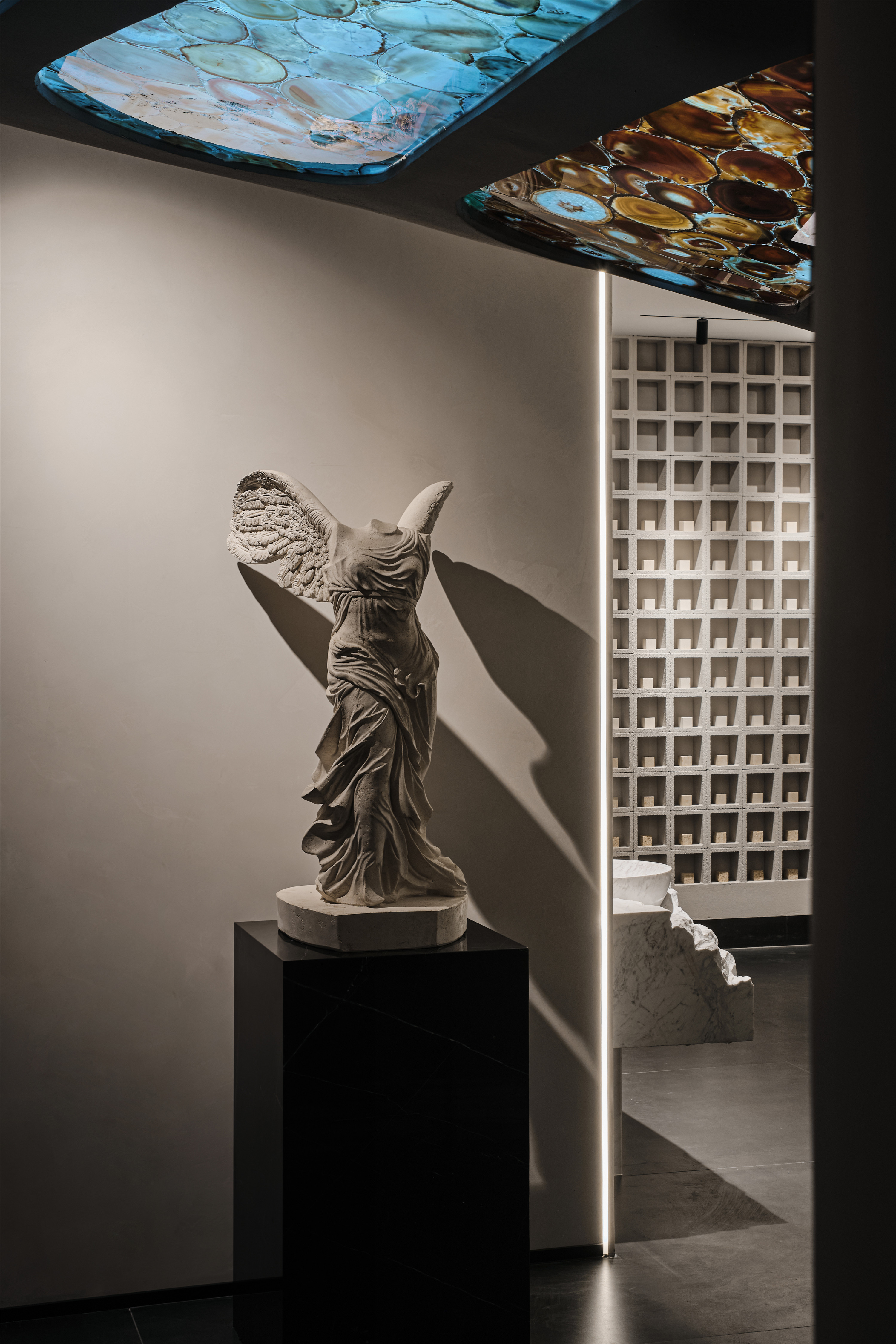 空间布局:入口为莱姆石的产品及工艺的展呈区域,踩着一踏踏汀步穿过狭窄的通道,看着满墙的莱姆石雕刻,穿过过道,眼前突然开阔,主展厅区域映入眼帘。