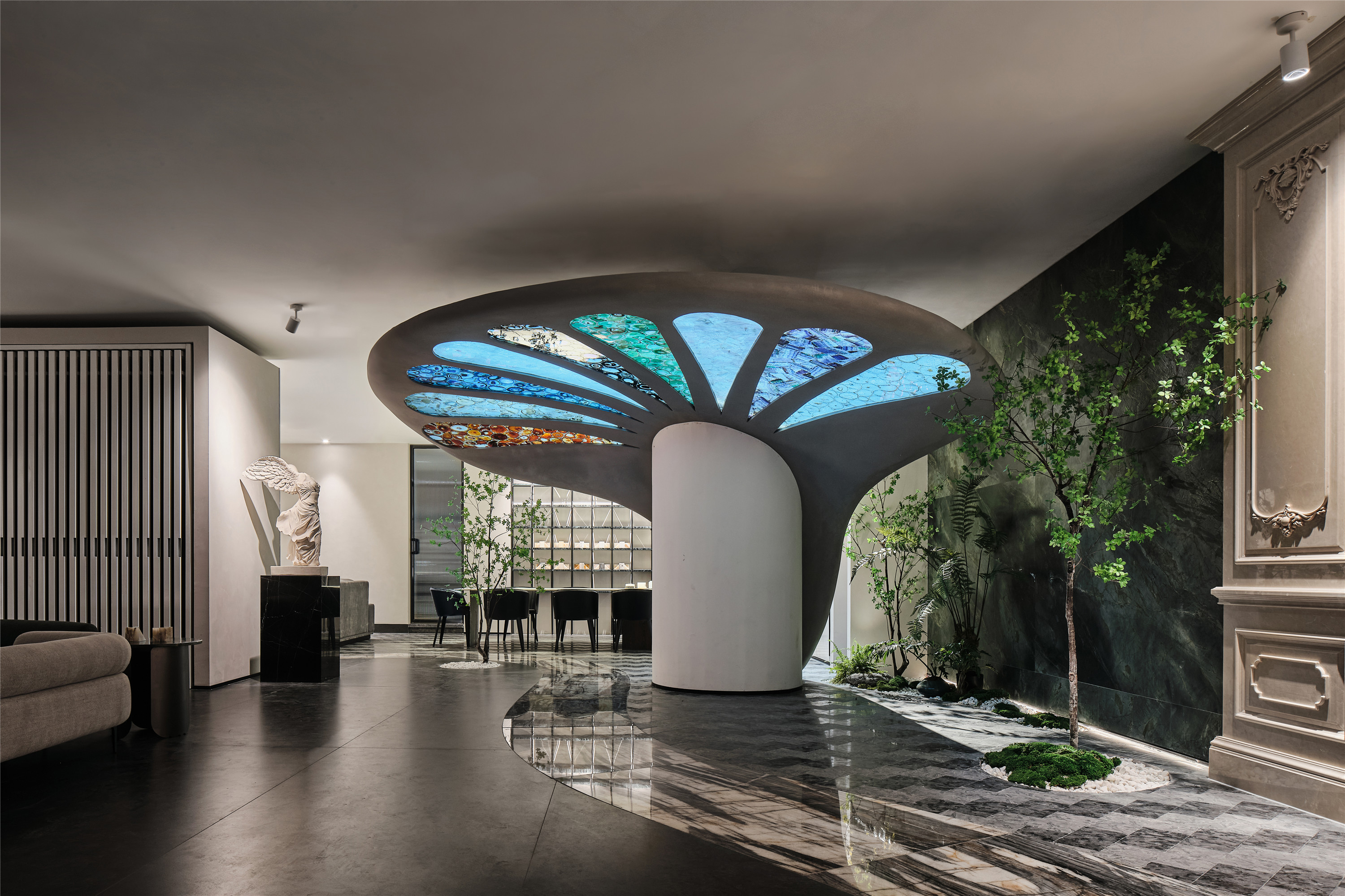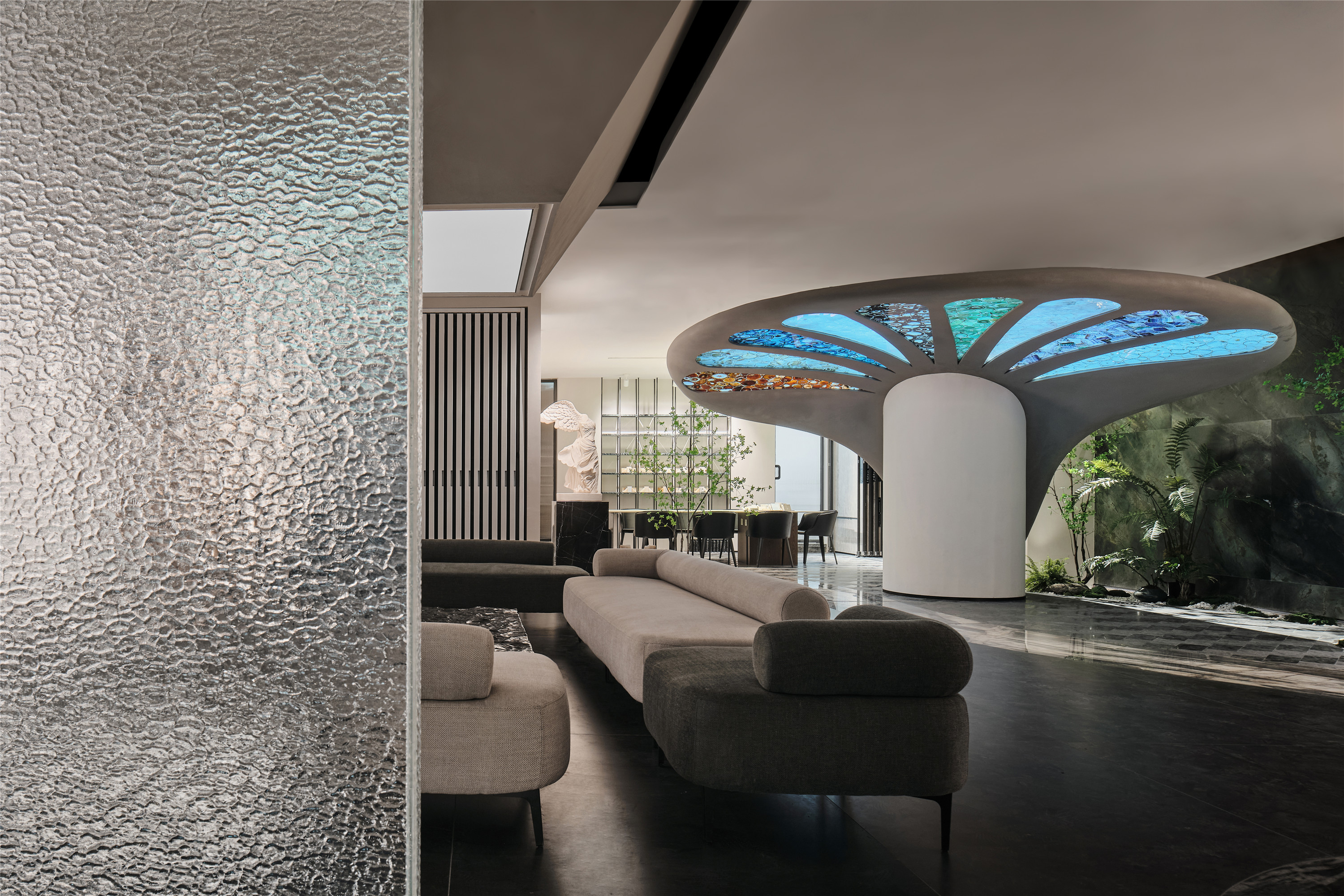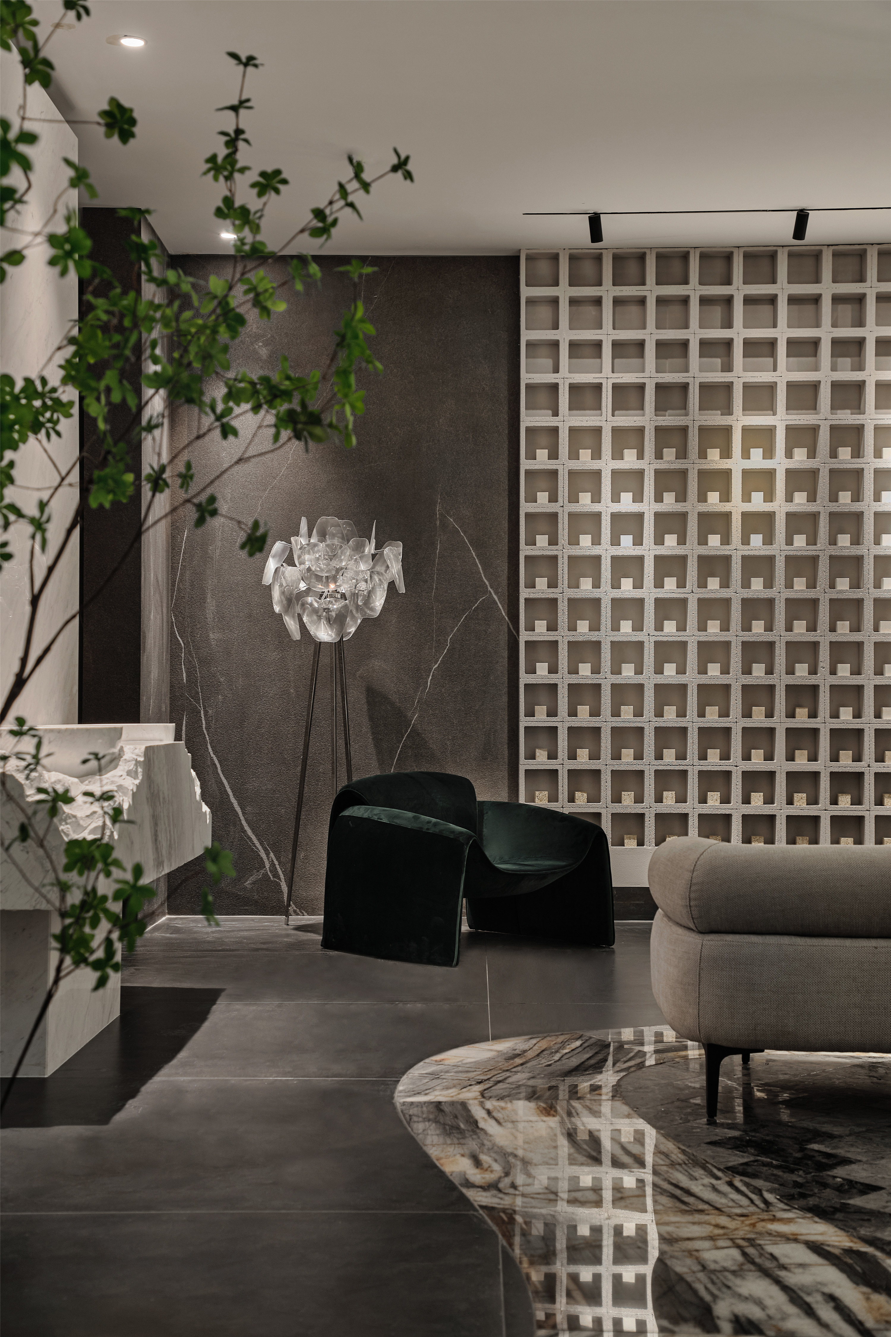设计选材:石材和岩板给人的印象大多是硬朗,厚重,冰冷的,所以在空间中运用通透的材料去打破沉闷感是非要必要的,我从两个方面去解决这一问题。一是产品本身,运用部分透光产品(石英类石材)来提亮空间,并增加了产品的丰富性。二是运用艺术玻璃和光的结合,虚隔空间的同时也让空间多了份灵动。
