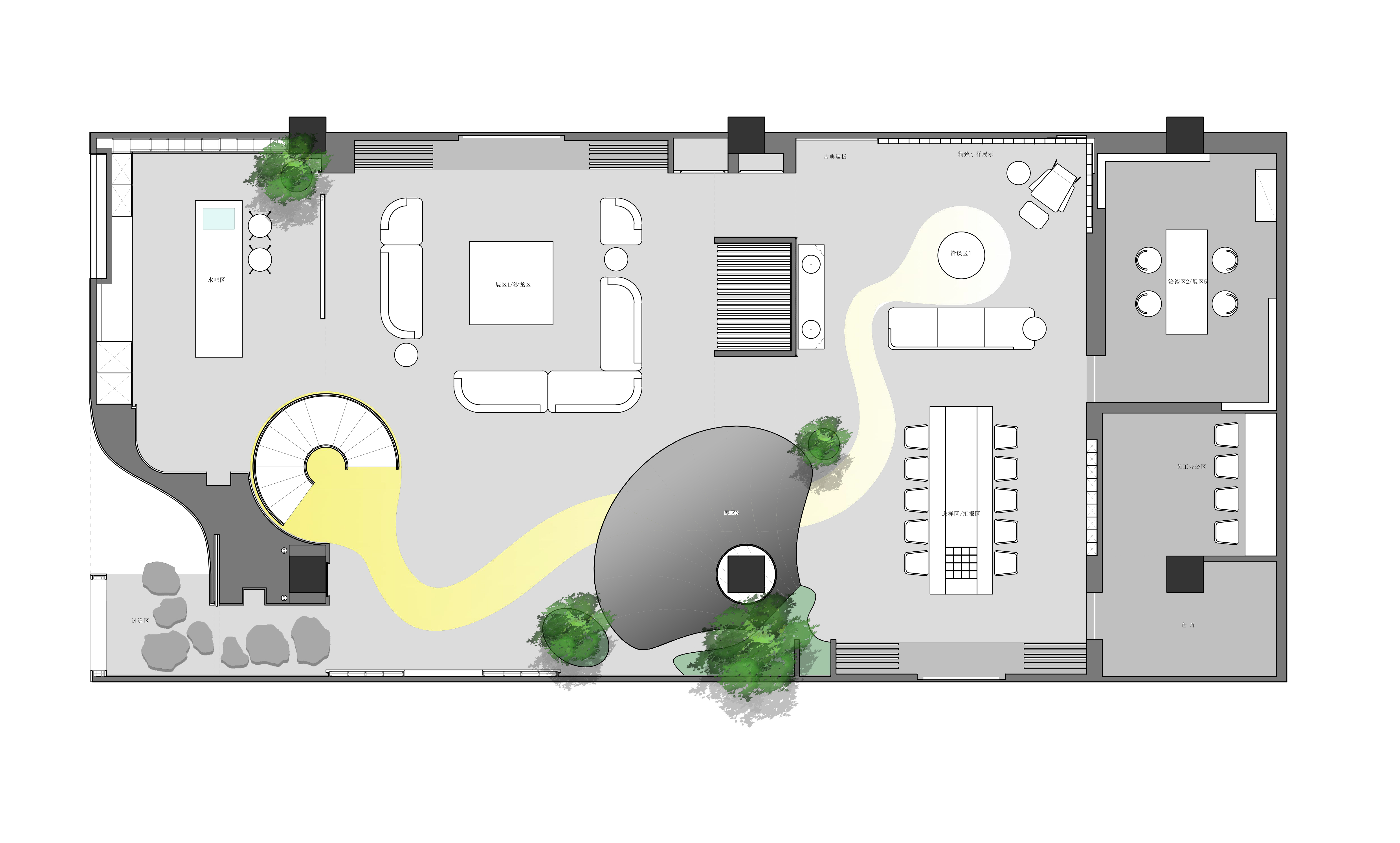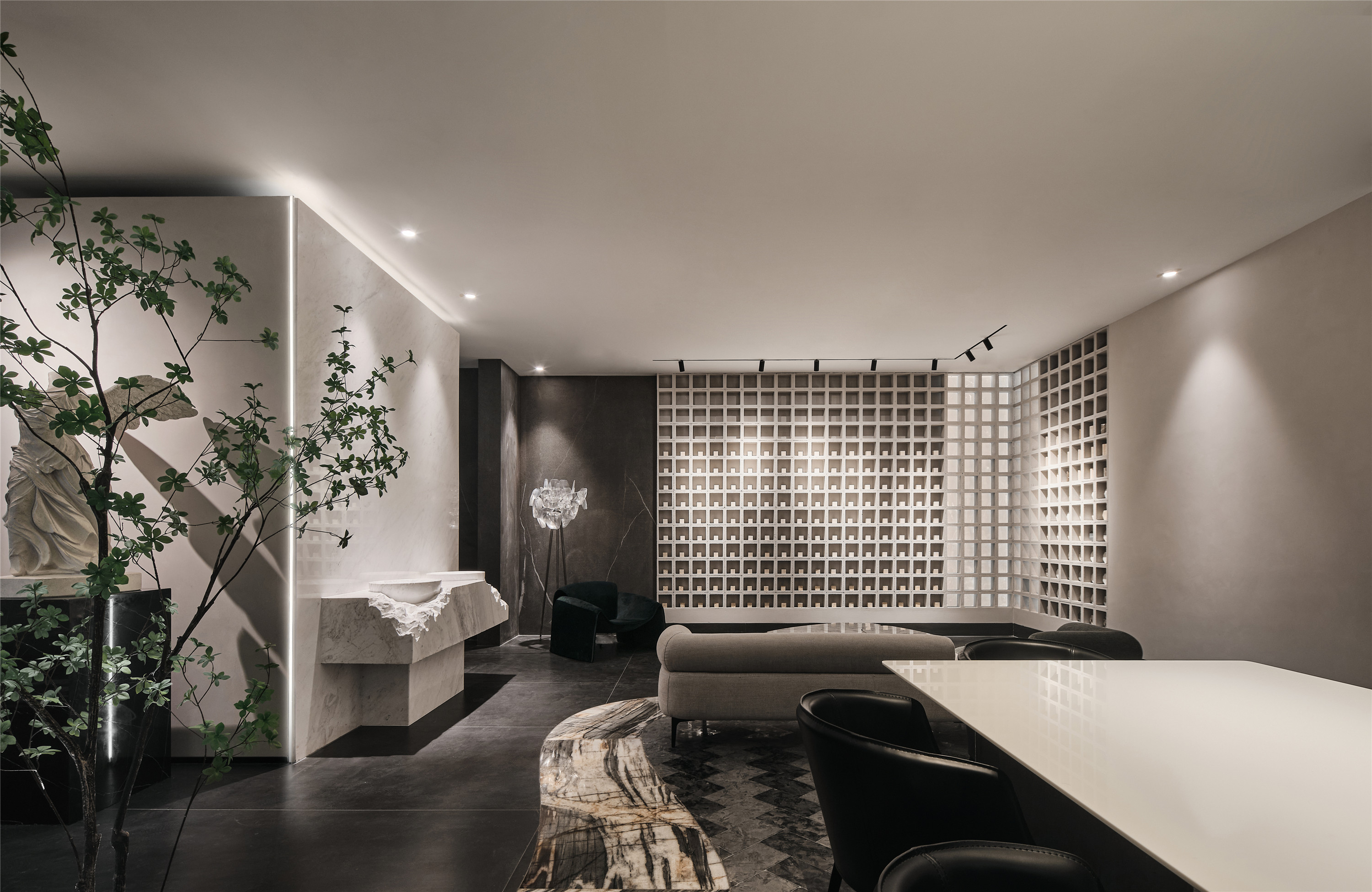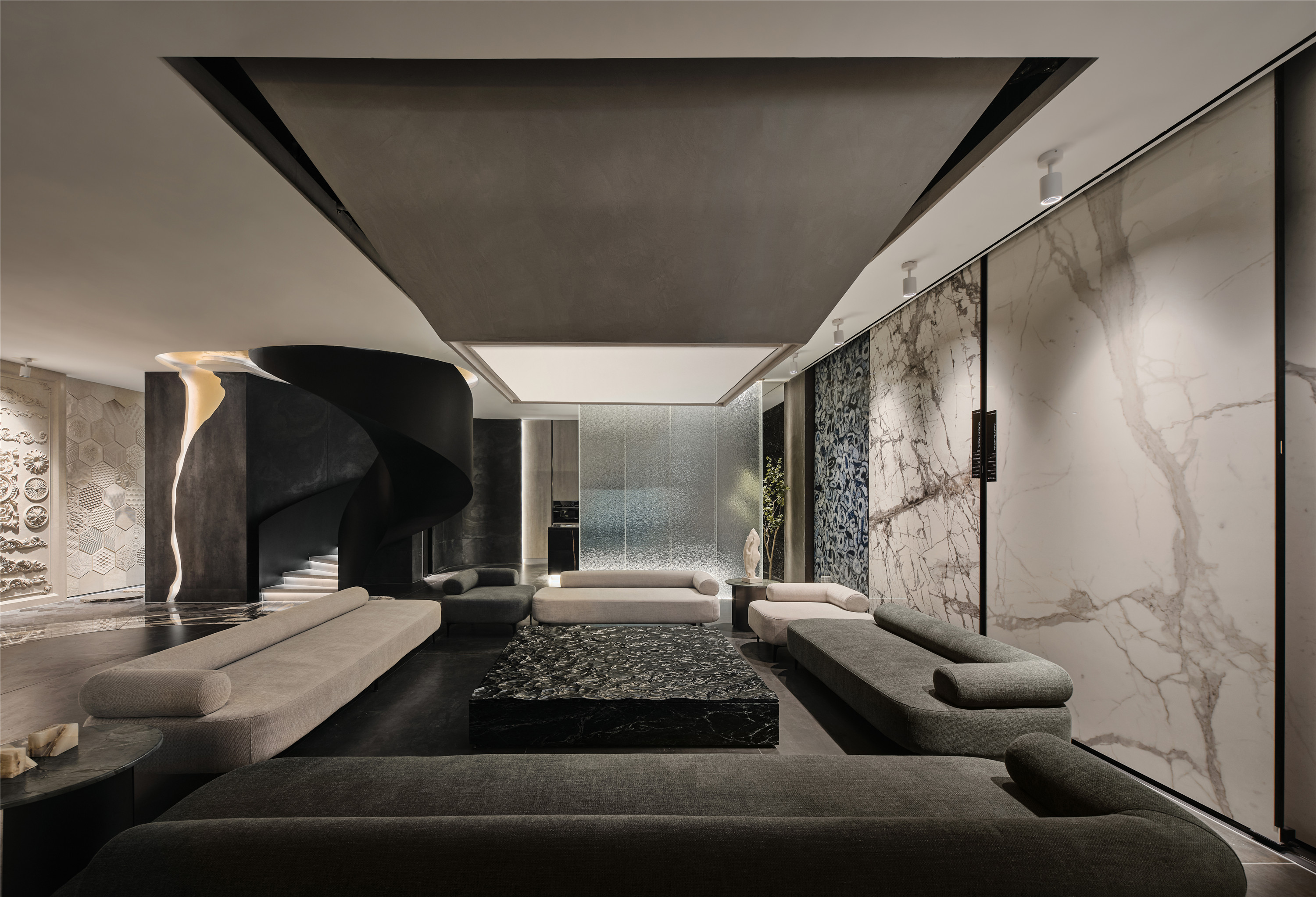 旋转楼梯前方是沙发区,为岩板的展板区域,同样肩负着沙龙集会学习培训的功能。