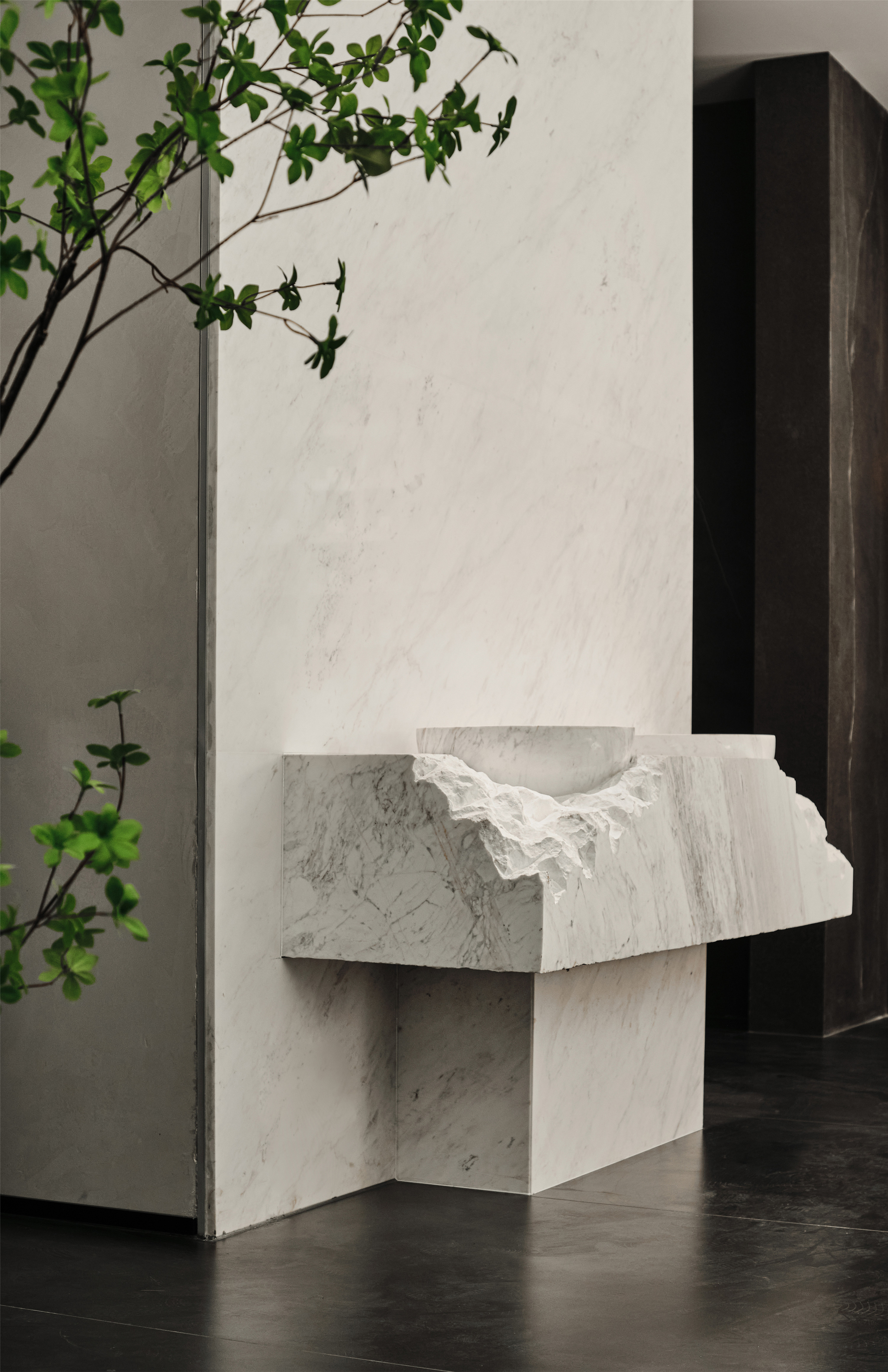 软化空间是我们需要解决的第二个问题,同样从两个方面入手。一是产品本身,莱姆石和荒料石材的运用让石材多了一点温度,还提供了更多的销售可能。二是运用大量的植物,与莱姆石和荒料石材相互映衬,发挥出软化空间的作用,贴近自然,趣味性也得到提升。 -