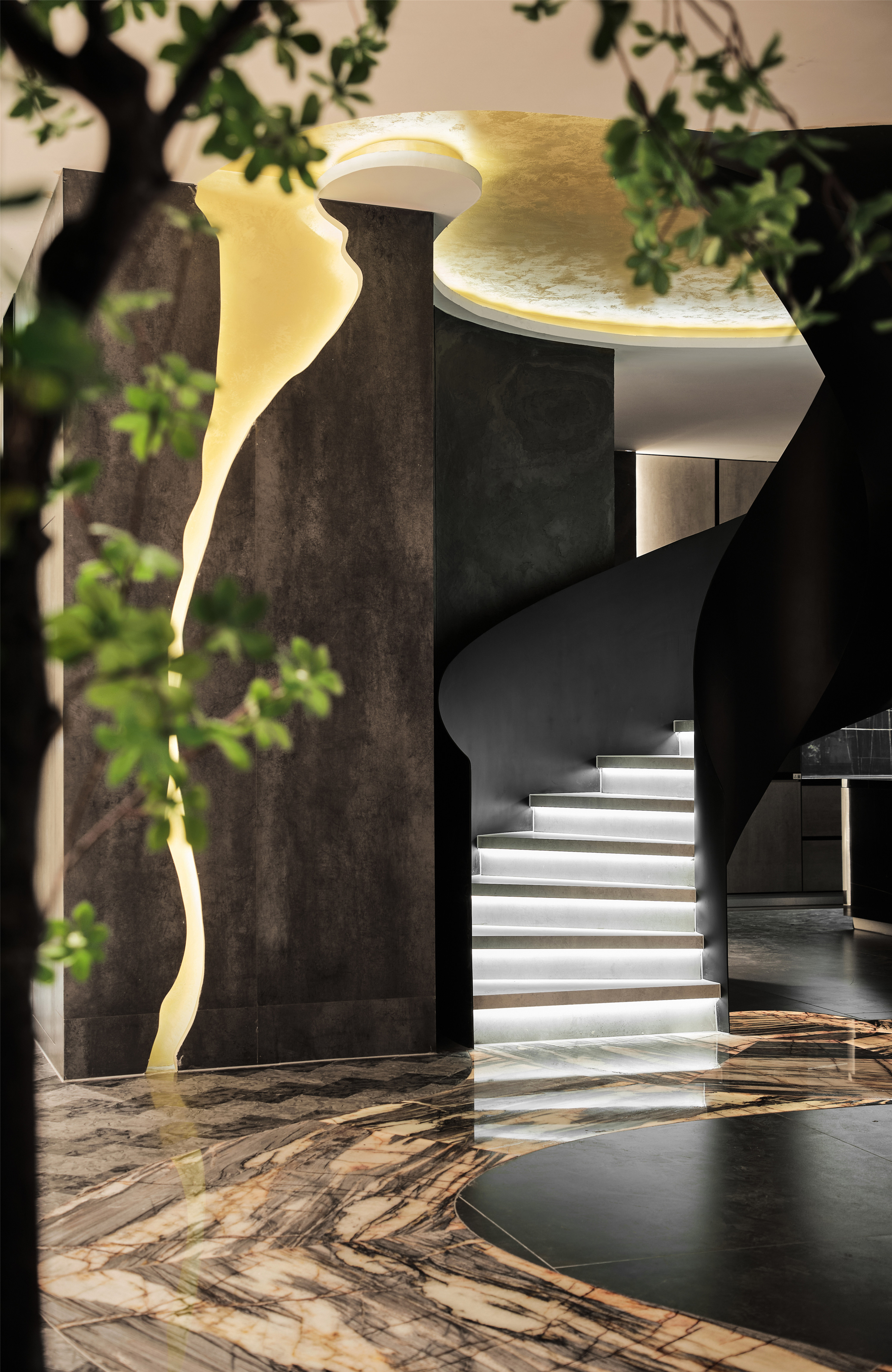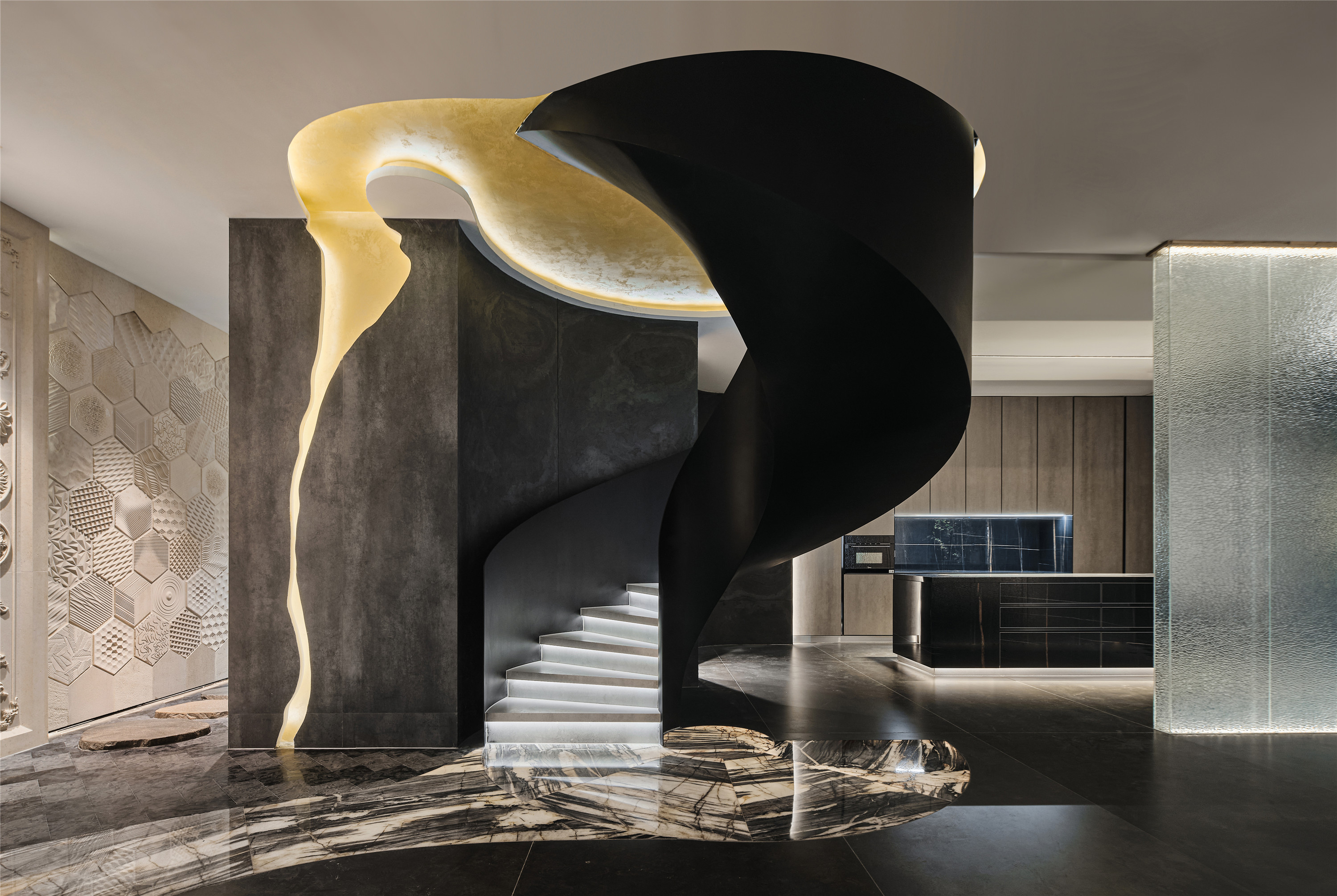 旋转楼梯后方是水吧区,不仅是岩板与功能产品的结合展示,同样是服务整个展厅的操作区域,还是一个高座的沟通交流区域。