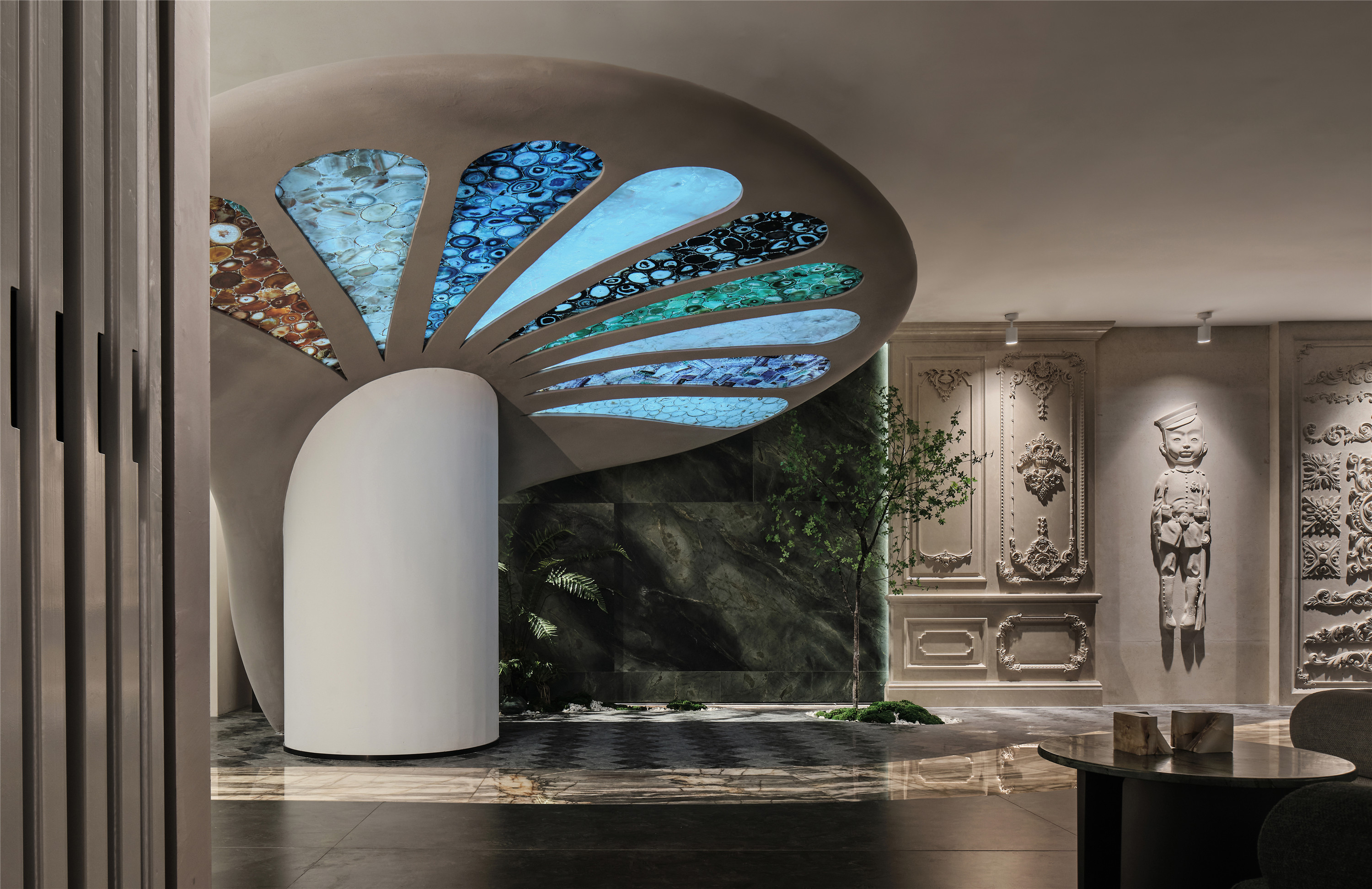 穿过沙发区来到扇形的宝石展示区。继续沿着地面发光河流的走向来到了石材展示区,石材展板区也是最具专业性的汇报区,整个石材展示区都被满墙艺术品般的产品小样包围。
