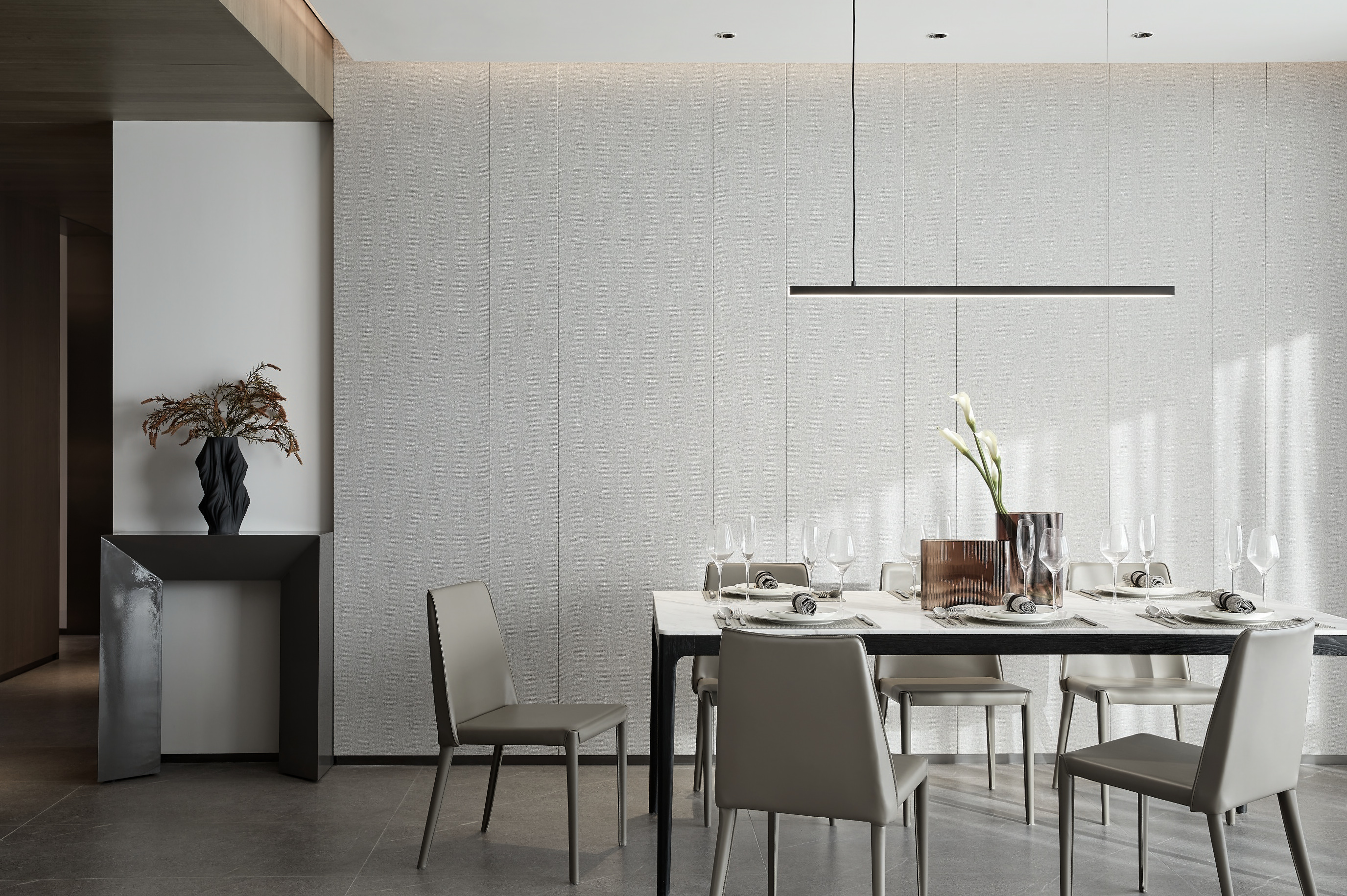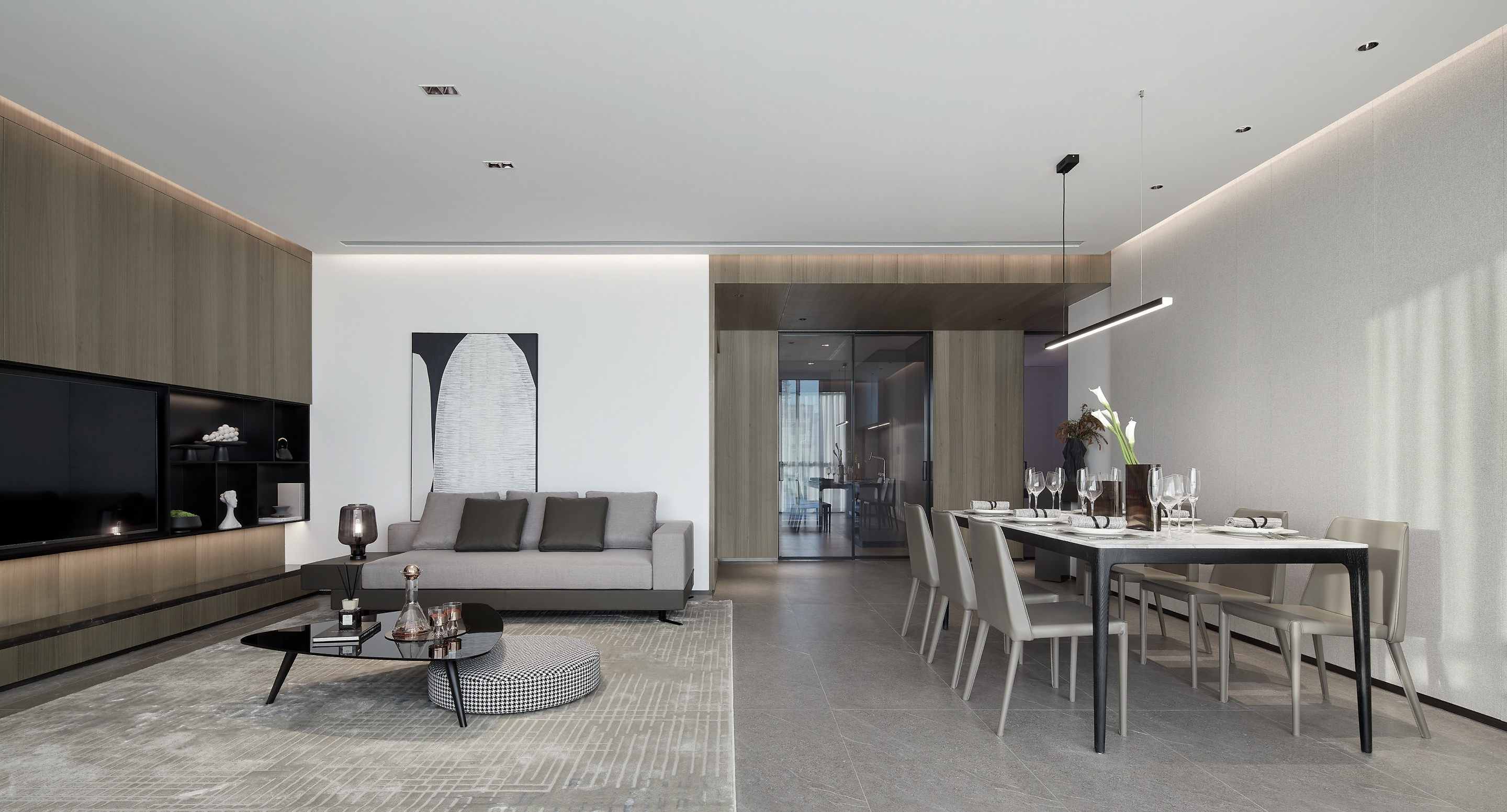 空间意境:客厅与餐厅相向而立,营造出空间之间的互动,简洁的色调和天然的材料,构成一种极简风格,并延伸为生活哲学本身;身在繁华,内心宁静。