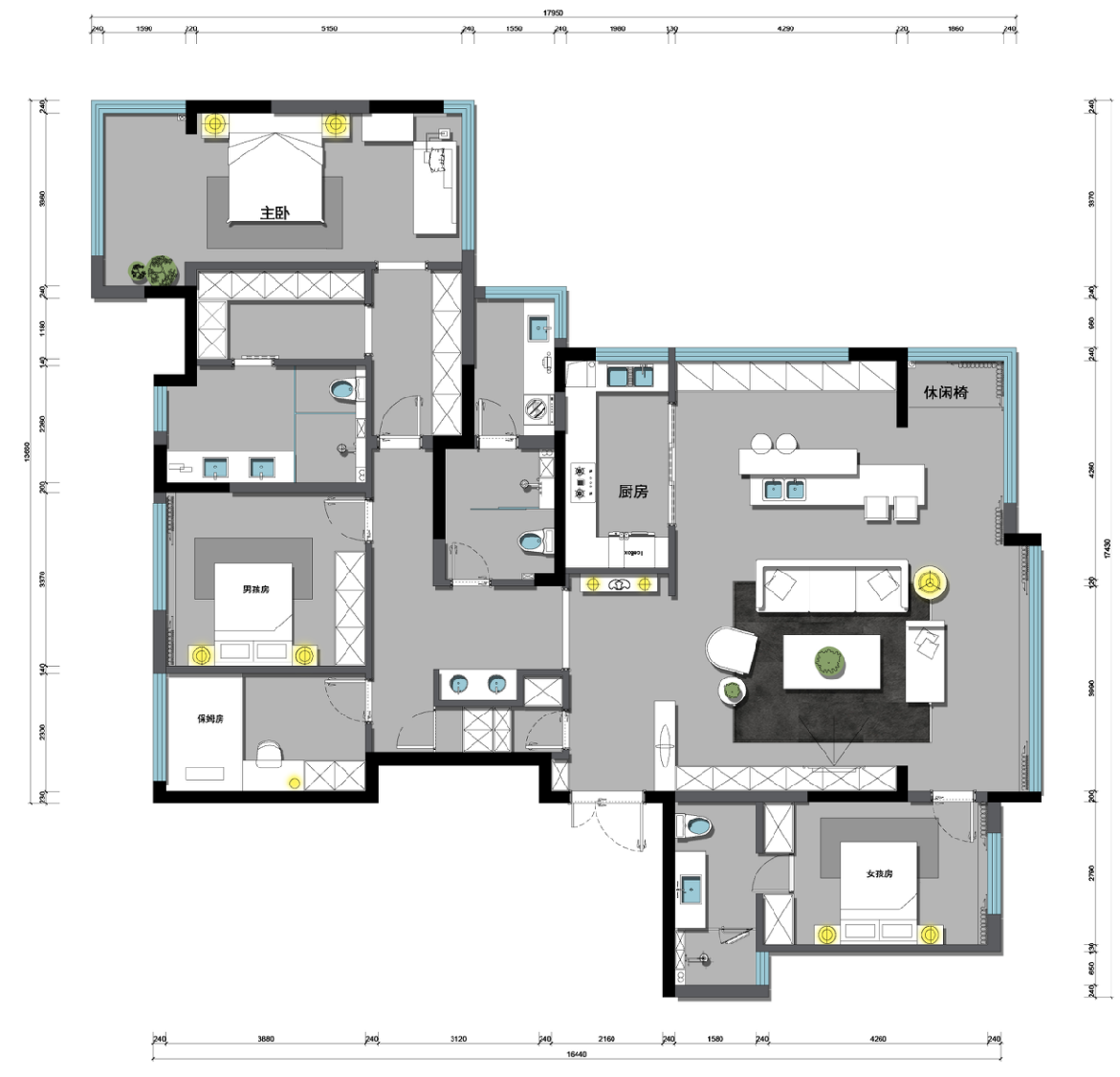 空间布局:整个项目是坐北朝南的,从这个点出发,并把大部分的光源全都散落在客厅中。