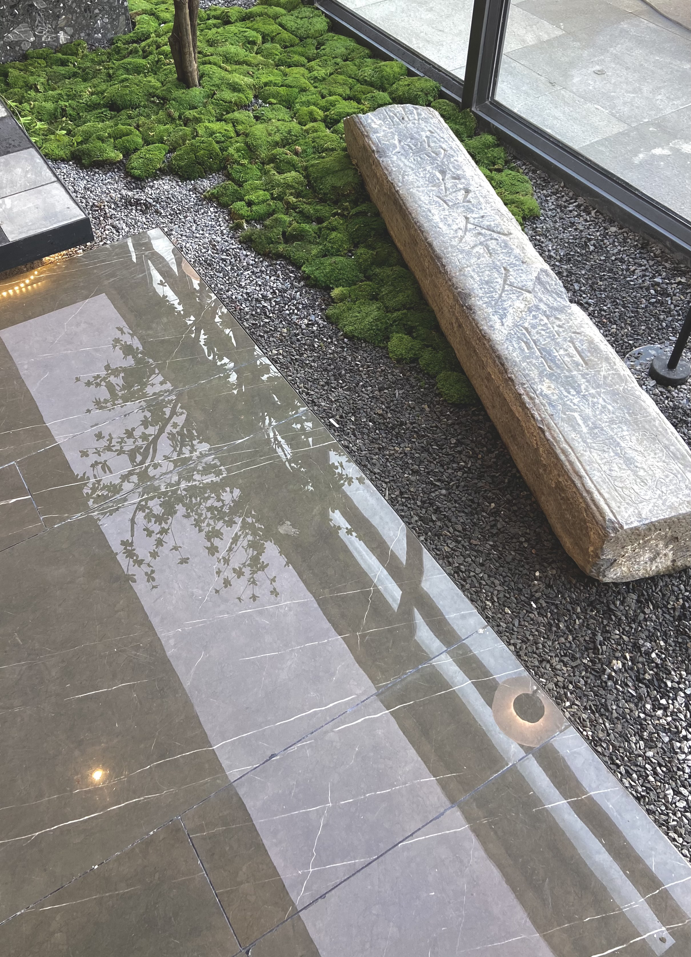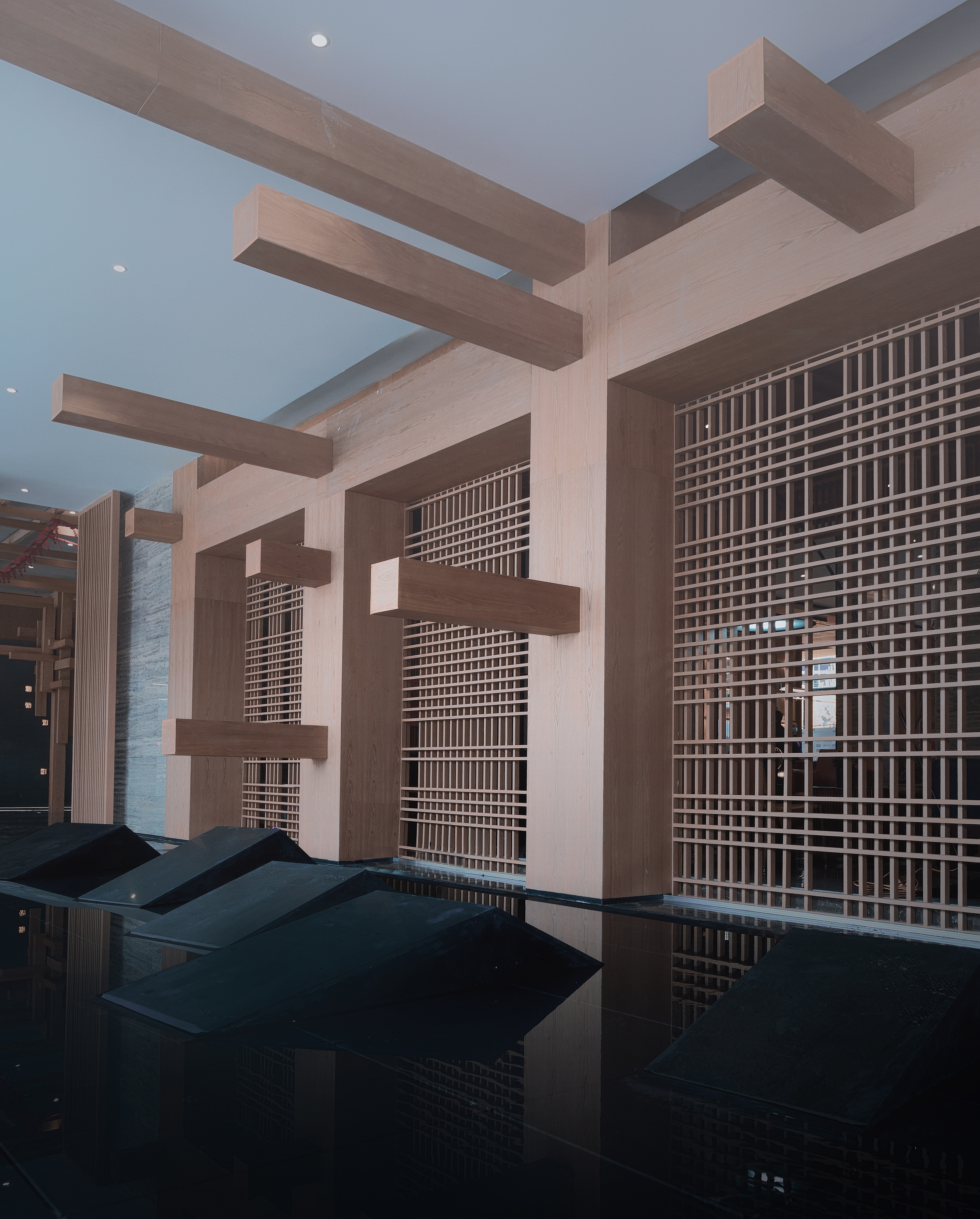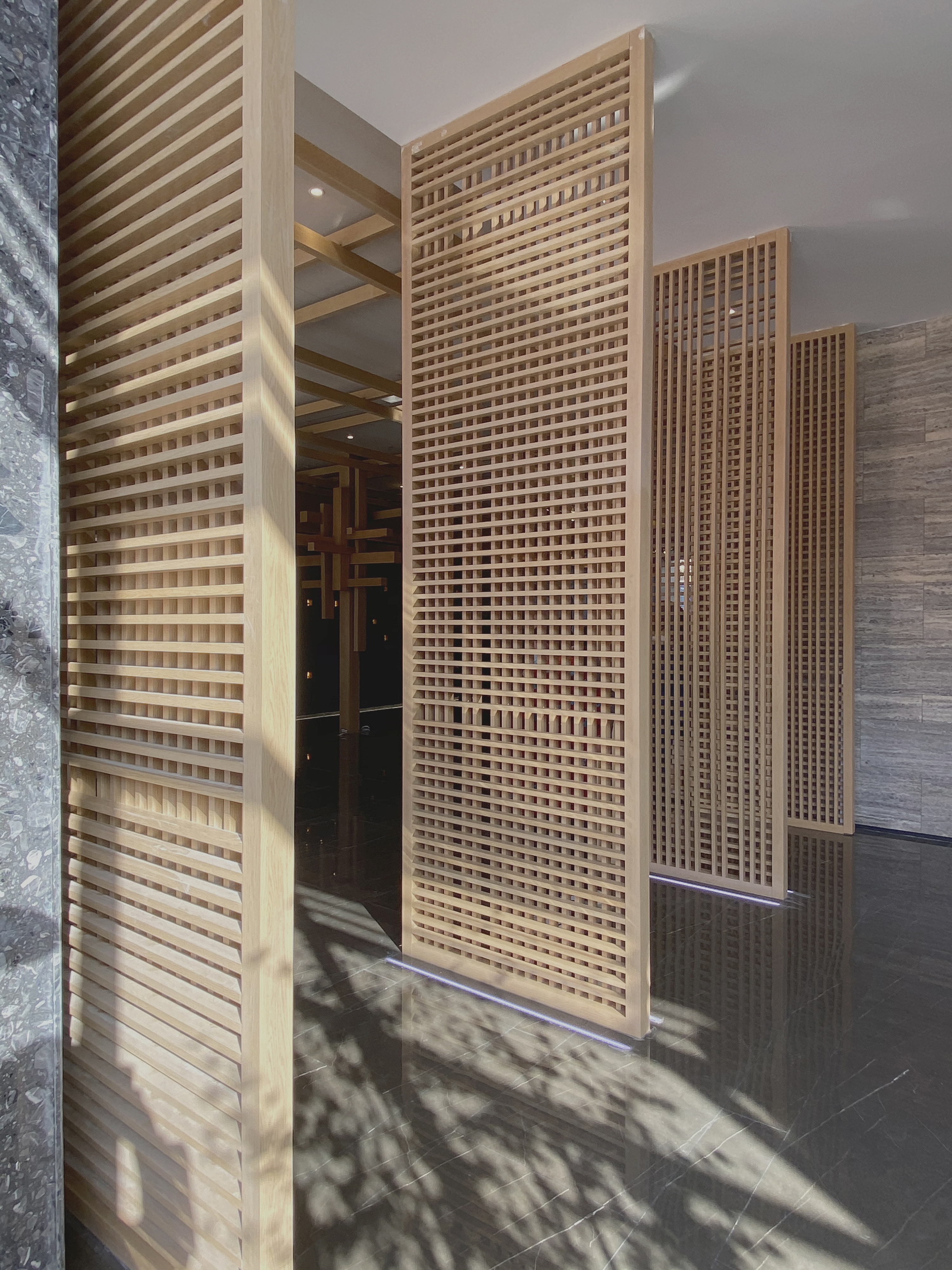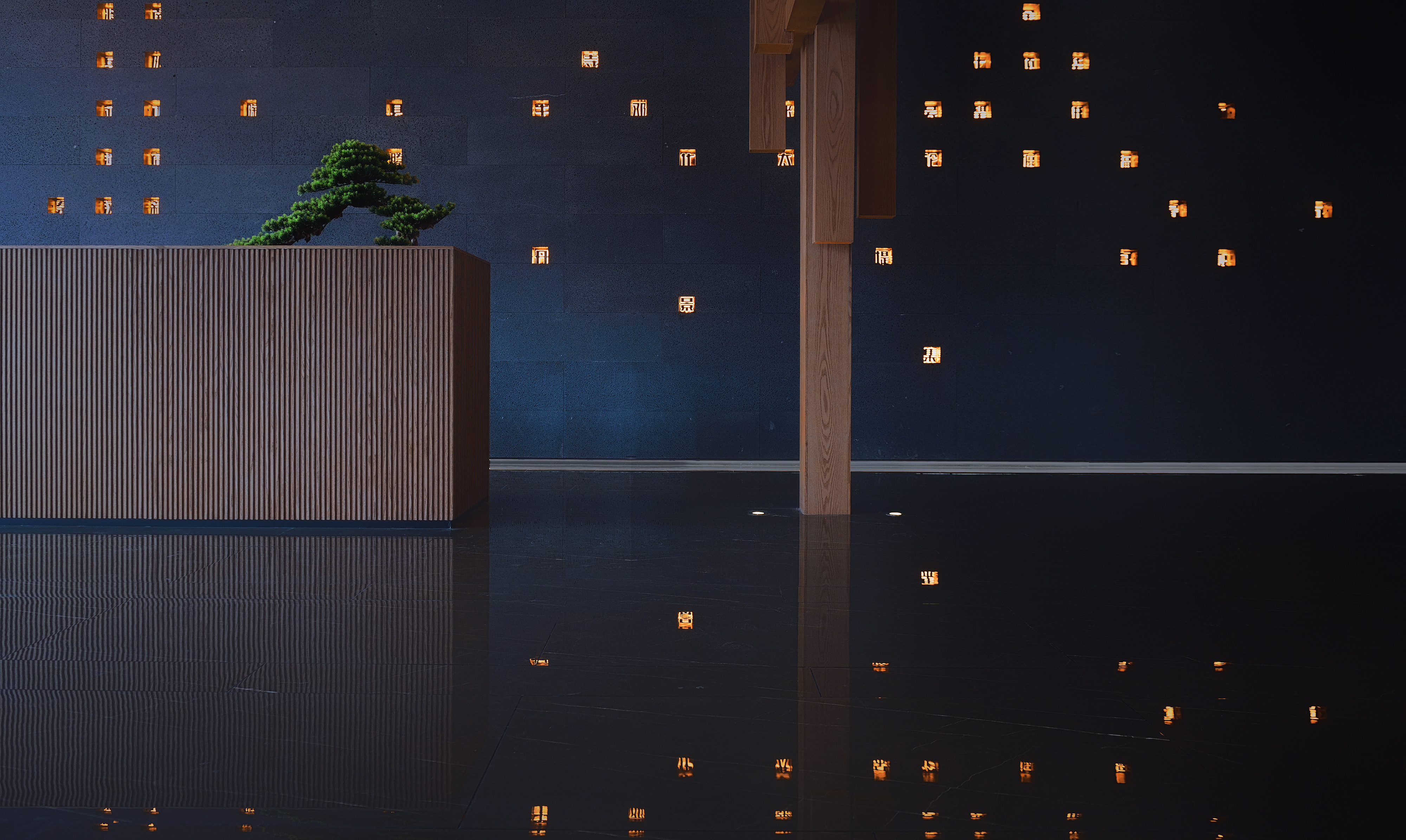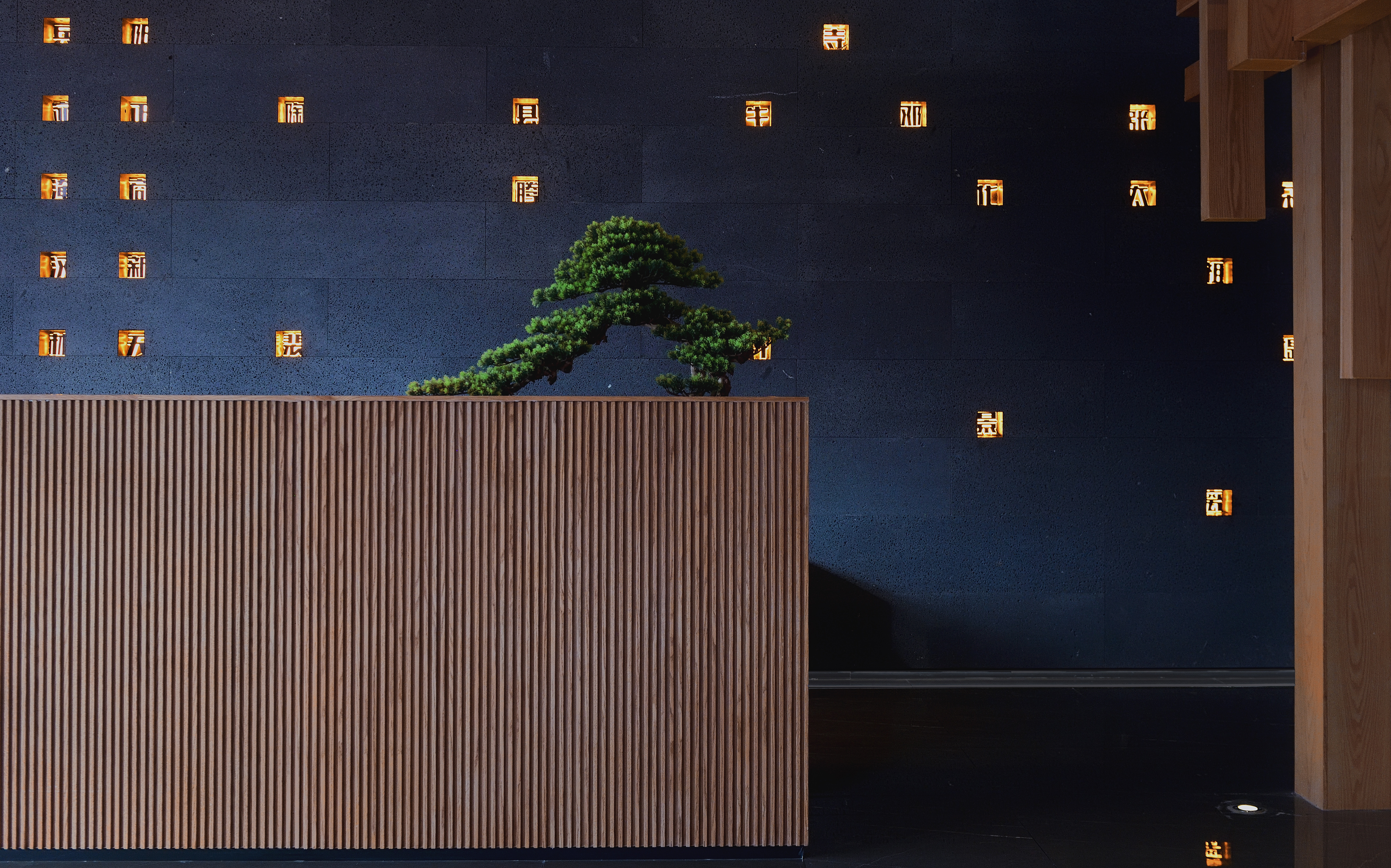 设计选材:黑洞石、方木、白漆、水墨石、金属板。