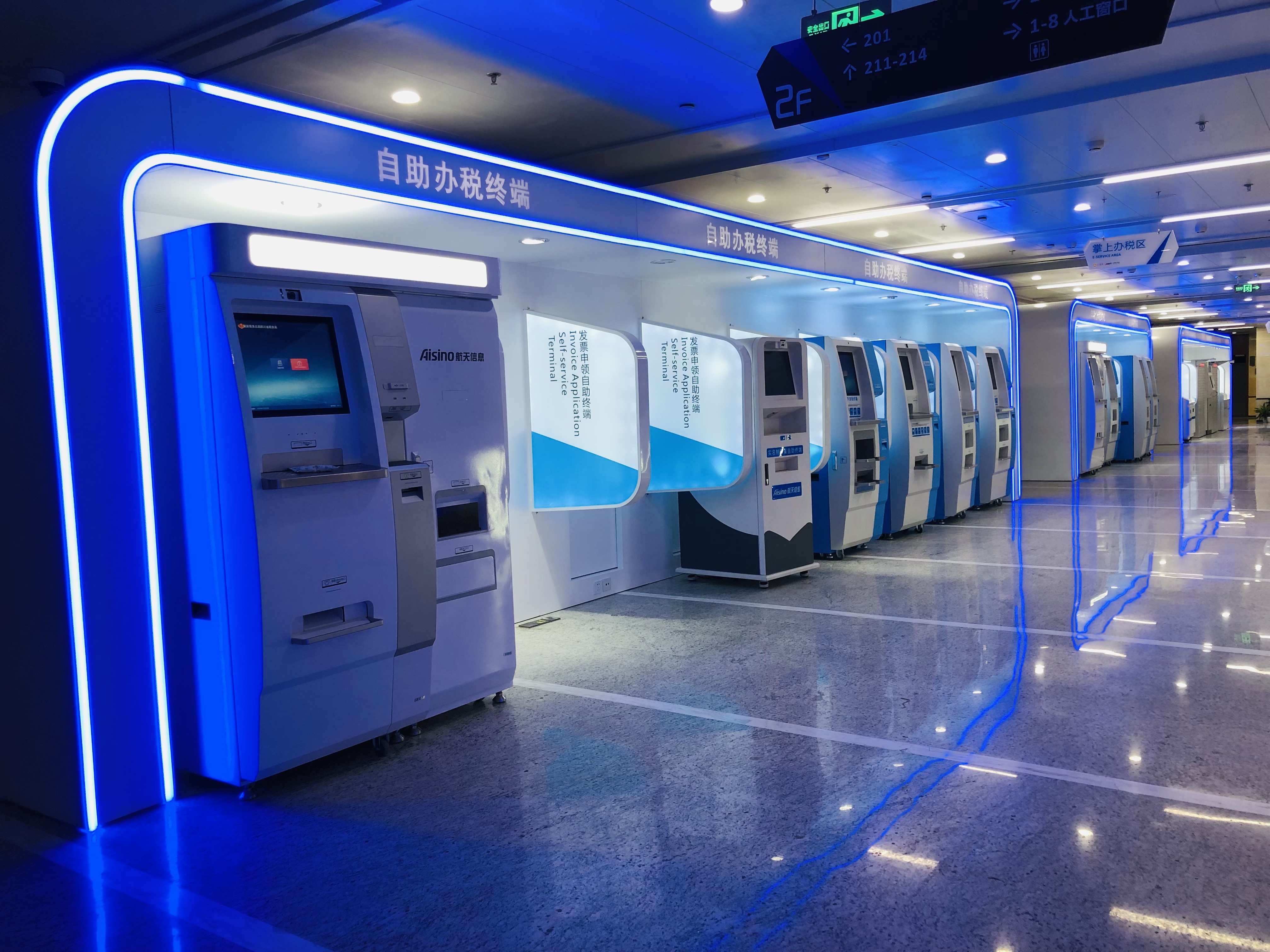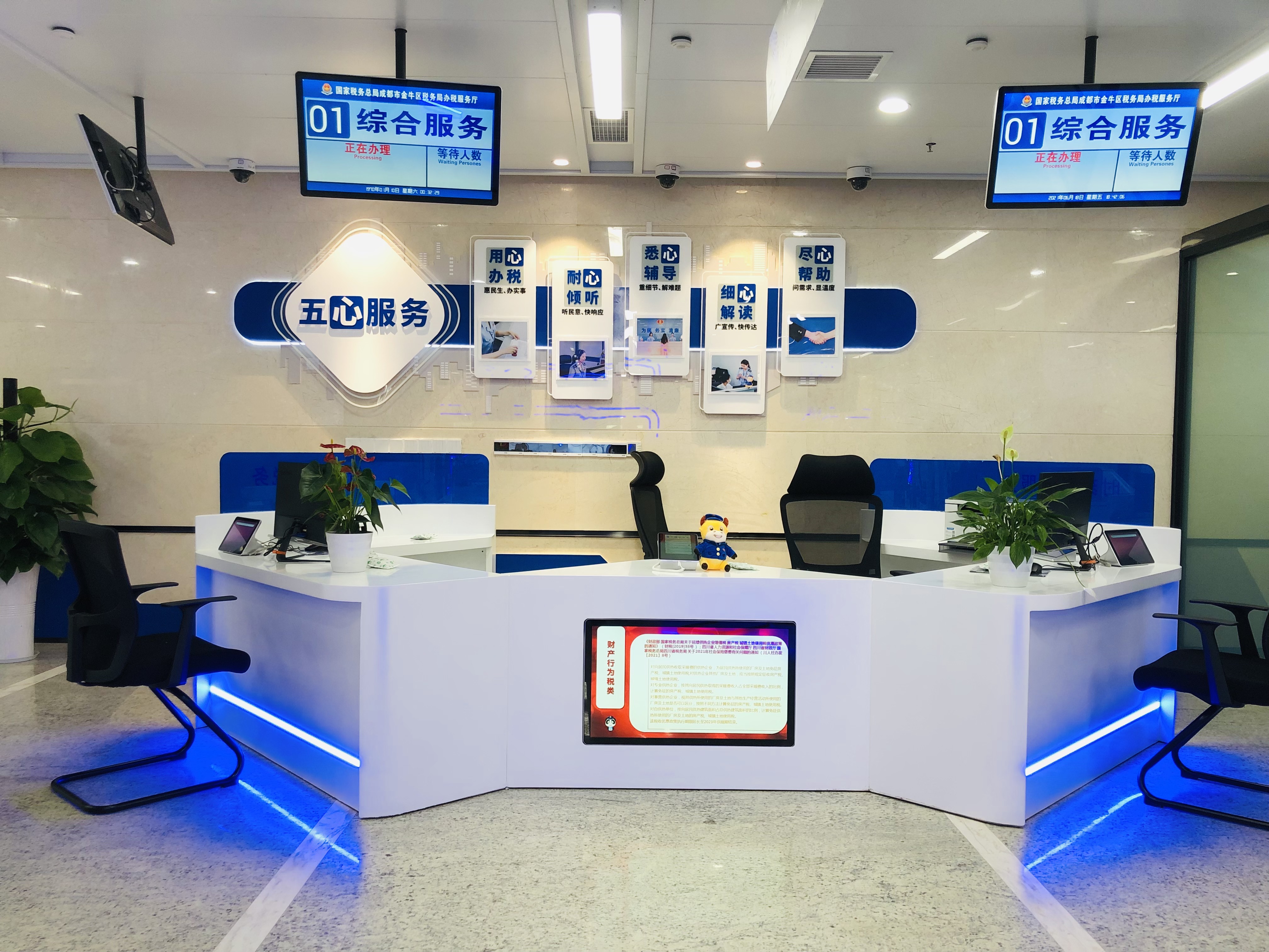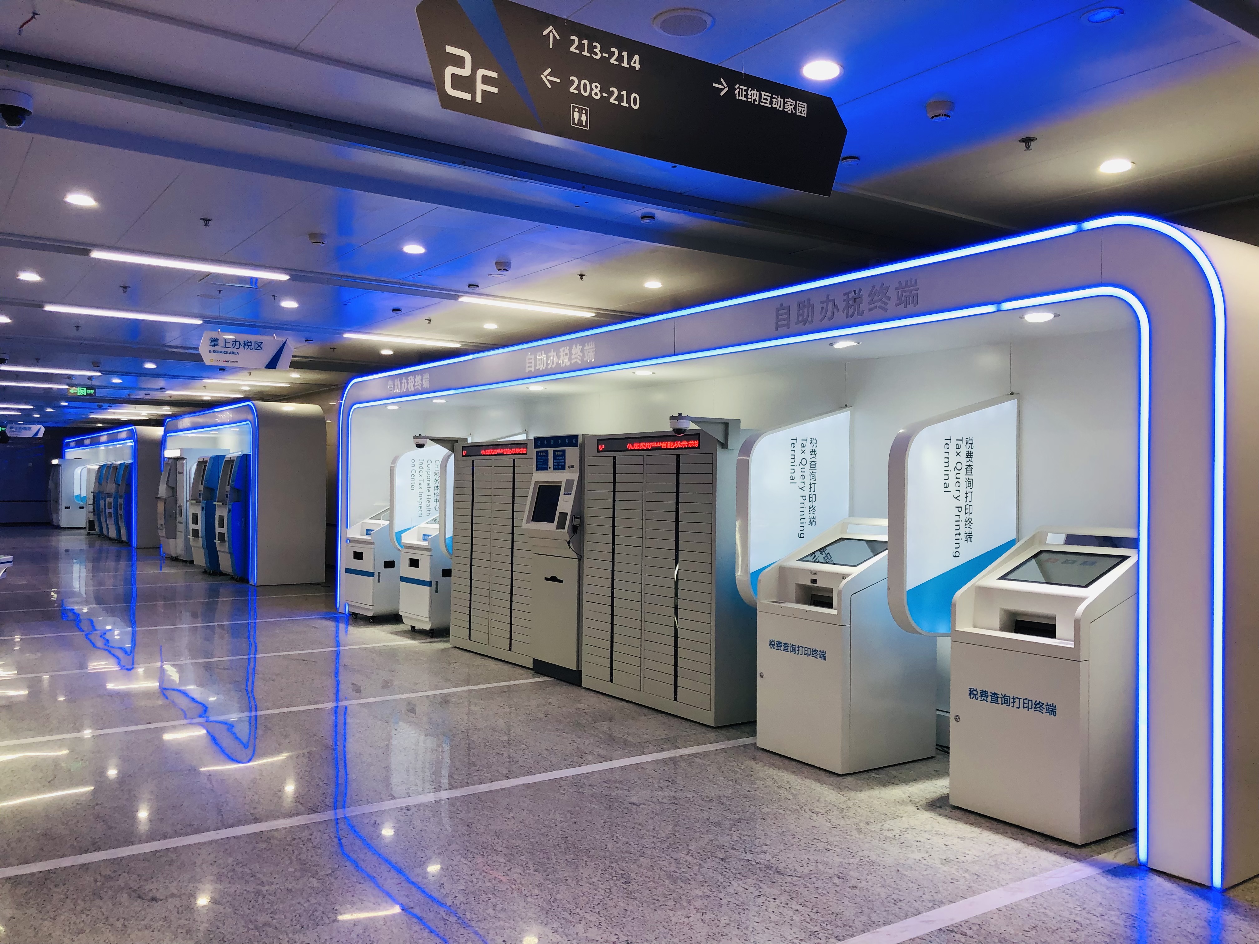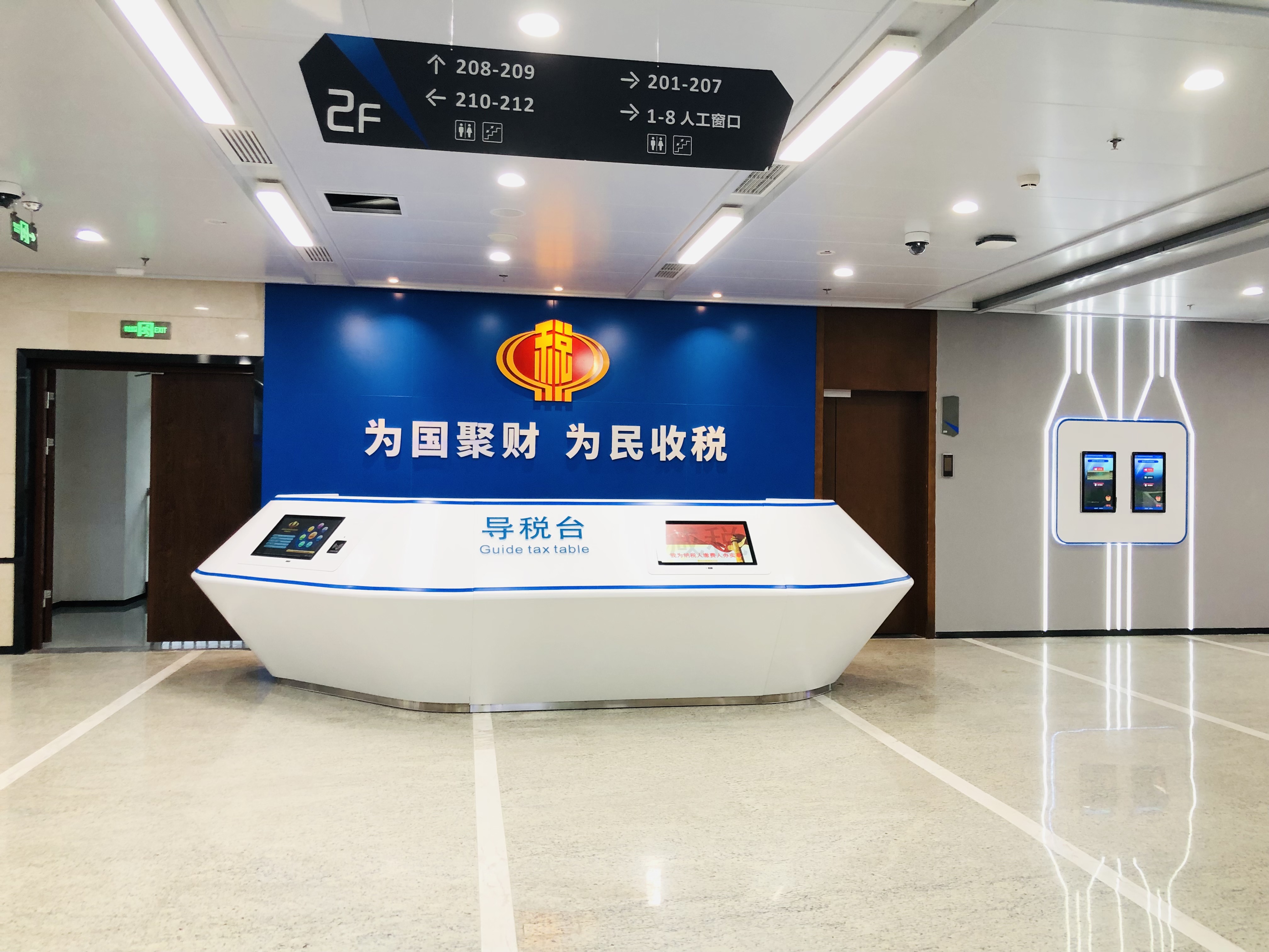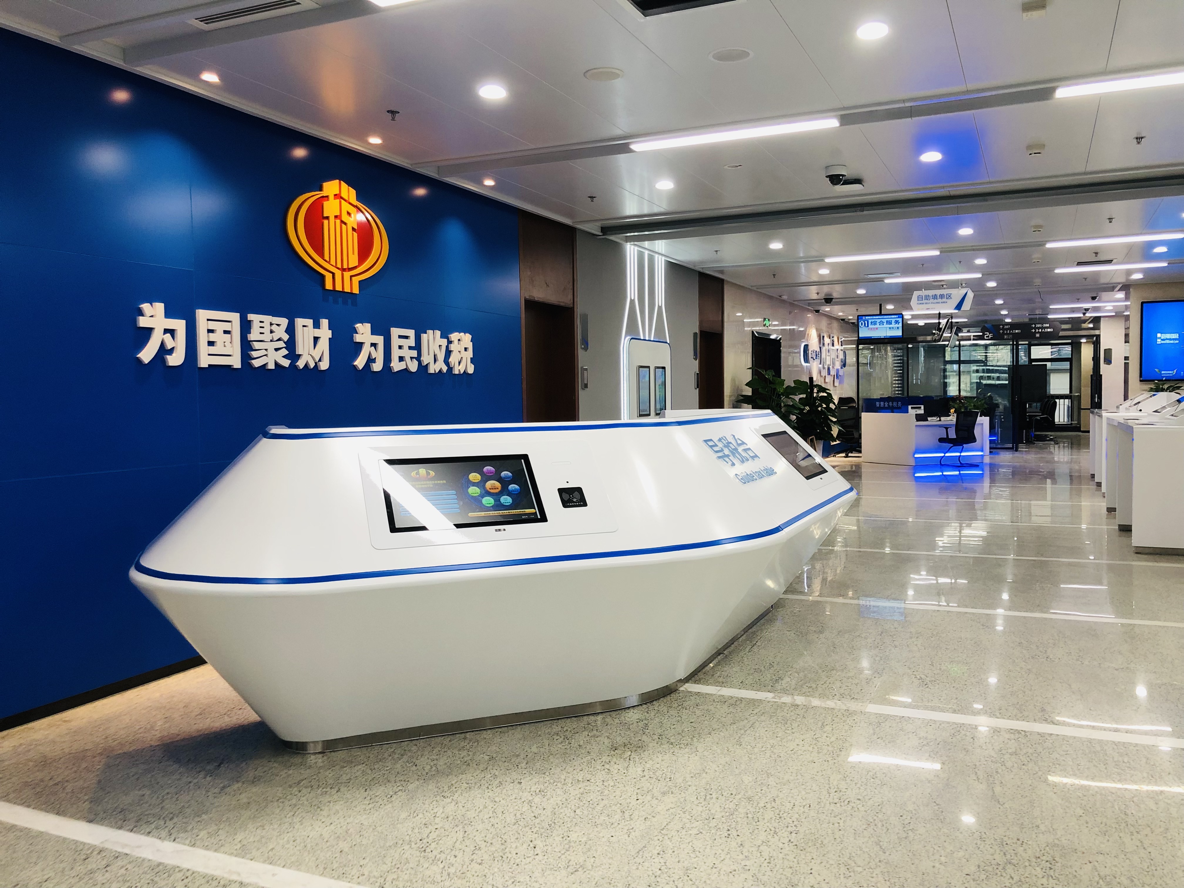 项目定位:整个空间量身定制,融合多种文化建设,导视设计,各方设备配合等,为新时代的无接触税务大厅树立一个标杆
