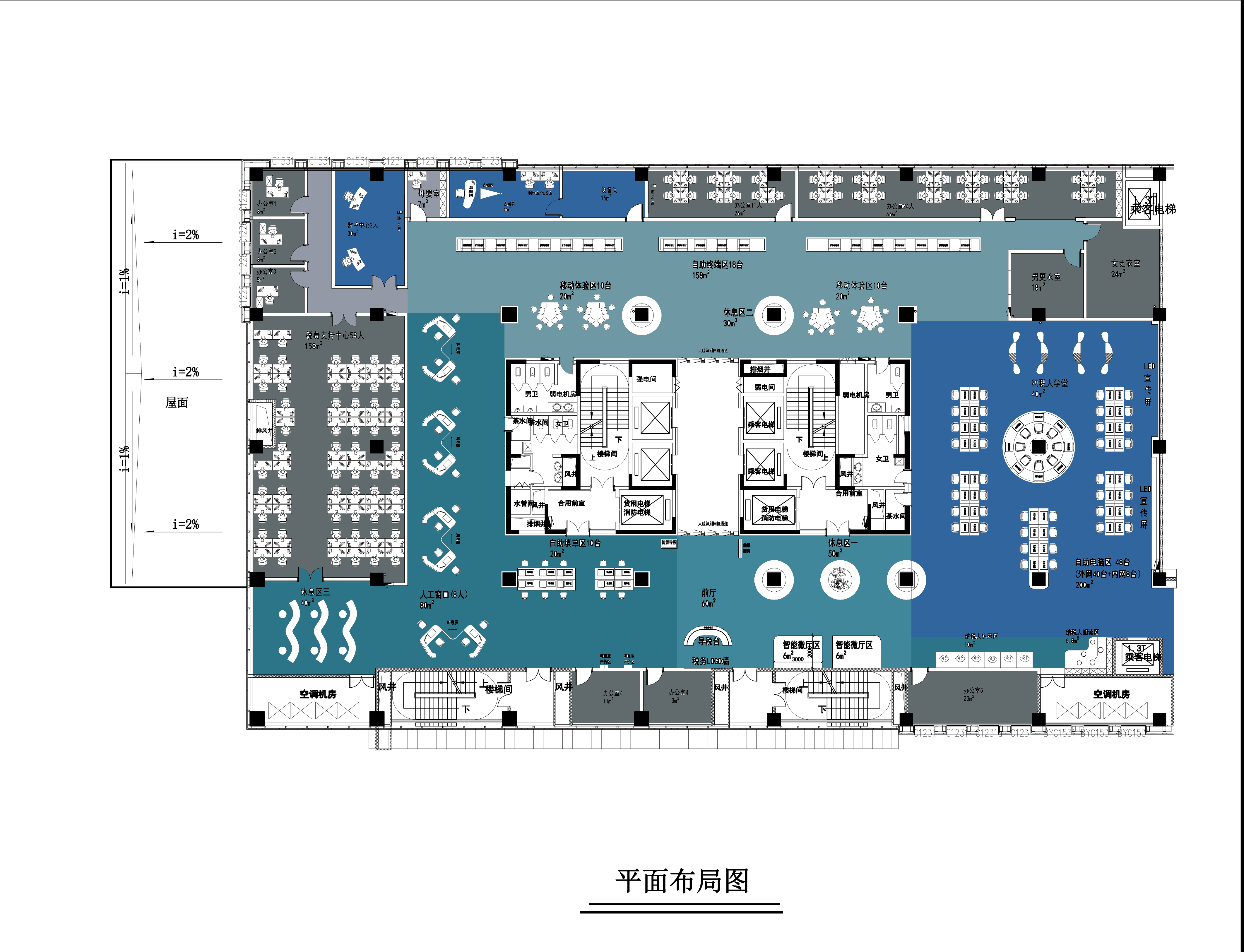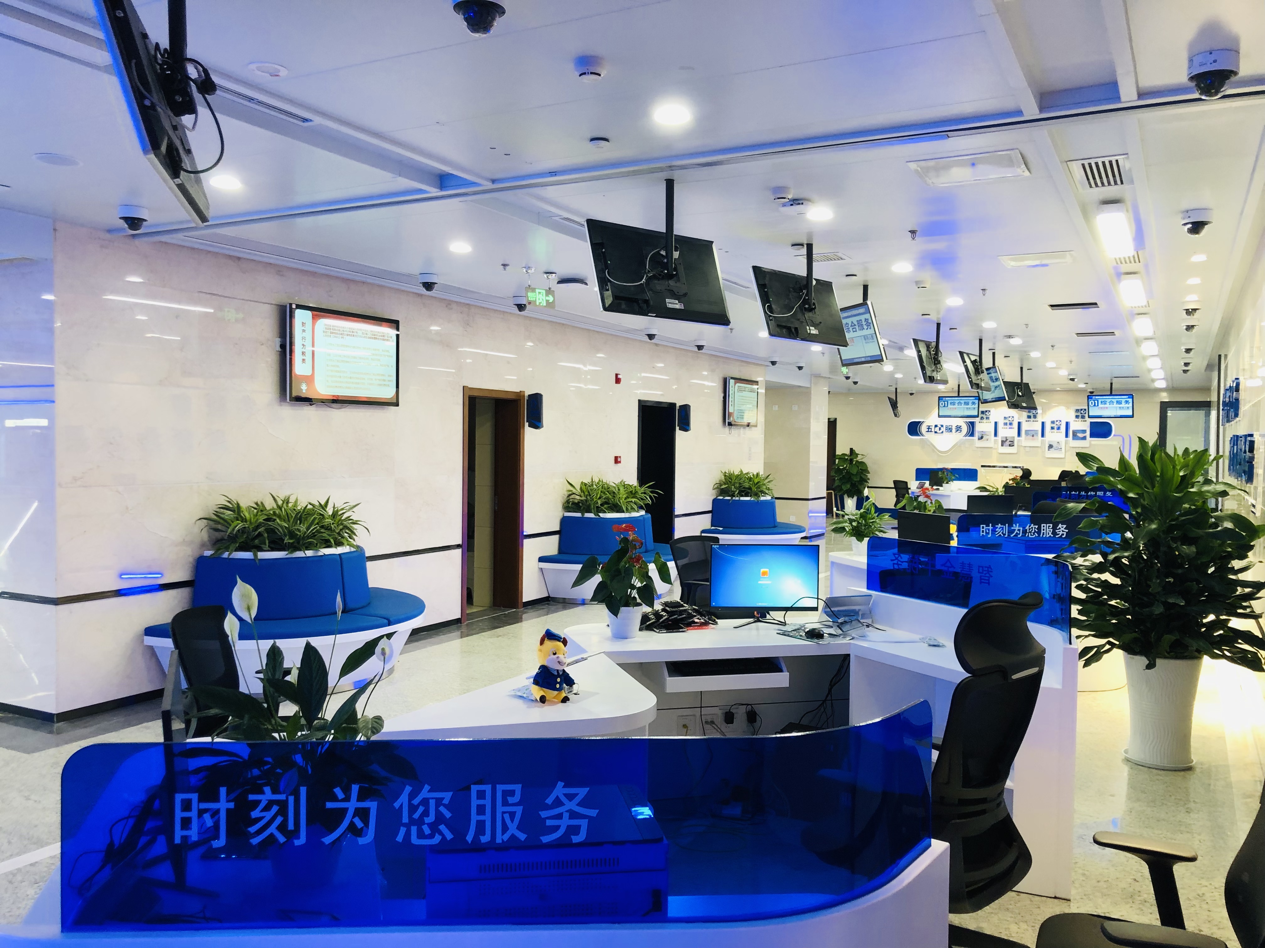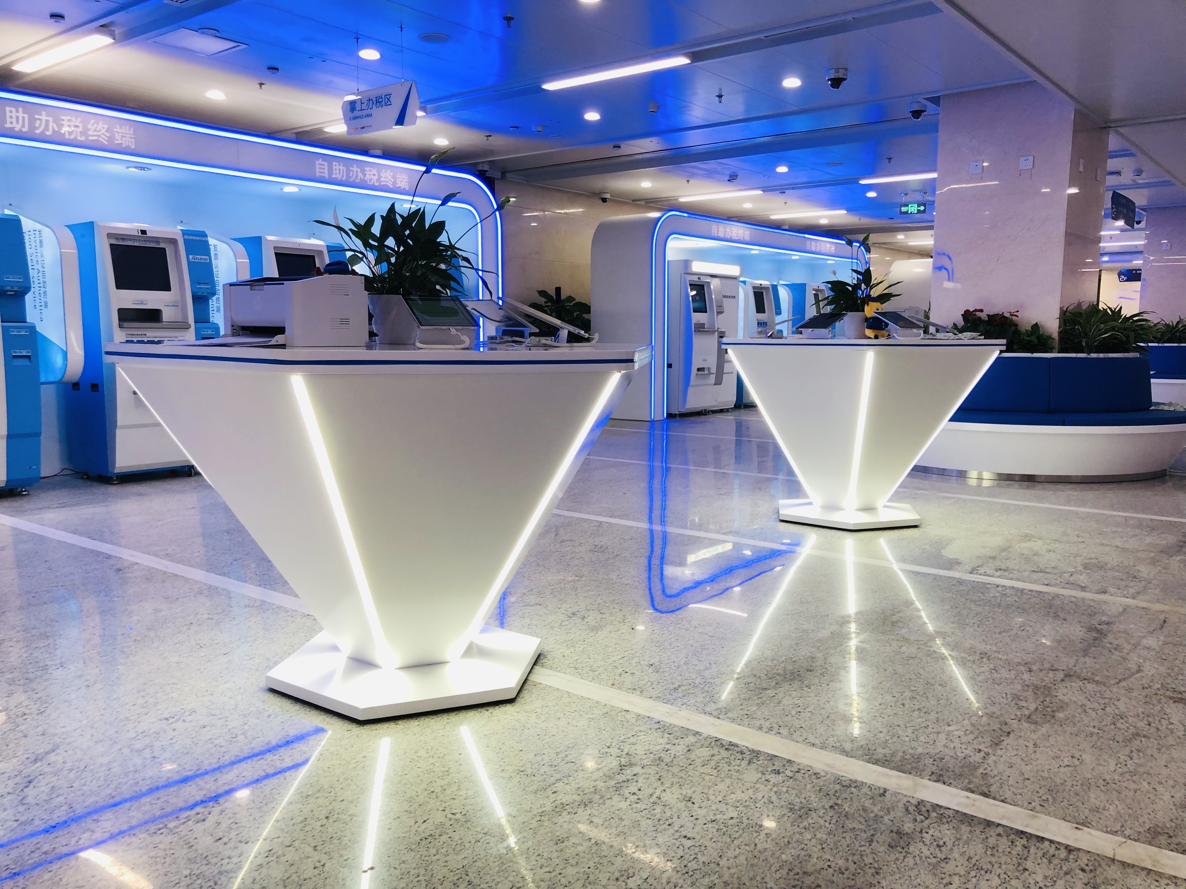 空间意境:突破原有传统柜台式业务办理,达到无接触自助办理,以人工办理为辅,自助办理为主的新模式。