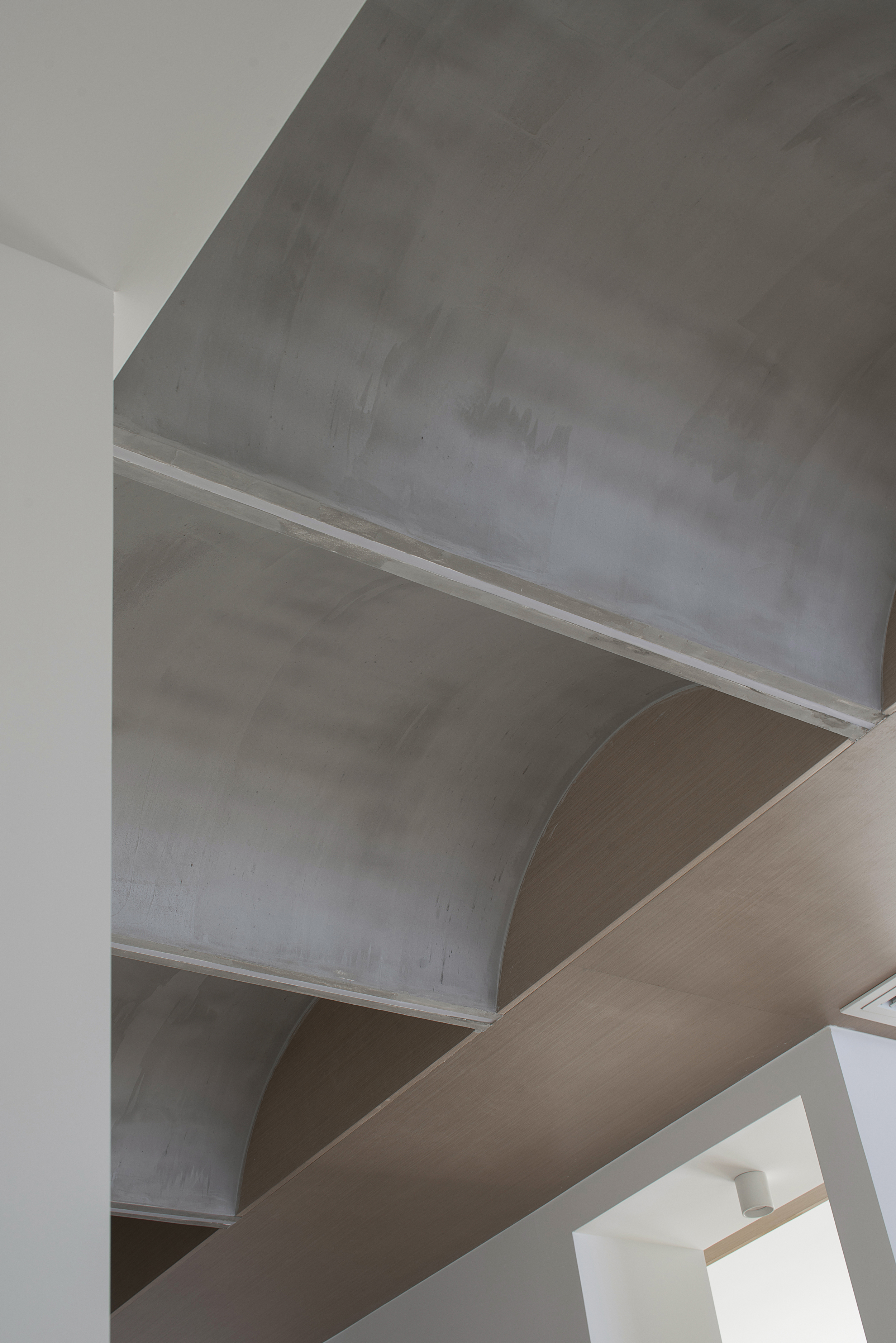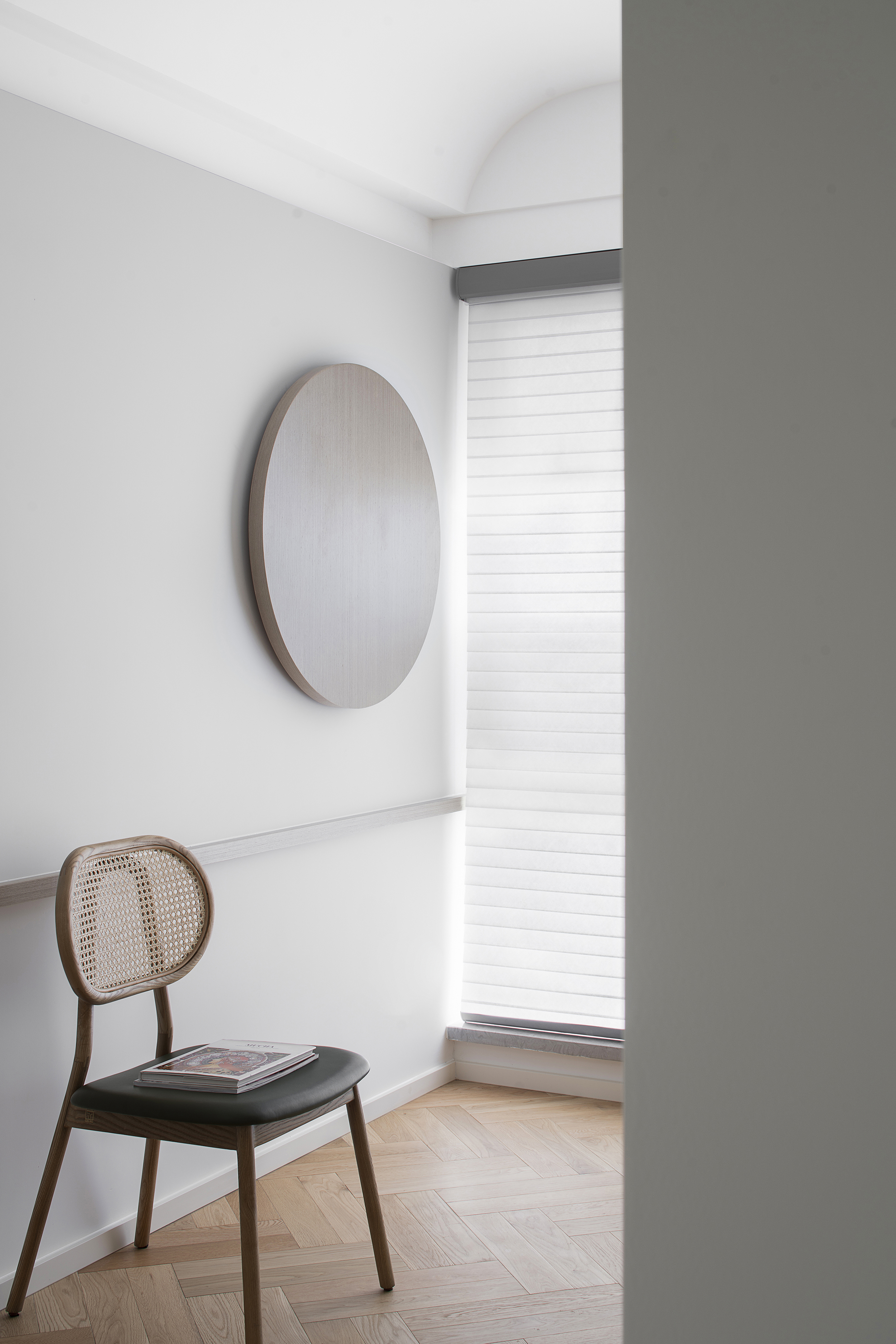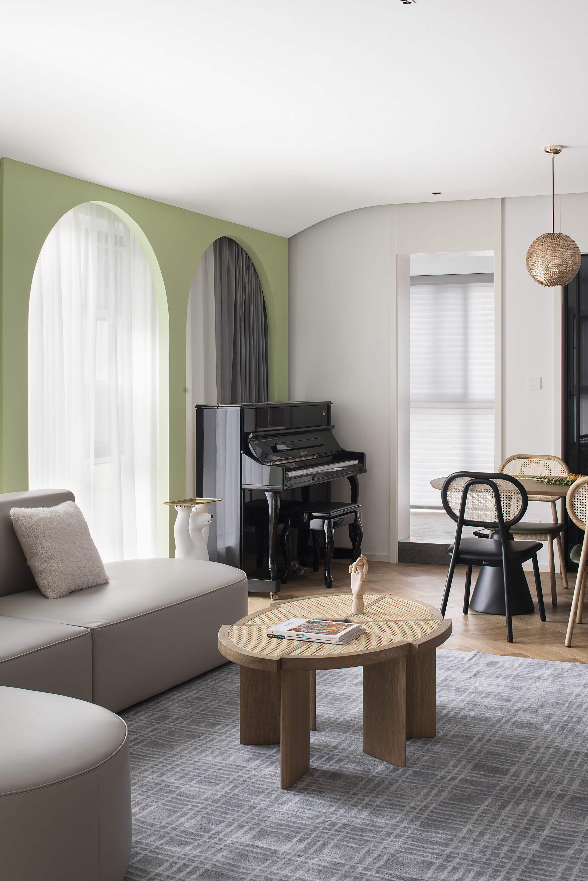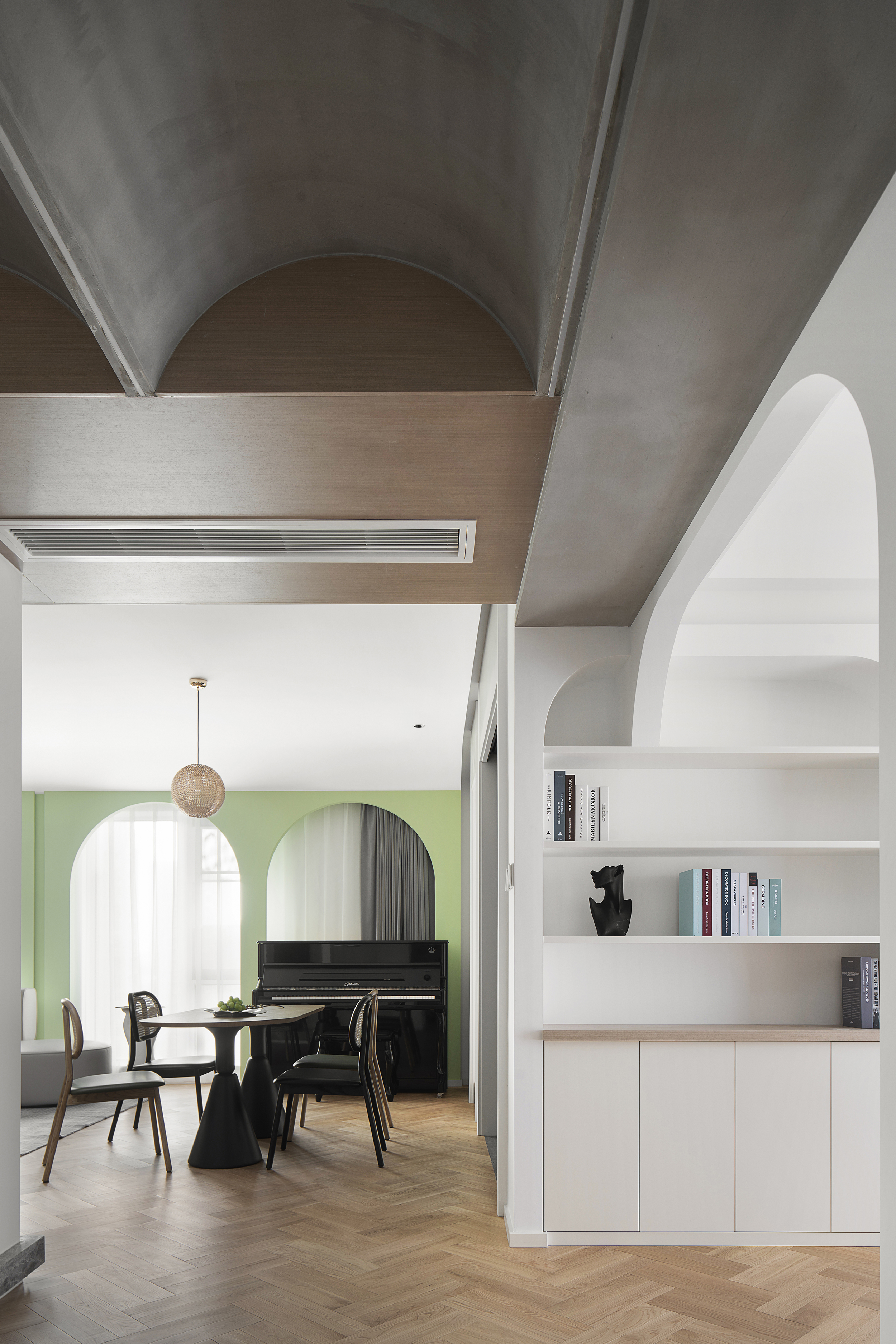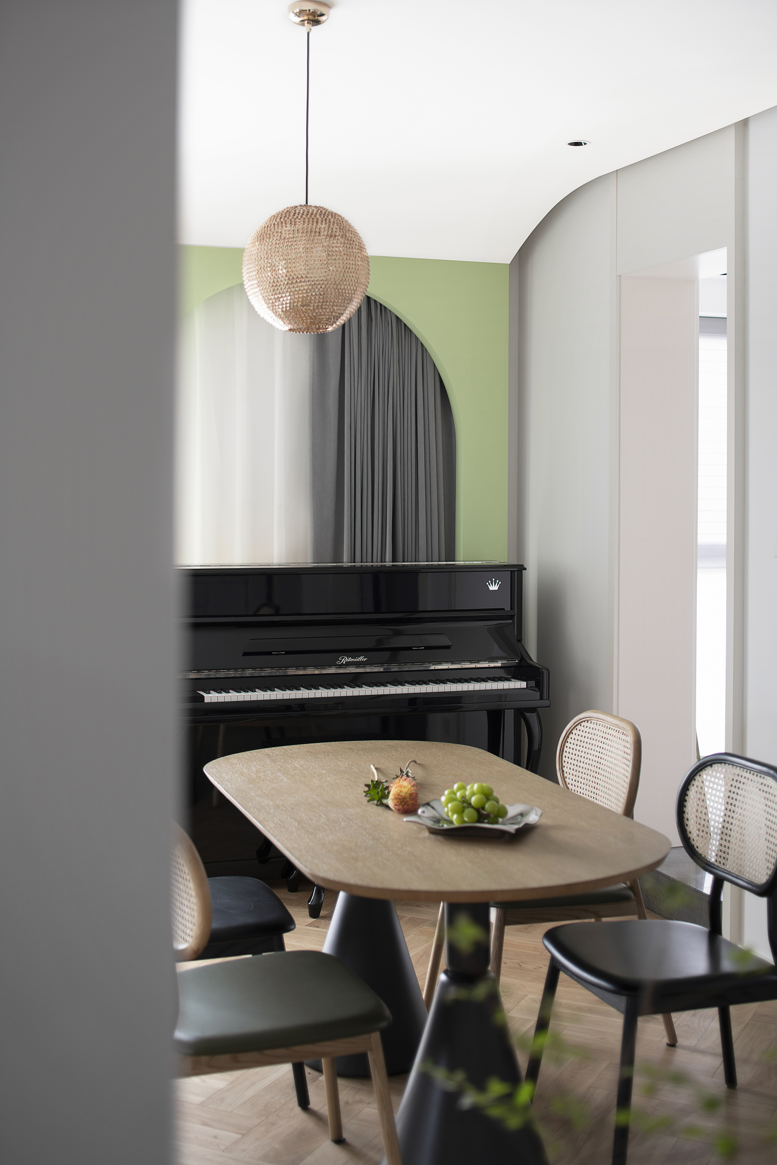 餐厅旁是女主人的钢琴区域,拱形洞在这里也成了钢琴的仪式感的建筑结构体。在这里,伴随着音乐,开启着新的生活,是美好并带着期盼的。