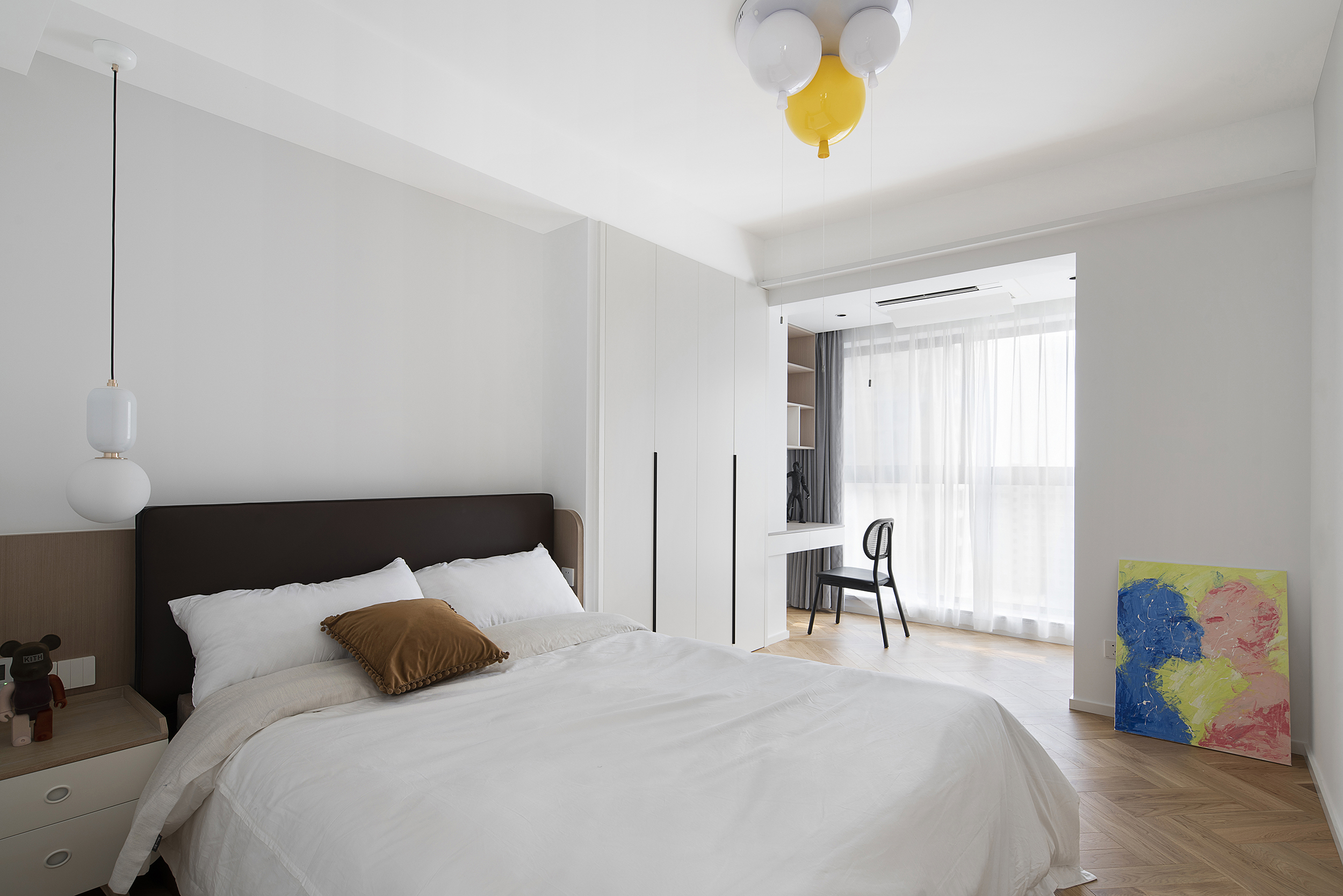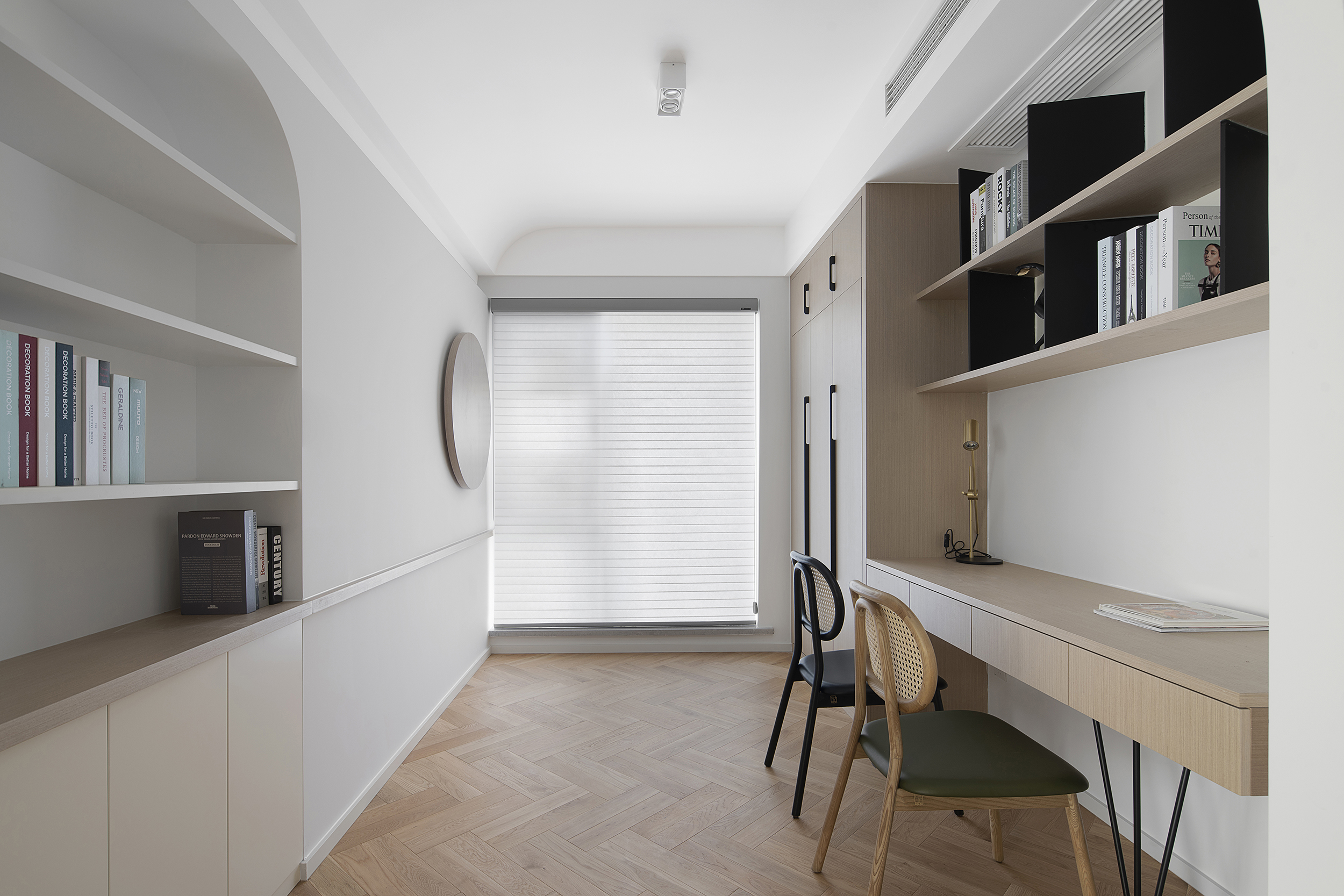 多功能房是书房跟客房的结合,床是下翻床的形式,有人来睡可以翻下柜子做床,平时空间就打开着可以给常住的人使用。