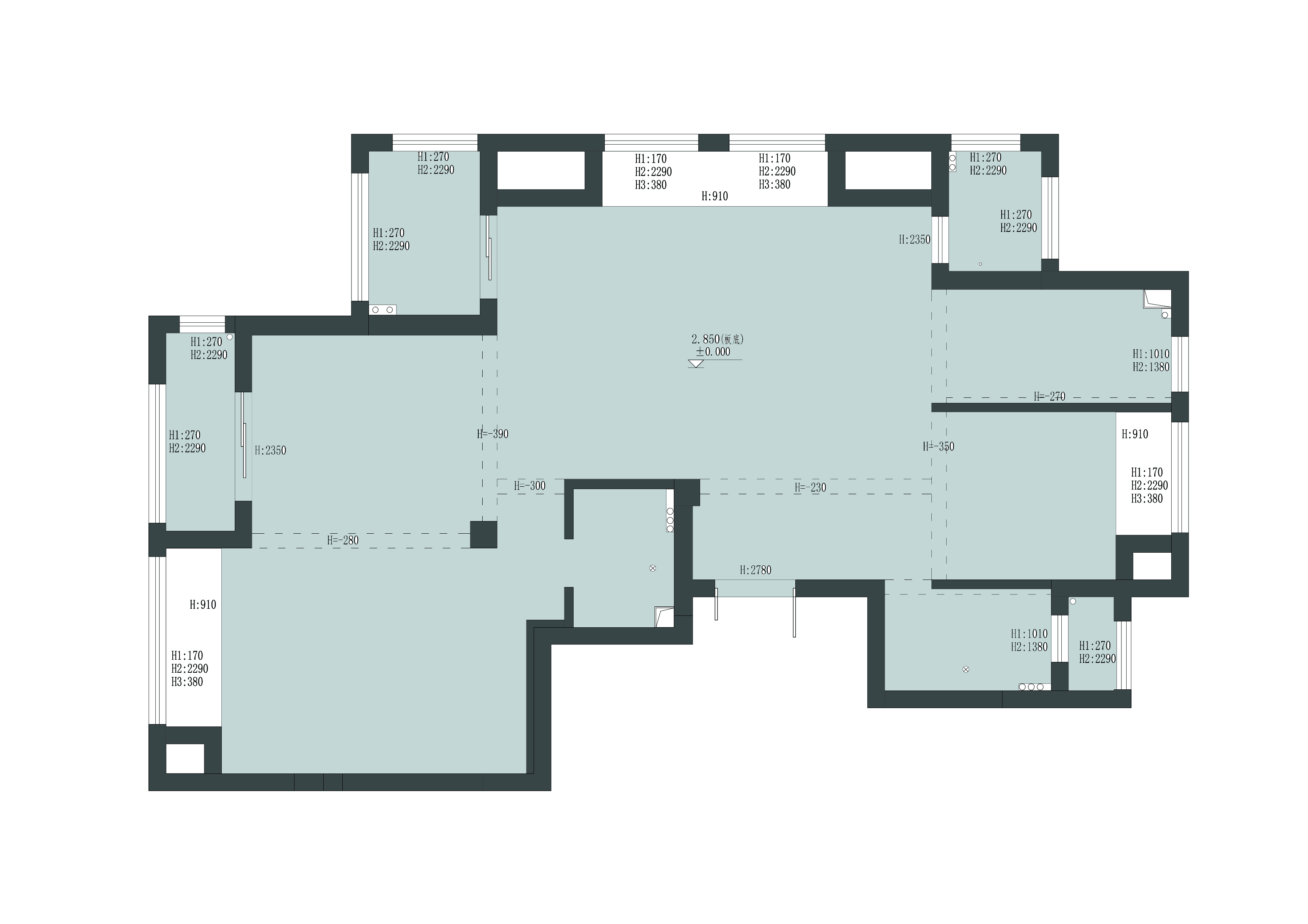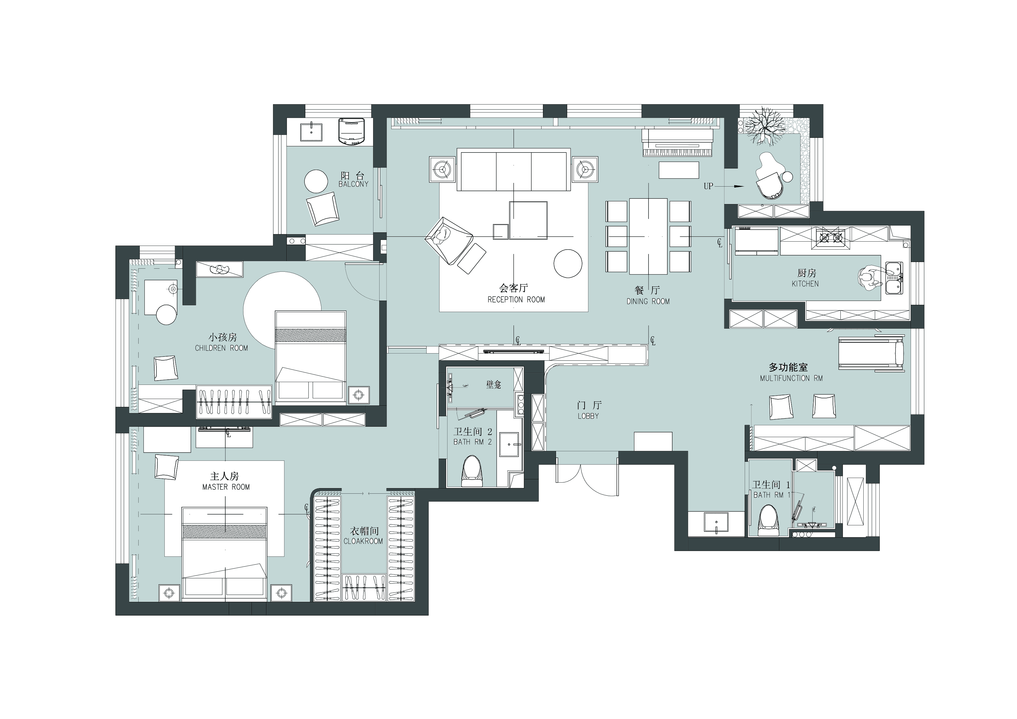空间布局:公共区域的空间,尽量打开,让其更大,再配合其他手法让其又是有独立的感觉。