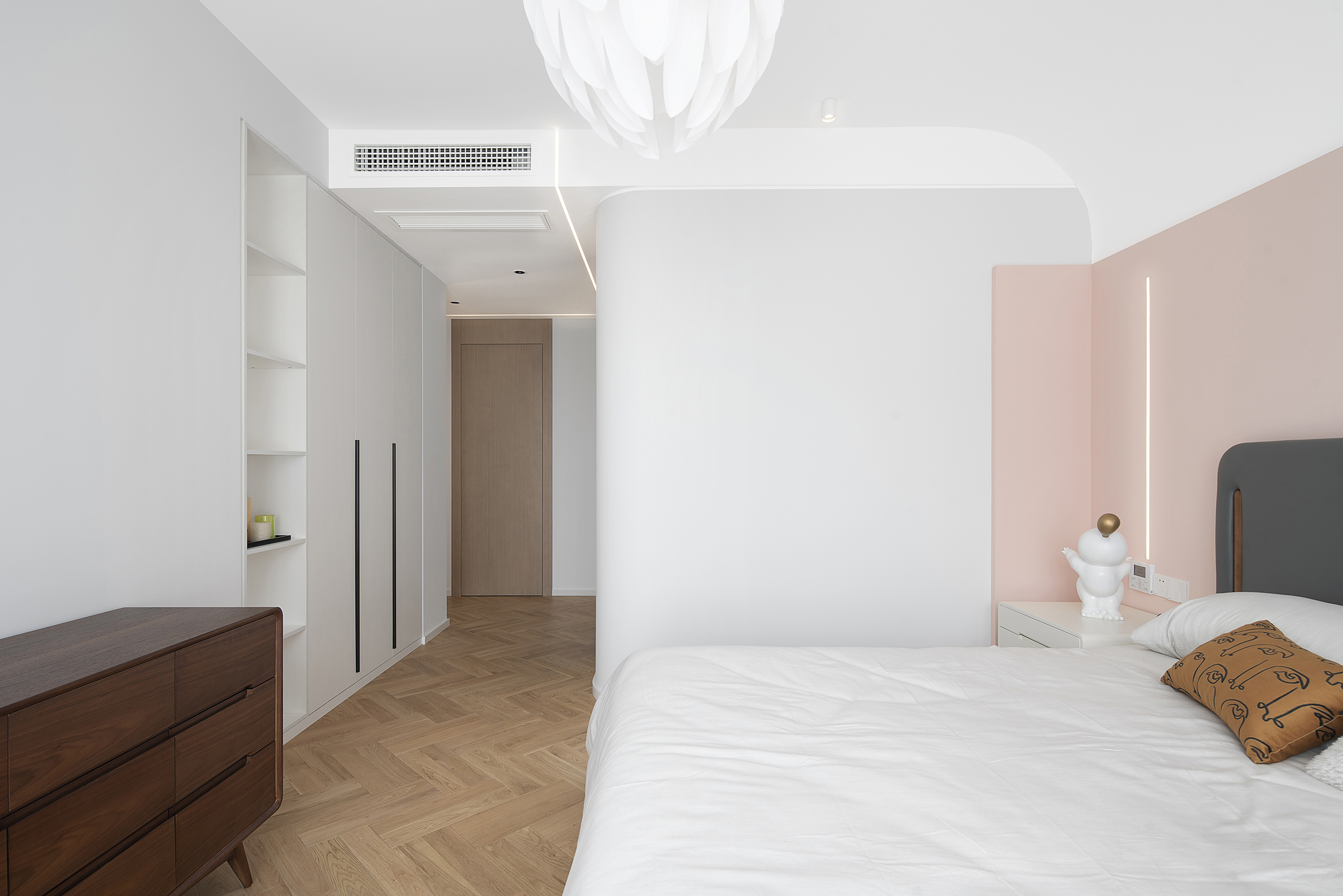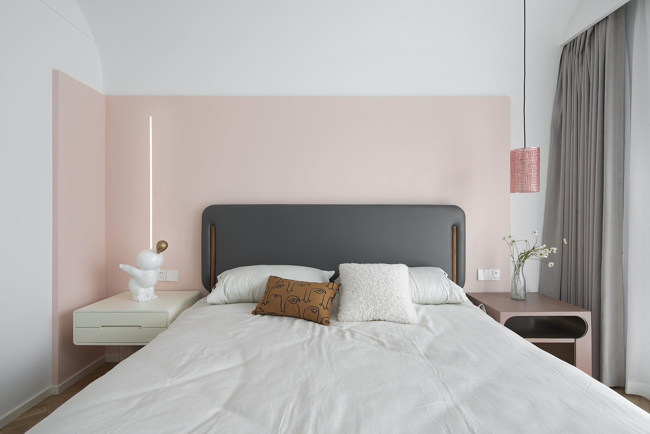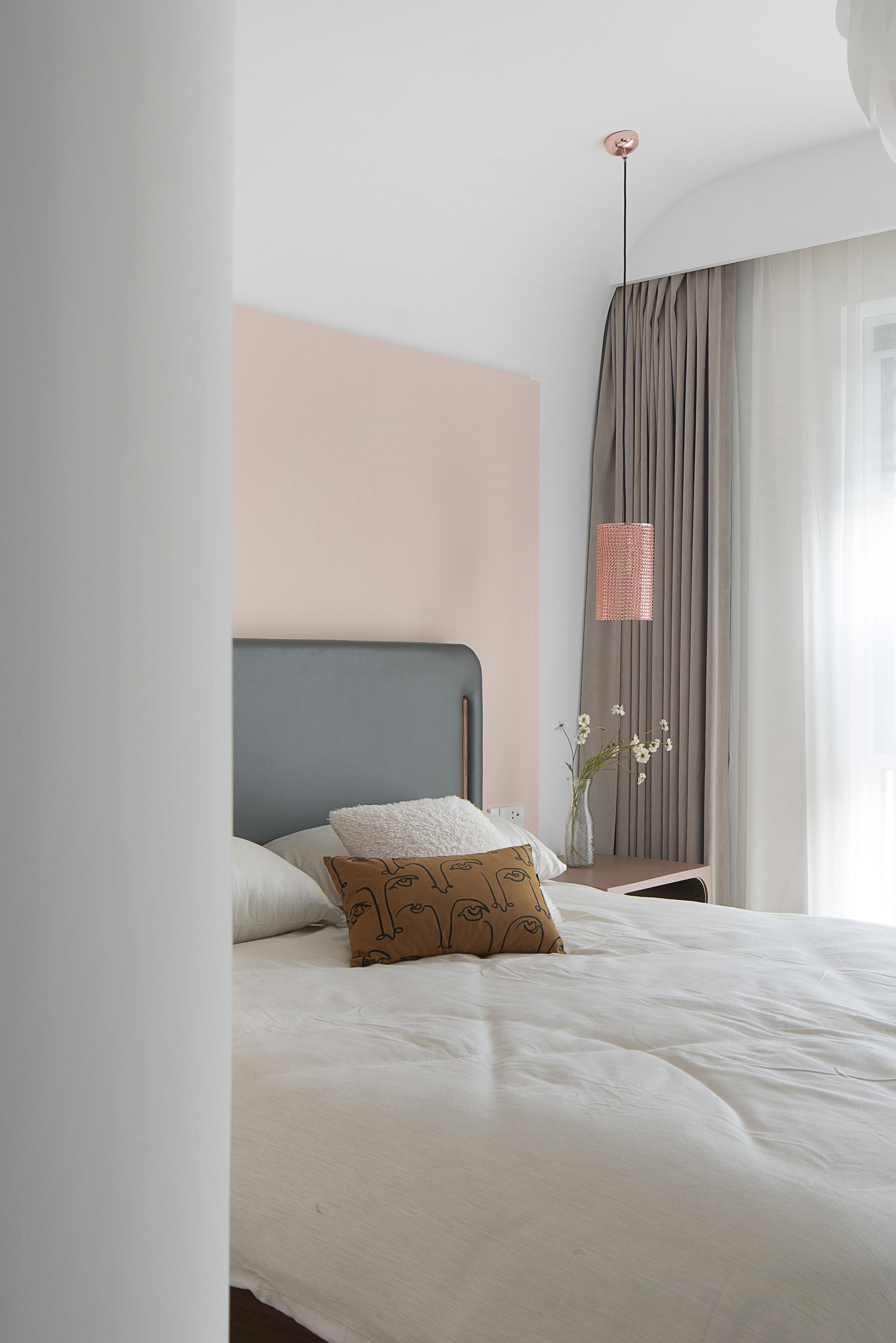 主卧的背景顶跟客餐厅一样做了墙跟顶过度的连接,这里又多做了脏粉色的跳色。