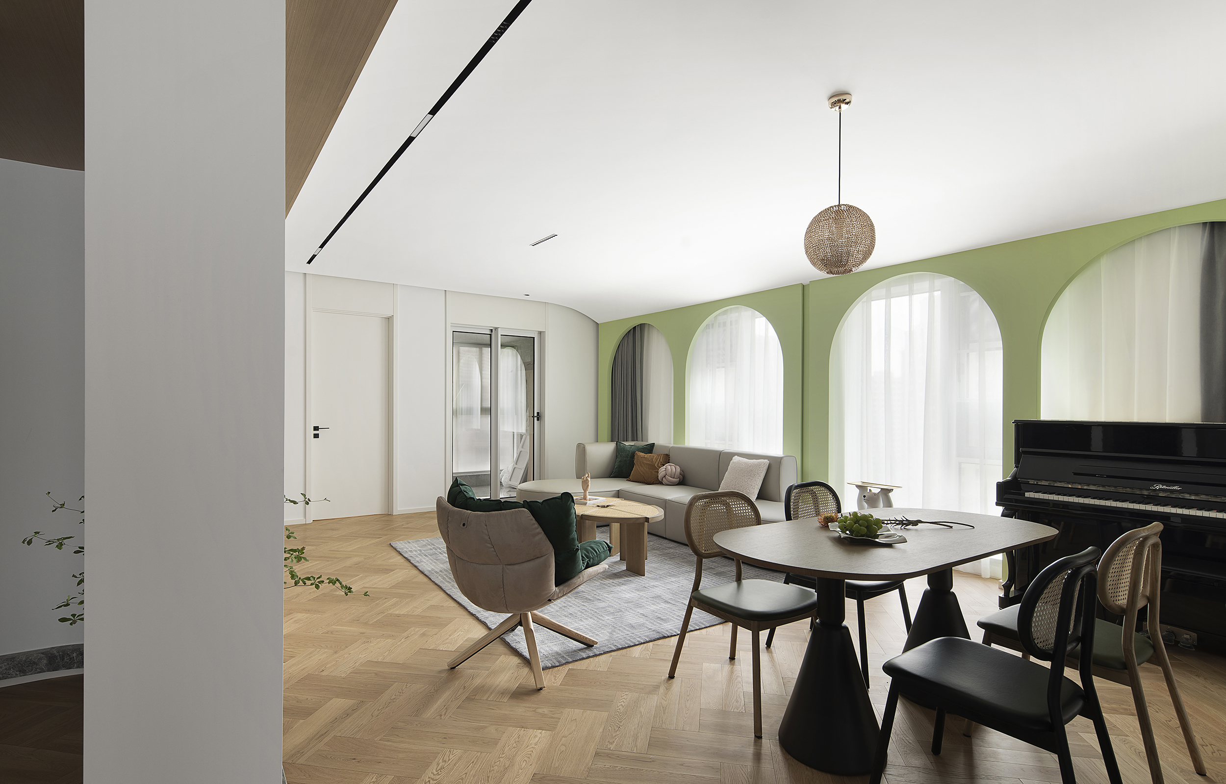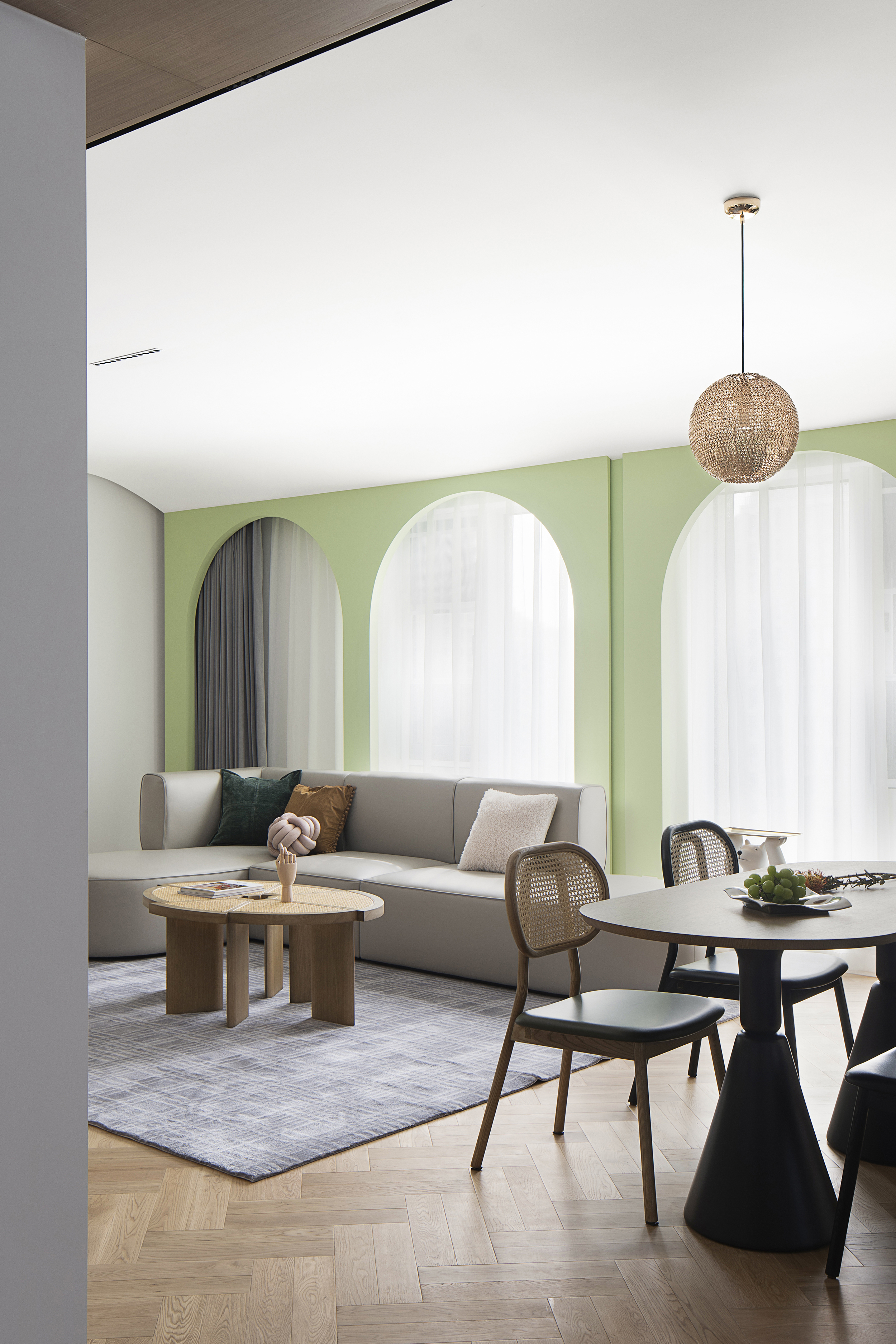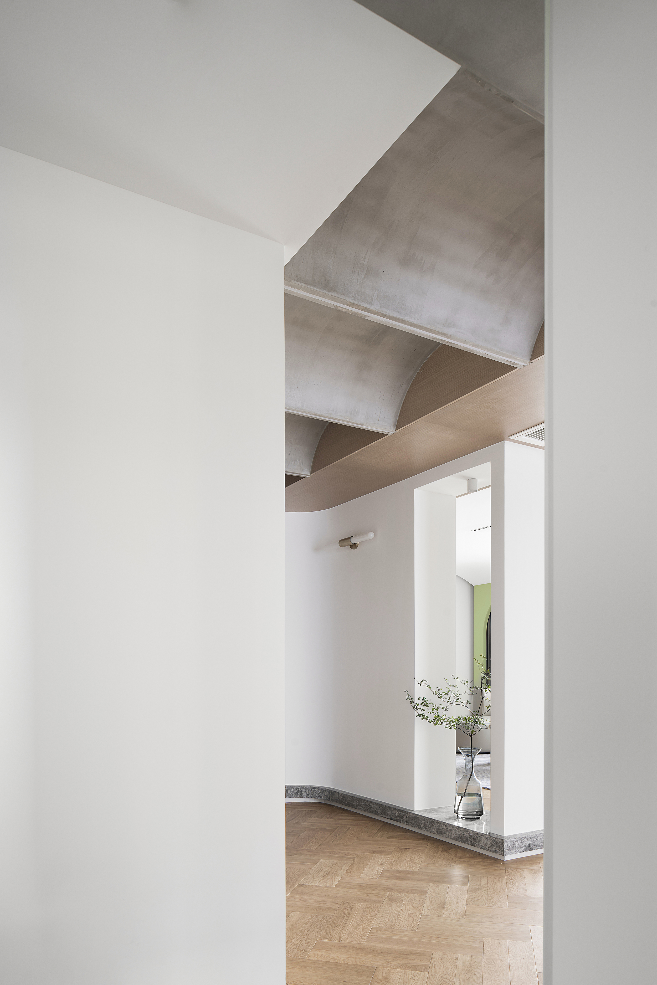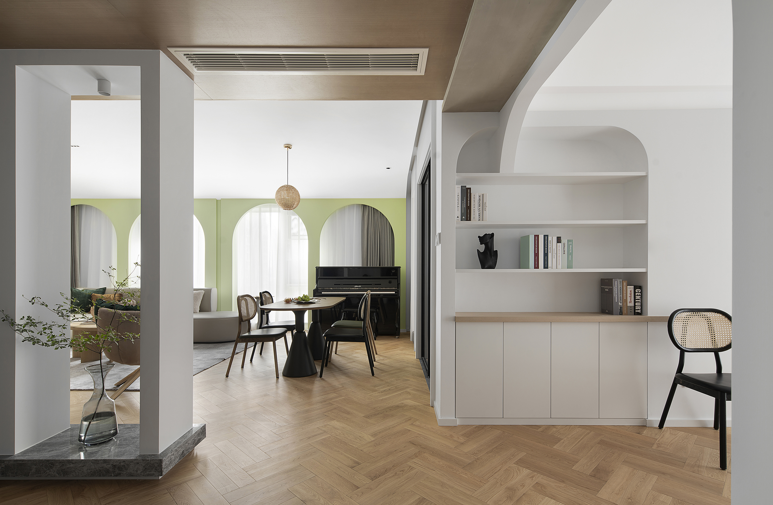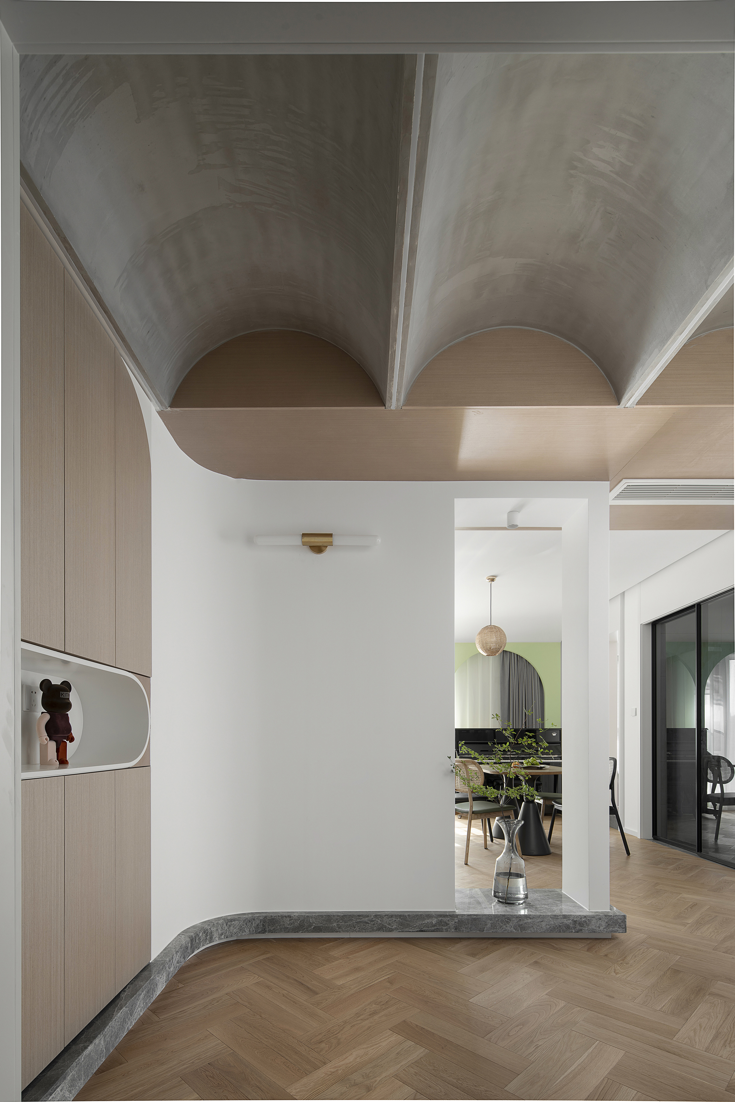 门厅吊顶的弧对应着前方客餐厅背景的弧
