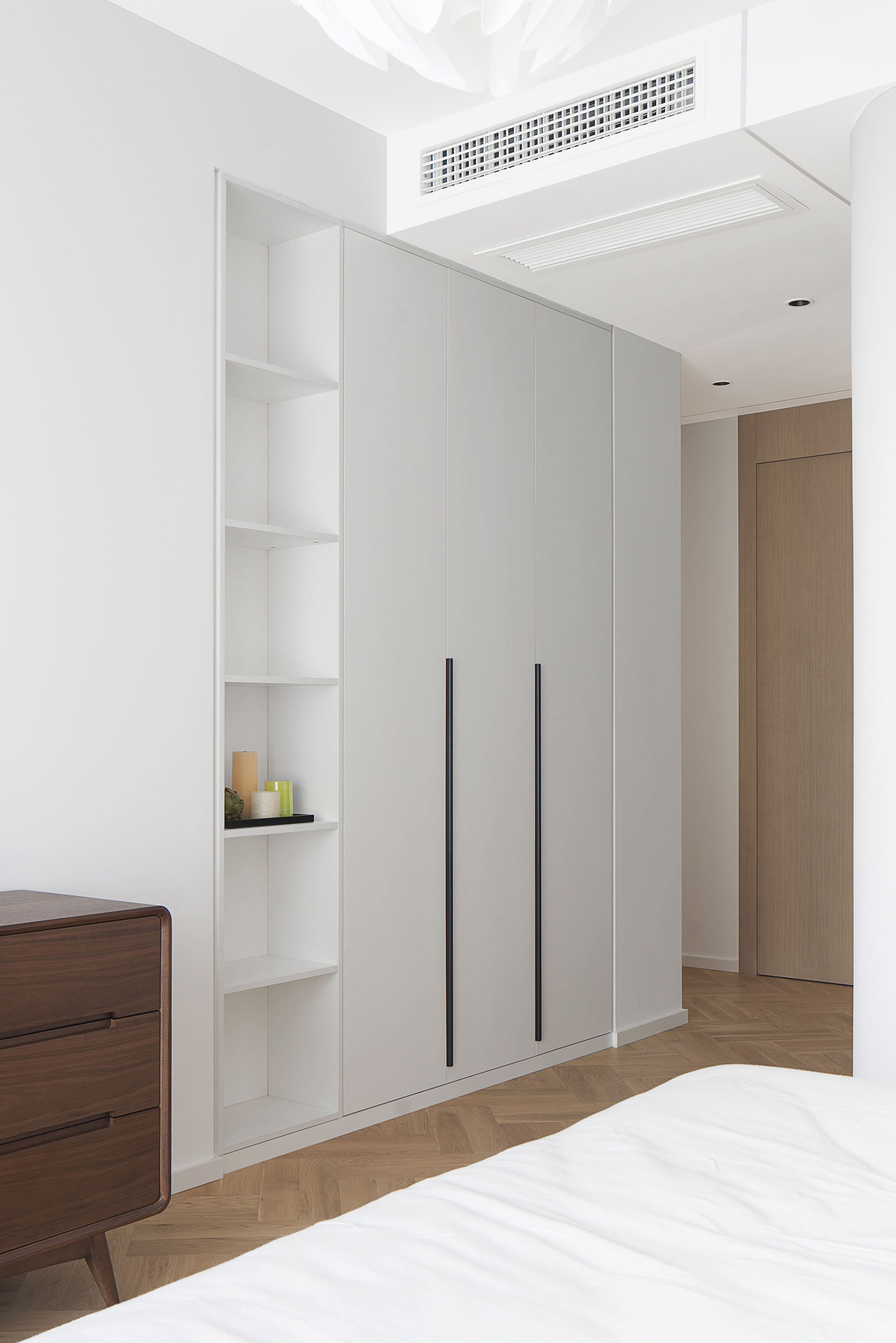 书柜没有做到顶,留了一些空间给空调的回风口,竖向的隔板也是用了不锈钢,增加精致感。